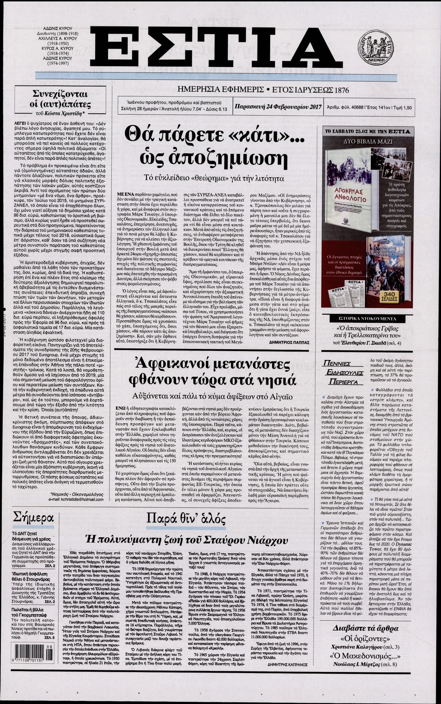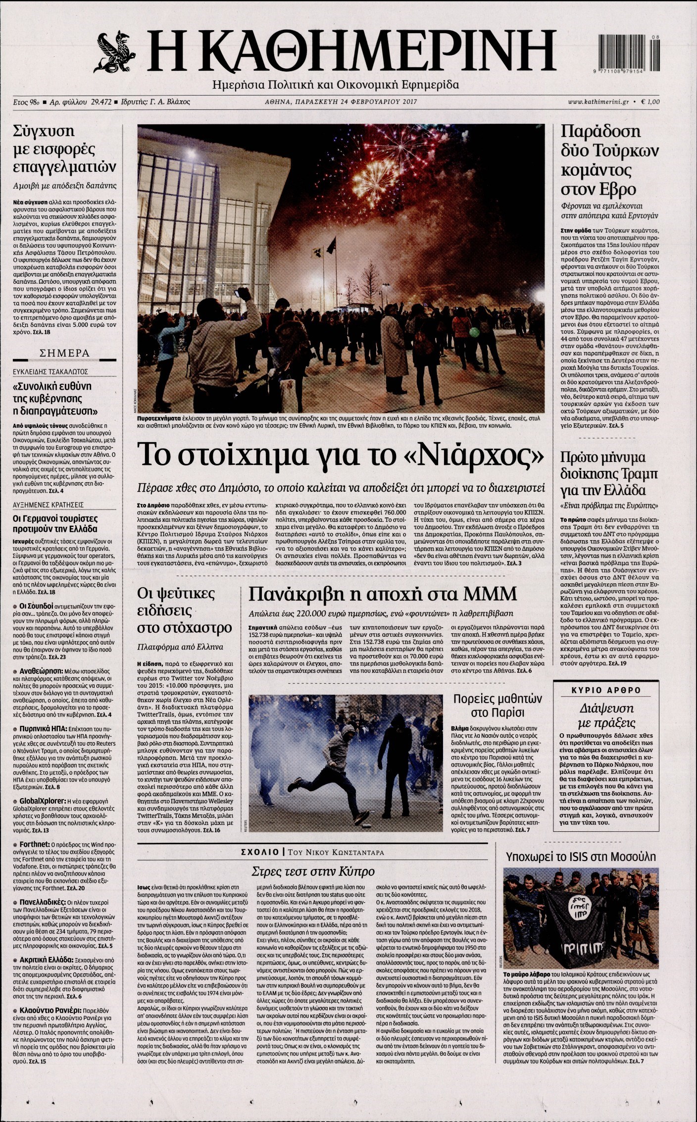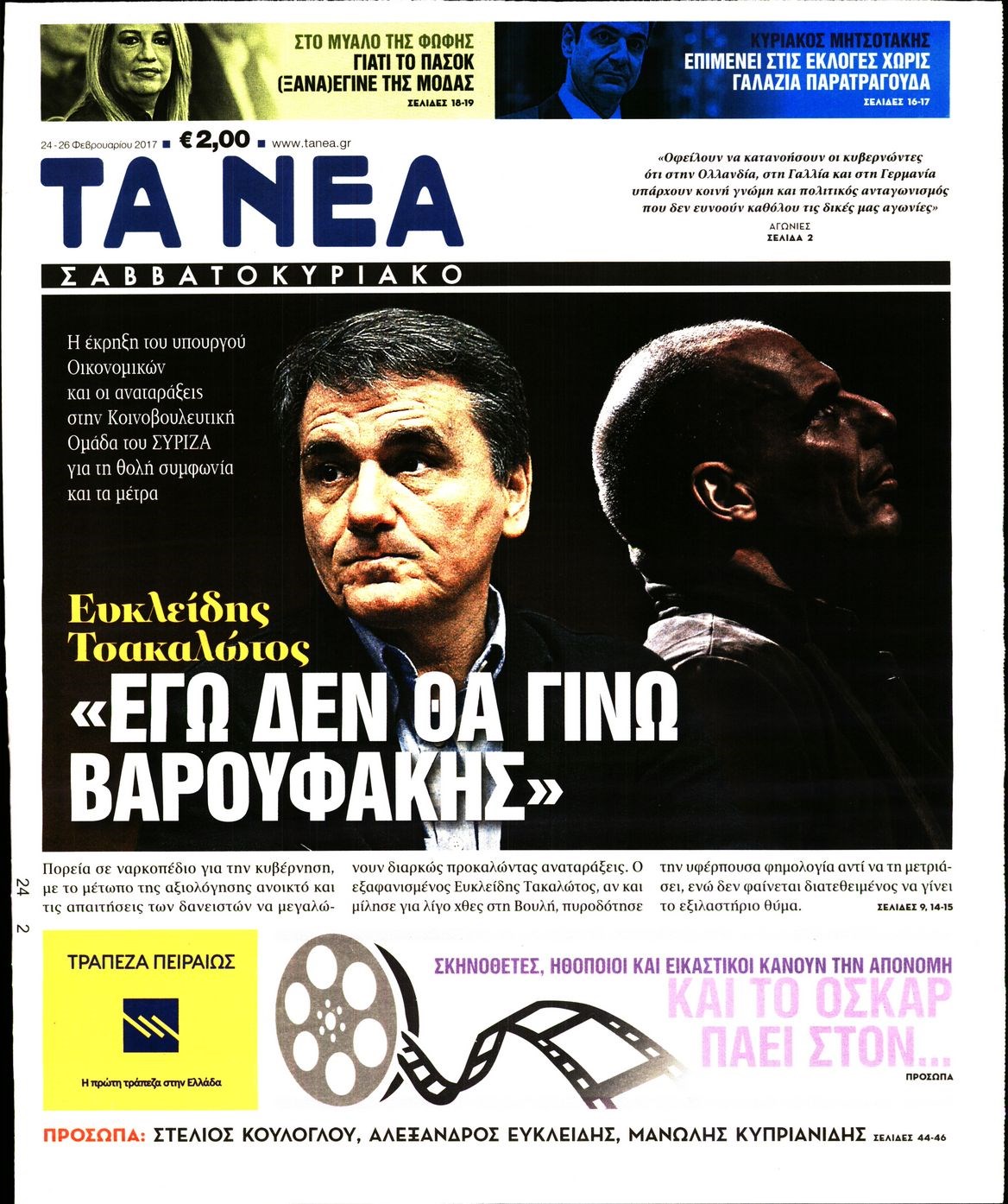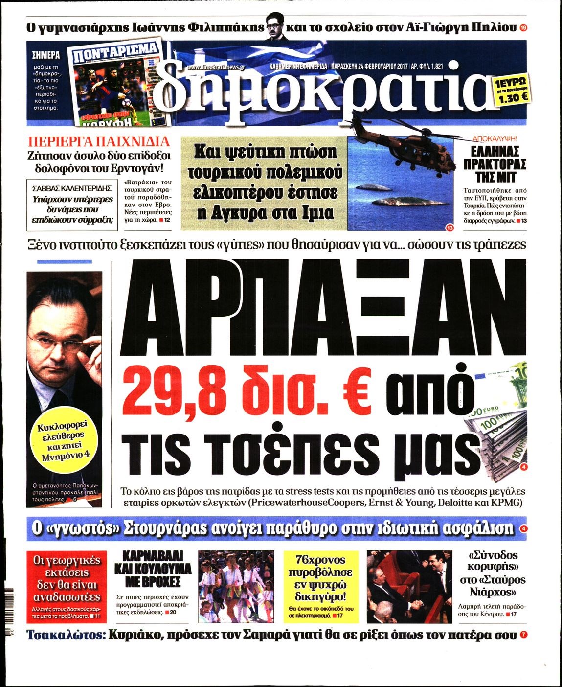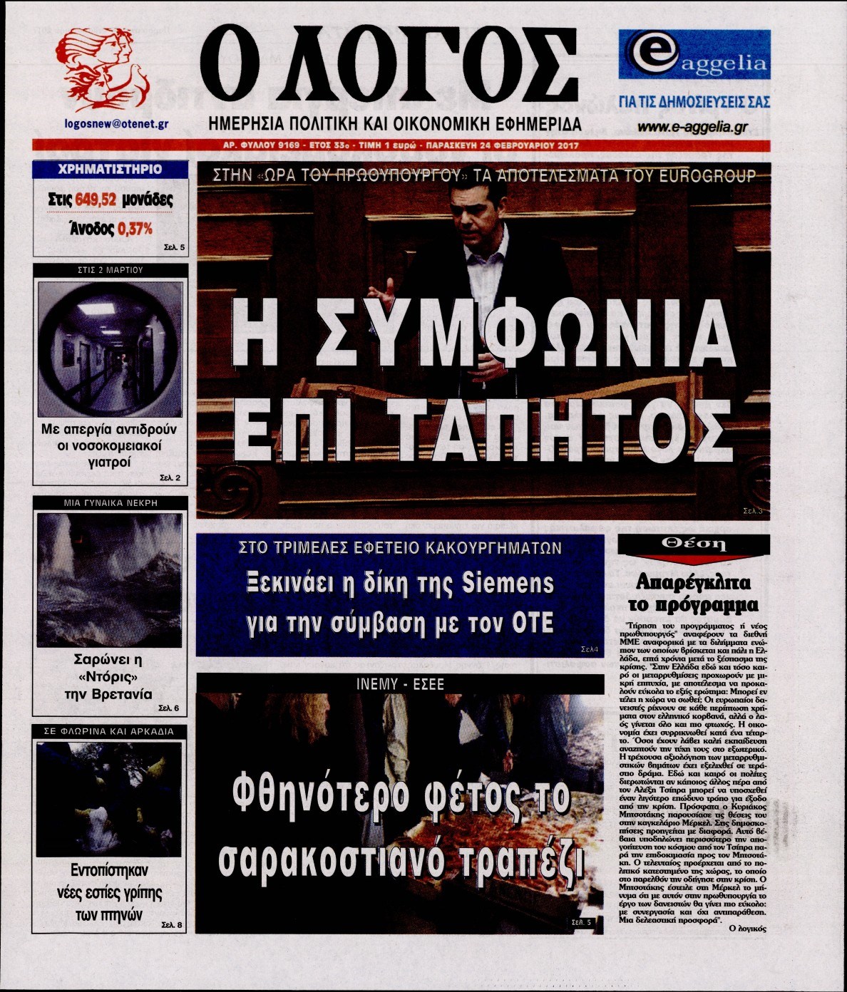 Οι πολιτικές εφημερίδες 24/2/2017 Enikos Newsroom 06:53, Παρασκευή 24 Φεβρουαρίου 2017 Media Διαβάστε τα σημερινά πρωτοσέλιδα των πολιτικών εφημερίδων: ΠΟΛΙΤΙΚΕΣ ΕΦΗΜΕΡΙΔΕΣ ΠΡΩΤΟΣΕΛΙΔΑ Μοιράσου το: σχολίασε κι εσύ (0 σχόλια) Ακολουθήστε το enikos.gr στο Google News και μάθετε πρώτοι όλες τις ειδήσεις Δείτε όλες τις τελευταίες ειδήσεις από την Ελλάδα και τον Κόσμο στο enikos.gr Ειδήσεις Ροή Ειδήσεων 45 λεπτά πριν Υπόθεση Έπσταϊν: Το Υπουργείο Δικαιοσύνης δημοσιοποίησε μια σειρά από εξαιρετικά επεξεργασμένα αρχεία – «Λείπουν τα πιο σημαντικά έγγραφα», λένε οι Δημοκρατικοί 2 ώρες πριν Σαρωτικοί οι έλεγχοι στους δρόμους ενόψει εορτών – Μπλόκα της τροχαίας σε κεντρικές αρτηρίες της Αττικής 56 λεπτά πριν ΟΝΕΧ – MEGATUGS: Ξεκίνησε η ναυπήγηση ρυμουλκών στην Ελλάδα – Προθάλαμος πολεμικών πλοίων – Δείτε φωτογραφίες και βίντεο 48 λεπτά πριν Καιρός: Αλλαγή σκηνικού σήμερα με βροχές και πτώση της θερμοκρασίας – Οι προβλέψεις των μετεωρολόγων για τα Χριστούγεννα 10 ώρες πριν Χριστούγεννα στα μπλόκα: Επιμένουν στις κινητοποιήσεις τους οι αγρότες – Ανοίγουν τα διόδια το Σαββατοκύριακο 3 ώρες πριν Αυγά: Πόσα μπορείτε να τρώτε την ημέρα με ασφάλεια για μέγιστη πρόσληψη πρωτεΐνης 3 ώρες πριν Τα ζώδια σήμερα, Σάββατο 20 Δεκεμβρίου: Παρθένοι, το σύμπαν σας δίνει το κλειδί 2 ώρες πριν Οπτική ψευδαίσθηση: Μόνο αν είσαι ο Σέρλοκ Χολμς θα βρεις τον αριθμό «87» σε 7 δευτερόλεπτα 25 λεπτά πριν Αρχαιολόγοι ανακάλυψαν σε χωράφι απεικόνιση 600 ετών ενός Αγίου – Τα στοιχεία που δείχνουν ότι μαρτύρησε 1 λεπτό πριν Η τέλεια συνταγή για cookies με κομμάτια σοκολάτας 9 λεπτά πριν MyHealth App: Τα στοιχεία για τον Προσωπικό Βοηθό Υγείας Πολίτη – Τι ερωτήματα έγιναν μέσα σε 7 ημέρες 17 λεπτά πριν Τρομεροί γονείς: Η Μαρία Καβογιάννη εισβάλλει στο σπίτι της οικογένειας Στεφανίδη 25 λεπτά πριν Αρχαιολόγοι ανακάλυψαν σε χωράφι απεικόνιση 600 ετών ενός Αγίου – Τα στοιχεία που δείχνουν ότι μαρτύρησε 32 λεπτά πριν Mega χριστουγεννιάτικη φορολοταρία: «Κλείδωσε» η ημερομηνία για την κλήρωση – Ερωτήσεις και απαντήσεις ENIKOS NETWORK Το τεστ των 10 δευτερολέπτων που μπορεί να προβλέψει το προσδόκιμο ζωής σας – Τι λέει ειδικός του Cleveland Επιλέξτε καρέκλα για να μάθετε ποια είναι τα κρυφά χαρακτηριστικά σας – Τι αποκάλυψε για εσάς αυτό το τεστ προσωπικότητας; Mega χριστουγεννιάτικη φορολοταρία: «Κλείδωσε» η ημερομηνία για την κλήρωση – Ερωτήσεις και απαντήσεις Αναστολή μέτρων αναγκαστικής εκτέλεσης για κτηνοτρόφους που πλήττονται από την ευλογιά των αιγοπροβάτων Χαρτογραφώντας το «σημείο χωρίς επιστροφή»: Για πρώτη φορά αποκαλύπτεται με λεπτομέρεια το ακανθώδες όριο της ατμόσφαιρας τ... Η Google καταργεί τη λειτουργία «dark web report» – Πώς θα μπορούν οι χρήστες να διαγράφουν τα δεδομένα τους περισσότερα 08:14 , Σάββατο 20 Δεκεμβρίου 2025 Τρομεροί γονείς: Η Μαρία Καβογιάννη εισβάλλει στο σπίτι της οικογένειας Στεφανίδη Όσα θα δούμε στο νέο διπλό επεισόδιο της σειράς «Τρομεροί γονείς», σήμερα Σάββατο 20 Δεκεμβρίο... 05:48 , Σάββατο 20 Δεκεμβρίου 2025 Οι οικονομικές εφημερίδες 20/12/2025 Διαβάστε τα πρωτοσέλιδα από τις οικονομικές εφημερίδες, σήμερα 20/12/2025. 05:43 , Σάββατο 20 Δεκεμβρίου 2025 Οι αθλητικές εφημερίδες 20/12/2025 Διαβάστε τα πρωτοσέλιδα από τις αθλητικές εφημερίδες, σήμερα 20/12/2025. 05:38 , Σάββατο 20 Δεκεμβρίου 2025 Οι πολιτικές εφημερίδες 20/12/2025 Διαβάστε τα πρωτοσέλιδα από τις πολιτικές εφημερίδες, σήμερα 20/12/2025. ΤΕΛΕΥΤΑΙΕΣ ΕΙΔΗΣΕΙΣ 9 λεπτά πριν MyHealth App: Τα στοιχεία γ