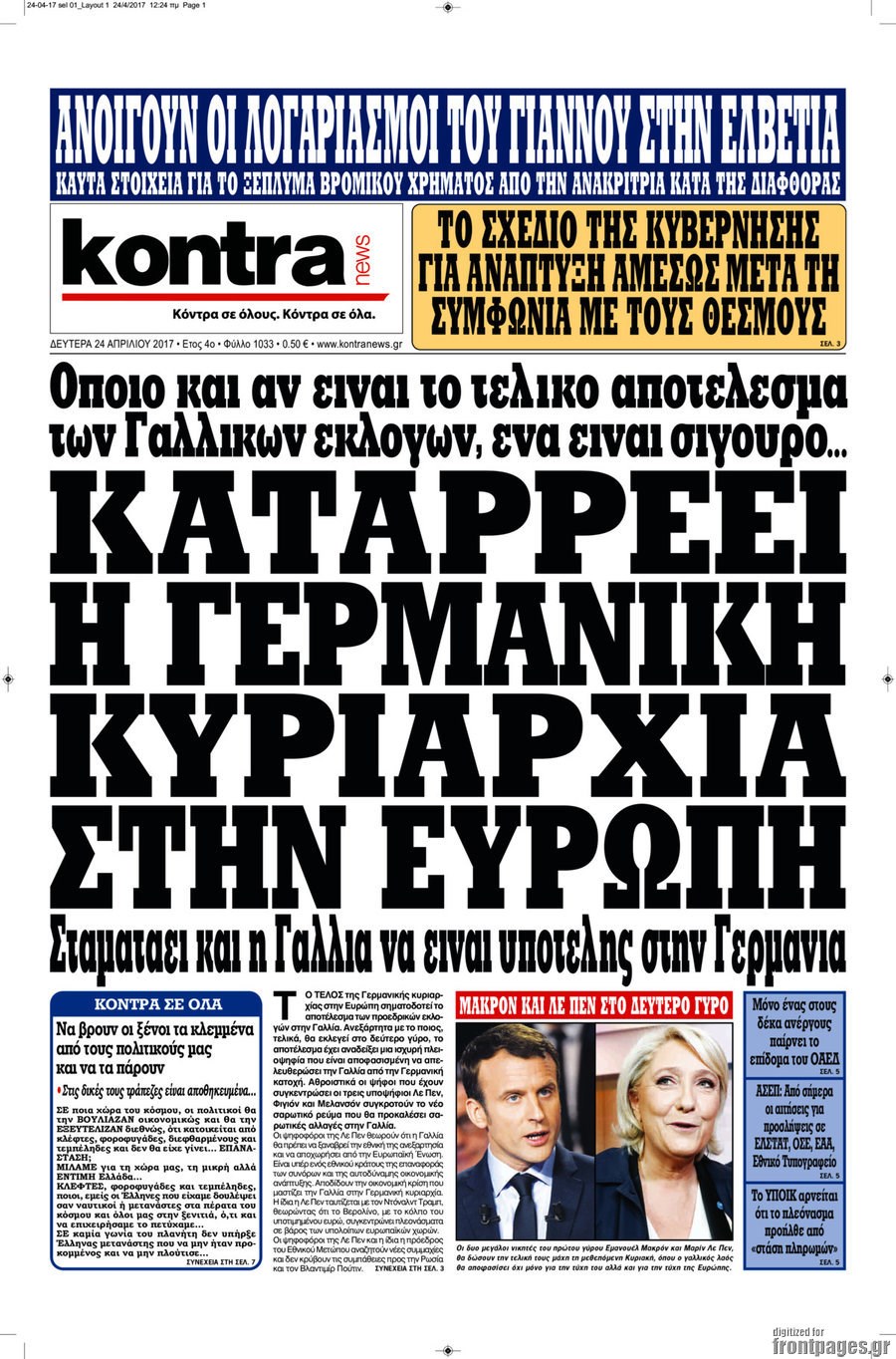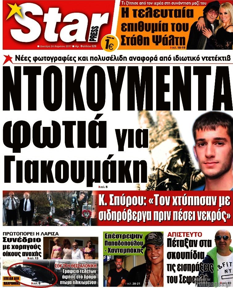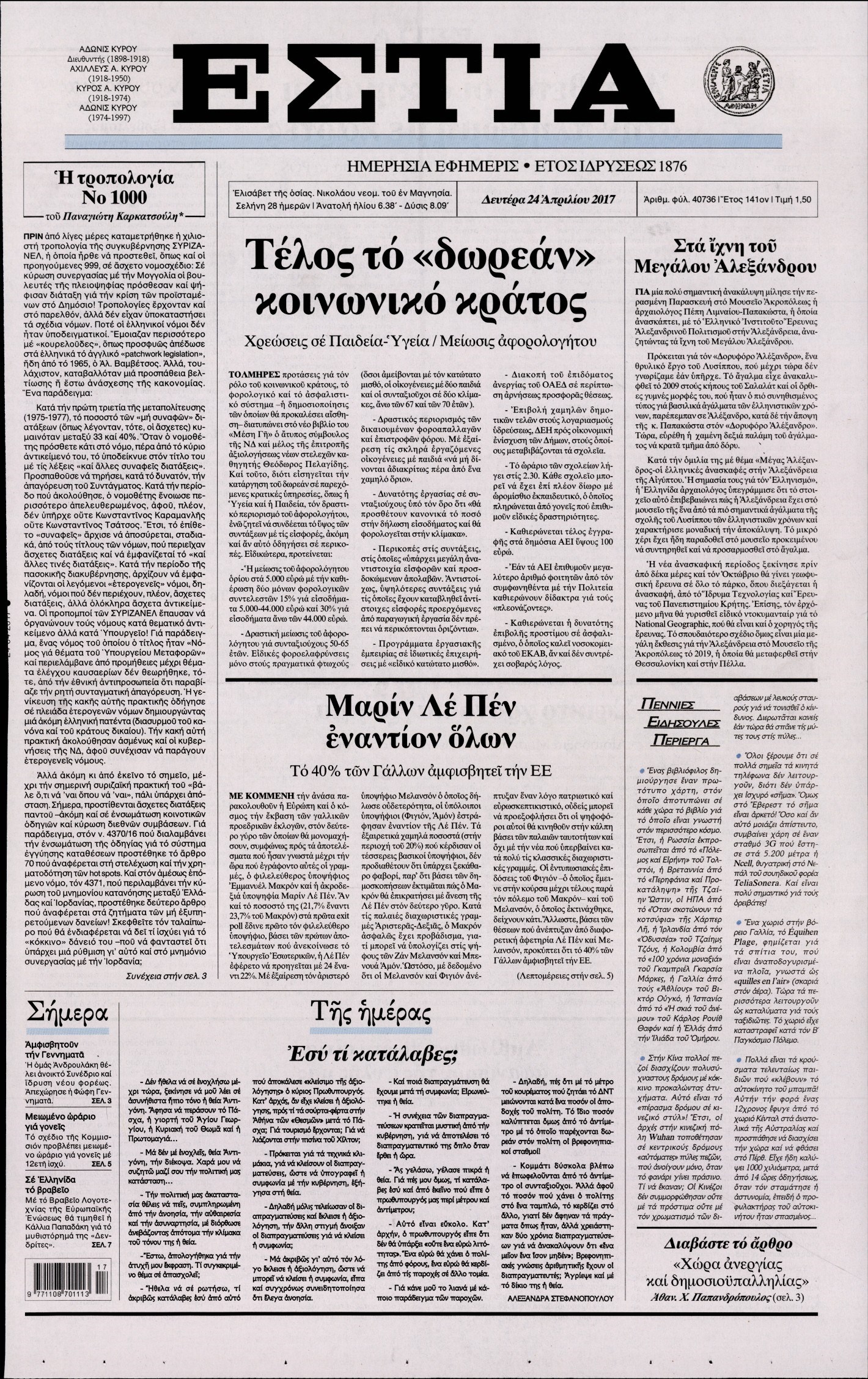 Οι πολιτικές εφημερίδες 24/4/2017 Enikos Newsroom 07:08, Δευτέρα 24 Απριλίου 2017 Media Διαβάστε τα σημερινά πρωτοσέλιδα των πολιτικών εφημερίδων: ΠΟΛΙΤΙΚΕΣ ΕΦΗΜΕΡΙΔΕΣ ΠΡΩΤΟΣΕΛΙΔΑ Μοιράσου το: σχολίασε κι εσύ (0 σχόλια) Ακολουθήστε το enikos.gr στο Google News και μάθετε πρώτοι όλες τις ειδήσεις Δείτε όλες τις τελευταίες ειδήσεις από την Ελλάδα και τον Κόσμο στο enikos.gr Ειδήσεις Ροή Ειδήσεων 4 ώρες πριν Υπόθεση Έπσταϊν: Το Υπουργείο Δικαιοσύνης δημοσιοποίησε μια σειρά από εξαιρετικά επεξεργασμένα αρχεία – «Λείπουν τα πιο σημαντικά έγγραφα», λένε οι Δημοκρατικοί 49 λεπτά πριν Γιορτές με μπλόκα για τους αγρότες: Ανοίγουν διόδια και μοιράζουν προϊόντα στους ταξιδιώτες 1 ώρα πριν Εξαφάνιση 33χρονου γιατρού στην Κρήτη: «Άναψα τα φώτα, τρόμαξε και άρχισε να τρέχει στα χωράφια» – Η τελευταία διαδρομή και η μαρτυρία «κλειδί» 3 ώρες πριν Ο «χάρτης» με τις αυξήσεις και τις φοροελαφρύνσεις του 2026 – Ποιοι και πόσα κερδίζουν 1 ώρα πριν Τα αρχεία του Έπσταϊν αποκαλύπτουν φωτογραφία του έκπτωτου πρίγκιπα Άντριου – Είναι ξαπλωμένος στην αγκαλιά 5 γυναικών 1 ώρα πριν Μία νέα «χρυσή» περίοδος αρχίζει για 3 ζώδια από σήμερα – «Μία αναπάντεχη ευκαιρία οδηγεί στην επιτυχία» 5 ώρες πριν Αυγά: Πόσα μπορείτε να τρώτε την ημέρα με ασφάλεια για μέγιστη πρόσληψη πρωτεΐνης 3 ώρες πριν Αρχαιολόγοι ανακάλυψαν σε χωράφι απεικόνιση 600 ετών ενός Αγίου – Τα στοιχεία που δείχνουν ότι μαρτύρησε 2 ώρες πριν Αγχώνεται για το χριστουγεννιάτικο δώρο που πήρε στην πλούσια σύντροφό του – «Φοβάμαι πως θα το βρει φθηνιάρικο, φοράει βραχιόλια Cartier» 6 λεπτά πριν Τα Labubu «μετακομίζουν» στο Χόλιγουντ: Η Sony Pictures ετοιμάζει live-action ταινία με τον σκηνοθέτη του «Wonka» 14 λεπτά πριν Νέες ταυτότητες: Μεγάλη αναμονή για ραντεβού στην Αττική – Τέλος τα ταξίδια εκτός Ελλάδος από τον Αύγουστο για όσους δεν έχουν αλλάξει 22 λεπτά πριν Οι 7 φράσεις που δεν λένε ποτέ οι συναισθηματικά έξυπνοι άνθρωποι κατά τη διάρκεια ενός καβγά 25 λεπτά πριν Τηλεθέαση (19/12): Ανατροπές και πρωτιές στην πρωινή ζώνη 33 λεπτά πριν Πώς η κλιματική αλλαγή επηρεάζει εγκύους και βρέφη – Οι επιπτώσεις των υψηλών θερμοκρασιών ENIKOS NETWORK Είστε μόνιμα απρόσεκτοι; 3 σημάδια που δείχνουν ότι μπορεί να είναι σύμπτωμα πάθησης Πόσα κιλά παίρνουμε πραγματικά τα Χριστούγεννα, σύμφωνα με την επιστήμη – Πώς να το αποτρέψουμε; e-ΕΦΚΑ και ΔΥΠΑ: Έρχονται νέες πληρωμές έως τις 24 Δεκεμβρίου – Ποιοι πάνε ταμείο Επίδομα παιδιού: Τι αλλάζει από το 2026 – Το όφελος από τις φορολογικές ελαφρύνσεις Χαρτογραφώντας το «σημείο χωρίς επιστροφή»: Για πρώτη φορά αποκαλύπτεται με λεπτομέρεια το ακανθώδες όριο της ατμόσφαιρας τ... Η Google καταργεί τη λειτουργία «dark web report» – Πώς θα μπορούν οι χρήστες να διαγράφουν τα δεδομένα τους περισσότερα 09:30 , Σάββατο 20 Δεκεμβρίου 2025 «Porto Leone: Στη γειτονιά με τα κόκκινα φανάρια» – Ο Χρόνης αποκαλύπτει στην Αλεξάνδρα το μυστικό για το παιδί της Λένας Η μεγάλη δραματική σειρά του Apha «Porto Leone: Στη γειτονιά με τα κόκκινα φανάρια» μας μεταφέ... 08:14 , Σάββατο 20 Δεκεμβρίου 2025 Τρομεροί γονείς: Η Μαρία Καβογιάννη εισβάλλει στο σπίτι της οικογένειας Στεφανίδη Όσα θα δούμε στο νέο διπλό επεισόδιο της σειράς «Τρομεροί γονείς», σήμερα Σάββατο 20 Δεκεμβρίο... 05:48 , Σάββατο 20 Δεκεμβρίου 2025 Οι οικονομικές εφημερίδες 20/12/2025 Διαβάστε τα πρωτοσέλιδα από τις οικονομικές εφημερίδες, σήμερα 20/12/2025. 05:43 , Σάββατο 20 Δεκεμβρίου 2025 Οι αθλητικές εφημερίδες 20/12/2025 Διαβάστε τα πρωτοσέλιδα απ