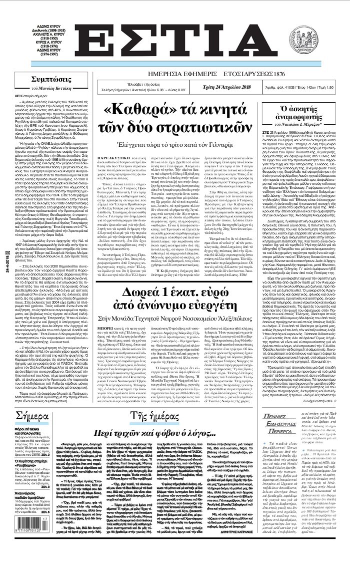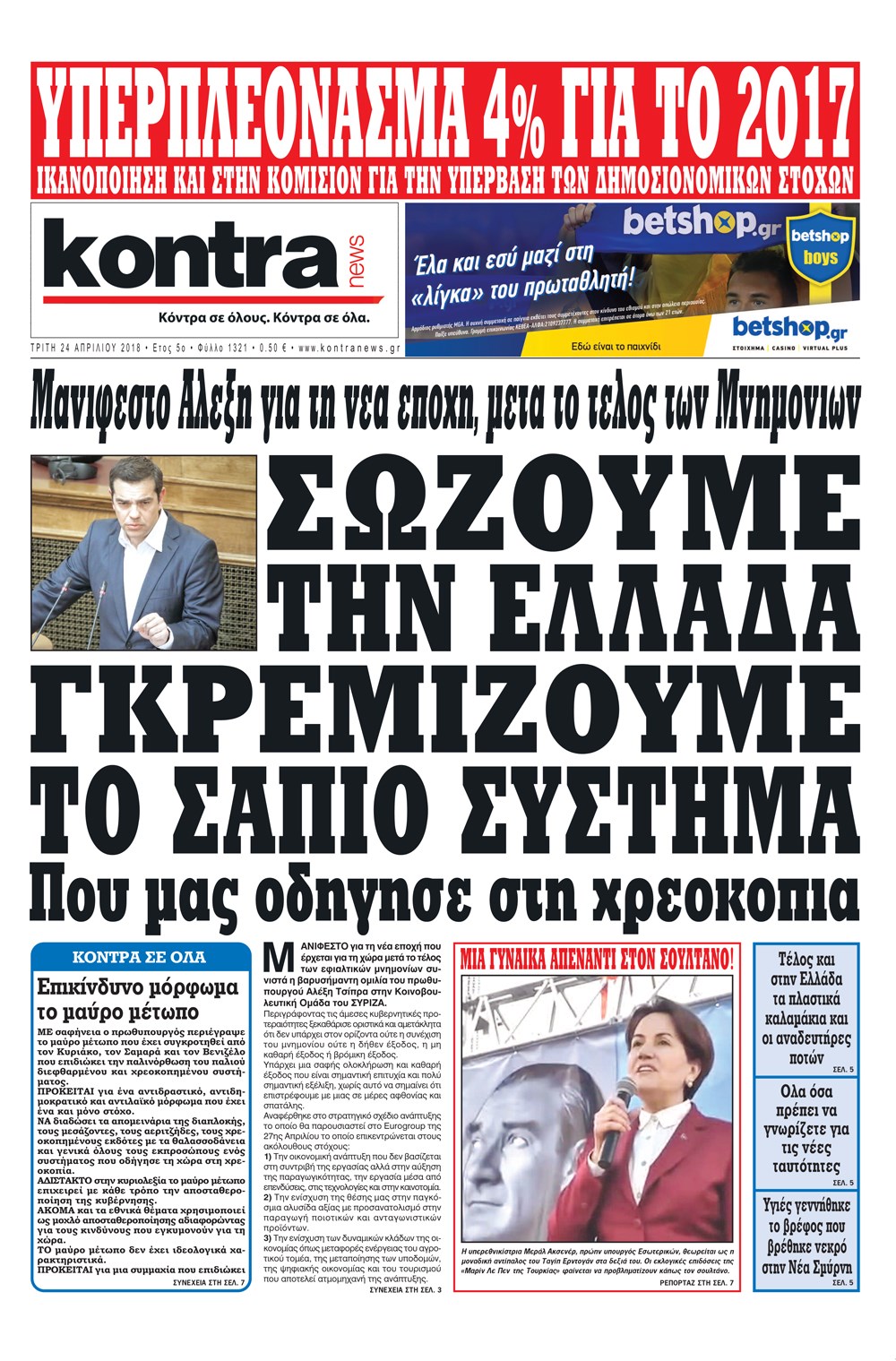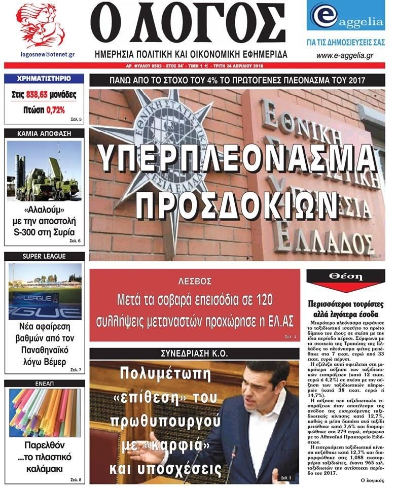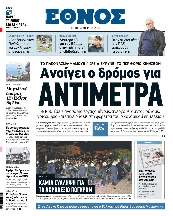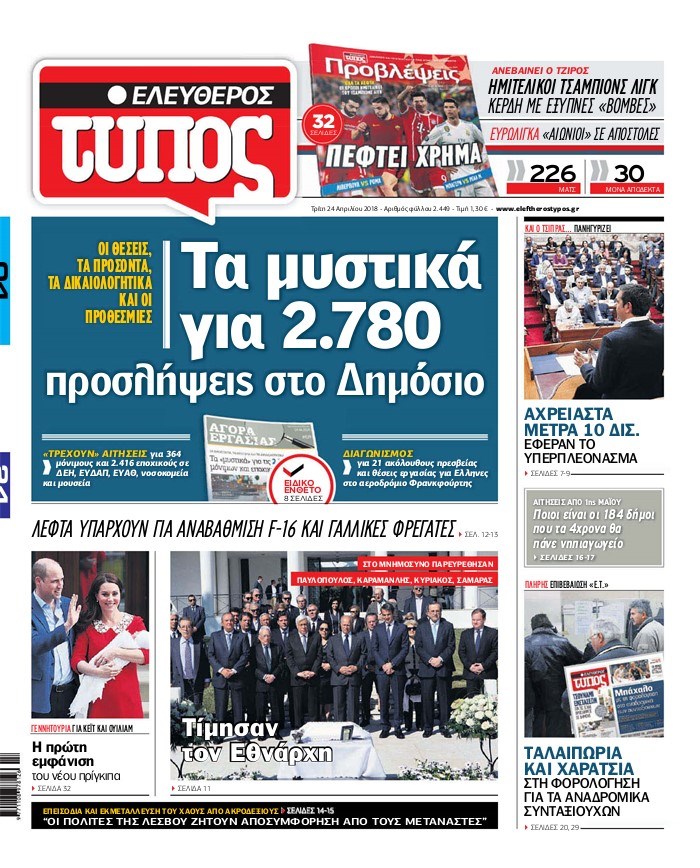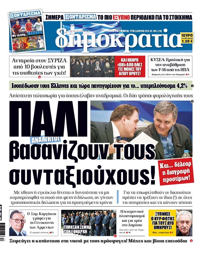 Οι πολιτικές εφημερίδες 24/4/2018 Κώστας Τεό 06:26, Τρίτη 24 Απριλίου 2018 Media Διαβάστε τα σημερινά πρωτοσέλιδα των πολιτικών εφημερίδων: ΠΟΛΙΤΙΚΕΣ ΕΦΗΜΕΡΙΔΕΣ ΠΡΩΤΟΣΕΛΙΔΑ Μοιράσου το: σχολίασε κι εσύ (0 σχόλια) Ακολουθήστε το enikos.gr στο Google News και μάθετε πρώτοι όλες τις ειδήσεις Δείτε όλες τις τελευταίες ειδήσεις από την Ελλάδα και τον Κόσμο στο enikos.gr Ειδήσεις Ροή Ειδήσεων 4 ώρες πριν Υπόθεση Έπσταϊν: Το Υπουργείο Δικαιοσύνης δημοσιοποίησε μια σειρά από εξαιρετικά επεξεργασμένα αρχεία – «Λείπουν τα πιο σημαντικά έγγραφα», λένε οι Δημοκρατικοί 49 λεπτά πριν Γιορτές με μπλόκα για τους αγρότες: Ανοίγουν διόδια και μοιράζουν προϊόντα στους ταξιδιώτες 1 ώρα πριν Εξαφάνιση 33χρονου γιατρού στην Κρήτη: «Άναψα τα φώτα, τρόμαξε και άρχισε να τρέχει στα χωράφια» – Η τελευταία διαδρομή και η μαρτυρία «κλειδί» 3 ώρες πριν Ο «χάρτης» με τις αυξήσεις και τις φοροελαφρύνσεις του 2026 – Ποιοι και πόσα κερδίζουν 1 ώρα πριν Τα αρχεία του Έπσταϊν αποκαλύπτουν φωτογραφία του έκπτωτου πρίγκιπα Άντριου – Είναι ξαπλωμένος στην αγκαλιά 5 γυναικών 1 ώρα πριν Μία νέα «χρυσή» περίοδος αρχίζει για 3 ζώδια από σήμερα – «Μία αναπάντεχη ευκαιρία οδηγεί στην επιτυχία» 5 ώρες πριν Αυγά: Πόσα μπορείτε να τρώτε την ημέρα με ασφάλεια για μέγιστη πρόσληψη πρωτεΐνης 3 ώρες πριν Αρχαιολόγοι ανακάλυψαν σε χωράφι απεικόνιση 600 ετών ενός Αγίου – Τα στοιχεία που δείχνουν ότι μαρτύρησε 2 ώρες πριν Αγχώνεται για το χριστουγεννιάτικο δώρο που πήρε στην πλούσια σύντροφό του – «Φοβάμαι πως θα το βρει φθηνιάρικο, φοράει βραχιόλια Cartier» 6 λεπτά πριν Τα Labubu «μετακομίζουν» στο Χόλιγουντ: Η Sony Pictures ετοιμάζει live-action ταινία με τον σκηνοθέτη του «Wonka» 14 λεπτά πριν Νέες ταυτότητες: Μεγάλη αναμονή για ραντεβού στην Αττική – Τέλος τα ταξίδια εκτός Ελλάδος από τον Αύγουστο για όσους δεν έχουν αλλάξει 23 λεπτά πριν Οι 7 φράσεις που δεν λένε ποτέ οι συναισθηματικά έξυπνοι άνθρωποι κατά τη διάρκεια ενός καβγά 26 λεπτά πριν Τηλεθέαση (19/12): Ανατροπές και πρωτιές στην πρωινή ζώνη 34 λεπτά πριν Πώς η κλιματική αλλαγή επηρεάζει εγκύους και βρέφη – Οι επιπτώσεις των υψηλών θερμοκρασιών ENIKOS NETWORK Είστε μόνιμα απρόσεκτοι; 3 σημάδια που δείχνουν ότι μπορεί να είναι σύμπτωμα πάθησης Πόσα κιλά παίρνουμε πραγματικά τα Χριστούγεννα, σύμφωνα με την επιστήμη – Πώς να το αποτρέψουμε; e-ΕΦΚΑ και ΔΥΠΑ: Έρχονται νέες πληρωμές έως τις 24 Δεκεμβρίου – Ποιοι πάνε ταμείο Επίδομα παιδιού: Τι αλλάζει από το 2026 – Το όφελος από τις φορολογικές ελαφρύνσεις Χαρτογραφώντας το «σημείο χωρίς επιστροφή»: Για πρώτη φορά αποκαλύπτεται με λεπτομέρεια το ακανθώδες όριο της ατμόσφαιρας τ... Η Google καταργεί τη λειτουργία «dark web report» – Πώς θα μπορούν οι χρήστες να διαγράφουν τα δεδομένα τους περισσότερα 09:30 , Σάββατο 20 Δεκεμβρίου 2025 «Porto Leone: Στη γειτονιά με τα κόκκινα φανάρια» – Ο Χρόνης αποκαλύπτει στην Αλεξάνδρα το μυστικό για το παιδί της Λένας Η μεγάλη δραματική σειρά του Apha «Porto Leone: Στη γειτονιά με τα κόκκινα φανάρια» μας μεταφέ... 08:14 , Σάββατο 20 Δεκεμβρίου 2025 Τρομεροί γονείς: Η Μαρία Καβογιάννη εισβάλλει στο σπίτι της οικογένειας Στεφανίδη Όσα θα δούμε στο νέο διπλό επεισόδιο της σειράς «Τρομεροί γονείς», σήμερα Σάββατο 20 Δεκεμβρίο... 05:48 , Σάββατο 20 Δεκεμβρίου 2025 Οι οικονομικές εφημερίδες 20/12/2025 Διαβάστε τα πρωτοσέλιδα από τις οικονομικές εφημερίδες, σήμερα 20/12/2025. 05:43 , Σάββατο 20 Δεκεμβρίου 2025 Οι αθλητικές εφημερίδες 20/12/2025 Διαβάστε τα πρωτοσέλιδα απ
