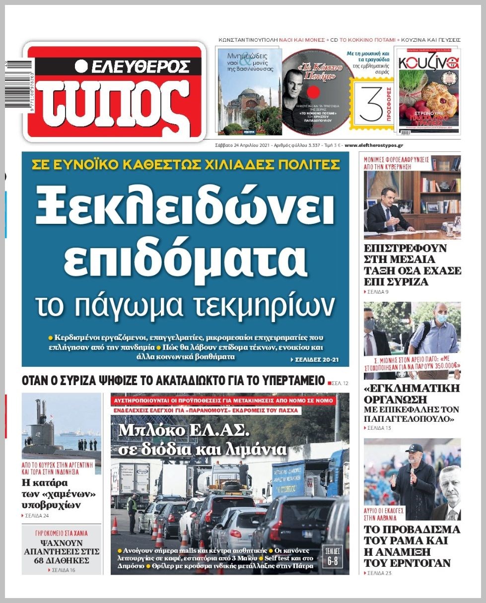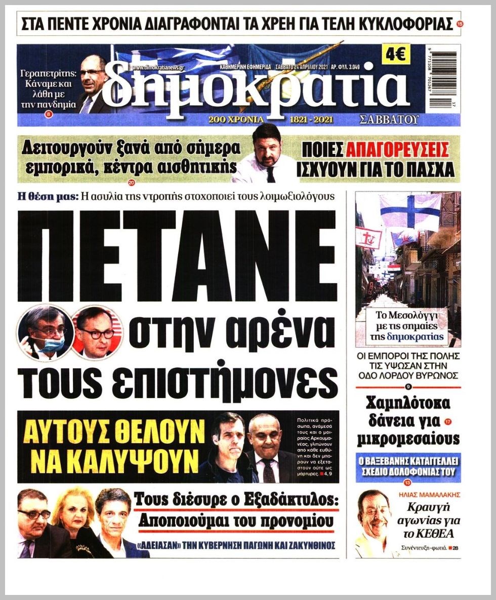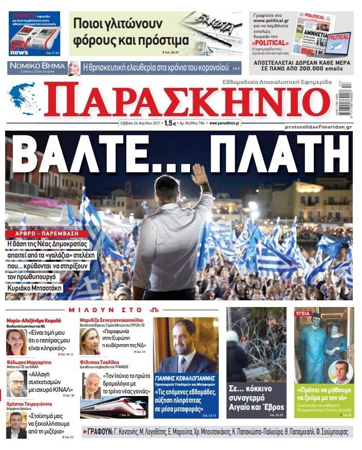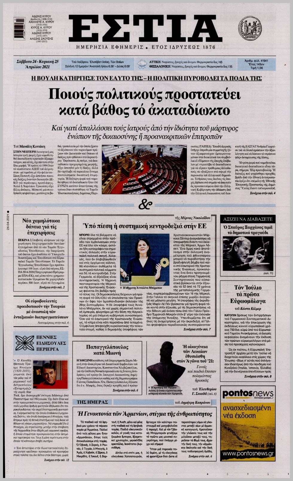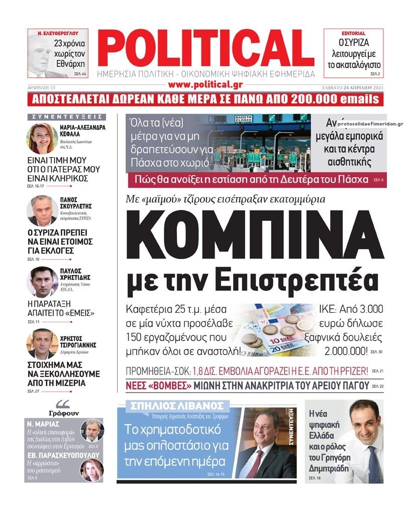 Οι πολιτικές εφημερίδες 24/4/2021 Διονύσης Νίκκας 07:04, Σάββατο 24 Απριλίου 2021 Media Διαβάστε τα πρωτοσέλιδα των πολιτικών εφημερίδων… ΕΦΗΜΕΡΙΔΕΣ ΠΡΩΤΟΣΕΛΙΔΑ Μοιράσου το: σχολίασε κι εσύ (0 σχόλια) Ακολουθήστε το enikos.gr στο Google News και μάθετε πρώτοι όλες τις ειδήσεις Δείτε όλες τις τελευταίες ειδήσεις από την Ελλάδα και τον Κόσμο στο enikos.gr Ειδήσεις Ροή Ειδήσεων 4 ώρες πριν Υπόθεση Έπσταϊν: Το Υπουργείο Δικαιοσύνης δημοσιοποίησε μια σειρά από εξαιρετικά επεξεργασμένα αρχεία – «Λείπουν τα πιο σημαντικά έγγραφα», λένε οι Δημοκρατικοί 52 λεπτά πριν Γιορτές με μπλόκα για τους αγρότες: Ανοίγουν διόδια και μοιράζουν προϊόντα στους ταξιδιώτες 1 ώρα πριν Εξαφάνιση 33χρονου γιατρού στην Κρήτη: «Άναψα τα φώτα, τρόμαξε και άρχισε να τρέχει στα χωράφια» – Η τελευταία διαδρομή και η μαρτυρία «κλειδί» 3 ώρες πριν Ο «χάρτης» με τις αυξήσεις και τις φοροελαφρύνσεις του 2026 – Ποιοι και πόσα κερδίζουν 1 ώρα πριν Τα αρχεία του Έπσταϊν αποκαλύπτουν φωτογραφία του έκπτωτου πρίγκιπα Άντριου – Είναι ξαπλωμένος στην αγκαλιά 5 γυναικών 1 ώρα πριν Μία νέα «χρυσή» περίοδος αρχίζει για 3 ζώδια από σήμερα – «Μία αναπάντεχη ευκαιρία οδηγεί στην επιτυχία» 5 ώρες πριν Αυγά: Πόσα μπορείτε να τρώτε την ημέρα με ασφάλεια για μέγιστη πρόσληψη πρωτεΐνης 3 ώρες πριν Αρχαιολόγοι ανακάλυψαν σε χωράφι απεικόνιση 600 ετών ενός Αγίου – Τα στοιχεία που δείχνουν ότι μαρτύρησε 2 ώρες πριν Αγχώνεται για το χριστουγεννιάτικο δώρο που πήρε στην πλούσια σύντροφό του – «Φοβάμαι πως θα το βρει φθηνιάρικο, φοράει βραχιόλια Cartier» 9 λεπτά πριν Τα Labubu «μετακομίζουν» στο Χόλιγουντ: Η Sony Pictures ετοιμάζει live-action ταινία με τον σκηνοθέτη του «Wonka» 17 λεπτά πριν Νέες ταυτότητες: Μεγάλη αναμονή για ραντεβού στην Αττική – Τέλος τα ταξίδια εκτός Ελλάδος από τον Αύγουστο για όσους δεν έχουν αλλάξει 25 λεπτά πριν Οι 7 φράσεις που δεν λένε ποτέ οι συναισθηματικά έξυπνοι άνθρωποι κατά τη διάρκεια ενός καβγά 28 λεπτά πριν Τηλεθέαση (19/12): Ανατροπές και πρωτιές στην πρωινή ζώνη 36 λεπτά πριν Πώς η κλιματική αλλαγή επηρεάζει εγκύους και βρέφη – Οι επιπτώσεις των υψηλών θερμοκρασιών ENIKOS NETWORK Είστε μόνιμα απρόσεκτοι; 3 σημάδια που δείχνουν ότι μπορεί να είναι σύμπτωμα πάθησης Πόσα κιλά παίρνουμε πραγματικά τα Χριστούγεννα, σύμφωνα με την επιστήμη – Πώς να το αποτρέψουμε; e-ΕΦΚΑ και ΔΥΠΑ: Έρχονται νέες πληρωμές έως τις 24 Δεκεμβρίου – Ποιοι πάνε ταμείο Επίδομα παιδιού: Τι αλλάζει από το 2026 – Το όφελος από τις φορολογικές ελαφρύνσεις Χαρτογραφώντας το «σημείο χωρίς επιστροφή»: Για πρώτη φορά αποκαλύπτεται με λεπτομέρεια το ακανθώδες όριο της ατμόσφαιρας τ... Η Google καταργεί τη λειτουργία «dark web report» – Πώς θα μπορούν οι χρήστες να διαγράφουν τα δεδομένα τους περισσότερα 09:30 , Σάββατο 20 Δεκεμβρίου 2025 «Porto Leone: Στη γειτονιά με τα κόκκινα φανάρια» – Ο Χρόνης αποκαλύπτει στην Αλεξάνδρα το μυστικό για το παιδί της Λένας Η μεγάλη δραματική σειρά του Apha «Porto Leone: Στη γειτονιά με τα κόκκινα φανάρια» μας μεταφέ... 08:14 , Σάββατο 20 Δεκεμβρίου 2025 Τρομεροί γονείς: Η Μαρία Καβογιάννη εισβάλλει στο σπίτι της οικογένειας Στεφανίδη Όσα θα δούμε στο νέο διπλό επεισόδιο της σειράς «Τρομεροί γονείς», σήμερα Σάββατο 20 Δεκεμβρίο... 05:48 , Σάββατο 20 Δεκεμβρίου 2025 Οι οικονομικές εφημερίδες 20/12/2025 Διαβάστε τα πρωτοσέλιδα από τις οικονομικές εφημερίδες, σήμερα 20/12/2025. 05:43 , Σάββατο 20 Δεκεμβρίου 2025 Οι αθλητικές εφημερίδες 20/12/2025 Διαβάστε τα πρωτοσέλιδα από τις αθλητ