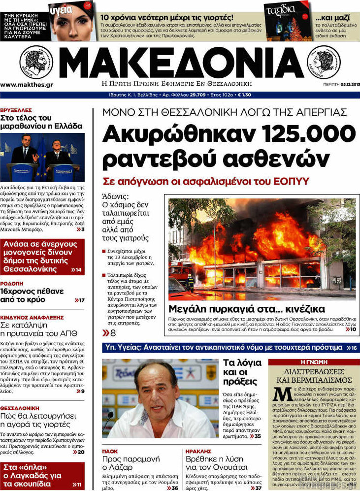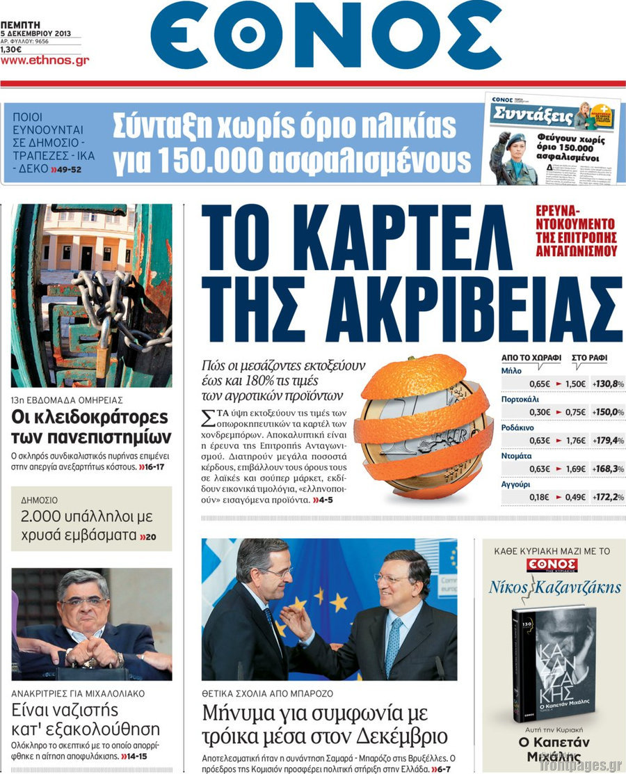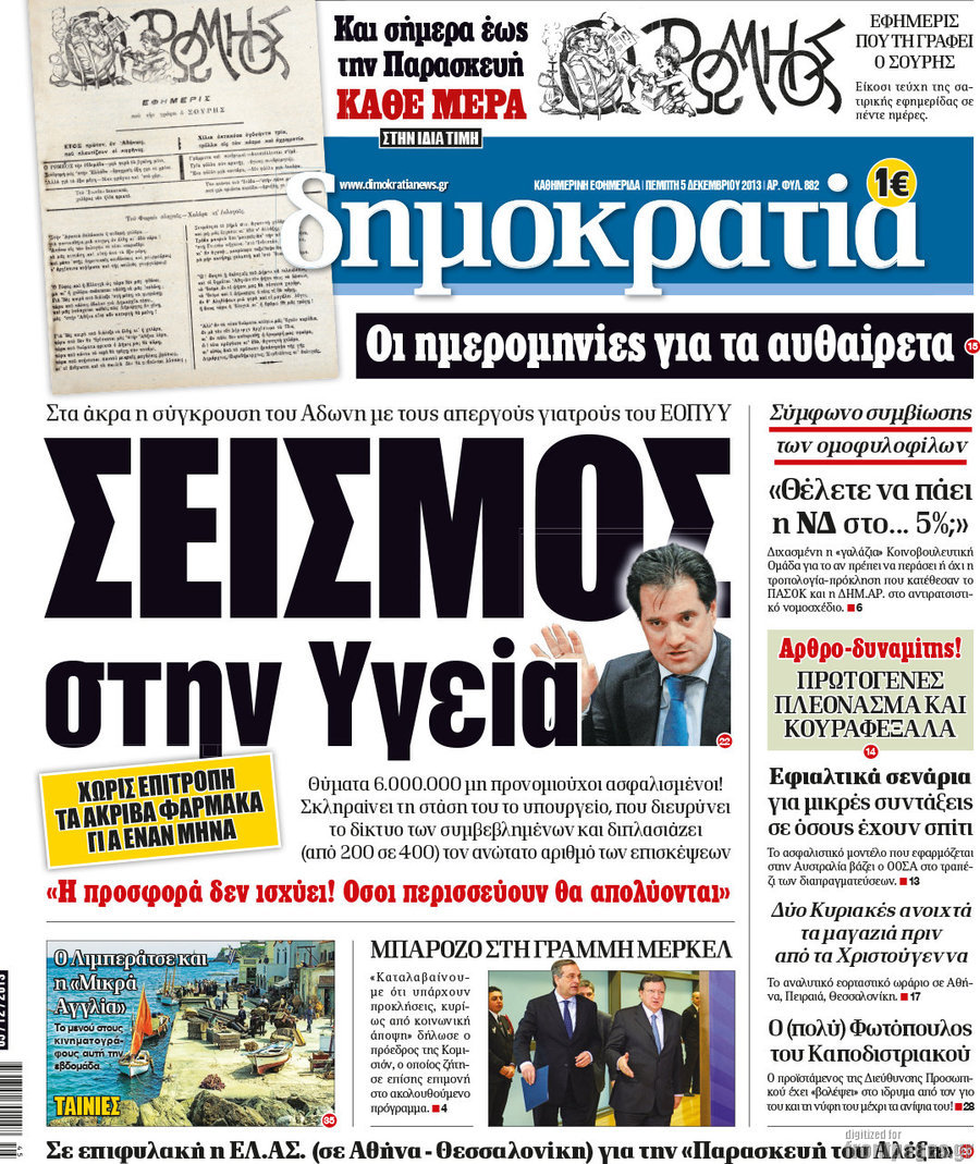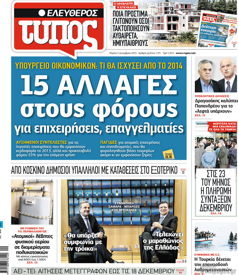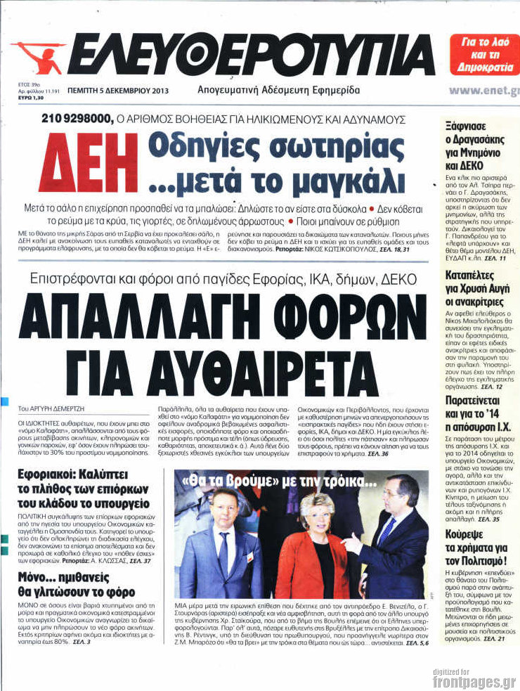 Οι πολιτικές εφημερίδες Enikos Newsroom 08:08, Πέμπτη 05 Δεκεμβρίου 2013 Media Οι πολιτικές εφημερίδες Διαβάστε τα πρωτοσέλιδα των πολιτικών εφημερίδων: ΕΦΗΜΕΡΙΔΕΣ ΠΡΩΤΟΣΕΛΙΔΑ Μοιράσου το: σχολίασε κι εσύ (0 σχόλια) Ακολουθήστε το enikos.gr στο Google News και μάθετε πρώτοι όλες τις ειδήσεις Δείτε όλες τις τελευταίες ειδήσεις από την Ελλάδα και τον Κόσμο στο enikos.gr Ειδήσεις Ροή Ειδήσεων 6 ώρες πριν Εκτός ευρωομάδας ΣΥΡΙΖΑ ο Νίκος Παππάς μετά την επίθεση στον δημοσιογράφο Νίκο Γιαννόπουλο – Η μήνυση και οι νέες δηλώσεις 7 ώρες πριν «Αγριεύουν» οι αγρότες: «Δεν συντρέχει λόγος συνάντησης με τον πρωθυπουργό» – Ώρα αποφάσεων στη σύσκεψη της Πέμπτης 7 ώρες πριν Κυψέλη: Χωρίς την οικογένειά της δίπλα της απολογήθηκε η 16χρονη – «Της είχε επιτεθεί κάποιος για να την βιάσει, φοβήθηκε και κυκλοφορούσε με μαχαίρι» 6 ώρες πριν Politico: Το πρόβλημα της Ευρώπης δεν είναι το Βέλγιο αλλά ο Ντόναλντ Τραμπ 8 ώρες πριν Αλεξανδρούπολη: Πολυοργανική ανεπάρκεια λόγω υποσιτισμού η αιτία θανάτου του 3χρονου αγοριού 6 ώρες πριν Μυστήριο με τεράστιες κυκλικές πέτρες 200 κιλών – Ανακαλύφθηκαν τυχαία κατά τη διάρκεια οδικών έργων και κανείς δεν ξέρει από πού προέρχονται 7 ώρες πριν Ύπνος: Ειδικός εξηγεί τον πραγματικό λόγο που ξυπνάτε στις 4 τα ξημερώματα – Ο ρόλος των ορμονών και του κιρκάδιου ρυθμού 8 ώρες πριν Αριθμολογία: Οι άνθρωποι που έχουν γεννηθεί αυτές τις 4 ημερομηνίες, είναι τρυφεροί και αγαπούν ανιδιοτελώς 20 ώρες πριν 20 χρόνια τα Χριστούγεννα ξεκινούν στα Public με μεγάλη ποικιλία σε δώρα! 7 λεπτά πριν Το Ποντίκι σήμερα Πέμπτη 18/12/2025 12 λεπτά πριν Εφημερεύοντα φαρμακεία σε Αθήνα και Θεσσαλονίκη (18/12) 14 λεπτά πριν Αλεξάνδρα Ούστα: «Αυτό που με τρέλανε στον σύζυγό μου ήταν η ορθολογική του σκέψη» 22 λεπτά πριν Μιχάλης Αεράκης: «Της είπα “θέλω να κάνουμε σπιτικό, αλλά υπάρχουν τρεις προϋποθέσεις…”» 29 λεπτά πριν Αυστραλία: Κυβερνητική δέσμευση για αυστηρότερα μέτρα κατά της υποκίνησης μίσους ENIKOS NETWORK Αϋπνία: Το κόλπο που θα σας βοηθήσει να κοιμηθείτε απόψε – Είναι απλό και έχει αποτέλεσμα 2,6 εκατομμύρια πολίτες έχουν ήδη εμβολιαστεί κατά της γρίπης ΕΛΣΤΑΤ: Τι δείχνουν τα νέα στοιχεία για τις ηλεκτρονικές παραγγελίες των επιχειρήσεων ΚΕΠΕ: Οι 3 διακριτές συμβολές των ΜμΕ και της μεταποίησης στην ελληνική οικονομία Χαρτογραφώντας το «σημείο χωρίς επιστροφή»: Για πρώτη φορά αποκαλύπτεται με λεπτομέρεια το ακανθώδες όριο της ατμόσφαιρας τ... Η Google καταργεί τη λειτουργία «dark web report» – Πώς θα μπορούν οι χρήστες να διαγράφουν τα δεδομένα τους περισσότερα 05:22 , Πέμπτη 18 Δεκεμβρίου 2025 Το Ποντίκι σήμερα Πέμπτη 18/12/2025 Διαβάστε το πρωτοσέλιδο της εφημερίδας «Το Ποντίκι» σήμερα 18/12/2025. 02:30 , Πέμπτη 18 Δεκεμβρίου 2025 Αλ Τσαντίρι Νιουζ: Η κόρη της Πάολα στο κοινό – Η ατάκα Λαζόπουλου που την έκανε να «κοκκινήσει» Γιορτινή διάθεση και ευχάριστες στιγμές γέμισε η αποψινή, τελευταία για το 2025, εκπομπή του «... 22:24 , Τετάρτη 17 Δεκεμβρίου 2025 Το Σπίτι Δίπλα Στο Ποτάμι: Σε κίνδυνο η υγεία του Απόστολου – Τι θα δούμε απόψε “Το Σπίτι Δίπλα στο Ποτάμι” ξετυλίγει το νήμα της ζωής των πέντε αδελφών με καταισ... 21:14 , Τετάρτη 17 Δεκεμβρίου 2025 Παιχνίδια Εκδίκησης: Θα καταφέρει ο Χρήστος να κλονίσει την εμπιστοσύνη της Μάγιας απέναντι στον Άγη; Τα «Παιχνίδια Εκδίκησης» έρχονται απόψε στις 22:30, στον Αντ1, με το τελευταίο επεισόδιο της χ... ΤΕΛΕΥΤΑΙΕΣ ΕΙΔΗΣΕΙΣ 7 λεπτά πριν Το Ποντίκι σήμερα Πέμπτη 18/12/2025 12 λεπτά πριν Εφημερεύοντα 