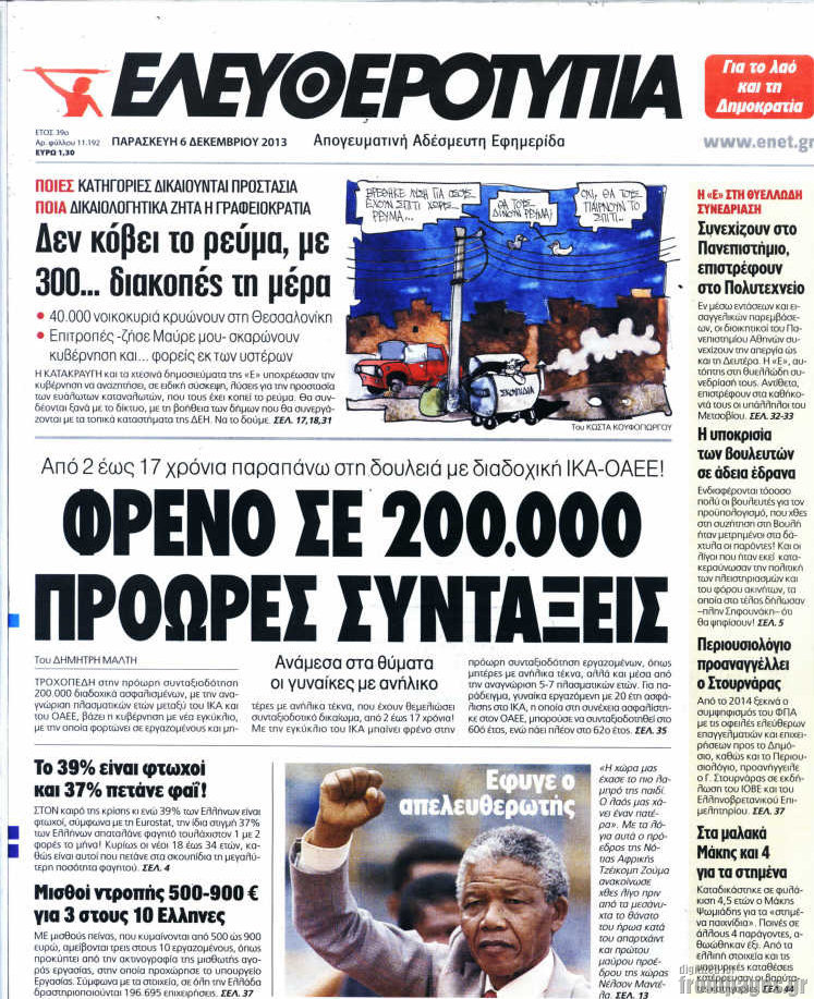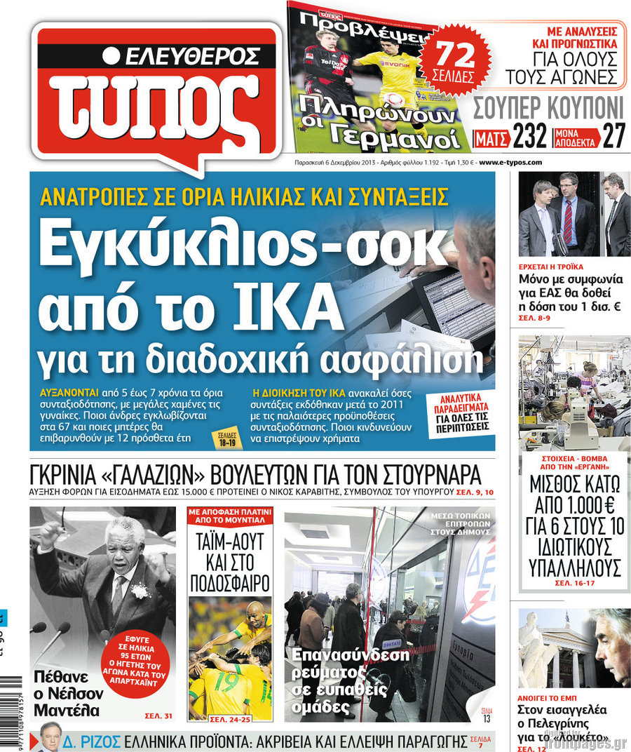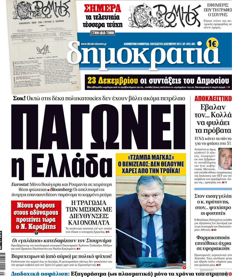 Οι πολιτικές εφημερίδες Enikos Newsroom 08:35, Παρασκευή 06 Δεκεμβρίου 2013 Media Οι πολιτικές εφημερίδες Διαβάστε τα πρωτοσέλιδα των πολιτικών εφημερίδων: ΕΦΗΜΕΡΙΔΕΣ ΠΟΛΙΤΙΚΕΣ ΕΦΗΜΕΡΙΔΕΣ ΠΡΩΤΟΣΕΛΙΔΑ Μοιράσου το: σχολίασε κι εσύ (0 σχόλια) Ακολουθήστε το enikos.gr στο Google News και μάθετε πρώτοι όλες τις ειδήσεις Δείτε όλες τις τελευταίες ειδήσεις από την Ελλάδα και τον Κόσμο στο enikos.gr Ειδήσεις Ροή Ειδήσεων 3 ώρες πριν Μητσοτάκης σε αγρότες: Είμαστε ανοιχτοί στον διάλογο, αλλά όχι στο παράλογο – Η διεκδίκηση αιτημάτων οφείλει να γίνεται με σεβασμό στο κοινωνικό σύνολο 2 ώρες πριν Κηφισιά: Δύο συλλήψεις για ληστεία με λεία 180.000 ευρώ – Βίντεο ντοκουμέντα από τη δράση των συλληφθέντων 3 ώρες πριν Γρίπη: «Καμπανάκι» από τους επιστήμονες για έξαρση κρουσμάτων στις γιορτές – Ποιοι κινδυνεύουν και πώς προστατευόμαστε 4 ώρες πριν Γαλλία: Έτοιμοι για Χριστούγεννα στους δρόμους οι αγρότες – «Οι δεσμεύσεις της κυβέρνησης δεν είναι αρκετές» 4 ώρες πριν Η οικογενειακή διαμάχη των Μπέκαμ: Το block από τον Μπρούκλιν και η απόφαση να περάσει τα Χριστούγεννα με τους δισεκατομμυριούχους γονείς της συζύγου του 3 ώρες πριν Τα άστρα ευνοούν σκανδαλωδώς 4 ζώδια – «Εμφανίζονται ξαφνικά ευκαιρίες γιατί αποφασίζετε να αφήσετε πίσω το παρελθόν» 2 ώρες πριν Προπονήτρια γυμναστικής που έχασε 9 κιλά αποκαλύπτει: «Αυτοί είναι οι 5 παράγοντες που εμποδίζουν την απώλεια βάρους» 1 ώρα πριν Οι άνθρωποι που στρώνουν το κρεβάτι τους κάθε πρωί, διαθέτουν αυτές τις 8 κρυφές δυνάμεις 1 ημέρα πριν Enerwave: Το νέο «ρεύμα» στη λιανική ενέργειας που αλλάζει την εμπειρία του καταναλωτή 3 λεπτά πριν Κίνα: Έφτιαξαν χιονάνθρωπο ύψους 19 μέτρων – Βίντεο timelapse 10 λεπτά πριν Λειψυδρία: Πού βρισκόμαστε σήμερα και πώς προετοιμάζεται η ΕΥΔΑΠ για το επόμενο κρίσιμο διάστημα 18 λεπτά πριν Maestro – Χριστόφορος Παπακαλιάτης: Θα δείτε εκπλήξεις – Θα προβληθεί τον Οκτώβριο 27 λεπτά πριν ΣΥΡΙΖΑ για Μητσοτάκη: Ο κυνισμός και η αλαζονεία του δεν πείθει κανέναν πια – Ούτε τους αγροτοσυνδικαλιστές της παράταξης του 35 λεπτά πριν Athens Santa Run: Εκατοντάδες Άγιοι Βασίληδες έτρεξαν στο κέντρο της Αθήνες – Τα σκυλάκια έκλεψαν την παράσταση ENIKOS NETWORK Φοράτε ψηλοτάκουνα παπούτσια; Ποδίατροι συμβουλεύουν πόσο ψηλά επιτρέπεται να είναι και πώς να τα επιλέξετε Άσκηση: η «ασπίδα» του εγκεφάλου απέναντι στη γήρανση Φοροδιαφυγή: Πώς τα ψηφιακά εργαλεία άλλαξαν τα δεδομένα το 2025 και έφεραν δισεκατομμύρια στα ταμεία του Δημοσίου “Προσβασιμότητα κατ’ Οίκον”: Έως αύριο η υποβολή των δικαιολογητικών για 3.000 δικαιούχους Χαρτογραφώντας το «σημείο χωρίς επιστροφή»: Για πρώτη φορά αποκαλύπτεται με λεπτομέρεια το ακανθώδες όριο της ατμόσφαιρας τ... Η Google καταργεί τη λειτουργία «dark web report» – Πώς θα μπορούν οι χρήστες να διαγράφουν τα δεδομένα τους περισσότερα 09:43 , Κυριακή 21 Δεκεμβρίου 2025 Το λάθος στην ταινία Die Hard που άφησε άναυδους τους θαυμαστές του Μπρους Γουίλις Ένας φανατικός των ταινιών άφησε άναυδους τους θαυμαστές του Die Hard, επισημαίνοντας τρία βασ... 08:13 , Κυριακή 21 Δεκεμβρίου 2025 Άγιος έρωτας: Ένας καταστροφικός σεισμός χτυπά τη Στέρνα Καταιγιστικές είναι οι εξελίξεις στα δυο τελευταία, συγκλονιστικά επεισόδια του 2025 της σειρά... 08:00 , Κυριακή 21 Δεκεμβρίου 2025 Σήμερα με τη Realnews: Ό,τι και αν αγοράσεις, σκανάρεις και κερδίζεις! Σήμερα με τη Realnews: Ό,τι και αν αγοράσεις, σκανάρεις και κερδίζεις! Με το PADU app, το κορυ... 07:00 , Κυριακή 21 Δεκεμβρίου 2025 Σήμερα