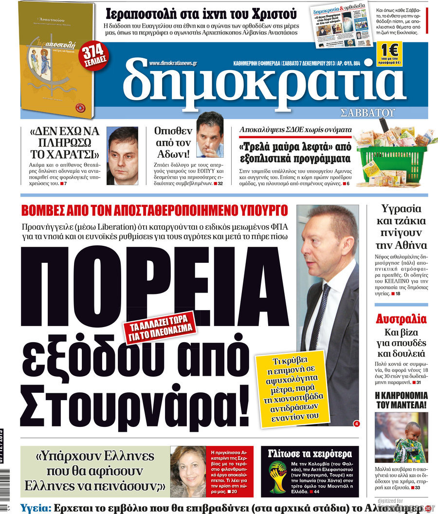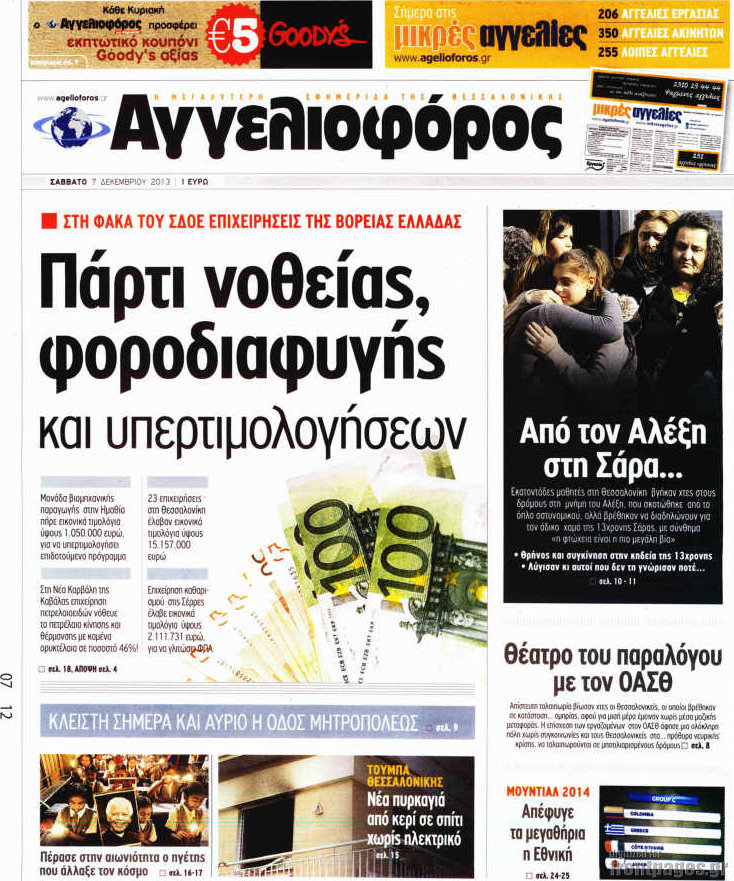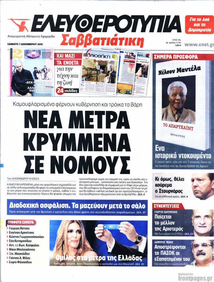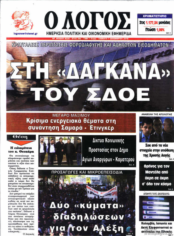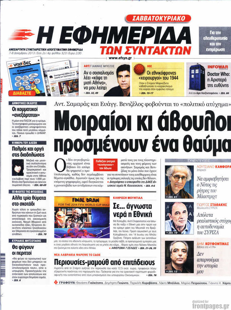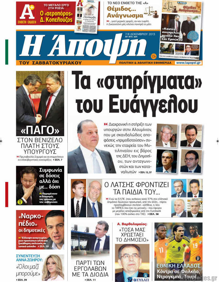 Οι πολιτικές εφημερίδες Enikos Newsroom 08:12, Σάββατο 07 Δεκεμβρίου 2013 Media Οι πολιτικές εφημερίδες ΕΦΗΜΕΡΙΔΕΣ ΠΟΛΙΤΙΚΕΣ ΕΦΗΜΕΡΙΔΕΣ Μοιράσου το: σχολίασε κι εσύ (0 σχόλια) Ακολουθήστε το enikos.gr στο Google News και μάθετε πρώτοι όλες τις ειδήσεις Δείτε όλες τις τελευταίες ειδήσεις από την Ελλάδα και τον Κόσμο στο enikos.gr Ειδήσεις Ροή Ειδήσεων 3 ώρες πριν Υπόθεση Έπσταϊν: Το Υπουργείο Δικαιοσύνης δημοσιοποίησε μια σειρά από εξαιρετικά επεξεργασμένα αρχεία – «Λείπουν τα πιο σημαντικά έγγραφα», λένε οι Δημοκρατικοί 22 λεπτά πριν Γιορτές με μπλόκα για τους αγρότες: Ανοίγουν διόδια και μοιράζουν προϊόντα στους ταξιδιώτες 54 λεπτά πριν Εξαφάνιση 33χρονου γιατρού στην Κρήτη: «Άναψα τα φώτα, τρόμαξε και άρχισε να τρέχει στα χωράφια» – Η τελευταία διαδρομή και η μαρτυρία «κλειδί» 2 ώρες πριν Ο «χάρτης» με τις αυξήσεις και τις φοροελαφρύνσεις του 2026 – Ποιοι και πόσα κερδίζουν 38 λεπτά πριν Τα αρχεία του Έπσταϊν αποκαλύπτουν φωτογραφία του έκπτωτου πρίγκιπα Άντριου – Είναι ξαπλωμένος στην αγκαλιά 5 γυναικών 45 λεπτά πριν Μία νέα «χρυσή» περίοδος αρχίζει για 3 ζώδια από σήμερα – «Μία αναπάντεχη ευκαιρία οδηγεί στην επιτυχία» 5 ώρες πριν Αυγά: Πόσα μπορείτε να τρώτε την ημέρα με ασφάλεια για μέγιστη πρόσληψη πρωτεΐνης 3 ώρες πριν Αρχαιολόγοι ανακάλυψαν σε χωράφι απεικόνιση 600 ετών ενός Αγίου – Τα στοιχεία που δείχνουν ότι μαρτύρησε 2 ώρες πριν Αγχώνεται για το χριστουγεννιάτικο δώρο που πήρε στην πλούσια σύντροφό του – «Φοβάμαι πως θα το βρει φθηνιάρικο, φοράει βραχιόλια Cartier» 6 λεπτά πριν Πώς η κλιματική αλλαγή επηρεάζει εγκύους και βρέφη – Οι επιπτώσεις των υψηλών θερμοκρασιών 14 λεπτά πριν e-ΕΦΚΑ και ΔΥΠΑ: Οι πληρωμές από 22 έως 24 Δεκεμβρίου – Ποιοι θα δουν χρήματα στους λογαριασμούς τους 22 λεπτά πριν Συνελήφθη οδηγός μηχανής που έτρεχε με 161 χλμ στη Συγγρού – Τον έπιασε το ραντάρ της Τροχαίας 22 λεπτά πριν Γιορτές με μπλόκα για τους αγρότες: Ανοίγουν διόδια και μοιράζουν προϊόντα στους ταξιδιώτες 30 λεπτά πριν Τηλεθέαση (19/12): Κυριάρχησε η σειρά «Το σόι σου» – Τι νούμερα έκανε ο τελικός του GNTM ENIKOS NETWORK Είστε μόνιμα απρόσεκτοι; 3 σημάδια που δείχνουν ότι μπορεί να είναι σύμπτωμα πάθησης Πόσα κιλά παίρνουμε πραγματικά τα Χριστούγεννα, σύμφωνα με την επιστήμη – Πώς να το αποτρέψουμε; Επίδομα παιδιού: Τι αλλάζει από το 2026 – Το όφελος από τις φορολογικές ελαφρύνσεις Mega χριστουγεννιάτικη φορολοταρία: «Κλείδωσε» η ημερομηνία για την κλήρωση – Ερωτήσεις και απαντήσεις Χαρτογραφώντας το «σημείο χωρίς επιστροφή»: Για πρώτη φορά αποκαλύπτεται με λεπτομέρεια το ακανθώδες όριο της ατμόσφαιρας τ... Η Google καταργεί τη λειτουργία «dark web report» – Πώς θα μπορούν οι χρήστες να διαγράφουν τα δεδομένα τους περισσότερα 09:30 , Σάββατο 20 Δεκεμβρίου 2025 «Porto Leone: Στη γειτονιά με τα κόκκινα φανάρια» – Ο Χρόνης αποκαλύπτει στην Αλεξάνδρα το μυστικό για το παιδί της Λένας Η μεγάλη δραματική σειρά του Apha «Porto Leone: Στη γειτονιά με τα κόκκινα φανάρια» μας μεταφέ... 08:14 , Σάββατο 20 Δεκεμβρίου 2025 Τρομεροί γονείς: Η Μαρία Καβογιάννη εισβάλλει στο σπίτι της οικογένειας Στεφανίδη Όσα θα δούμε στο νέο διπλό επεισόδιο της σειράς «Τρομεροί γονείς», σήμερα Σάββατο 20 Δεκεμβρίο... 05:48 , Σάββατο 20 Δεκεμβρίου 2025 Οι οικονομικές εφημερίδες 20/12/2025 Διαβάστε τα πρωτοσέλιδα από τις οικονομικές εφημερίδες, σήμερα 20/12/2025. 05:43 , Σάββατο 20 Δεκεμβρίου 2025 Οι αθλητικές εφημερίδες 20/12/2025 Διαβάστε τα πρωτοσέλιδα από τις αθλητικές εφημε