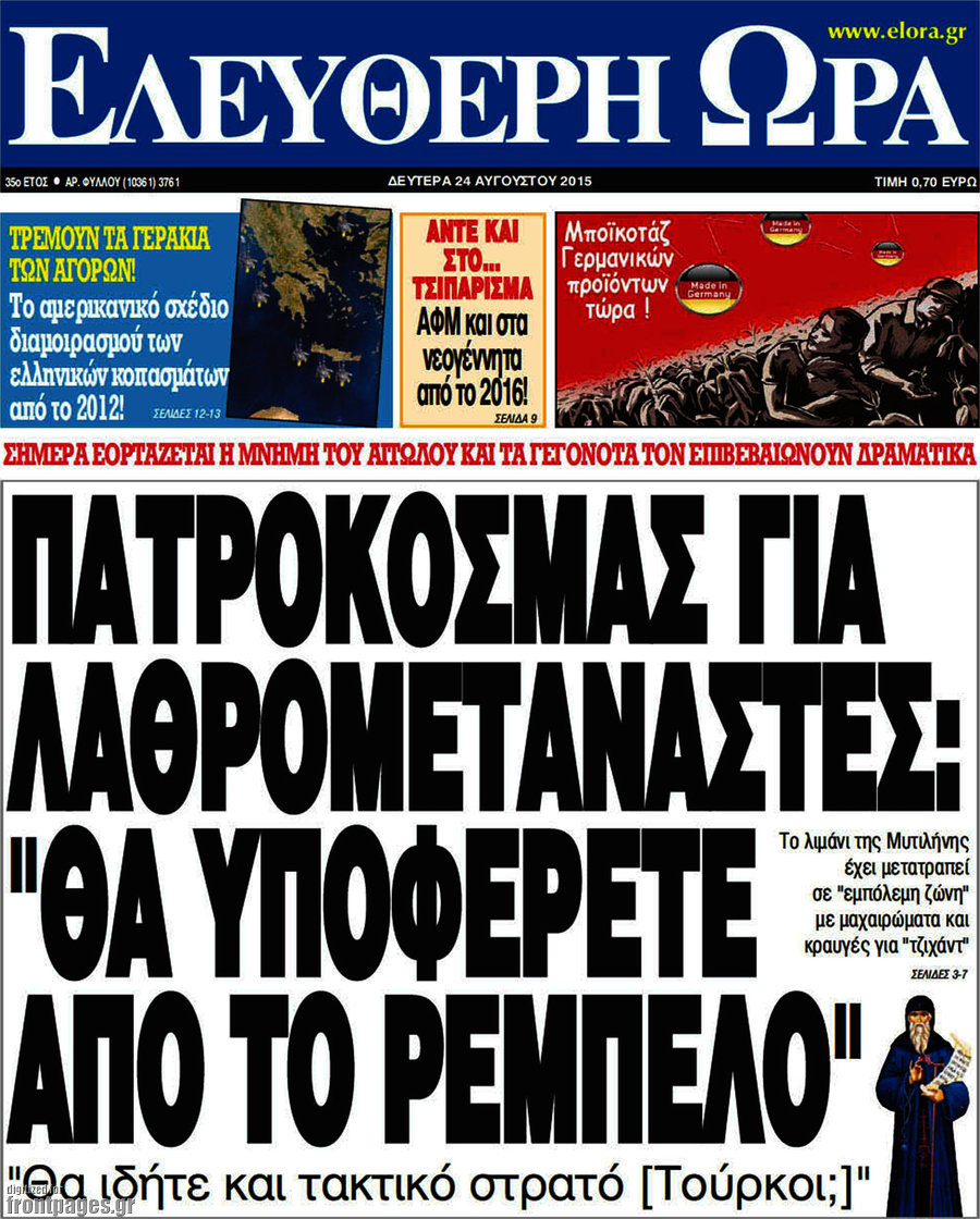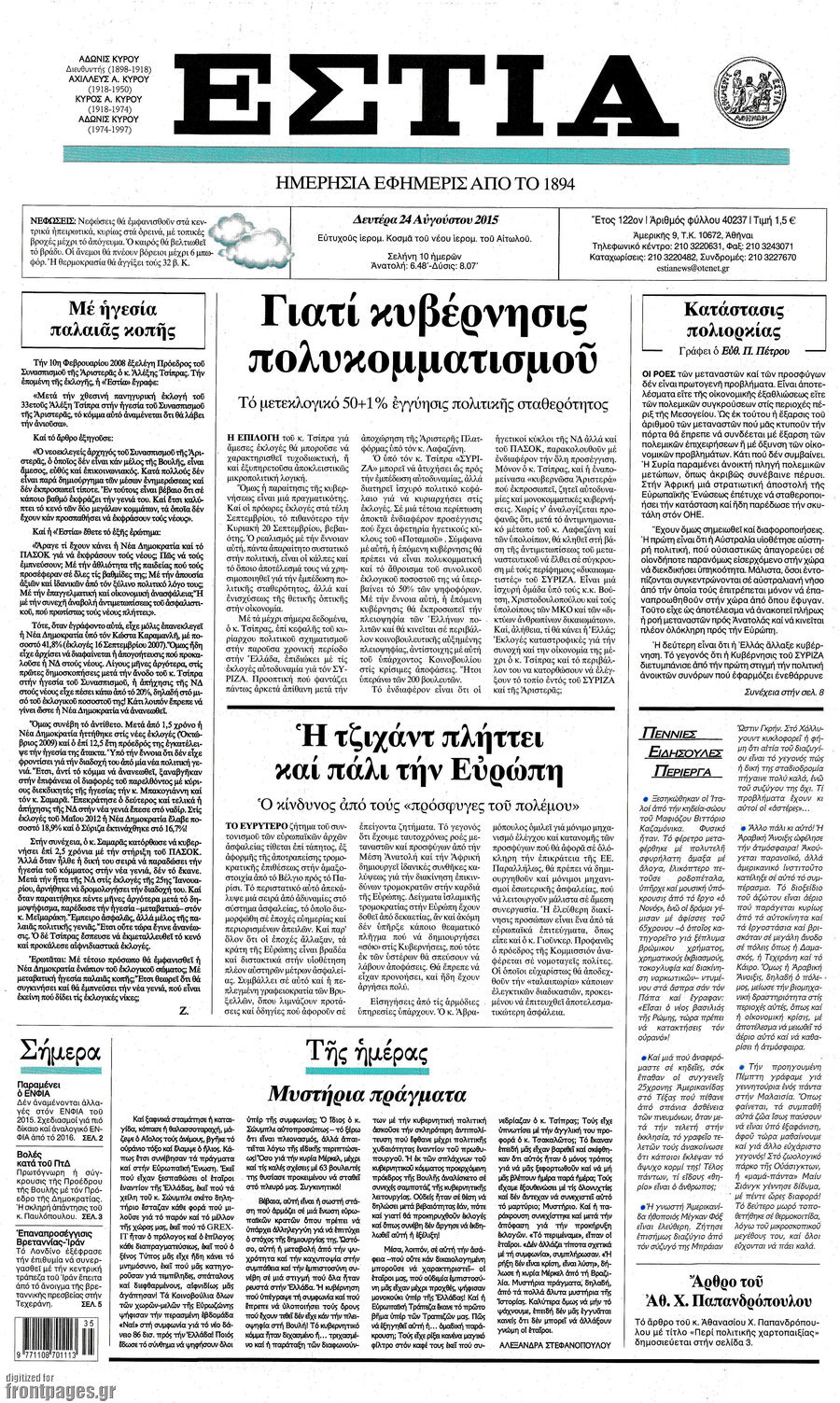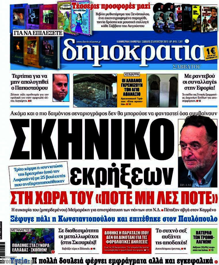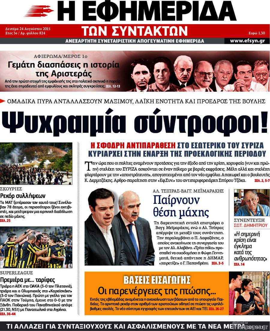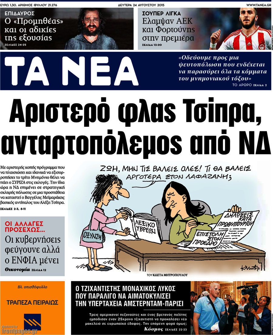Οι πολιτικές εφημερίδες 24/8/2015 Στεφανία Κασίμη 07:27, Δευτέρα 24 Αυγούστου 2015 Media ΠΟΛΙΤΙΚΕΣ ΕΦΗΜΕΡΙΔΕΣ ΠΡΩΤΟΣΕΛΙΔΑ Μοιράσου το: σχολίασε κι εσύ (0 σχόλια) Ακολουθήστε το enikos.gr στο Google News και μάθετε πρώτοι όλες τις ειδήσεις Δείτε όλες τις τελευταίες ειδήσεις από την Ελλάδα και τον Κόσμο στο enikos.gr Ειδήσεις Ροή Ειδήσεων 50 λεπτά πριν Χριστούγεννα στα μπλόκα: Επιμένουν στις κινητοποιήσεις τους οι αγρότες – Ανοίγουν τα διόδια το Σαββατοκύριακο 1 ώρα πριν Ουκρανία: Η άνευ προηγουμένου επίθεση σε ρωσικό τάνκερ στη Μεσόγειο και το μήνυμα προς στον Πούτιν – Το «μακρύ χέρι» του Κιέβου 28 λεπτά πριν Πούτιν: Τα μηνύματα σε Ευρώπη και ΝΑΤΟ από το μαραθώνιο «σόου» του – Η απαίτηση για «σεβασμό» και η ειρήνη «με τους όρους» της Μόσχας 1 ώρα πριν Τραμπ: Δεν αποκλείει την πιθανότητα ενός πολέμου στη Βενεζουέλα – «Ο Μαδούρο ξέρει καλύτερα από τον καθένα τι ακριβώς θέλω» 2 ώρες πριν Συνεχίζει να προκαλεί ο Μίτσκοσκι: «Για μένα το όνομα Μακεδονία είναι ιερό» 4 ώρες πριν Πούτιν: «Ναι, είμαι ερωτευμένος» – Βίντεο από τη σπάνια προσωπική παραδοχή του 2 ώρες πριν Αριθμολογία: Οι άνθρωποι που έχουν γεννηθεί αυτές τις 4 ημερομηνίες, συχνά παρεξηγούνται – «Η καλοσύνη τους κρύβει τεράστια δύναμη» 1 ώρα πριν Ύπνος: Μια κρυφή κατάσταση του εγκεφάλου πριν από τον ύπνο μπορεί να είναι το “κλειδί” για υψηλή ευφυΐα και δημιουργικότητα 3 ώρες πριν Ξεχάστε το καθάρισμα το Σαββατοκύριακο: Ο «κανόνας των 20 λεπτών» που θα σας λύσει τα χέρια 29 λεπτά πριν Ανακαλύφθηκαν αρχαία χρυσά νομίσματα 2.200 ετών που απεικονίζουν τον θεό Απόλλωνα – Η άγνωστη σύνδεση με τον Φίλιππο Β΄ της Μακεδονίας 13 λεπτά πριν Ολυμπιακός – Βιλερμπάν 107-84: Επιστροφή στις νίκες με… προπόνηση 19 λεπτά πριν Νέος Κόσμος: Συνελήφθη 41χρονος με ένταλμα από την Τουρκία για εμπόριο ναρκωτικών και ληστεία 28 λεπτά πριν Πούτιν: Τα μηνύματα σε Ευρώπη και ΝΑΤΟ από το μαραθώνιο «σόου» του – Η απαίτηση για «σεβασμό» και η ειρήνη «με τους όρους» της Μόσχας 29 λεπτά πριν Ανακαλύφθηκαν αρχαία χρυσά νομίσματα 2.200 ετών που απεικονίζουν τον θεό Απόλλωνα – Η άγνωστη σύνδεση με τον Φίλιππο Β΄ της Μακεδονίας 33 λεπτά πριν Νίκος Ξυλούρης: Συγκινεί η χήρα του σπουδαίου καλλιτέχνη – «Ευχαριστώ όλο τον κόσμο που τον κρατάει ζωντανό 45 χρόνια» ENIKOS NETWORK Το ΕΚΑΒ τιμήθηκε από την Ακαδημία Αθηνών για τα 40 χρόνια προσφοράς του Έχετε πραγματικά μεγάλη καρδιά; 10 χαρακτηριστικά όσων έχουν καλοσύνη Αναστολή μέτρων αναγκαστικής εκτέλεσης για κτηνοτρόφους που πλήττονται από την ευλογιά των αιγοπροβάτων Πλήρης επάρκεια προϊόντων στις λαϊκές της Αττικής, παρά τις αγροτικές κινητοποιήσεις – Τι απαντούν οι πωλητές Χαρτογραφώντας το «σημείο χωρίς επιστροφή»: Για πρώτη φορά αποκαλύπτεται με λεπτομέρεια το ακανθώδες όριο της ατμόσφαιρας τ... Η Google καταργεί τη λειτουργία «dark web report» – Πώς θα μπορούν οι χρήστες να διαγράφουν τα δεδομένα τους περισσότερα 22:42 , Παρασκευή 19 Δεκεμβρίου 2025 Γιώργος Γιαννόπουλος για “Το σόι σου”: “Είναι ευτυχία και ευλογία αυτή η σειρά” «Είναι ευτυχία και ευλογία η συγκυρία αυτής της σειράς», θα πει ο Γιώργος Γιαννόπουλος -ο αγαπ... 20:37 , Παρασκευή 19 Δεκεμβρίου 2025 Don’t Forget The Lyrics: Η Έλλη Κοκκίνου υποδέχεται 4 παίκτες που θα κάνουν τα πάντα για να μη χάσουν ούτε… μισή λέξη από τους στίχους Το «Don’t Forget The Lyrics» επιστρέφει απόψε, Παρασκευή 19 Δεκεμβρίου, στις 21:00 με νέο επει... 19:31 , Παρασκευή 19 Δεκεμβρίου 2025 GNTM: Απόψε ο μεγάλος τελικός για του