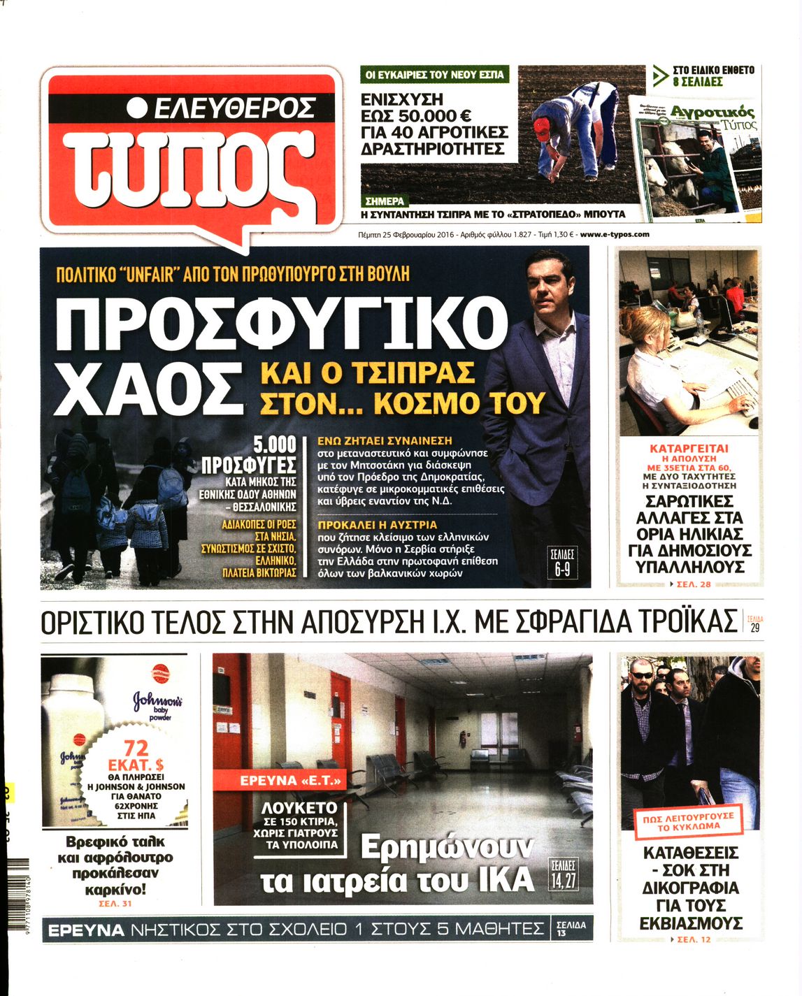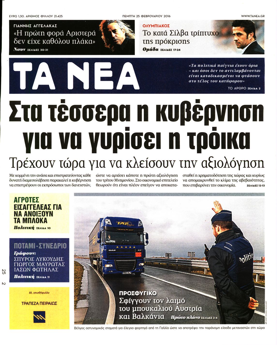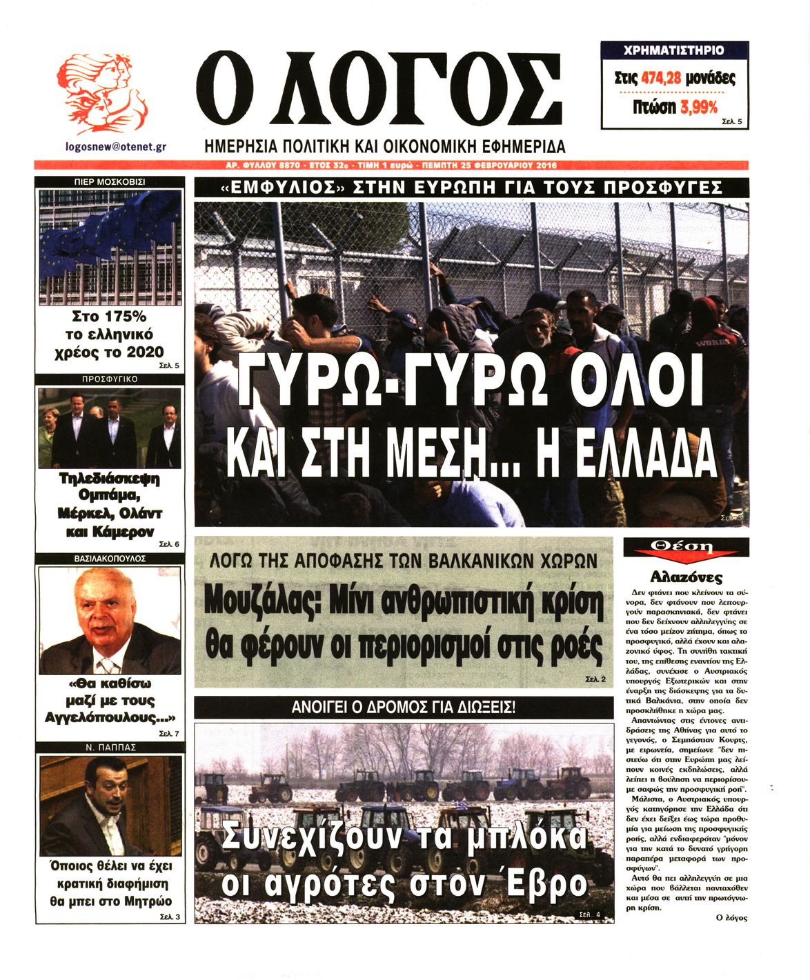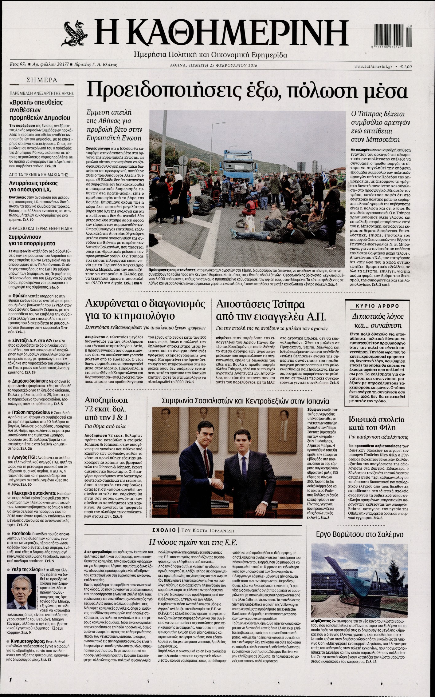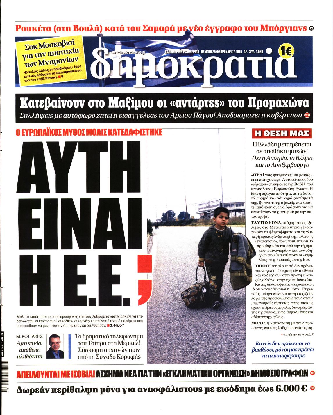 Οι πολιτικές εφημερίδες 25-2-2016 Enikos Newsroom 07:15, Πέμπτη 25 Φεβρουαρίου 2016 Media Διαβάστε τα σημερινά πρωτοσέλιδα των πολιτικών εφημερίδων ΠΟΛΙΤΙΚΕΣ ΕΦΗΜΕΡΙΔΕΣ ΠΡΩΤΟΣΕΛΙΔΑ Μοιράσου το: σχολίασε κι εσύ (0 σχόλια) Ακολουθήστε το enikos.gr στο Google News και μάθετε πρώτοι όλες τις ειδήσεις Δείτε όλες τις τελευταίες ειδήσεις από την Ελλάδα και τον Κόσμο στο enikos.gr Ειδήσεις Ροή Ειδήσεων 12 λεπτά πριν Διάλογοι-σοκ από το κύκλωμα που διακινούσε ναρκωτικά σε σχολεία – «Αν δεν είσαι εκεί σε 5 λεπτά, θα φας πολύ ξύλο μπρο» 2 ώρες πριν Αγρότες από το μπλόκο Νίκαιας κλείνουν τη Δευτέρα τις σήραγγες των Τεμπών για τα φορτηγά – Τι αποφάσισαν 4 ώρες πριν Κηφισιά: Δύο συλλήψεις για ληστεία με λεία 180.000 ευρώ – Βίντεο ντοκουμέντα από τη δράση των συλληφθέντων 1 ώρα πριν Ζελένσκι: Τάχθηκε σήμερα υπέρ της διεξαγωγής ευρύτερων διαβουλεύσεων με Ευρωπαίους εταίρους 2 ώρες πριν Θεσσαλονίκη: Με Αγιοβασίληδες γέμισε ο Θερμαϊκός στο 5ο Santa SUP 6 ώρες πριν Τα άστρα ευνοούν σκανδαλωδώς 4 ζώδια – «Εμφανίζονται ξαφνικά ευκαιρίες γιατί αποφασίζετε να αφήσετε πίσω το παρελθόν» 4 ώρες πριν Οι άνθρωποι που στρώνουν το κρεβάτι τους κάθε πρωί, διαθέτουν αυτές τις 8 κρυφές δυνάμεις 42 λεπτά πριν Ένα πλάσμα στα βάθη της θάλασσας απορροφά άνθρακα από την ατμόσφαιρα – «Δεν είχαμε ιδέα για την ύπαρξή του» 1 ημέρα πριν Enerwave: Το νέο «ρεύμα» στη λιανική ενέργειας που αλλάζει την εμπειρία του καταναλωτή 4 λεπτά πριν Σόφη Ζαννίνου: «Έκλαιγε τόσο πολύ ο Βέγγος που είπα να τον πάρουν, μην πάθει κάτι και το έχω βάρος στη συνείδησή μου» 12 λεπτά πριν Διάλογοι-σοκ από το κύκλωμα που διακινούσε ναρκωτικά σε σχολεία – «Αν δεν είσαι εκεί σε 5 λεπτά, θα φας πολύ ξύλο μπρο» 13 λεπτά πριν Νέα έρευνα: Οκτώ στους δέκα Έλληνες αγοράζουν από online πλατφόρμες χωρών εκτός ΕΕ – Temu και Shein οι κορυφαίες επιλογές 22 λεπτά πριν Αγρότες: Ανοιχτός ο Προμαχώνας για όλα τα οχήματα την Παραμονή και την ημέρα των Χριστουγέννων 27 λεπτά πριν Βελόπουλος: Ο πρωθυπουργός επαναλαμβάνει συνεχώς τα ίδια ψέματα ENIKOS NETWORK Ο εγκέφαλός μας ξεπερνά ακόμα σε εξυπνάδα το ΑΙ – Ποιο είναι αυτό στο οποίο είμαστε καλύτεροι Φοράτε ψηλοτάκουνα παπούτσια; Ποδίατροι συμβουλεύουν πόσο ψηλά επιτρέπεται να είναι και πώς να τα επιλέξετε IRIS: Διπλασιάζεται το όριο μεταφοράς χρημάτων μεταξύ ιδιωτών – Οι νέες αλλαγές και πότε θα εφαρμοστούν Η επόμενη ημέρα για τις ελληνικές τράπεζες -Τι λένε κορυφαία στελέχη του κλάδου Χαρτογραφώντας το «σημείο χωρίς επιστροφή»: Για πρώτη φορά αποκαλύπτεται με λεπτομέρεια το ακανθώδες όριο της ατμόσφαιρας τ... Η Google καταργεί τη λειτουργία «dark web report» – Πώς θα μπορούν οι χρήστες να διαγράφουν τα δεδομένα τους περισσότερα 15:08 , Κυριακή 21 Δεκεμβρίου 2025 Μια νύχτα μόνο: Η Αρετή και ο Οδυσσέας έρχονται και πάλι κοντά Το νέο επεισόδιο της δραματικής σειράς του MEGA «Μια νύχτα μόνο», θα προβληθεί απόψε Κυριακή 2... 14:24 , Κυριακή 21 Δεκεμβρίου 2025 IQ 160: Ο φάκελος με το τεστ πατρότητας ανοίγει, απόψε στις 21:00 στο Star Ανατρεπτικό το νέο διπλό επεισόδιο της σειράς “IQ 160” στις 21:00 στο Star. Ο Τηλέ... 09:43 , Κυριακή 21 Δεκεμβρίου 2025 Το λάθος στην ταινία Die Hard που άφησε άναυδους τους θαυμαστές του Μπρους Γουίλις Ένας φανατικός των ταινιών άφησε άναυδους τους θαυμαστές του Die Hard, επισημαίνοντας τρία βασ... 08:13 , Κυριακή 21 Δεκεμβρίου 2025 Άγιος έρωτας: Ένας καταστροφικός σεισμός χτυπά τη Στέρνα Καταιγιστικές είναι οι εξελίξεις στα δυο τελευταία, συγκλονιστικά επεισόδια του 2025 τ