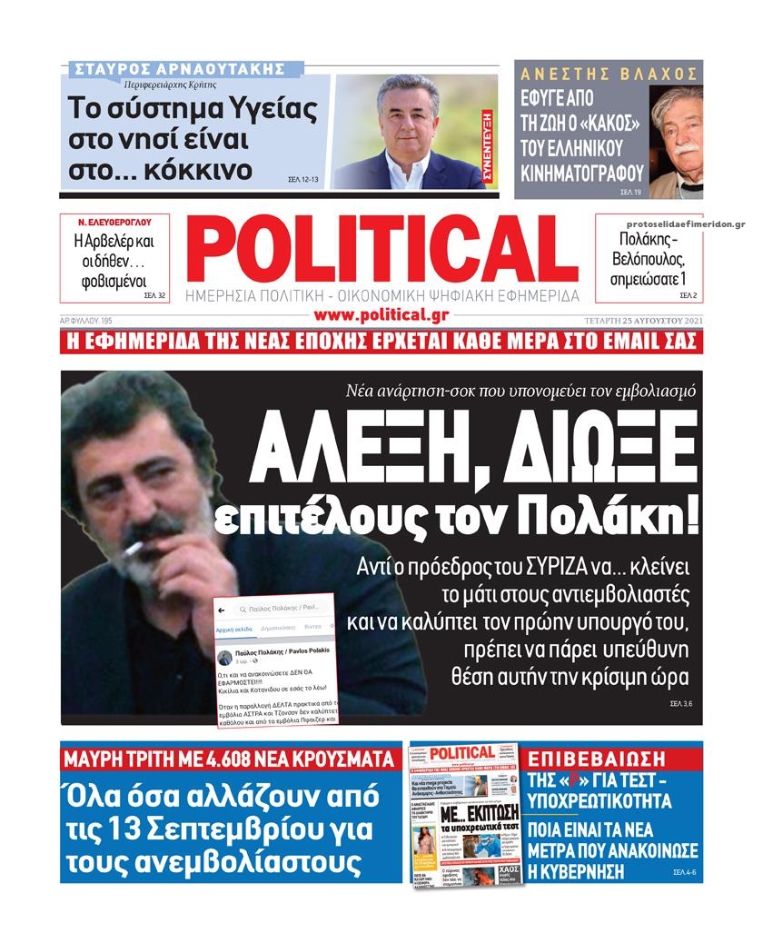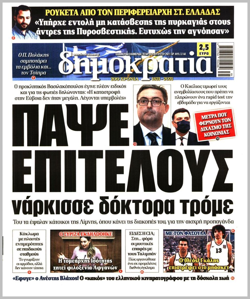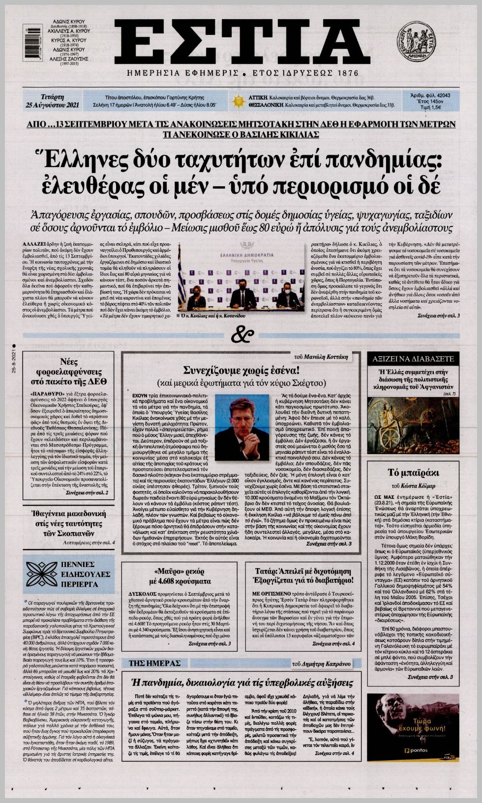 Οι πολιτικές εφημερίδες 25/8/2021 Διονύσης Νίκκας 06:17, Τετάρτη 25 Αυγούστου 2021 Media Διαβάστε τα πρωτοσέλιδα των πολιτικών εφημερίδων… ΕΦΗΜΕΡΙΔΕΣ ΠΡΩΤΟΣΕΛΙΔΑ Μοιράσου το: σχολίασε κι εσύ (0 σχόλια) Ακολουθήστε το enikos.gr στο Google News και μάθετε πρώτοι όλες τις ειδήσεις Δείτε όλες τις τελευταίες ειδήσεις από την Ελλάδα και τον Κόσμο στο enikos.gr Ειδήσεις Ροή Ειδήσεων 8 ώρες πριν Χριστούγεννα στα μπλόκα: Επιμένουν στις κινητοποιήσεις τους οι αγρότες – Ανοίγουν τα διόδια το Σαββατοκύριακο 9 ώρες πριν Ουκρανία: Η άνευ προηγουμένου επίθεση σε ρωσικό τάνκερ στη Μεσόγειο και το μήνυμα προς στον Πούτιν – Το «μακρύ χέρι» του Κιέβου 8 ώρες πριν Πούτιν: Τα μηνύματα σε Ευρώπη και ΝΑΤΟ από το μαραθώνιο «σόου» του – Η απαίτηση για «σεβασμό» και η ειρήνη «με τους όρους» της Μόσχας 7 ώρες πριν ΗΠΑ: Η κυβέρνηση του Ντόναλντ Τραμπ άρχισε να δημοσιοποιεί τα αρχεία Έπσταϊν 7 ώρες πριν Άνω Λιόσια: Πυροβολισμοί σε επιχείρηση με χαλιά – Εντοπίστηκαν 10 κάλυκες 49 λεπτά πριν Αυγά: Πόσα μπορείτε να τρώτε την ημέρα με ασφάλεια για μέγιστη πρόσληψη πρωτεΐνης 1 ώρα πριν Τα ζώδια σήμερα, Σάββατο 20 Δεκεμβρίου: Παρθένοι, το σύμπαν σας δίνει το κλειδί 8 ώρες πριν Ανακαλύφθηκαν αρχαία χρυσά νομίσματα 2.200 ετών που απεικονίζουν τον θεό Απόλλωνα – Η άγνωστη σύνδεση με τον Φίλιππο Β΄ της Μακεδονίας 9 ώρες πριν Ύπνος: Μια κρυφή κατάσταση του εγκεφάλου πριν από τον ύπνο μπορεί να είναι το “κλειδί” για υψηλή ευφυΐα και δημιουργικότητα 10 λεπτά πριν Κίριλ Ντμίτριεφ: Στις ΗΠΑ ο απεσταλμένος της Ρωσίας για συνομιλίες με τους ομολόγους του, Γουίτκοφ και Κούσνερ 17 λεπτά πριν ΔΕΔΔΗΕ: Διακοπές ρεύματος σήμερα (20/12) στην Αθήνα και σε άλλες 7 περιοχές της Αττικής 26 λεπτά πριν Κολομβία: Είκοσι χρόνια κάθειρξη σε πρώην ανώτερο αξιωματικό για 72 εκτελέσεις αμάχων 33 λεπτά πριν Οπτική ψευδαίσθηση: Μόνο αν είσαι ο Σέρλοκ Χολμς θα βρεις τον αριθμό «87» σε 7 δευτερόλεπτα 40 λεπτά πριν Σαρωτικοί οι έλεγχοι στους δρόμους ενόψει εορτών – Μπλόκα της τροχαίας σε κεντρικές αρτηρίες της Αττικής ENIKOS NETWORK Το ΕΚΑΒ τιμήθηκε από την Ακαδημία Αθηνών για τα 40 χρόνια προσφοράς του Έχετε πραγματικά μεγάλη καρδιά; 10 χαρακτηριστικά όσων έχουν καλοσύνη Αναστολή μέτρων αναγκαστικής εκτέλεσης για κτηνοτρόφους που πλήττονται από την ευλογιά των αιγοπροβάτων Πλήρης επάρκεια προϊόντων στις λαϊκές της Αττικής, παρά τις αγροτικές κινητοποιήσεις – Τι απαντούν οι πωλητές Χαρτογραφώντας το «σημείο χωρίς επιστροφή»: Για πρώτη φορά αποκαλύπτεται με λεπτομέρεια το ακανθώδες όριο της ατμόσφαιρας τ... Η Google καταργεί τη λειτουργία «dark web report» – Πώς θα μπορούν οι χρήστες να διαγράφουν τα δεδομένα τους περισσότερα 05:48 , Σάββατο 20 Δεκεμβρίου 2025 Οι οικονομικές εφημερίδες 20/12/2025 Διαβάστε τα πρωτοσέλιδα από τις οικονομικές εφημερίδες, σήμερα 20/12/2025. 05:43 , Σάββατο 20 Δεκεμβρίου 2025 Οι αθλητικές εφημερίδες 20/12/2025 Διαβάστε τα πρωτοσέλιδα από τις αθλητικές εφημερίδες, σήμερα 20/12/2025. 05:38 , Σάββατο 20 Δεκεμβρίου 2025 Οι πολιτικές εφημερίδες 20/12/2025 Διαβάστε τα πρωτοσέλιδα από τις πολιτικές εφημερίδες, σήμερα 20/12/2025. 04:20 , Σάββατο 20 Δεκεμβρίου 2025 Αγγελική Νικολούλη: Τα συλλυπητήρια για την απώλεια της Ειρήνης Μαρινάκη Τα συλληπητήρια στον πρόεδρο του Mega, τον Βαγγέλη Μαρινάκη, για την απώλεια της μητέρας του Ε... ΤΕΛΕΥΤΑΙΕΣ ΕΙΔΗΣΕΙΣ 10 λεπτά πριν Κίριλ Ντμίτριεφ: Στις ΗΠΑ ο απεσταλμένος της Ρωσίας... 17 λεπτά πριν ΔΕΔΔΗΕ: Διακοπές ρεύματος σήμερα (20/12) στην Αθήνα και... 26 λε