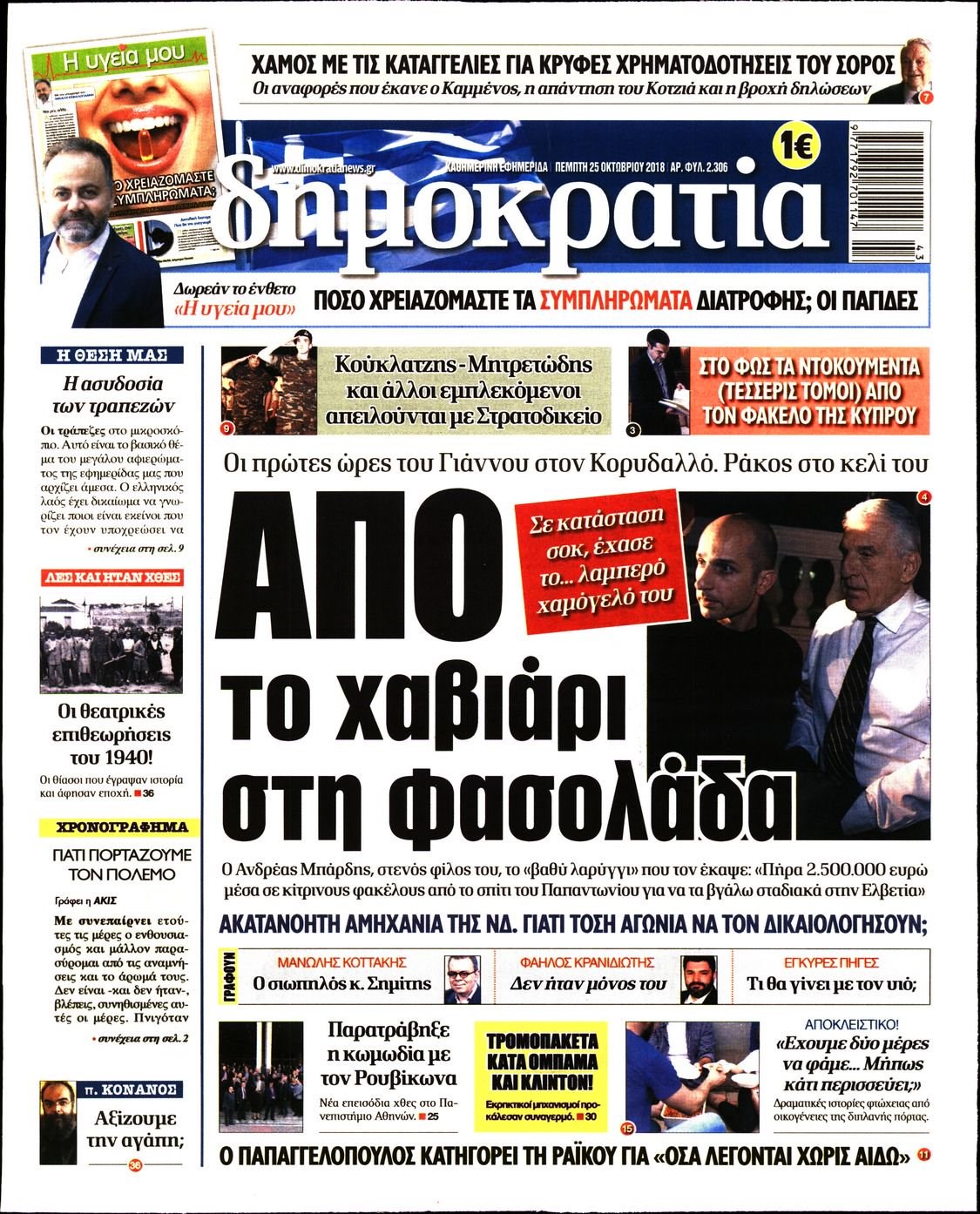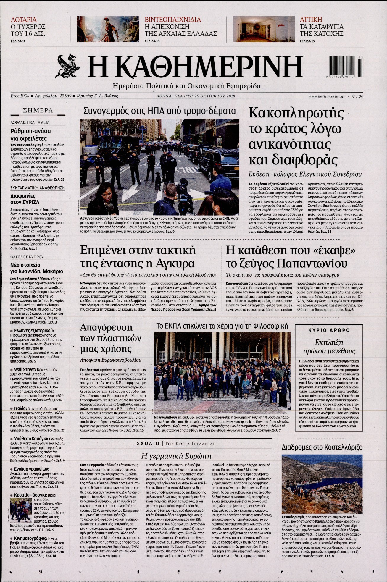 Οι πολιτικές εφημερίδες 25/10/2018 Enikos Newsroom 06:35, Πέμπτη 25 Οκτωβρίου 2018 Media Διαβάστε τα πρωτοσέλιδα: ΠΟΛΙΤΙΚΕΣ ΕΦΗΜΕΡΙΔΕΣ ΠΡΩΤΟΣΕΛΙΔΑ Μοιράσου το: σχολίασε κι εσύ (0 σχόλια) Ακολουθήστε το enikos.gr στο Google News και μάθετε πρώτοι όλες τις ειδήσεις Δείτε όλες τις τελευταίες ειδήσεις από την Ελλάδα και τον Κόσμο στο enikos.gr Ειδήσεις Ροή Ειδήσεων 4 ώρες πριν Χριστούγεννα στα μπλόκα οι αγρότες: Άνοιξαν στα διόδια και μοίρασαν προϊόντα στους πολίτες – Νέα σύσκεψη την Κυριακή στη Νίκαια 4 ώρες πριν Κύκλωμα διακίνησης ναρκωτικών σε σχολεία: Τηλεφωνούσαν στους ανηλίκους την ώρα του μαθήματος – Οι διάλογοι-σοκ, τα «ψευδώνυμα» και τα βασανιστήρια 4 ώρες πριν Αρχεία Επστάιν: Οι 500 σελίδες που λείπουν, τα αναπάντητα ερωτήματα και οι επώνυμοι – Τι έπεται 5 ώρες πριν Ζελένσκι: Μόνο οι ΗΠΑ και ο Τραμπ μπορούν να πιέσουν τη Ρωσία να βάλει τέλος στον πόλεμο 6 ώρες πριν Φοινικούντα: Προφυλακιστέος ο 30χρονος για συνέργεια στη διπλή δολοφονία – Και άλλα πρόσωπα στο «μικροσκόπιο» 4 ώρες πριν Αποκαλύφθηκε το άγνωστο «GPS» της αρχαιότητας – Πώς οι ναοί «φώτιζαν» τον δρόμο των ναυτικών πριν από την εφεύρεση των φάρων 5 ώρες πριν Ύπνος: Η διατροφή που μπορεί να σας βοηθήσει να κοιμάστε καλύτερα και να ζήσετε περισσότερο 6 ώρες πριν Αριθμολογία: Ο αριθμός του φύλακα αγγέλου σας, με βάση τον μήνα γέννησής σας – «Έτσι σας στέλνει σημάδια το σύμπαν» 18 ώρες πριν Enerwave: Το νέο «ρεύμα» στη λιανική ενέργειας που αλλάζει την εμπειρία του καταναλωτή 17 λεπτά πριν Δυτική Όχθη: Δύο Παλαιστίνιοι νεκροί από σφαίρες του Ισραηλινού στρατού 33 λεπτά πριν Ένοχος ο 54χρονος «ερευνητής» που έταζε ότι θα εντοπίσει τον αγνοούμενο γιατρό από την Κρήτη – «Μας γέμισε φρούδες ελπίδες», λέει ο πατέρας του 33χρονου 48 λεπτά πριν Σεισμός 3,8 Ρίχτερ ανοιχτά της Αμοργού 1 ώρα πριν Άννα Βίσση: Τα… Social Media «προσκύνησαν» την «απόλυτη» για την συναυλία της στο Καλλιμάρμαρο που προβλήθηκε από το Mega 1 ώρα πριν Φωτεινή Αθερίδου: «Προσπαθώ να είμαι κάθετη και αυστηρή σαν μαμά πια» ENIKOS NETWORK Οι γυναίκες αποκαλύπτουν το πιο ελκυστικό πράγμα που μπορεί να κάνει ένας άνδρας Ομορφιά και αντιγήρανση: Ειδικοί μιλούν για συσκευές περιποίησης του δέρματος «Πολεμική» προετοιμασία από την ευρωπαϊκή βιομηχανία ενέργειας – Η Eurelectric ζητεί «ομπρέλα» προστασίας για τις υποδομές Ακύρωση ΑΦΜ για απάτες – Ποιους βάζει στο στόχαστρο η ΑΑΔΕ Χαρτογραφώντας το «σημείο χωρίς επιστροφή»: Για πρώτη φορά αποκαλύπτεται με λεπτομέρεια το ακανθώδες όριο της ατμόσφαιρας τ... Η Google καταργεί τη λειτουργία «dark web report» – Πώς θα μπορούν οι χρήστες να διαγράφουν τα δεδομένα τους περισσότερα 01:30 , Κυριακή 21 Δεκεμβρίου 2025 Άννα Βίσση: Τα… Social Media «προσκύνησαν» την «απόλυτη» για την συναυλία της στο Καλλιμάρμαρο που προβλήθηκε από το Mega Την ημέρα των γενεθλίων της Άννας Βίσση, το MEGA τίμησε τη διαχρονική παρουσία της «απόλυτης Ε... 00:00 , Κυριακή 21 Δεκεμβρίου 2025 The Voice: Η επιστροφή της Έλενας Παπαρίζου και η ατάκα του Γιώργου Μαζωνάκη μετά τις καταγγελίες Στη φάση των Cross Battles Live μπήκε το The Voice, με την Έλενα Παπαρίζου να επιστρέφει στο π... 20:30 , Σάββατο 20 Δεκεμβρίου 2025 Αυτή την Κυριακή με τη Realnews: Instyle, μαζί Drive και Realnews Geopolitics Αυτή την Κυριακή με τη Realnews: Instyle, μαζί Drive και Realnews Geopolitics Instyle Η Άννα Ρ... 20:28 , Σάββατο 20 Δεκεμβρίου 2025 Ο ΑΝΤ1 γεμίζει τις γιορτές με μουσική – Ποιους καλλιτέχνες θα απολαύσουμε Φέτος στον ΑΝΤ1 γιορτάζουμε τις νύχτες μας παρέα με αγαπημένους καλλιτέχνες κ
