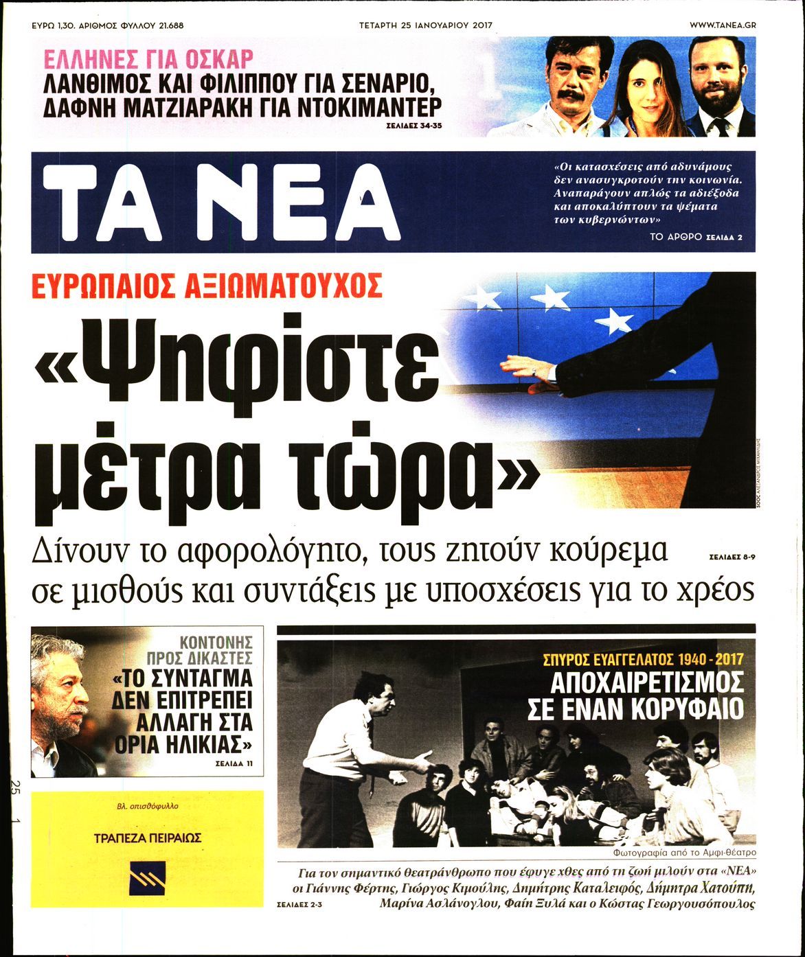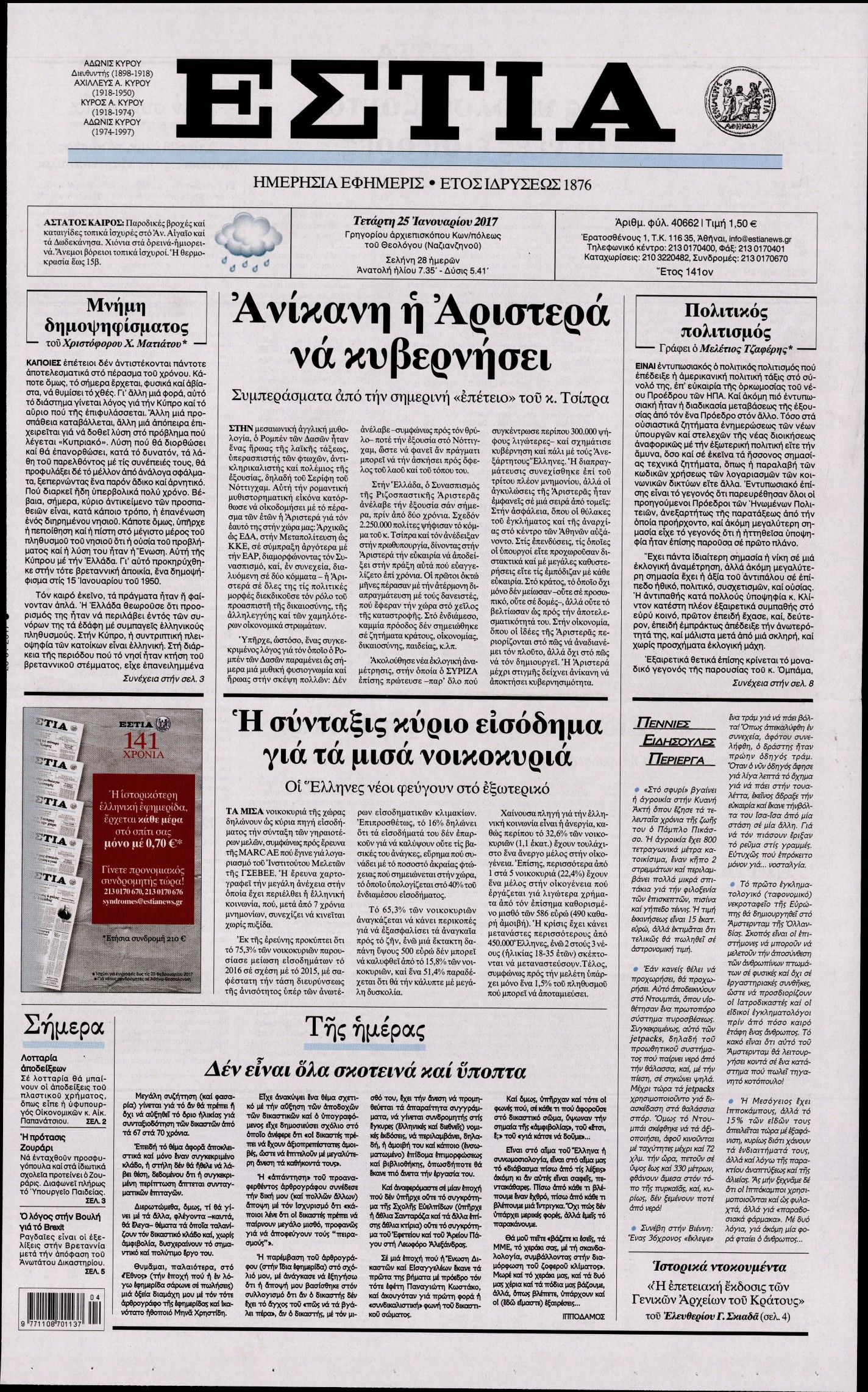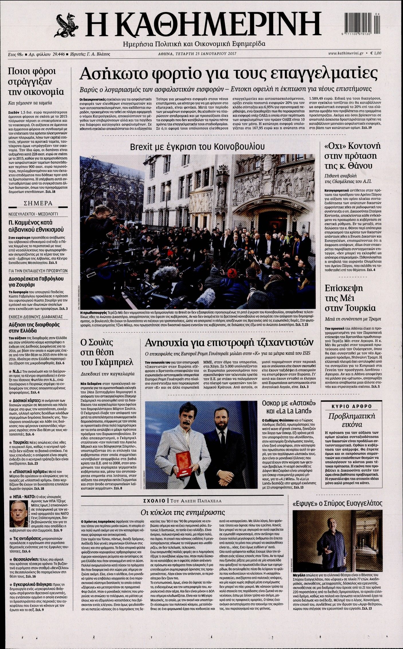 Οι πολιτικές εφημερίδες 25/1/2017 Enikos Newsroom 00:31, Τετάρτη 25 Ιανουαρίου 2017 Media Διαβάστε τα σημερινά πρωτοσέλιδα των πολιτικών εφημερίδων: ΠΟΛΙΤΙΚΕΣ ΕΦΗΜΕΡΙΔΕΣ ΠΡΩΤΟΣΕΛΙΔΑ Μοιράσου το: σχολίασε κι εσύ (0 σχόλια) Ακολουθήστε το enikos.gr στο Google News και μάθετε πρώτοι όλες τις ειδήσεις Δείτε όλες τις τελευταίες ειδήσεις από την Ελλάδα και τον Κόσμο στο enikos.gr Ειδήσεις Ροή Ειδήσεων 7 ώρες πριν Ρετζέπ Ταγίπ Ερντογάν: Δεν έχουμε καμία βλέψη στα εδάφη ή την κυριαρχία κανενός – Δεν θα επιτρέψουμε να παραβιαστούν τα δικαιώματά μας 9 ώρες πριν Χριστούγεννα στα μπλόκα οι αγρότες: Άνοιξαν στα διόδια και μοίρασαν προϊόντα στους πολίτες – Νέα σύσκεψη την Κυριακή στη Νίκαια 9 ώρες πριν Αρχεία Επστάιν: Οι 500 σελίδες που λείπουν, τα αναπάντητα ερωτήματα και οι επώνυμοι – Τι έπεται 9 ώρες πριν Κύκλωμα διακίνησης ναρκωτικών σε σχολεία: Τηλεφωνούσαν στους ανηλίκους την ώρα του μαθήματος – Οι διάλογοι-σοκ, τα «ψευδώνυμα» και τα βασανιστήρια 8 ώρες πριν H ακτοφυλακή των ΗΠΑ κατάσχεσε και δεύτερο τάνκερ στα ανοιχτά της Βενεζουέλας – Δείτε βίντεο 1 ώρα πριν Οπτική ψευδαίσθηση: Μόνο το 2% των ανθρώπων θα βρει την πεταλούδα σε 15 δευτερόλεπτα 2 ώρες πριν Μήλο vs μπανάνα: Ποιο φρούτο έχει περισσότερες φυτικές ίνες, σύμφωνα με διαιτολόγους – Τα οφέλη τους για την υγεία 2 ώρες πριν Τα ζώδια σήμερα, Κυριακή 21 Δεκεμβρίου: Αιγόκεροι, αποφασίζετε για το επόμενο κεφάλαιο της ζωής σας 23 ώρες πριν Enerwave: Το νέο «ρεύμα» στη λιανική ενέργειας που αλλάζει την εμπειρία του καταναλωτή 19 λεπτά πριν Σήμερα με τη Realnews: Ό,τι και αν αγοράσεις, σκανάρεις και κερδίζεις! 3 λεπτά πριν e-ΕΦΚΑ και ΔΥΠΑ: Ο «χάρτης» πληρωμών έως τις 24 Δεκεμβρίου – Ποιοι θα δουν χρήματα στον λογαριασμό τους από αύριο 10 λεπτά πριν Οι αθλητικές μεταδόσεις 21/12/2025 19 λεπτά πριν LEGEND: Ο διάδοχος της φρεγάτας Constellation έρχεται από την ακτοφυλακή των ΗΠΑ 26 λεπτά πριν Καιρός: Βροχές και χαμηλές θερμοκρασίες σήμερα – Η πρόγνωση για τα Χριστούγεννα ENIKOS NETWORK Το αφροδισιακό φυλλώδες λαχανικό που μπορεί να προστατεύσει τα μάτια και να καταπολεμήσει τον καρκίνο Το απόλυτο κόλπο με το αυτοκόλλητο για να βγει πρώτη η βαλίτσα σας από το αεροπλάνο «Πολεμική» προετοιμασία από την ευρωπαϊκή βιομηχανία ενέργειας – Η Eurelectric ζητεί «ομπρέλα» προστασίας για τις υποδομές Ακύρωση ΑΦΜ για απάτες – Ποιους βάζει στο στόχαστρο η ΑΑΔΕ Χαρτογραφώντας το «σημείο χωρίς επιστροφή»: Για πρώτη φορά αποκαλύπτεται με λεπτομέρεια το ακανθώδες όριο της ατμόσφαιρας τ... Η Google καταργεί τη λειτουργία «dark web report» – Πώς θα μπορούν οι χρήστες να διαγράφουν τα δεδομένα τους περισσότερα 07:00 , Κυριακή 21 Δεκεμβρίου 2025 Σήμερα με τη Realnews: Instyle, μαζί Drive και Realnews Geopolitics Σήμερα με τη Realnews: Instyle, μαζί Drive και Realnews Geopolitics Instyle Η Άννα Ρεζάν, η Ch... 06:55 , Κυριακή 21 Δεκεμβρίου 2025 Η Realnews στο www.pressreader.com Διαβάστε την ψηφιακή έκδοση της εφημερίδας στην οθόνη του κινητού, του tablet και του υπολογισ... 05:46 , Κυριακή 21 Δεκεμβρίου 2025 Οι αθλητικές εφημερίδες 21/12/2025 Διαβάστε τα πρωτοσέλιδα από τις αθλητικές εφημερίδες, σήμερα 21/12/2025. 05:38 , Κυριακή 21 Δεκεμβρίου 2025 Οι πολιτικές εφημερίδες 21/12/2025 Διαβάστε τα πρωτοσέλιδα από τις πολιτικές εφημερίδες, σήμερα 21/12/2025. ΤΕΛΕΥΤΑΙΕΣ ΕΙΔΗΣΕΙΣ 10 λεπτά πριν Οι αθλητικές μεταδόσεις 21/12/2025 19 λεπτά πριν LEGEND: Ο διάδοχος της φρεγάτας Constellation έρχεται από την... 26 λεπτά πριν Καιρός: Βροχές και χαμηλές θερμοκρασίες σήμερα – Η... 36 λεπτά πριν Εορτολόγιο: Ποιοι γιορτάζουν σήμερα 21 Δεκεμβρίου 41 λε