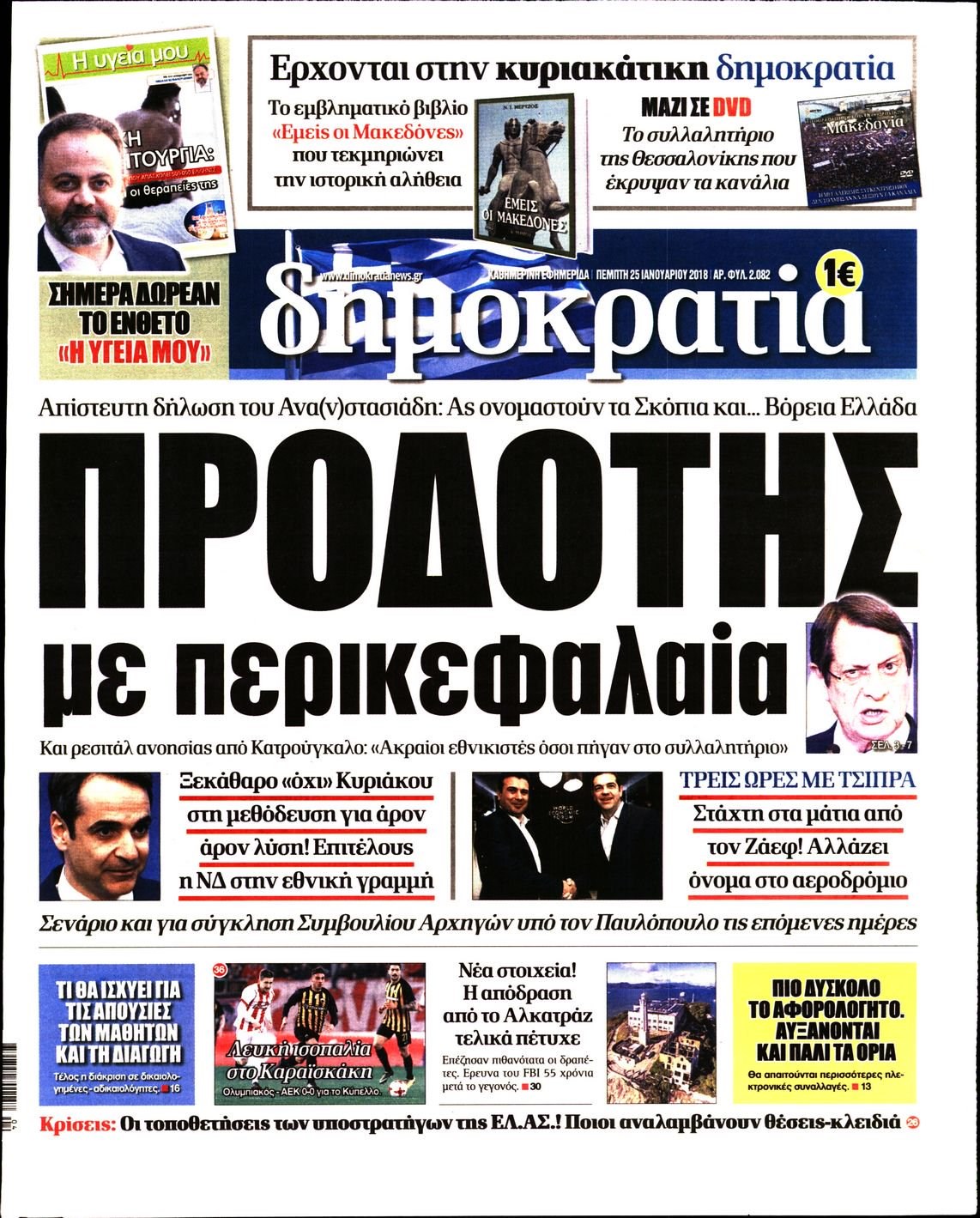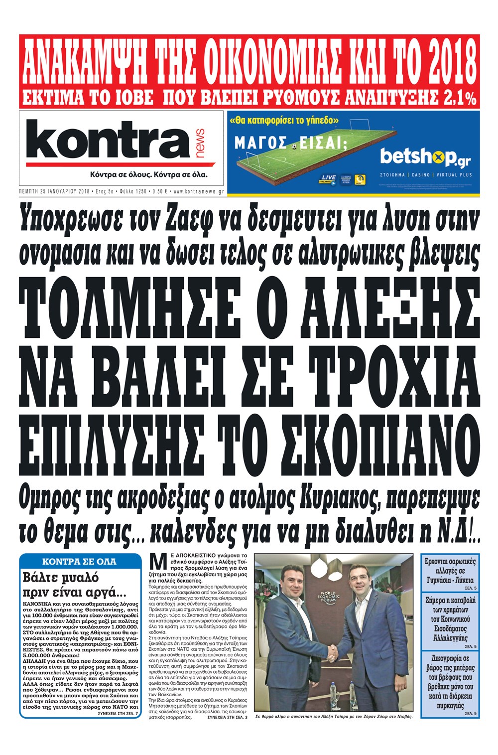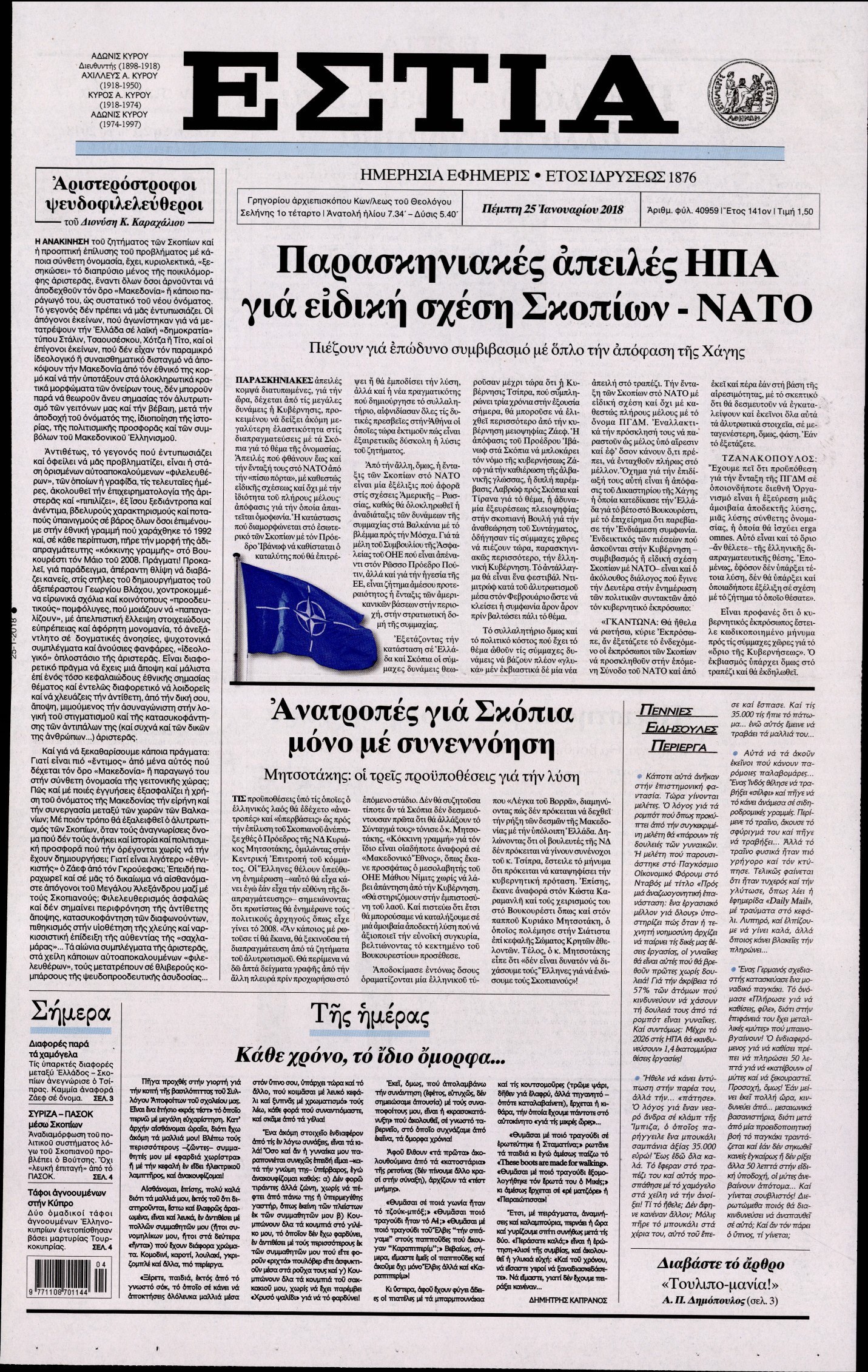 Οι πολιτικές εφημερίδες 25/1/2018 Enikos Newsroom 07:28, Πέμπτη 25 Ιανουαρίου 2018 Media Διαβάστε τα σημερινά πρωτοσέλιδα των πολιτικών εφημερίδων: ΠΟΛΙΤΙΚΕΣ ΕΦΗΜΕΡΙΔΕΣ ΠΡΩΤΟΣΕΛΙΔΑ Μοιράσου το: σχολίασε κι εσύ (0 σχόλια) Ακολουθήστε το enikos.gr στο Google News και μάθετε πρώτοι όλες τις ειδήσεις Δείτε όλες τις τελευταίες ειδήσεις από την Ελλάδα και τον Κόσμο στο enikos.gr Ειδήσεις Ροή Ειδήσεων 3 ώρες πριν Χριστούγεννα στα μπλόκα: Επιμένουν στις κινητοποιήσεις τους οι αγρότες – Ανοίγουν τα διόδια το Σαββατοκύριακο 3 ώρες πριν Ουκρανία: Η άνευ προηγουμένου επίθεση σε ρωσικό τάνκερ στη Μεσόγειο και το μήνυμα προς στον Πούτιν – Το «μακρύ χέρι» του Κιέβου 2 ώρες πριν Πούτιν: Τα μηνύματα σε Ευρώπη και ΝΑΤΟ από το μαραθώνιο «σόου» του – Η απαίτηση για «σεβασμό» και η ειρήνη «με τους όρους» της Μόσχας 3 ώρες πριν Τραμπ: Δεν αποκλείει την πιθανότητα ενός πολέμου στη Βενεζουέλα – «Ο Μαδούρο ξέρει καλύτερα από τον καθένα τι ακριβώς θέλω» 4 ώρες πριν Συνεχίζει να προκαλεί ο Μίτσκοσκι: «Για μένα το όνομα Μακεδονία είναι ιερό» 2 ώρες πριν Ανακαλύφθηκαν αρχαία χρυσά νομίσματα 2.200 ετών που απεικονίζουν τον θεό Απόλλωνα – Η άγνωστη σύνδεση με τον Φίλιππο Β΄ της Μακεδονίας 3 ώρες πριν Ύπνος: Μια κρυφή κατάσταση του εγκεφάλου πριν από τον ύπνο μπορεί να είναι το “κλειδί” για υψηλή ευφυΐα και δημιουργικότητα 4 ώρες πριν Αριθμολογία: Οι άνθρωποι που έχουν γεννηθεί αυτές τις 4 ημερομηνίες, συχνά παρεξηγούνται – «Η καλοσύνη τους κρύβει τεράστια δύναμη» 5 ώρες πριν Ξεχάστε το καθάρισμα το Σαββατοκύριακο: Ο «κανόνας των 20 λεπτών» που θα σας λύσει τα χέρια 4 λεπτά πριν Συρία: Μαζικά πλήγματα των ΗΠΑ σε θέσεις του Ισλαμικού Κράτους – Χέγκσεθ: «Δεν είναι αρχή πολέμου, είναι μια δήλωση εκδίκησης» για το θάνατο των στρατιωτών μας 17 λεπτά πριν Ουκρανία: Ολοκληρώθηκαν οι συνομιλίες με τους Αμερικανούς κι Ευρωπαίους διαπραγματευτές 32 λεπτά πριν Μπαρτσελόνα – Μπασκόνια 134-124: Οι «μπλαουγκράνα» πήραν το ματς της χρονιάς ύστερα από τρεις παρατάσεις 47 λεπτά πριν Φαίη Σκορδά: «Παλιότερα τα κομπλιμέντα τα προσπερνούσα, τώρα τα έχω ανάγκη» 1 ώρα πριν Βασίλης Σπανούλης: Δεν εμφανίστηκε ούτε ένας δημοσιογράφος στην συνέντευξη Τύπου – «Καλησπέρα στον… κανέναν», δείτε βίντεο ENIKOS NETWORK Το ΕΚΑΒ τιμήθηκε από την Ακαδημία Αθηνών για τα 40 χρόνια προσφοράς του Έχετε πραγματικά μεγάλη καρδιά; 10 χαρακτηριστικά όσων έχουν καλοσύνη Αναστολή μέτρων αναγκαστικής εκτέλεσης για κτηνοτρόφους που πλήττονται από την ευλογιά των αιγοπροβάτων Πλήρης επάρκεια προϊόντων στις λαϊκές της Αττικής, παρά τις αγροτικές κινητοποιήσεις – Τι απαντούν οι πωλητές Χαρτογραφώντας το «σημείο χωρίς επιστροφή»: Για πρώτη φορά αποκαλύπτεται με λεπτομέρεια το ακανθώδες όριο της ατμόσφαιρας τ... Η Google καταργεί τη λειτουργία «dark web report» – Πώς θα μπορούν οι χρήστες να διαγράφουν τα δεδομένα τους περισσότερα 22:42 , Παρασκευή 19 Δεκεμβρίου 2025 Γιώργος Γιαννόπουλος για “Το σόι σου”: “Είναι ευτυχία και ευλογία αυτή η σειρά” «Είναι ευτυχία και ευλογία η συγκυρία αυτής της σειράς», θα πει ο Γιώργος Γιαννόπουλος -ο αγαπ... 20:37 , Παρασκευή 19 Δεκεμβρίου 2025 Don’t Forget The Lyrics: Η Έλλη Κοκκίνου υποδέχεται 4 παίκτες που θα κάνουν τα πάντα για να μη χάσουν ούτε… μισή λέξη από τους στίχους Το «Don’t Forget The Lyrics» επιστρέφει απόψε, Παρασκευή 19 Δεκεμβρίου, στις 21:00 με νέο επει... 19:31 , Παρασκευή 19 Δεκεμβρίου 2025 GNTM: Απόψε ο μεγάλος τελικός για τους 4 φιναλίστ Έπειτα από μήνες γεμ
