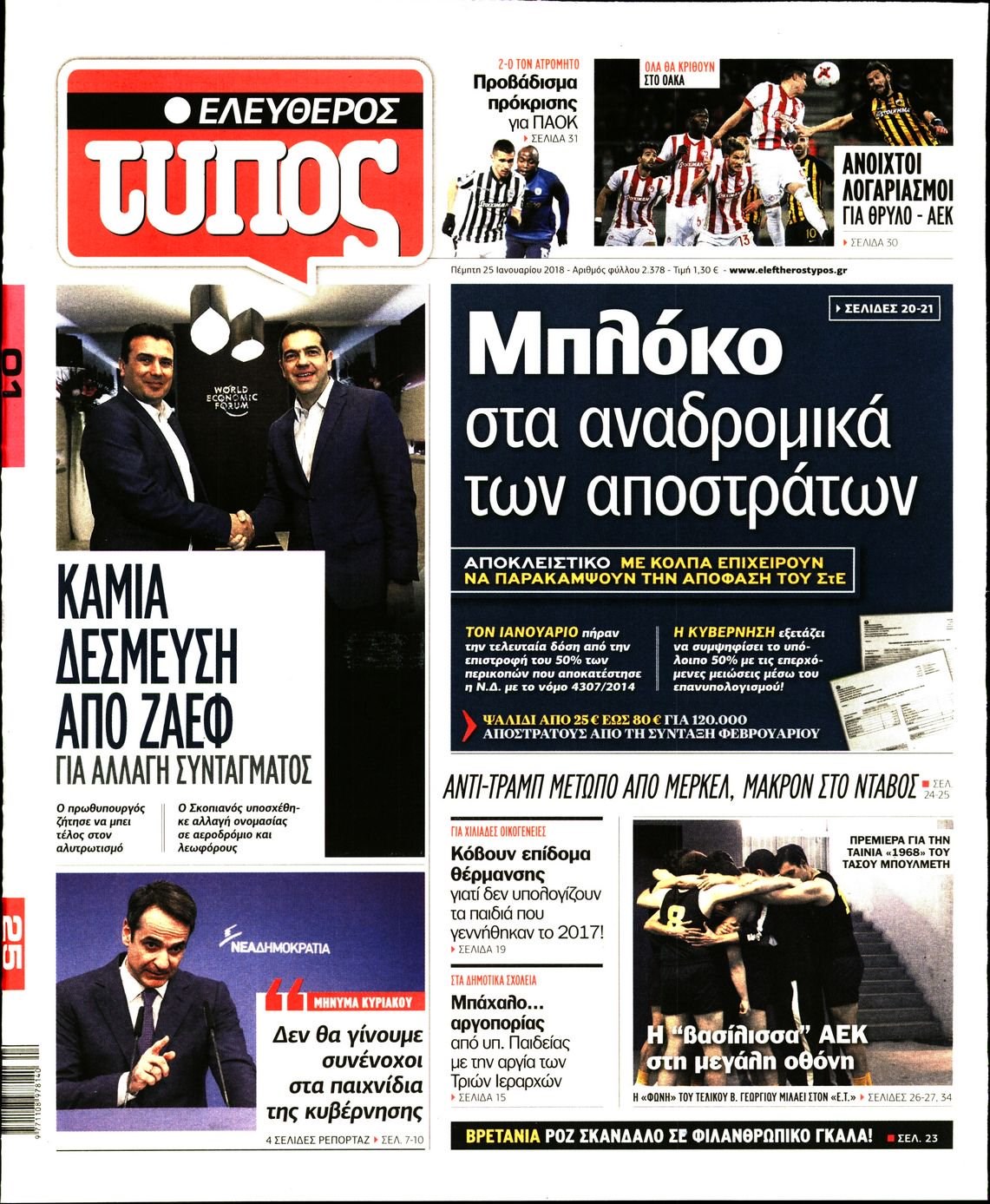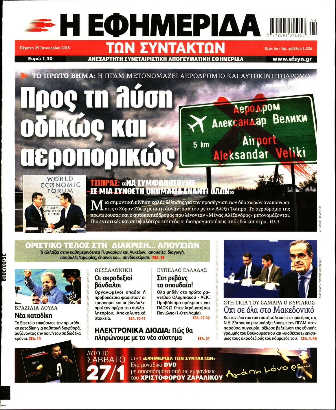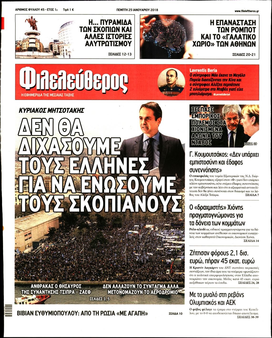 Οι πολιτικές εφημερίδες 25/1/2018 Enikos Newsroom 07:28, Πέμπτη 25 Ιανουαρίου 2018 Media Διαβάστε τα σημερινά πρωτοσέλιδα των πολιτικών εφημερίδων: ΠΟΛΙΤΙΚΕΣ ΕΦΗΜΕΡΙΔΕΣ ΠΡΩΤΟΣΕΛΙΔΑ Μοιράσου το: σχολίασε κι εσύ (0 σχόλια) Ακολουθήστε το enikos.gr στο Google News και μάθετε πρώτοι όλες τις ειδήσεις Δείτε όλες τις τελευταίες ειδήσεις από την Ελλάδα και τον Κόσμο στο enikos.gr Ειδήσεις Ροή Ειδήσεων 3 ώρες πριν Χριστούγεννα στα μπλόκα: Επιμένουν στις κινητοποιήσεις τους οι αγρότες – Ανοίγουν τα διόδια το Σαββατοκύριακο 3 ώρες πριν Ουκρανία: Η άνευ προηγουμένου επίθεση σε ρωσικό τάνκερ στη Μεσόγειο και το μήνυμα προς στον Πούτιν – Το «μακρύ χέρι» του Κιέβου 2 ώρες πριν Πούτιν: Τα μηνύματα σε Ευρώπη και ΝΑΤΟ από το μαραθώνιο «σόου» του – Η απαίτηση για «σεβασμό» και η ειρήνη «με τους όρους» της Μόσχας 3 ώρες πριν Τραμπ: Δεν αποκλείει την πιθανότητα ενός πολέμου στη Βενεζουέλα – «Ο Μαδούρο ξέρει καλύτερα από τον καθένα τι ακριβώς θέλω» 4 ώρες πριν Συνεχίζει να προκαλεί ο Μίτσκοσκι: «Για μένα το όνομα Μακεδονία είναι ιερό» 2 ώρες πριν Ανακαλύφθηκαν αρχαία χρυσά νομίσματα 2.200 ετών που απεικονίζουν τον θεό Απόλλωνα – Η άγνωστη σύνδεση με τον Φίλιππο Β΄ της Μακεδονίας 3 ώρες πριν Ύπνος: Μια κρυφή κατάσταση του εγκεφάλου πριν από τον ύπνο μπορεί να είναι το “κλειδί” για υψηλή ευφυΐα και δημιουργικότητα 4 ώρες πριν Αριθμολογία: Οι άνθρωποι που έχουν γεννηθεί αυτές τις 4 ημερομηνίες, συχνά παρεξηγούνται – «Η καλοσύνη τους κρύβει τεράστια δύναμη» 5 ώρες πριν Ξεχάστε το καθάρισμα το Σαββατοκύριακο: Ο «κανόνας των 20 λεπτών» που θα σας λύσει τα χέρια 4 λεπτά πριν Συρία: Μαζικά πλήγματα των ΗΠΑ σε θέσεις του Ισλαμικού Κράτους – Χέγκσεθ: «Δεν είναι αρχή πολέμου, είναι μια δήλωση εκδίκησης» για το θάνατο των στρατιωτών μας 17 λεπτά πριν Ουκρανία: Ολοκληρώθηκαν οι συνομιλίες με τους Αμερικανούς κι Ευρωπαίους διαπραγματευτές 32 λεπτά πριν Μπαρτσελόνα – Μπασκόνια 134-124: Οι «μπλαουγκράνα» πήραν το ματς της χρονιάς ύστερα από τρεις παρατάσεις 47 λεπτά πριν Φαίη Σκορδά: «Παλιότερα τα κομπλιμέντα τα προσπερνούσα, τώρα τα έχω ανάγκη» 1 ώρα πριν Βασίλης Σπανούλης: Δεν εμφανίστηκε ούτε ένας δημοσιογράφος στην συνέντευξη Τύπου – «Καλησπέρα στον… κανέναν», δείτε βίντεο ENIKOS NETWORK Το ΕΚΑΒ τιμήθηκε από την Ακαδημία Αθηνών για τα 40 χρόνια προσφοράς του Έχετε πραγματικά μεγάλη καρδιά; 10 χαρακτηριστικά όσων έχουν καλοσύνη Αναστολή μέτρων αναγκαστικής εκτέλεσης για κτηνοτρόφους που πλήττονται από την ευλογιά των αιγοπροβάτων Πλήρης επάρκεια προϊόντων στις λαϊκές της Αττικής, παρά τις αγροτικές κινητοποιήσεις – Τι απαντούν οι πωλητές Χαρτογραφώντας το «σημείο χωρίς επιστροφή»: Για πρώτη φορά αποκαλύπτεται με λεπτομέρεια το ακανθώδες όριο της ατμόσφαιρας τ... Η Google καταργεί τη λειτουργία «dark web report» – Πώς θα μπορούν οι χρήστες να διαγράφουν τα δεδομένα τους περισσότερα 22:42 , Παρασκευή 19 Δεκεμβρίου 2025 Γιώργος Γιαννόπουλος για “Το σόι σου”: “Είναι ευτυχία και ευλογία αυτή η σειρά” «Είναι ευτυχία και ευλογία η συγκυρία αυτής της σειράς», θα πει ο Γιώργος Γιαννόπουλος -ο αγαπ... 20:37 , Παρασκευή 19 Δεκεμβρίου 2025 Don’t Forget The Lyrics: Η Έλλη Κοκκίνου υποδέχεται 4 παίκτες που θα κάνουν τα πάντα για να μη χάσουν ούτε… μισή λέξη από τους στίχους Το «Don’t Forget The Lyrics» επιστρέφει απόψε, Παρασκευή 19 Δεκεμβρίου, στις 21:00 με νέο επει... 19:31 , Παρασκευή 19 Δεκεμβρίου 2025 GNTM: Απόψε ο μεγάλος τελικός για τους 4 φιναλίστ Έπειτα από μήνες γεμ