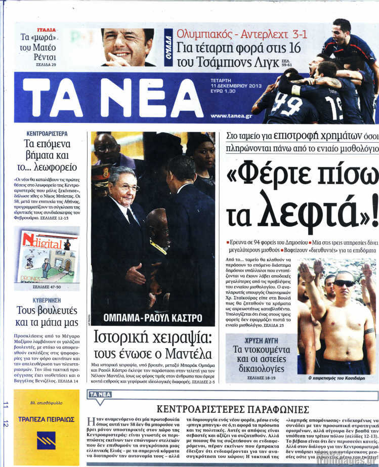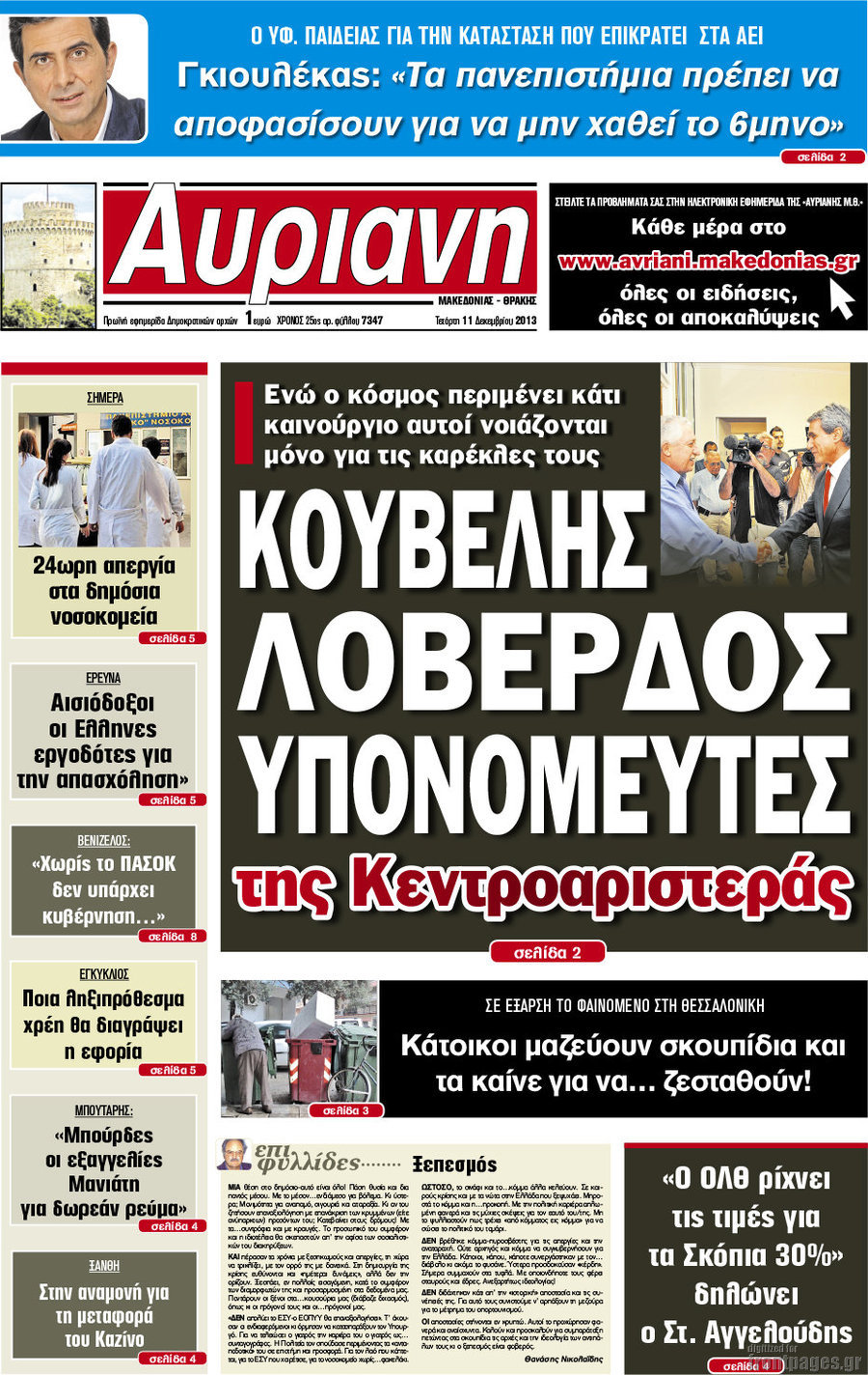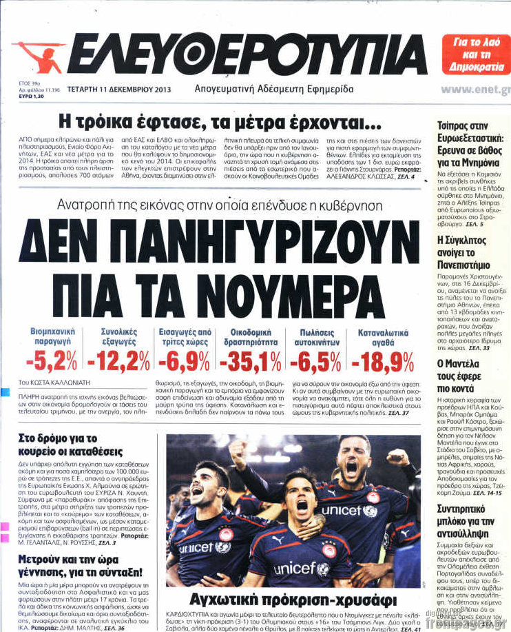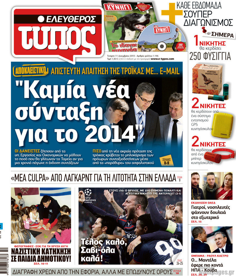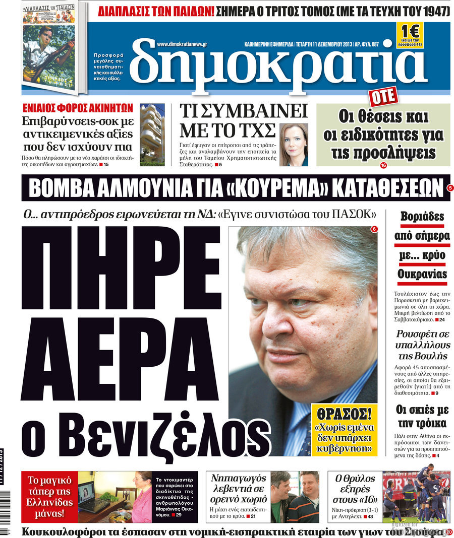 Οι πολιτικές εφημερίδες Enikos Newsroom 08:21, Τετάρτη 11 Δεκεμβρίου 2013 Media Οι πολιτικές εφημερίδες Διαβάστε τα πρωτοσέλιδα των πολιτικών εφημερίδων: ΕΦΗΜΕΡΙΔΕΣ ΠΟΛΙΤΙΚΕΣ ΕΦΗΜΕΡΙΔΕΣ ΠΡΩΤΟΣΕΛΙΔΑ Μοιράσου το: σχολίασε κι εσύ (0 σχόλια) Ακολουθήστε το enikos.gr στο Google News και μάθετε πρώτοι όλες τις ειδήσεις Δείτε όλες τις τελευταίες ειδήσεις από την Ελλάδα και τον Κόσμο στο enikos.gr Ειδήσεις Ροή Ειδήσεων 59 λεπτά πριν Κύκλωμα διακίνησης ναρκωτικών σε σχολεία: Βίντεο ντοκουμέντο από τα βασανιστήρια στους ανήλικους – Συζητούσαν για το πώς θα κάνουν «ξέπλυμα χρήματος» 4 ώρες πριν Αγρότες: Σήκωσαν τις μπάρες στα διόδια των Αφιδνών – ΦΩΤΟ και ΒΙΝΤΕΟ 54 λεπτά πριν Αιματηρό επεισόδιο στον Άγιο Παντελεήμονα – Δύο τραυματίες, αναζητείται ο δράστης 4 ώρες πριν Κωνσταντίνος Ανεστίδης: «Είμαι αθώος, είμαι καθαρός σαν αστραπή και η αστραπή θα πέσει στο κεφάλι τους» – ΒΙΝΤΕΟ 2 ώρες πριν Αποχώρησε από το Κίνημα Δημοκρατίας η Κυριακή Μάλαμα – Οι αιχμές για τον Στέφανο Κασσελάκη 48 λεπτά πριν Ύπνος: Τι είναι ο «κανόνας 3-3-3» που χρησιμοποιεί ένας γιατρός για να ξεχωρίσει την κόπωση από την αϋπνία 4 ώρες πριν Είσοδος σπιτιού: Πώς να οργανώσετε το χώρο πριν έρθουν οι καλεσμένοι σας – Η ρουτίνα 3 βημάτων 2 ώρες πριν Αριθμολογία: Οι άνθρωποι που έχουν γεννηθεί αυτές τις 4 ημερομηνίες, είναι οι πιο πιστοί και αφοσιωμένοι σύντροφοι 2 ημέρες πριν Enerwave: Το νέο «ρεύμα» στη λιανική ενέργειας που αλλάζει την εμπειρία του καταναλωτή 54 δευτερόλεπτα πριν ΗΠΑ: Αυξάνουν την πίεση στην Βενεζουέλα – Το νέο ρεσάλτο σε τάνκερ και ο στόχος του Τραμπ 8 λεπτά πριν Αρχεία Επστάιν: Έντονες επικρίσεις στην κυβέρνηση Τραμπ για τη μερική δημοσοποίηση των εγγράφων 15 λεπτά πριν Νέα γυναικοκτονία στην Ιταλία: 40χρονος σκότωσε τη σύντροφό του και αυτοκτόνησε – Μαχαίρωσε και τη μητέρα της 23 λεπτά πριν Ελένη Βουλγαράκη για Φώτη Ιωαννίδη: «Δεν είναι ωραία η σχέση από απόσταση, φέτος τα Χριστούγεννα θα είμαι δίπλα του» 33 λεπτά πριν Κασσελάκης για παραίτηση Μάλαμα: «Η πορεία μας δεν θα καθοριστεί από μεμονωμένα πρόσωπα, μηχανισμούς και προσωπικές ατζέντες» ENIKOS NETWORK Οι γυναίκες έχουν βρει μια νέα απόλαυση στην κρεβατοκάμαρα που οι περισσότεροι άνδρες αγνοούν Christmas glow: 5 χρυσές συμβουλές για επιδερμίδα που λάμπει από ομορφιά τα Χριστούγεννα Νέο έτος ρεκόρ για τον ελληνικό τουρισμό το 2025: «Είμαστε μέσα στους 10 πλέον επισκέψιμους προορισμούς παγκοσμίως» λέει η ... Τιμές καυσίμων: Πόσο θα πληρώσουν οι εκδρομείς των Χριστουγέννων – Το κόστος μετακινήσεων σε δημοφιλείς προορισμούς Χαρτογραφώντας το «σημείο χωρίς επιστροφή»: Για πρώτη φορά αποκαλύπτεται με λεπτομέρεια το ακανθώδες όριο της ατμόσφαιρας τ... Η Google καταργεί τη λειτουργία «dark web report» – Πώς θα μπορούν οι χρήστες να διαγράφουν τα δεδομένα τους περισσότερα 21:30 , Κυριακή 21 Δεκεμβρίου 2025 Ο Δικαστής: Στα χέρια της Αστυνομίας βίντεο, που ανατρέπει όλα τα δεδομένα – Στενεύει ο κλοιός γύρω από τον Δικαστή Καταιγιστικές εξελίξεις στο τελευταίο επεισόδιο της χρονιάς της σειράς “Ο Δικαστής”... 17:18 , Κυριακή 21 Δεκεμβρίου 2025 «Η Μεγάλη Χίμαιρα»: Μάγεψε το κοινό κατά την avant-première της προβολής της Την Πρωτοχρονιά (Πέμπτη 1η Ιανουαρίου 2026) στο ERTFLIX θα γίνει η πρεμιέρα της πολυαναμενόμεν... 15:08 , Κυριακή 21 Δεκεμβρίου 2025 Μια νύχτα μόνο: Η Αρετή και ο Οδυσσέας έρχονται και πάλι κοντά Το νέο επεισόδιο της δραματικής σειράς του MEGA «Μια νύχτα μόνο», θα προβληθεί απόψε Κυριακή 2... 14:24