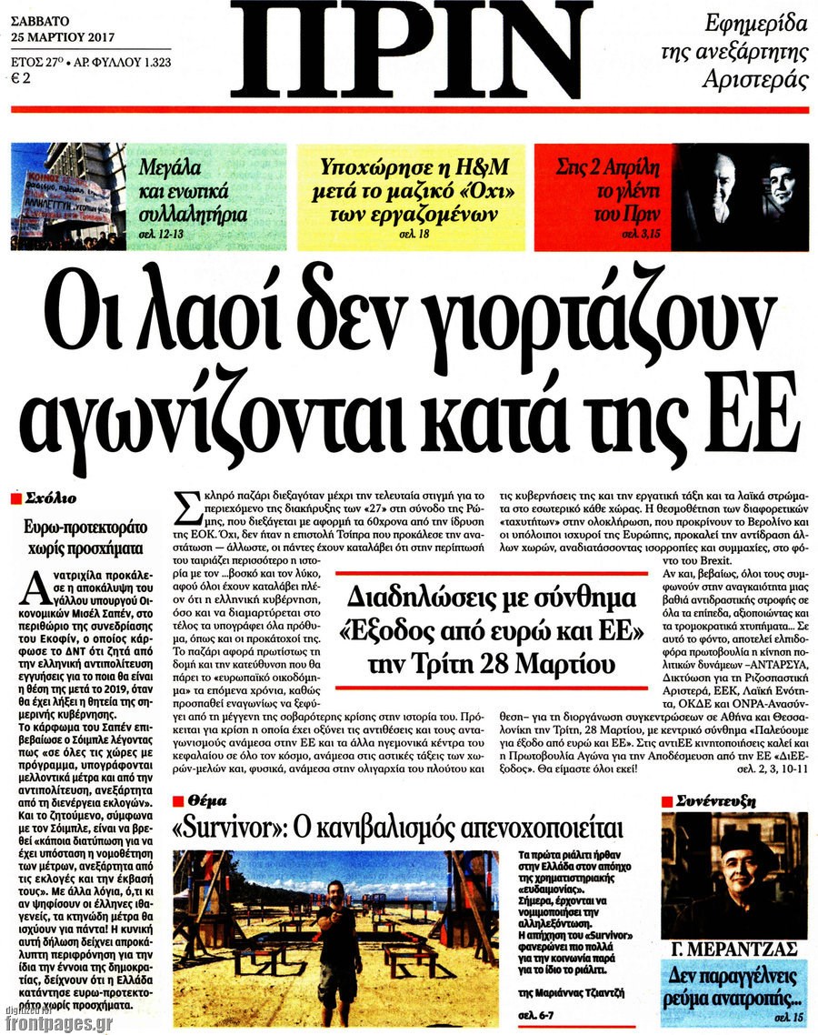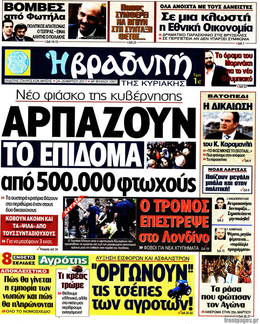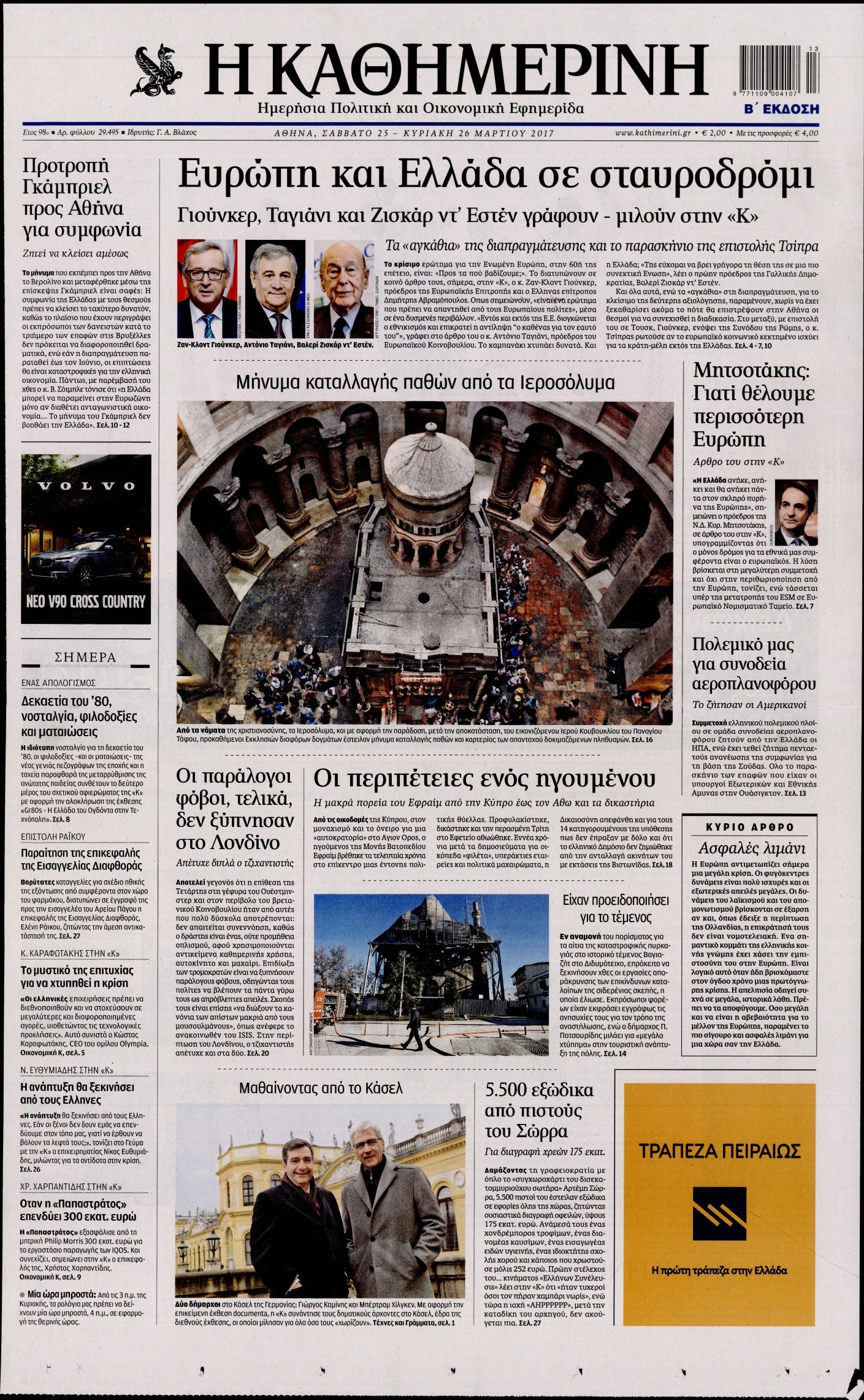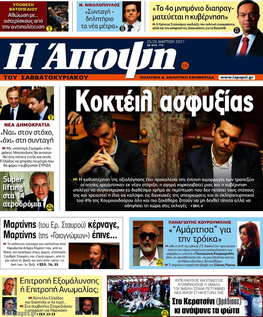 Οι πολιτικές εφημερίδες 25/3/2017 Enikos Newsroom 07:23, Σάββατο 25 Μαρτίου 2017 Media Διαβάστε τα σημερινά πρωτοσέλιδα των πολιτικών εφημερίδων: ΠΟΛΙΤΙΚΕΣ ΕΦΗΜΕΡΙΔΕΣ ΠΡΩΤΟΣΕΛΙΔΑ Μοιράσου το: σχολίασε κι εσύ (0 σχόλια) Ακολουθήστε το enikos.gr στο Google News και μάθετε πρώτοι όλες τις ειδήσεις Δείτε όλες τις τελευταίες ειδήσεις από την Ελλάδα και τον Κόσμο στο enikos.gr Ειδήσεις Ροή Ειδήσεων 46 λεπτά πριν Φοροδιαφυγή: Ποιοι φορολογούμενοι κινδυνεύουν να πληρώσουν «τσουχτερά» πρόστιμα 8 λεπτά πριν Φοινικούντα: Παραδόθηκε 30χρονος στην Καλαμάτα για τη διπλή δολοφονία 24 λεπτά πριν Αγρότες: Ανυποχώρητοι στα μπλόκα – Στις Σέρρες σήμερα η κρίσιμη συνεδρίαση της Πανελλαδικής Επιτροπής 37 λεπτά πριν Τα επίσημα χρονοδιαγράμματα που η Τουρκία θα παραλάβει τα Eurofighter 9 ώρες πριν «Θύελλα» αντιδράσεων για τον Νίκο Παππά μετά την επίθεση στον δημοσιογράφο Νίκο Γιαννόπουλο – Η μήνυση, οι δηλώσεις και η έξοδος από την ευρωομάδα του ΣΥΡΙΖΑ 2 ώρες πριν Καούρα: Το μπαχαρικό που είναι «εξίσου αποτελεσματικό» με την ομεπραζόλη, σύμφωνα με ειδικούς 3 ώρες πριν Τα ζώδια σήμερα, Πέμπτη 18 Δεκεμβρίου: Λέοντες, η καρδιά σας θέλει να εκφραστεί 2 ώρες πριν Οπτική ψευδαίσθηση: Μόνο οι πιο έξυπνοι άνθρωποι θα βρουν 7 ξωτικά 15 δευτερόλεπτα 23 ώρες πριν 20 χρόνια τα Χριστούγεννα ξεκινούν στα Public με μεγάλη ποικιλία σε δώρα! 5 λεπτά πριν Την Κυριακή με τη Realnews: Δωροεπιταγή 10€ 8 λεπτά πριν Φοινικούντα: Παραδόθηκε 30χρονος στην Καλαμάτα για τη διπλή δολοφονία 10 λεπτά πριν Έδεσσα: Χωρίς τις αισθήσεις ανασύρθηκε ηλικιωμένη έπειτα από φωτιά σε μονοκατοικία 15 λεπτά πριν «Το σόι σου»: Backstage στα γυρίσματα για το εορταστικό επεισόδιο 22 λεπτά πριν e-ΕΦΚΑ και ΔΥΠΑ: Προτελευταία ημέρα πληρωμών σήμερα ENIKOS NETWORK Ουρική αρθρίτιδα: Μεγάλη μελέτη αποκαλύπτει τι μπορεί να προκαλεί τη νόσο Τι σημαίνει όταν ο σκύλος σας σάς φέρνει τυχαία αντικείμενα, σύμφωνα με εκπαιδεύτρια Οφειλές προς το Δημόσιο: «Φρένο» στα σενάρια για νέα ρύθμιση – Τι απαντά το υπουργείο Εθνικής Οικονομίας και Οικονομικών Φοροδιαφυγή: Ποιοι φορολογούμενοι κινδυνεύουν να πληρώσουν «τσουχτερά» πρόστιμα Χαρτογραφώντας το «σημείο χωρίς επιστροφή»: Για πρώτη φορά αποκαλύπτεται με λεπτομέρεια το ακανθώδες όριο της ατμόσφαιρας τ... Η Google καταργεί τη λειτουργία «dark web report» – Πώς θα μπορούν οι χρήστες να διαγράφουν τα δεδομένα τους περισσότερα 08:00 , Πέμπτη 18 Δεκεμβρίου 2025 Την Κυριακή με τη Realnews: Δωροεπιταγή 10€ Δωροεπιταγή αξίας 10€ για αγορές άνω των 60€ από τα πολυκαταστήματα FactoryOutlet H προσφορά ι... 07:50 , Πέμπτη 18 Δεκεμβρίου 2025 «Το σόι σου»: Backstage στα γυρίσματα για το εορταστικό επεισόδιο «Το σόι σου» φορά τα γιορτινά του για τα Χριστούγεννα και η Όλγα Λαφαζάνη, με την κάμερα του «... 07:36 , Πέμπτη 18 Δεκεμβρίου 2025 Οι αθλητικές μεταδόσεις 18/12/2025 – Πού θα δείτε τον αγώνα της ΑΕΚ με την Κραϊόβα για το Conference League Τα ματς ΑΕΚ – Ουνιβερσιτάτεα Κραϊόβα για το Conference League και Παναθηναϊκός – Χάποελ Τελ Αβ... 05:48 , Πέμπτη 18 Δεκεμβρίου 2025 Οι οικονομικές εφημερίδες 18/12/2025 Διαβάστε τα πρωτοσέλιδα από τις οικονομικές εφημερίδες, σήμερα 18/12/2025. ΤΕΛΕΥΤΑΙΕΣ ΕΙΔΗΣΕΙΣ 5 λεπτά πριν Την Κυριακή με τη Realnews: Δωροεπιταγή 10€ 8 λεπτά πριν Φοινικούντα: Παραδόθηκε 30χρονος στην Καλαμάτα για τη... 10 λεπτά πριν Έδεσσα: Χωρίς τις αισθήσεις ανασύρθηκε ηλικιωμένη... 15 λεπτά πριν «Το σόι σου»: Backstage στα γυρίσματα για το εορταστικό... 22 λεπτά πριν e-ΕΦΚΑ και ΔΥΠΑ: Προτελευταία ημέρα πληρωμών σήμερα 24 λεπτά πριν Αγρότε