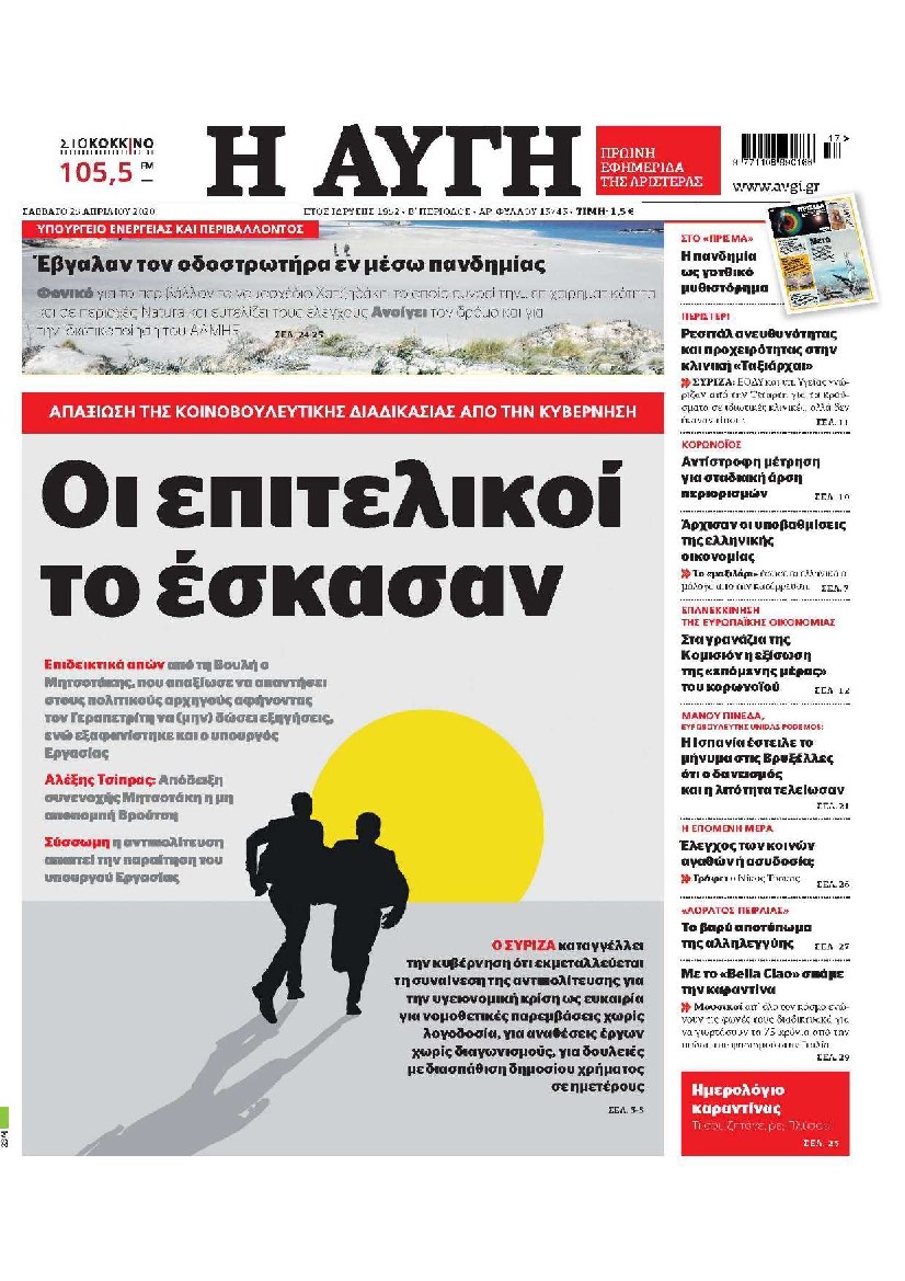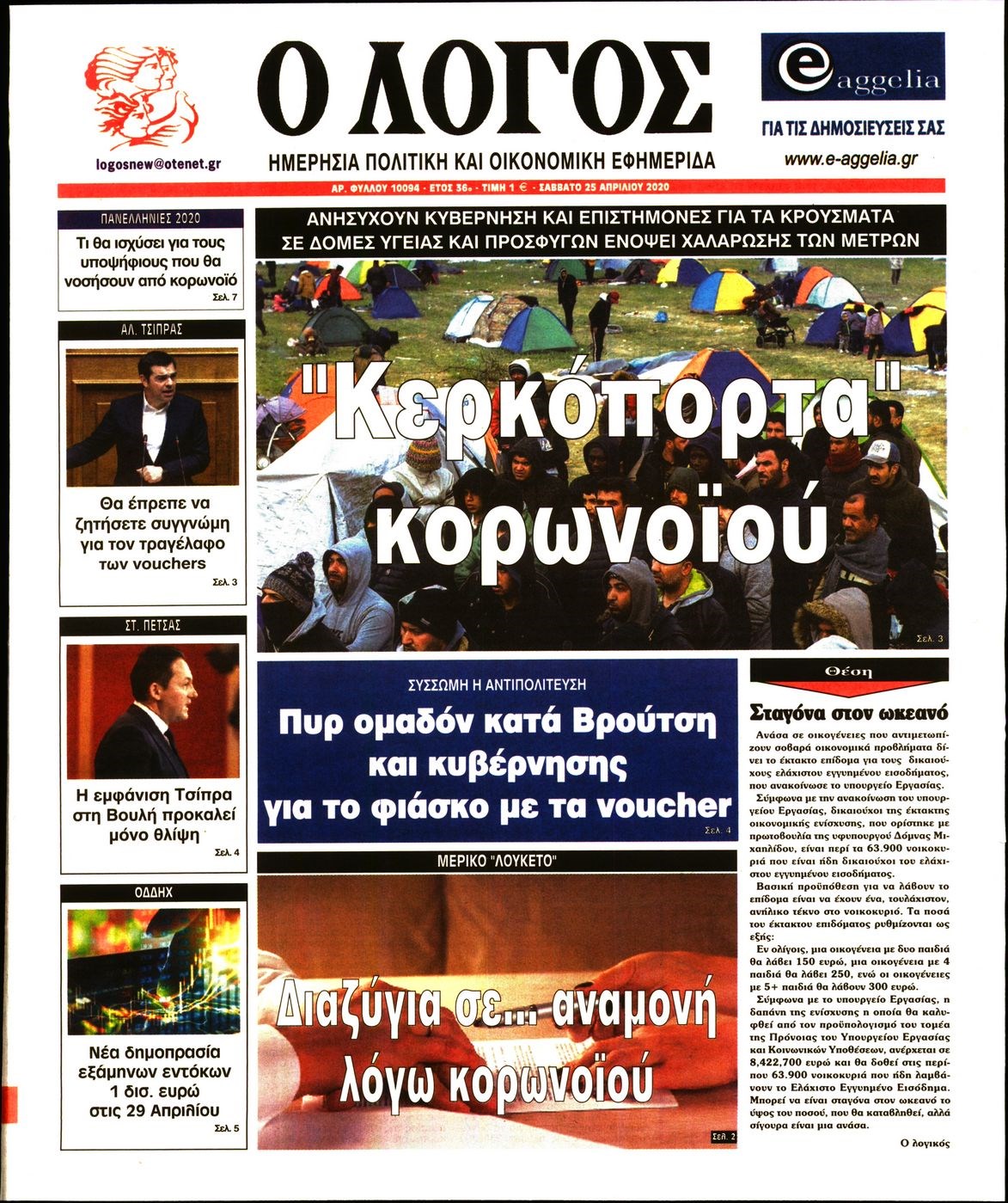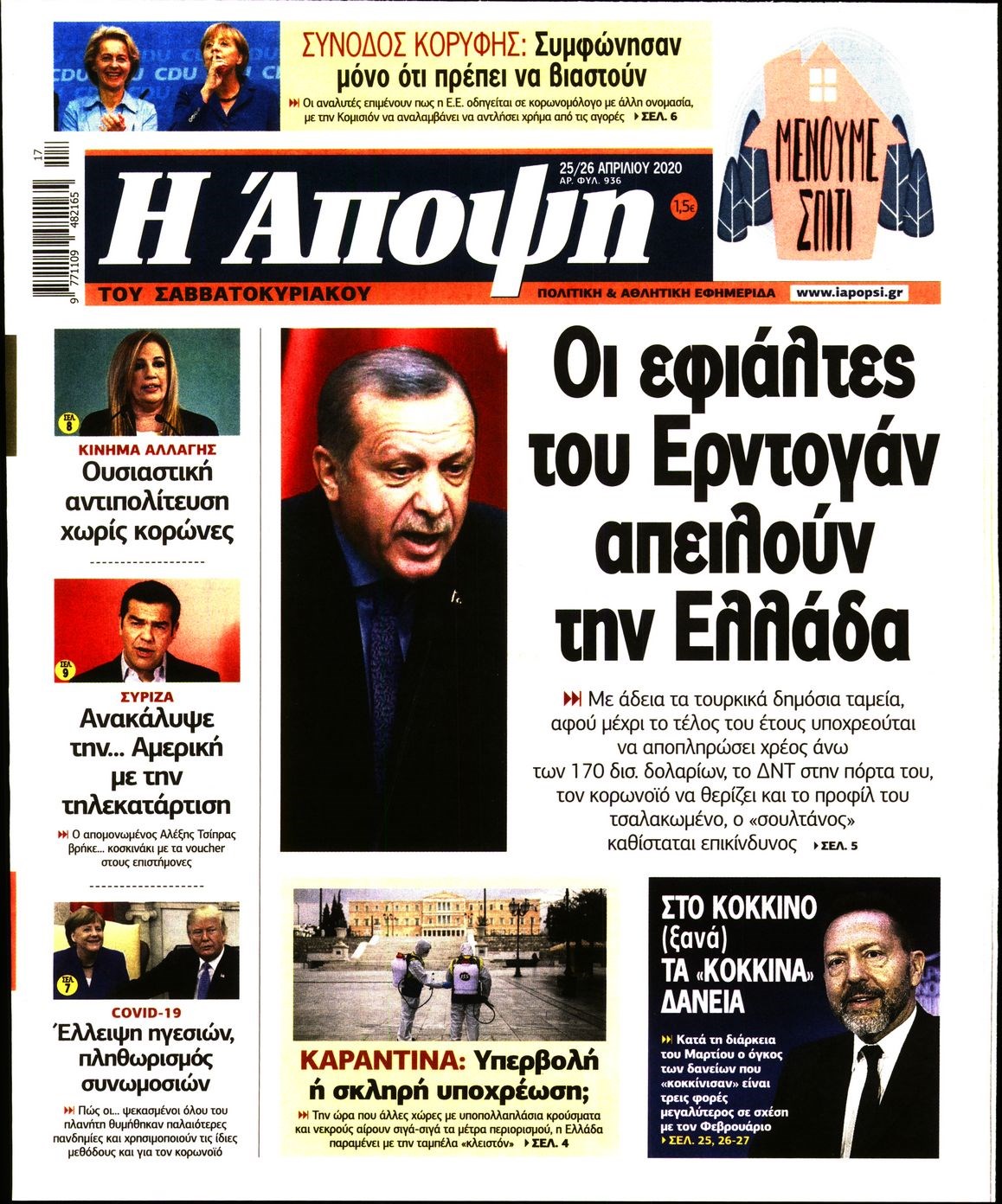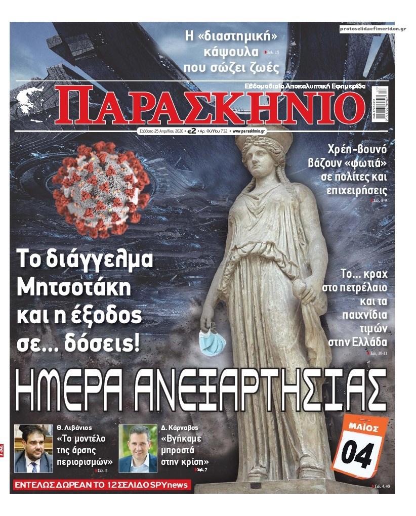 Οι πολιτικές εφημερίδες 25/4/2020 Διονύσης Νίκκας 07:09, Σάββατο 25 Απριλίου 2020 Media Διαβάστε τα πρωτοσέλιδα των πολιτικών εφημερίδων… ΠΟΛΙΤΙΚΕΣ ΕΦΗΜΕΡΙΔΕΣ ΠΡΩΤΟΣΕΛΙΔΑ Μοιράσου το: σχολίασε κι εσύ (0 σχόλια) Ακολουθήστε το enikos.gr στο Google News και μάθετε πρώτοι όλες τις ειδήσεις Δείτε όλες τις τελευταίες ειδήσεις από την Ελλάδα και τον Κόσμο στο enikos.gr Ειδήσεις Ροή Ειδήσεων 3 ώρες πριν Υπόθεση Έπσταϊν: Το Υπουργείο Δικαιοσύνης δημοσιοποίησε μια σειρά από εξαιρετικά επεξεργασμένα αρχεία – «Λείπουν τα πιο σημαντικά έγγραφα», λένε οι Δημοκρατικοί 21 λεπτά πριν Γιορτές με μπλόκα για τους αγρότες: Ανοίγουν διόδια και μοιράζουν προϊόντα στους ταξιδιώτες 54 λεπτά πριν Εξαφάνιση 33χρονου γιατρού στην Κρήτη: «Άναψα τα φώτα, τρόμαξε και άρχισε να τρέχει στα χωράφια» – Η τελευταία διαδρομή και η μαρτυρία «κλειδί» 2 ώρες πριν Ο «χάρτης» με τις αυξήσεις και τις φοροελαφρύνσεις του 2026 – Ποιοι και πόσα κερδίζουν 37 λεπτά πριν Τα αρχεία του Έπσταϊν αποκαλύπτουν φωτογραφία του έκπτωτου πρίγκιπα Άντριου – Είναι ξαπλωμένος στην αγκαλιά 5 γυναικών 44 λεπτά πριν Μία νέα «χρυσή» περίοδος αρχίζει για 3 ζώδια από σήμερα – «Μία αναπάντεχη ευκαιρία οδηγεί στην επιτυχία» 5 ώρες πριν Αυγά: Πόσα μπορείτε να τρώτε την ημέρα με ασφάλεια για μέγιστη πρόσληψη πρωτεΐνης 3 ώρες πριν Αρχαιολόγοι ανακάλυψαν σε χωράφι απεικόνιση 600 ετών ενός Αγίου – Τα στοιχεία που δείχνουν ότι μαρτύρησε 2 ώρες πριν Αγχώνεται για το χριστουγεννιάτικο δώρο που πήρε στην πλούσια σύντροφό του – «Φοβάμαι πως θα το βρει φθηνιάρικο, φοράει βραχιόλια Cartier» 6 λεπτά πριν Πώς η κλιματική αλλαγή επηρεάζει εγκύους και βρέφη – Οι επιπτώσεις των υψηλών θερμοκρασιών 13 λεπτά πριν e-ΕΦΚΑ και ΔΥΠΑ: Οι πληρωμές από 22 έως 24 Δεκεμβρίου – Ποιοι θα δουν χρήματα στους λογαριασμούς τους 21 λεπτά πριν Συνελήφθη οδηγός μηχανής που έτρεχε με 161 χλμ στη Συγγρού – Τον έπιασε το ραντάρ της Τροχαίας 21 λεπτά πριν Γιορτές με μπλόκα για τους αγρότες: Ανοίγουν διόδια και μοιράζουν προϊόντα στους ταξιδιώτες 30 λεπτά πριν Τηλεθέαση (19/12): Κυριάρχησε η σειρά «Το σόι σου» – Τι νούμερα έκανε ο τελικός του GNTM ENIKOS NETWORK Είστε μόνιμα απρόσεκτοι; 3 σημάδια που δείχνουν ότι μπορεί να είναι σύμπτωμα πάθησης Πόσα κιλά παίρνουμε πραγματικά τα Χριστούγεννα, σύμφωνα με την επιστήμη – Πώς να το αποτρέψουμε; Επίδομα παιδιού: Τι αλλάζει από το 2026 – Το όφελος από τις φορολογικές ελαφρύνσεις Mega χριστουγεννιάτικη φορολοταρία: «Κλείδωσε» η ημερομηνία για την κλήρωση – Ερωτήσεις και απαντήσεις Χαρτογραφώντας το «σημείο χωρίς επιστροφή»: Για πρώτη φορά αποκαλύπτεται με λεπτομέρεια το ακανθώδες όριο της ατμόσφαιρας τ... Η Google καταργεί τη λειτουργία «dark web report» – Πώς θα μπορούν οι χρήστες να διαγράφουν τα δεδομένα τους περισσότερα 09:30 , Σάββατο 20 Δεκεμβρίου 2025 «Porto Leone: Στη γειτονιά με τα κόκκινα φανάρια» – Ο Χρόνης αποκαλύπτει στην Αλεξάνδρα το μυστικό για το παιδί της Λένας Η μεγάλη δραματική σειρά του Apha «Porto Leone: Στη γειτονιά με τα κόκκινα φανάρια» μας μεταφέ... 08:14 , Σάββατο 20 Δεκεμβρίου 2025 Τρομεροί γονείς: Η Μαρία Καβογιάννη εισβάλλει στο σπίτι της οικογένειας Στεφανίδη Όσα θα δούμε στο νέο διπλό επεισόδιο της σειράς «Τρομεροί γονείς», σήμερα Σάββατο 20 Δεκεμβρίο... 05:48 , Σάββατο 20 Δεκεμβρίου 2025 Οι οικονομικές εφημερίδες 20/12/2025 Διαβάστε τα πρωτοσέλιδα από τις οικονομικές εφημερίδες, σήμερα 20/12/2025. 05:43 , Σάββατο 20 Δεκεμβρίου 2025 Οι αθλητικές εφημερίδες 20/12/2025 Διαβάστε 