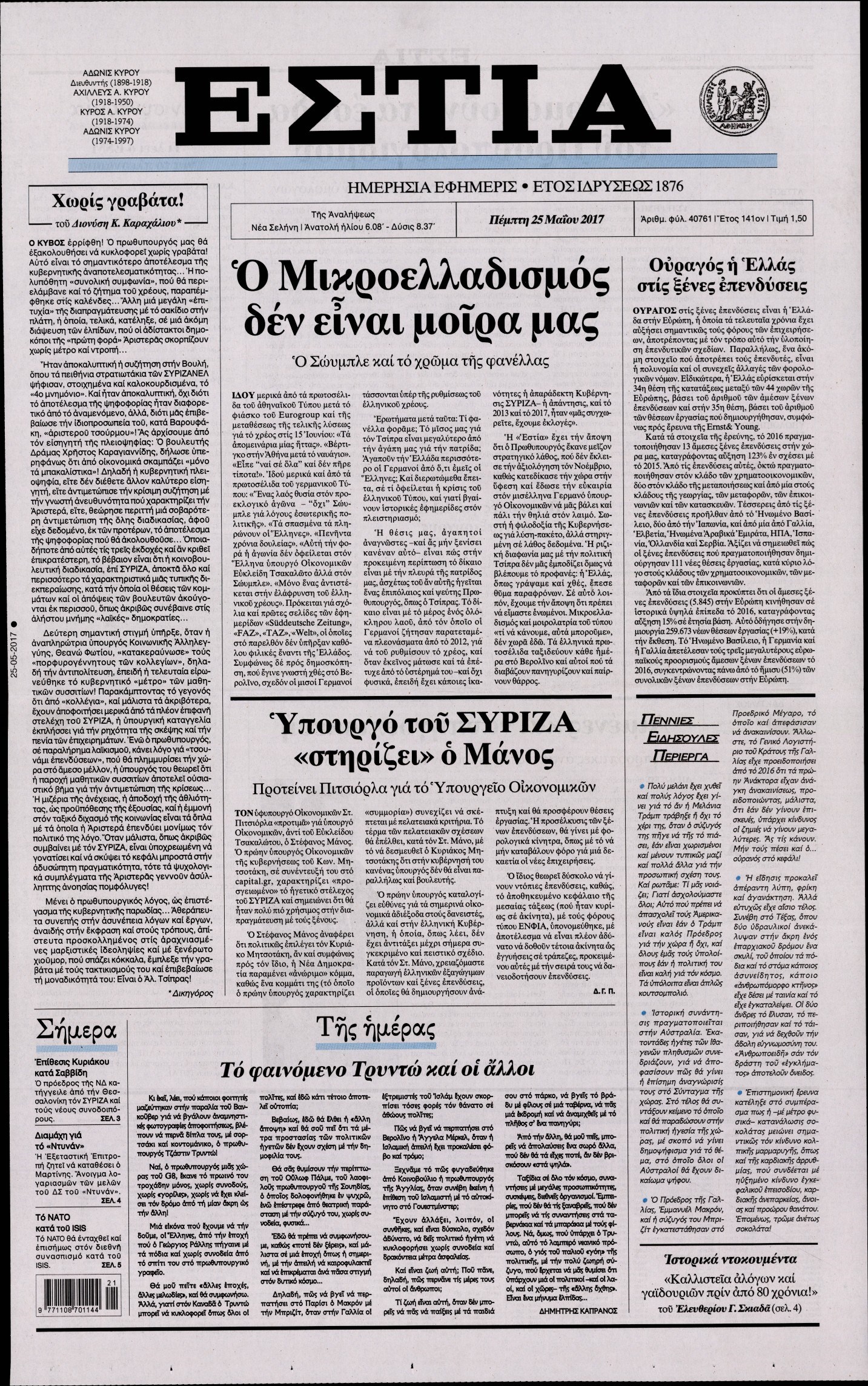 Οι πολιτικές εφημερίδες 25/5/2017 Enikos Newsroom 07:06, Πέμπτη 25 Μαΐου 2017 Media Διαβάστε τα σημερινά πρωτοσέλιδα των πολιτικών εφημερίδων: ΠΟΛΙΤΙΚΕΣ ΕΦΗΜΕΡΙΔΕΣ ΠΡΩΤΟΣΕΛΙΔΑ Μοιράσου το: σχολίασε κι εσύ (0 σχόλια) Ακολουθήστε το enikos.gr στο Google News και μάθετε πρώτοι όλες τις ειδήσεις Δείτε όλες τις τελευταίες ειδήσεις από την Ελλάδα και τον Κόσμο στο enikos.gr Ειδήσεις Ροή Ειδήσεων 3 ώρες πριν Αυξάνουν την πίεση προς την κυβέρνηση οι αγρότες: Κλείνουν παρακαμπτήριους και ανοίγουν διόδια – Τι θα γίνει τις γιορτές 2 ώρες πριν ΟΠΕΚΕΠΕ: Προφυλακιστέος ο φερόμενος αρχηγός και ο λογιστής της εγκληματικής οργάνωσης 3 ώρες πριν Φοινικούντα: Το Σάββατο απολογείται ο 30χρονος γιος γνωστού επιχειρηματία της Πλάκας που παραδόθηκε – Όσα είπε στους αστυνομικούς και ο ρόλος του στο έγκλημα 3 ώρες πριν Μπορεί ο Μαδούρο να αντέξει τον αποκλεισμό του Τραμπ; Τι θα χρειαστεί η Ουάσινγκτον για να τον ανατρέψει 4 ώρες πριν Πρίγκιπας Ουίλιαμ – Κέιτ: Η νέα οικογενειακή φωτογραφία για τις Χριστουγεννιάτικες κάρτες του 2025 4 ώρες πριν Ύπνος: Η απλή βραδινή ρουτίνα για να προστατεύσετε τα μαλλιά σας από το κρύο κατά τη διάρκεια του χειμώνα 5 ώρες πριν Manifesting: Πώς να συναντήσετε τον σύντροφο της ζωής σας, ανάλογα με τον μήνα γέννησής σας 2 ημέρες πριν 20 χρόνια τα Χριστούγεννα ξεκινούν στα Public με μεγάλη ποικιλία σε δώρα! 3 ώρες πριν Αρχαιολόγοι ανακάλυψαν ρωμαϊκά τεχνουργήματα από μια πόλη που δεν υπήρξε ποτέ – Τα τρία εντυπωσιακά κτίρια και ο αμφορέας με τις… σαρδέλες 4 λεπτά πριν Μάρκο Νίκολιτς: «Είμαι περήφανος για τους παίκτες μου, όποιος αντίπαλος και να έρθει θα προετοιμαστούμε» 13 λεπτά πριν ΟΗΕ: Την εκλογή του νέου ύπατου αρμοστή για τους Πρόσφυγες Μπαρχάμ Άχμεντ Σαλίχ χαιρέτησε ο Αντόνιο Γκουτέρες 18 λεπτά πριν Σύνοδος Κορυφής στις Βρυξέλλες: Ακόμη πιο κοντά σε διέξοδο για τη χρηματοδότηση της Ουκρανίας 26 λεπτά πριν ΟΗΕ: Iστορική επίσκεψη του Συμβουλίου Ασφαλείας στη Δαμασκό – Mήνυμα Ελλάδας για συμπερίληψη και λογοδοσία 33 λεπτά πριν Νέος πρέσβης της Μεγάλης Βρετανίας στις ΗΠΑ ο Κρίστιαν Τέρνερ ENIKOS NETWORK Σε περίοδο αυξημένης δραστηριότητας η γρίπη στην Ελλάδα-Μέτρα προστασίας από τον ΕΟΔΥ Σκέφτεστε συνέχεια συζητήσεις που έχετε κάνει; Τι σημαίνει αυτό, σύμφωνα με ειδικό Στεγαστικό: Τι λέει η ΠΟΜΙΔΑ για τα νέα μέτρα που ανακοίνωσε ο Κυριάκος Μητσοτάκης Λαγκάρντ: Αισιόδοξη για την ανάπτυξη της Ευρωζώνης, αβέβαιη για τον πληθωρισμό Χαρτογραφώντας το «σημείο χωρίς επιστροφή»: Για πρώτη φορά αποκαλύπτεται με λεπτομέρεια το ακανθώδες όριο της ατμόσφαιρας τ... Η Google καταργεί τη λειτουργία «dark web report» – Πώς θα μπορούν οι χρήστες να διαγράφουν τα δεδομένα τους περισσότερα 17:45 , Πέμπτη 18 Δεκεμβρίου 2025 ROUK ZOUK: Εορταστικό επεισόδιο με καλεσμένους τους πρωταγωνιστές του «Γιατί ρε πατέρα» Το Σάββατο 20 Δεκεμβρίου στις 21:00, η Ζέτα Μακρυπούλια υποδέχεται εκλεκτούς ηθοποιούς που όλο... 17:20 , Πέμπτη 18 Δεκεμβρίου 2025 Άγιος έρωτας: Η Χριστίνα εξομολογείται στον πατέρα Νικόλαο, απόψε στις 21:00 στον Alpha Η Νότα αποφασίζει να εκδικηθεί τον Πέτρο και τον Στέφανο, για χάρη του Λούη, όμως τα πράγματα ... 16:50 , Πέμπτη 18 Δεκεμβρίου 2025 Να μ’ αγαπάς: Ζωή και Φωτεινή συμφιλιώνονται ως μάνα με κόρη, απόψε στις 20:00 Η ταυτότητα του Άγγελου αποκαλύπτεται στο νέο επεισόδιο της σειράς “Να μ’ αγαπάς... 15:52 , Πέμπτη 18 Δεκεμβρίου 2025 Το Σπίτι Δίπλα Στο Ποτάμι: Το καθηλωτικό τελευταίο επεισόδιο για το 2025 απόψε στις 22:30 Καθηλώνει το σημερ