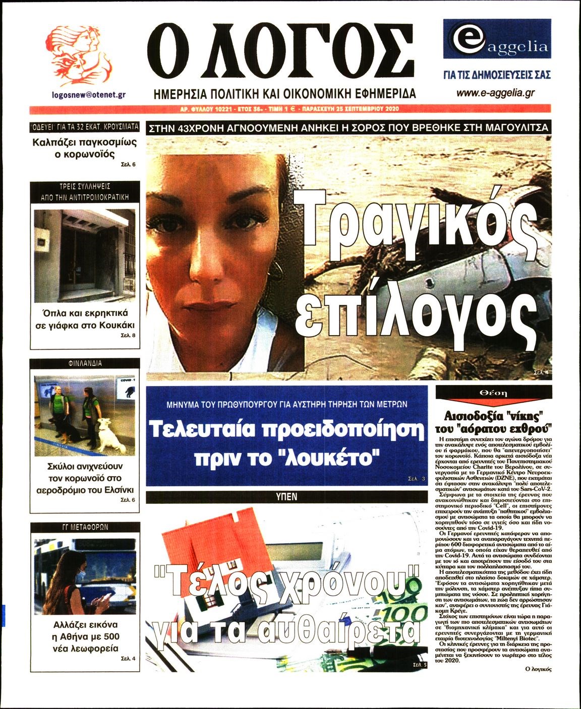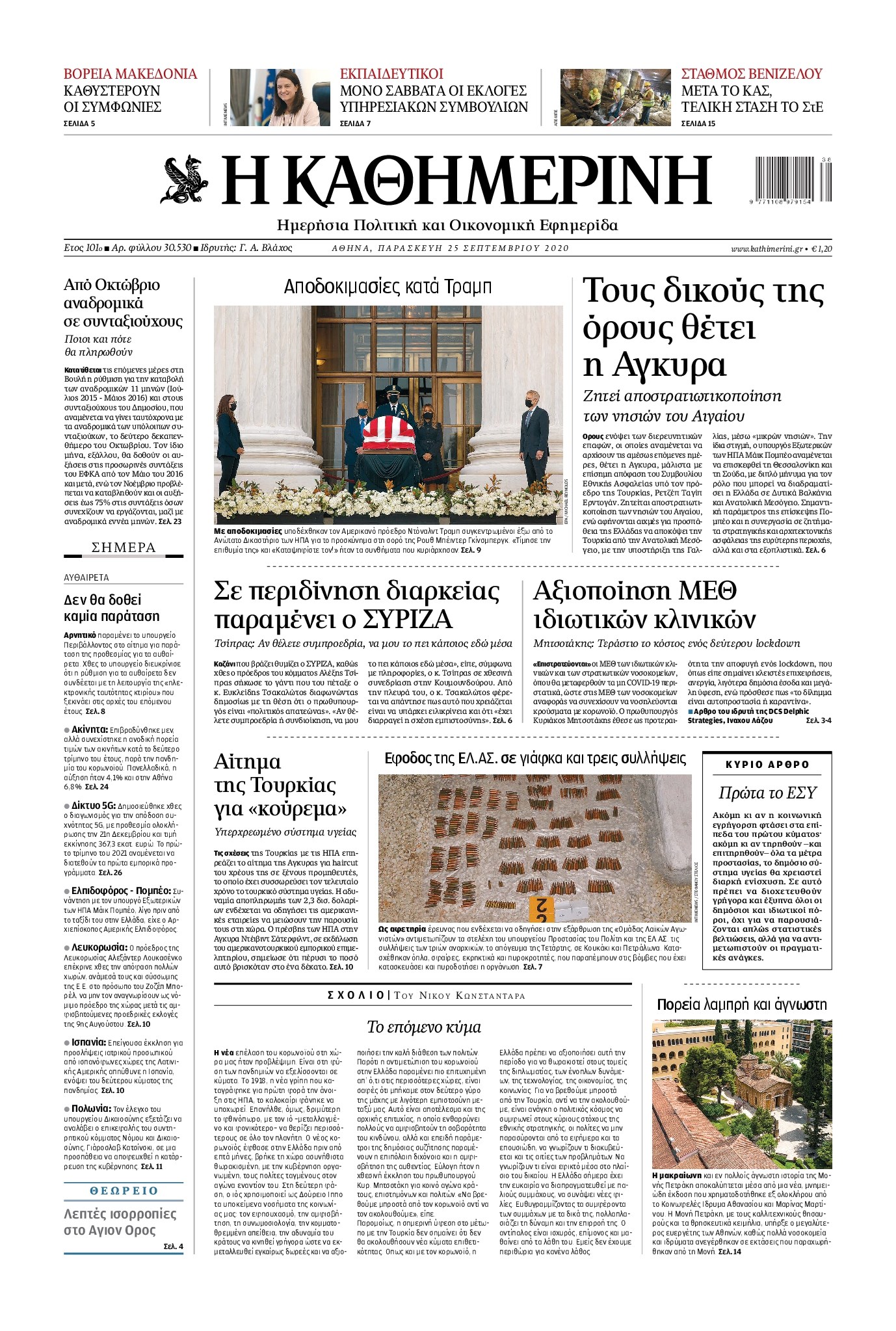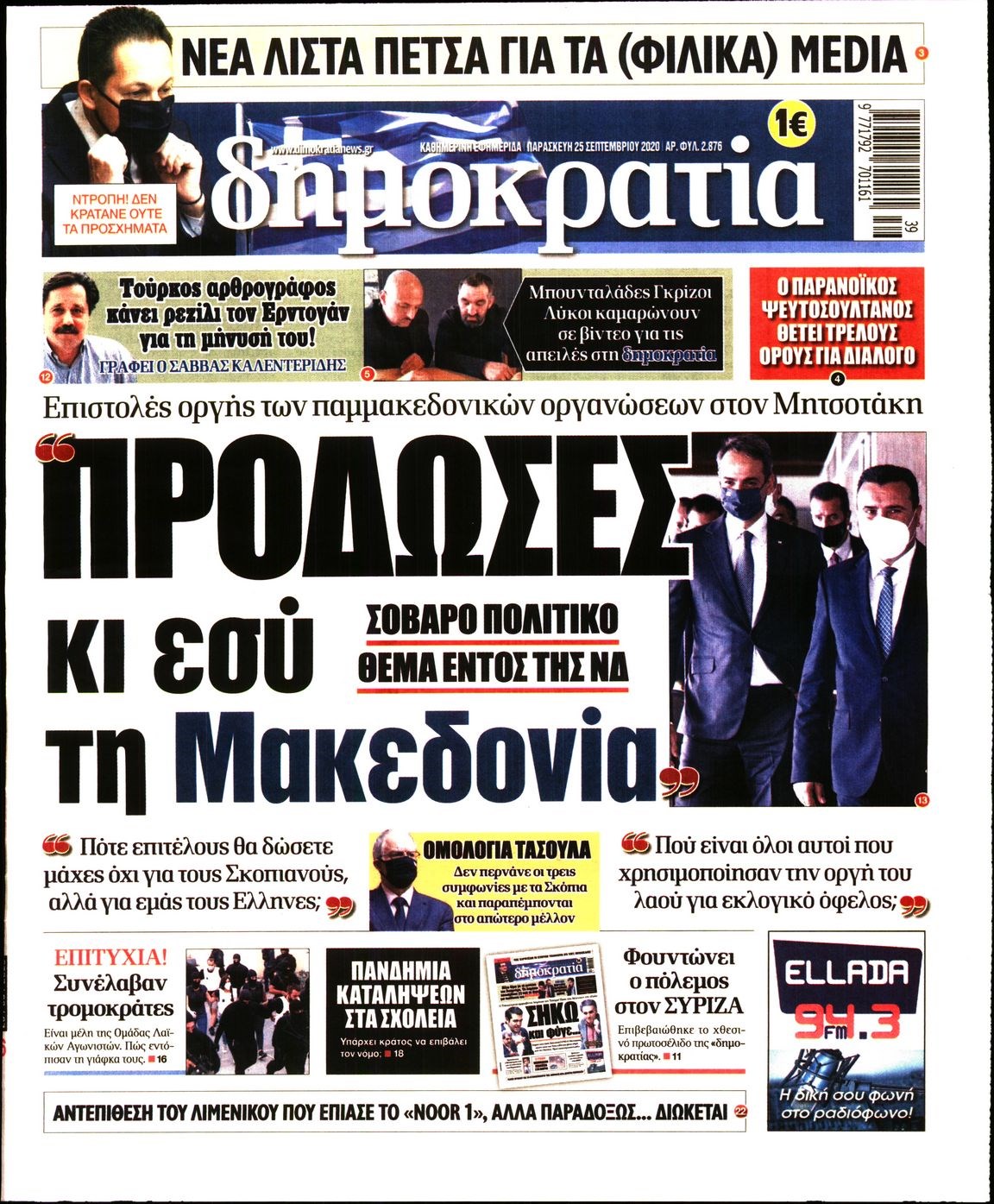 Οι πολιτικές εφημερίδες 25/9/2020 Διονύσης Νίκκας 06:12, Παρασκευή 25 Σεπτεμβρίου 2020 Media Διαβάστε τα πρωτοσέλιδα των πολιτικών εφημερίδων… ΠΟΛΙΤΙΚΕΣ ΕΦΗΜΕΡΙΔΕΣ ΠΡΩΤΟΣΕΛΙΔΑ Μοιράσου το: σχολίασε κι εσύ (0 σχόλια) Ακολουθήστε το enikos.gr στο Google News και μάθετε πρώτοι όλες τις ειδήσεις Δείτε όλες τις τελευταίες ειδήσεις από την Ελλάδα και τον Κόσμο στο enikos.gr Ειδήσεις Ροή Ειδήσεων 4 ώρες πριν Χριστούγεννα στα μπλόκα: Επιμένουν στις κινητοποιήσεις τους οι αγρότες – Ανοίγουν τα διόδια το Σαββατοκύριακο 4 ώρες πριν Ουκρανία: Η άνευ προηγουμένου επίθεση σε ρωσικό τάνκερ στη Μεσόγειο και το μήνυμα προς στον Πούτιν – Το «μακρύ χέρι» του Κιέβου 3 ώρες πριν Πούτιν: Τα μηνύματα σε Ευρώπη και ΝΑΤΟ από το μαραθώνιο «σόου» του – Η απαίτηση για «σεβασμό» και η ειρήνη «με τους όρους» της Μόσχας 4 ώρες πριν Τραμπ: Δεν αποκλείει την πιθανότητα ενός πολέμου στη Βενεζουέλα – «Ο Μαδούρο ξέρει καλύτερα από τον καθένα τι ακριβώς θέλω» 5 ώρες πριν Συνεχίζει να προκαλεί ο Μίτσκοσκι: «Για μένα το όνομα Μακεδονία είναι ιερό» 3 ώρες πριν Ανακαλύφθηκαν αρχαία χρυσά νομίσματα 2.200 ετών που απεικονίζουν τον θεό Απόλλωνα – Η άγνωστη σύνδεση με τον Φίλιππο Β΄ της Μακεδονίας 4 ώρες πριν Ύπνος: Μια κρυφή κατάσταση του εγκεφάλου πριν από τον ύπνο μπορεί να είναι το “κλειδί” για υψηλή ευφυΐα και δημιουργικότητα 5 ώρες πριν Αριθμολογία: Οι άνθρωποι που έχουν γεννηθεί αυτές τις 4 ημερομηνίες, συχνά παρεξηγούνται – «Η καλοσύνη τους κρύβει τεράστια δύναμη» 6 ώρες πριν Ξεχάστε το καθάρισμα το Σαββατοκύριακο: Ο «κανόνας των 20 λεπτών» που θα σας λύσει τα χέρια 16 λεπτά πριν Εξάρχεια: Ένταση με μολότοφ, χημικά και κρότου λάμψης 32 λεπτά πριν ΗΠΑ: Τραγωδία στην Αλαμπάμα – Σκότωσε την δημοσιογράφο σύζυγό του και αυτοκτόνησε μπροστά στον 3χρονο γιο τους 46 λεπτά πριν Πρόταση γάμου στο ΣΕΦ κατά την διάρκεια του αγώνα Ολυμπιακός-Βιλερμπάν – Δείτε βίντεο 1 ώρα πριν Euroleague: Επέστρεψε στις νίκες ο Ολυμπιακός, πήρε την ματσάρα της χρονιάς η Μπάρτσα – Τα αποτελέσματα και η βαθμολογία 1 ώρα πριν Συρία: Μαζικά πλήγματα των ΗΠΑ σε θέσεις του Ισλαμικού Κράτους – Χέγκσεθ: «Δεν είναι αρχή πολέμου, είναι μια δήλωση εκδίκησης» για το θάνατο των στρατιωτών μας ENIKOS NETWORK Το ΕΚΑΒ τιμήθηκε από την Ακαδημία Αθηνών για τα 40 χρόνια προσφοράς του Έχετε πραγματικά μεγάλη καρδιά; 10 χαρακτηριστικά όσων έχουν καλοσύνη Αναστολή μέτρων αναγκαστικής εκτέλεσης για κτηνοτρόφους που πλήττονται από την ευλογιά των αιγοπροβάτων Πλήρης επάρκεια προϊόντων στις λαϊκές της Αττικής, παρά τις αγροτικές κινητοποιήσεις – Τι απαντούν οι πωλητές Χαρτογραφώντας το «σημείο χωρίς επιστροφή»: Για πρώτη φορά αποκαλύπτεται με λεπτομέρεια το ακανθώδες όριο της ατμόσφαιρας τ... Η Google καταργεί τη λειτουργία «dark web report» – Πώς θα μπορούν οι χρήστες να διαγράφουν τα δεδομένα τους περισσότερα 22:42 , Παρασκευή 19 Δεκεμβρίου 2025 Γιώργος Γιαννόπουλος για “Το σόι σου”: “Είναι ευτυχία και ευλογία αυτή η σειρά” «Είναι ευτυχία και ευλογία η συγκυρία αυτής της σειράς», θα πει ο Γιώργος Γιαννόπουλος -ο αγαπ... 20:37 , Παρασκευή 19 Δεκεμβρίου 2025 Don’t Forget The Lyrics: Η Έλλη Κοκκίνου υποδέχεται 4 παίκτες που θα κάνουν τα πάντα για να μη χάσουν ούτε… μισή λέξη από τους στίχους Το «Don’t Forget The Lyrics» επιστρέφει απόψε, Παρασκευή 19 Δεκεμβρίου, στις 21:00 με νέο επει... 19:31 , Παρασκευή 19 Δεκεμβρίου 2025 GNTM: Απόψε ο μεγάλος τελικός για τους 4 φιναλίστ Έπειτα από μήνες γεμάτους μόδα, δημιουργία κα