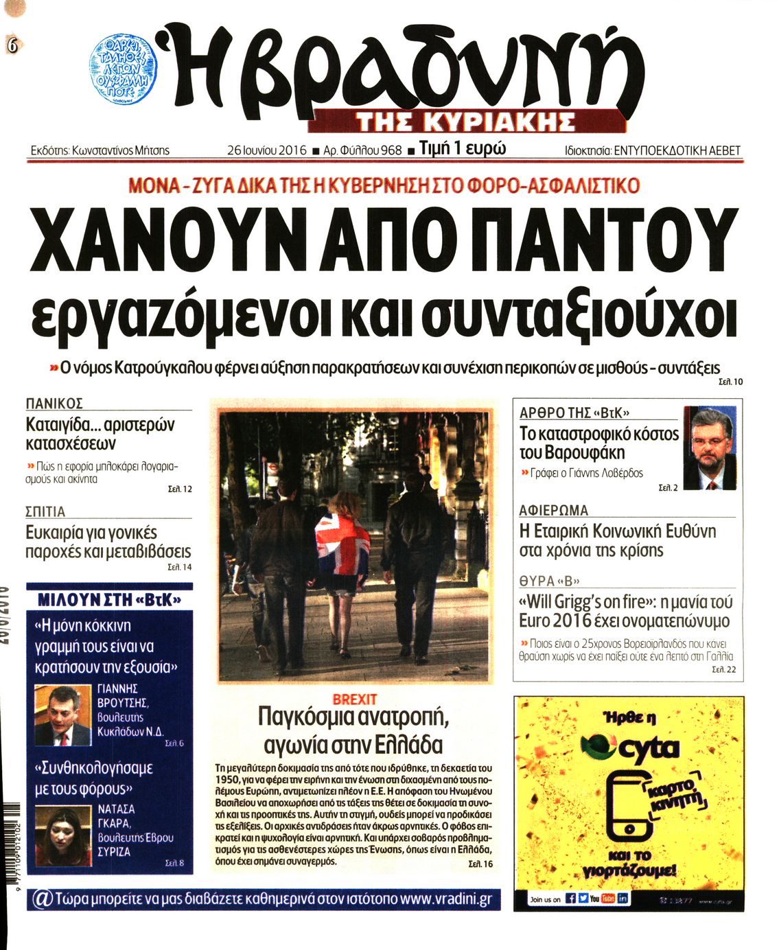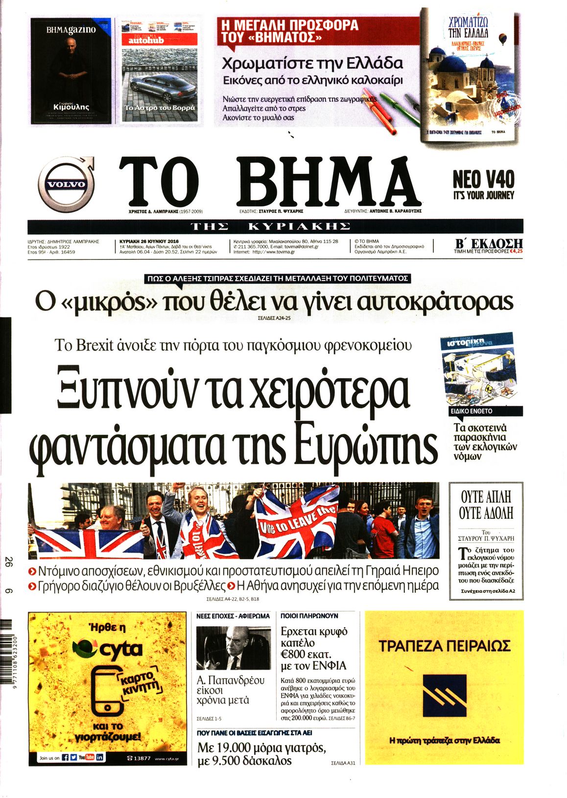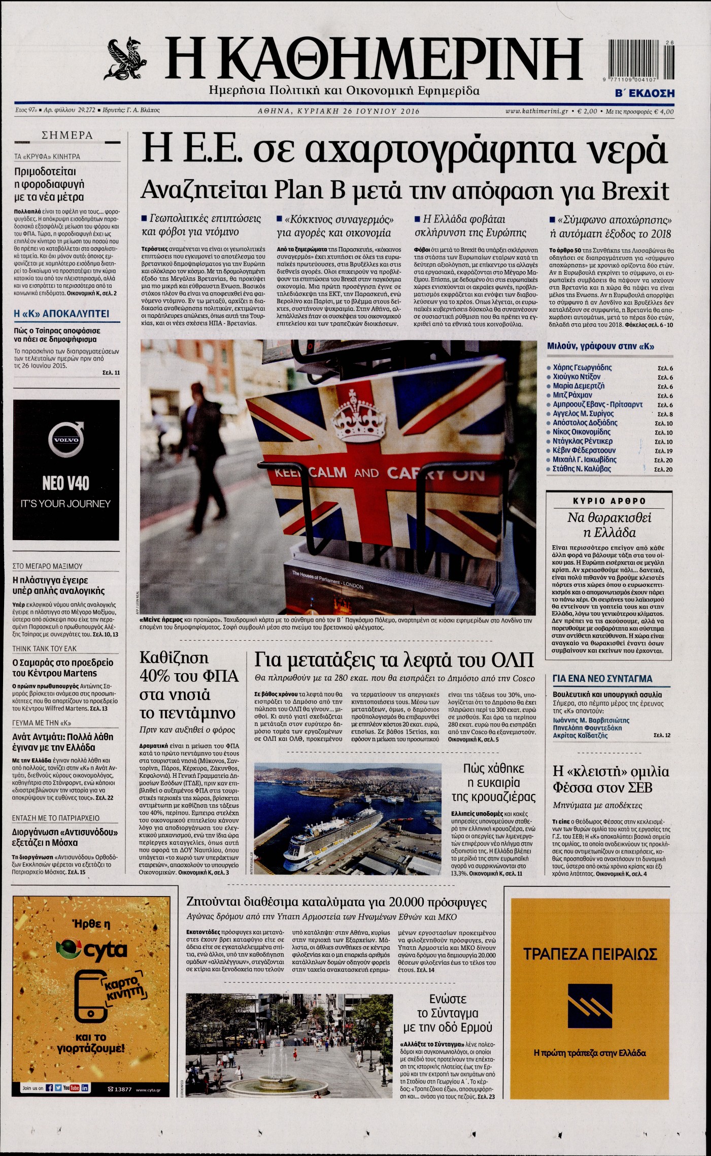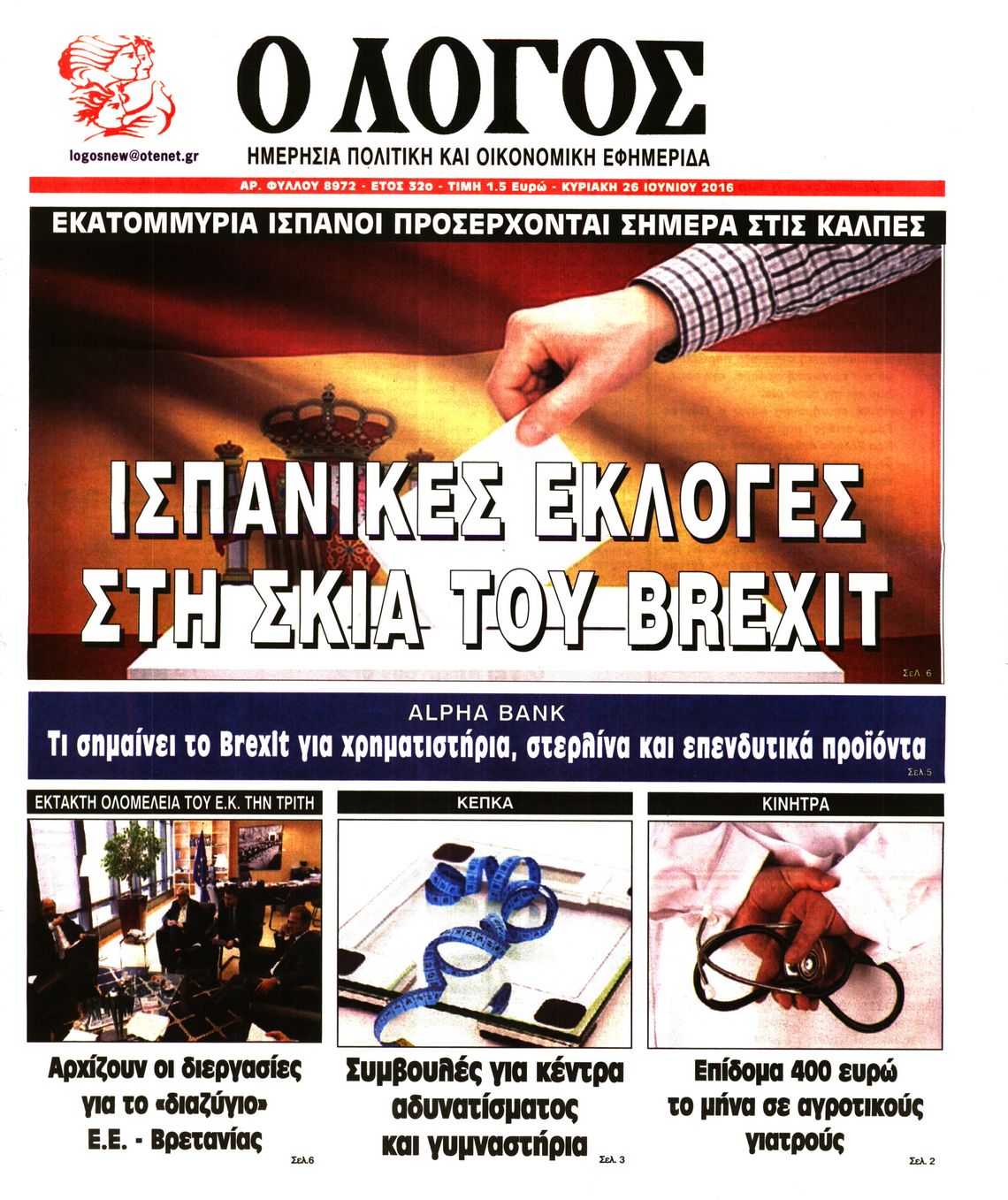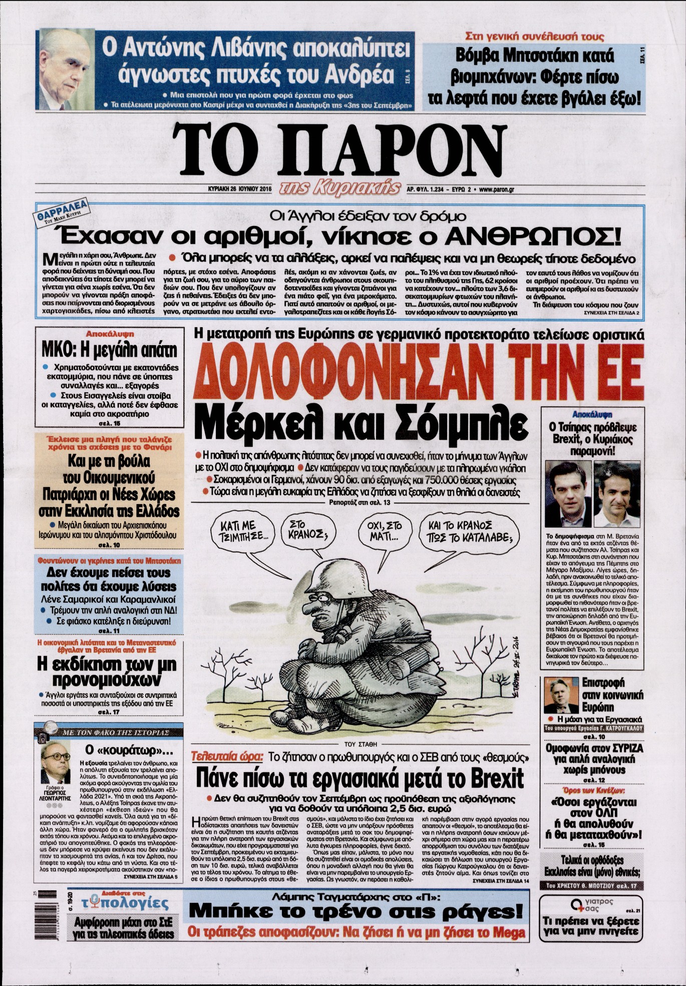 Οι πολιτικές εφημερίδες 26-6-2016 Enikos Newsroom 06:14, Κυριακή 26 Ιουνίου 2016 Media Διαβάστε τα σημερινά πρωτοσέλιδα των πολιτικών εφημερίδων: ΠΟΛΙΤΙΚΕΣ ΕΦΗΜΕΡΙΔΕΣ ΠΡΩΤΟΣΕΛΙΔΑ Μοιράσου το: σχολίασε κι εσύ (0 σχόλια) Ακολουθήστε το enikos.gr στο Google News και μάθετε πρώτοι όλες τις ειδήσεις Δείτε όλες τις τελευταίες ειδήσεις από την Ελλάδα και τον Κόσμο στο enikos.gr Ειδήσεις Ροή Ειδήσεων 2 ώρες πριν Ευρωπαϊκή Ένωση: Συμφωνία για δάνειο 90 δισ. ευρώ στην Ουκρανία τη διετία 2026-2027 6 ώρες πριν ΟΠΕΚΕΠΕ: Προφυλακιστέος ο φερόμενος αρχηγός και ο λογιστής της εγκληματικής οργάνωσης 8 ώρες πριν Αυξάνουν την πίεση προς την κυβέρνηση οι αγρότες: Κλείνουν παρακαμπτήριους και ανοίγουν διόδια – Τι θα γίνει τις γιορτές 7 ώρες πριν Φοινικούντα: Το Σάββατο απολογείται ο 30χρονος γιος γνωστού επιχειρηματία της Πλάκας που παραδόθηκε – Όσα είπε στους αστυνομικούς και ο ρόλος του στο έγκλημα 6 ώρες πριν ΑΕΚ – Κραϊόβα 3-2: Επική ανατροπή και πρόκριση στους «16» του Conference League η Ένωση 7 ώρες πριν Αρχαιολόγοι ανακάλυψαν ρωμαϊκά τεχνουργήματα από μια πόλη που δεν υπήρξε ποτέ – Τα τρία εντυπωσιακά κτίρια και ο αμφορέας με τις… σαρδέλες 8 ώρες πριν Ύπνος: Η απλή βραδινή ρουτίνα για να προστατεύσετε τα μαλλιά σας από το κρύο κατά τη διάρκεια του χειμώνα 9 ώρες πριν Manifesting: Πώς να συναντήσετε τον σύντροφο της ζωής σας, ανάλογα με τον μήνα γέννησής σας 2 ημέρες πριν 20 χρόνια τα Χριστούγεννα ξεκινούν στα Public με μεγάλη ποικιλία σε δώρα! 6 λεπτά πριν Αθήνα: Βρέθηκε η 16χρονη που είχε εξαφανιστεί από τις 6 Δεκεμβρίου – Η ανακοίνωση από το «Χαμόγελο του Παιδιού» 15 λεπτά πριν Κρύα χέρια και πόδια: Γιατρός εξηγεί ποια είναι η αίτια και πότε πρέπει να ανησυχήσετε 21 λεπτά πριν Σαν σήμερα 19 Δεκεμβρίου: Τα σημαντικότερα γεγονότα της ημέρας 26 λεπτά πριν Οι οικονομικές εφημερίδες 19/12/2025 31 λεπτά πριν Οι αθλητικές εφημερίδες 19/12/2025 ENIKOS NETWORK Σε περίοδο αυξημένης δραστηριότητας η γρίπη στην Ελλάδα-Μέτρα προστασίας από τον ΕΟΔΥ Σκέφτεστε συνέχεια συζητήσεις που έχετε κάνει; Τι σημαίνει αυτό, σύμφωνα με ειδικό Στεγαστικό: Τι λέει η ΠΟΜΙΔΑ για τα νέα μέτρα που ανακοίνωσε ο Κυριάκος Μητσοτάκης Λαγκάρντ: Αισιόδοξη για την ανάπτυξη της Ευρωζώνης, αβέβαιη για τον πληθωρισμό Χαρτογραφώντας το «σημείο χωρίς επιστροφή»: Για πρώτη φορά αποκαλύπτεται με λεπτομέρεια το ακανθώδες όριο της ατμόσφαιρας τ... Η Google καταργεί τη λειτουργία «dark web report» – Πώς θα μπορούν οι χρήστες να διαγράφουν τα δεδομένα τους περισσότερα 05:48 , Παρασκευή 19 Δεκεμβρίου 2025 Οι οικονομικές εφημερίδες 19/12/2025 Διαβάστε τα πρωτοσέλιδα από τις οικονομικές εφημερίδες, σήμερα 19/12/2025. 05:43 , Παρασκευή 19 Δεκεμβρίου 2025 Οι αθλητικές εφημερίδες 19/12/2025 Διαβάστε τα πρωτοσέλιδα από τις αθλητικές εφημερίδες, σήμερα 19/12/2025. 05:38 , Παρασκευή 19 Δεκεμβρίου 2025 Οι πολιτικές εφημερίδες 19/12/2025 Διαβάστε τα πρωτοσέλιδα από τις πολιτικές εφημερίδες, σήμερα 19/12/2025. 02:50 , Παρασκευή 19 Δεκεμβρίου 2025 GNTM: «Κλείδωσαν» οι τέσσερις φιναλίστ – Μεγάλη ανατροπή στις τελευταίες αποχωρήσεις Για προτελευταία φορά εμφανίστηκαν στο πλατό του GNTM οι φιναλίστ του φετινού κύκλου, το βράδυ... ΤΕΛΕΥΤΑΙΕΣ ΕΙΔΗΣΕΙΣ 6 λεπτά πριν Αθήνα: Βρέθηκε η 16χρονη που είχε εξαφανιστεί από τις 6... 15 λεπτά πριν Κρύα χέρια και πόδια: Γιατρός εξηγεί ποια είναι η... 21 λεπτά πριν Σαν σήμερα 19 Δεκεμβρίου: Τα σημαντικότερα γεγονότα... 26 λεπτά πριν Οι οικονομικές εφημερίδες 19/12/2025 31 λεπτά πριν Οι αθλητικές εφημερίδες 19/12/2025 36 λεπτά πριν Οι πολιτι