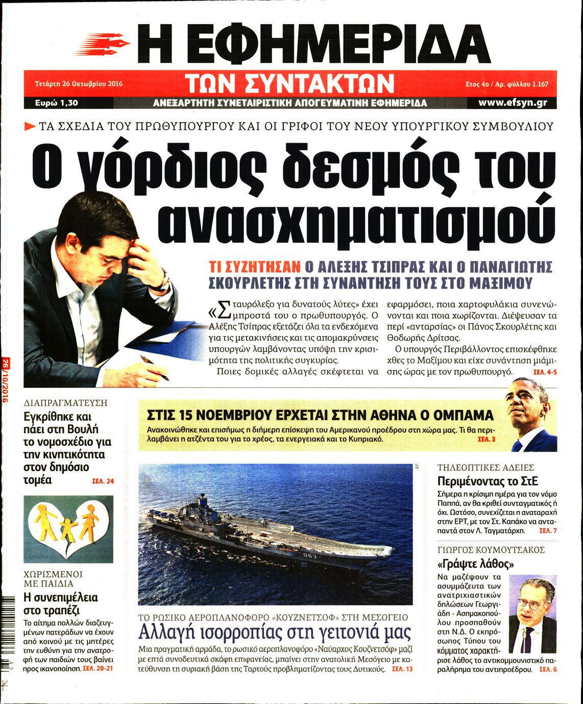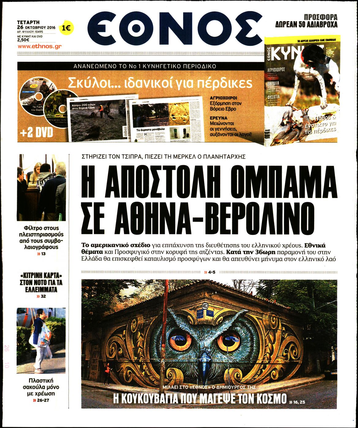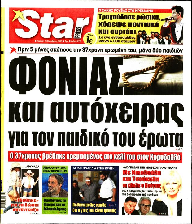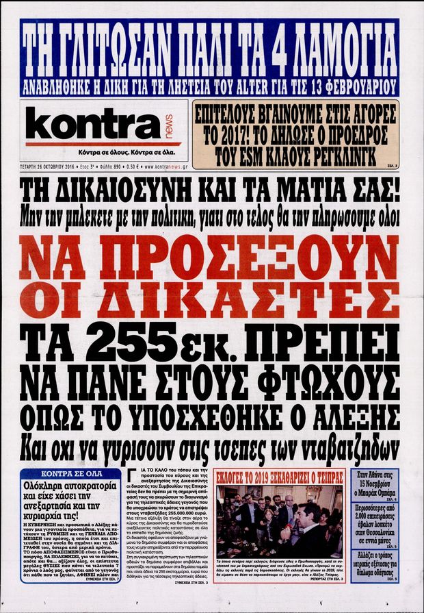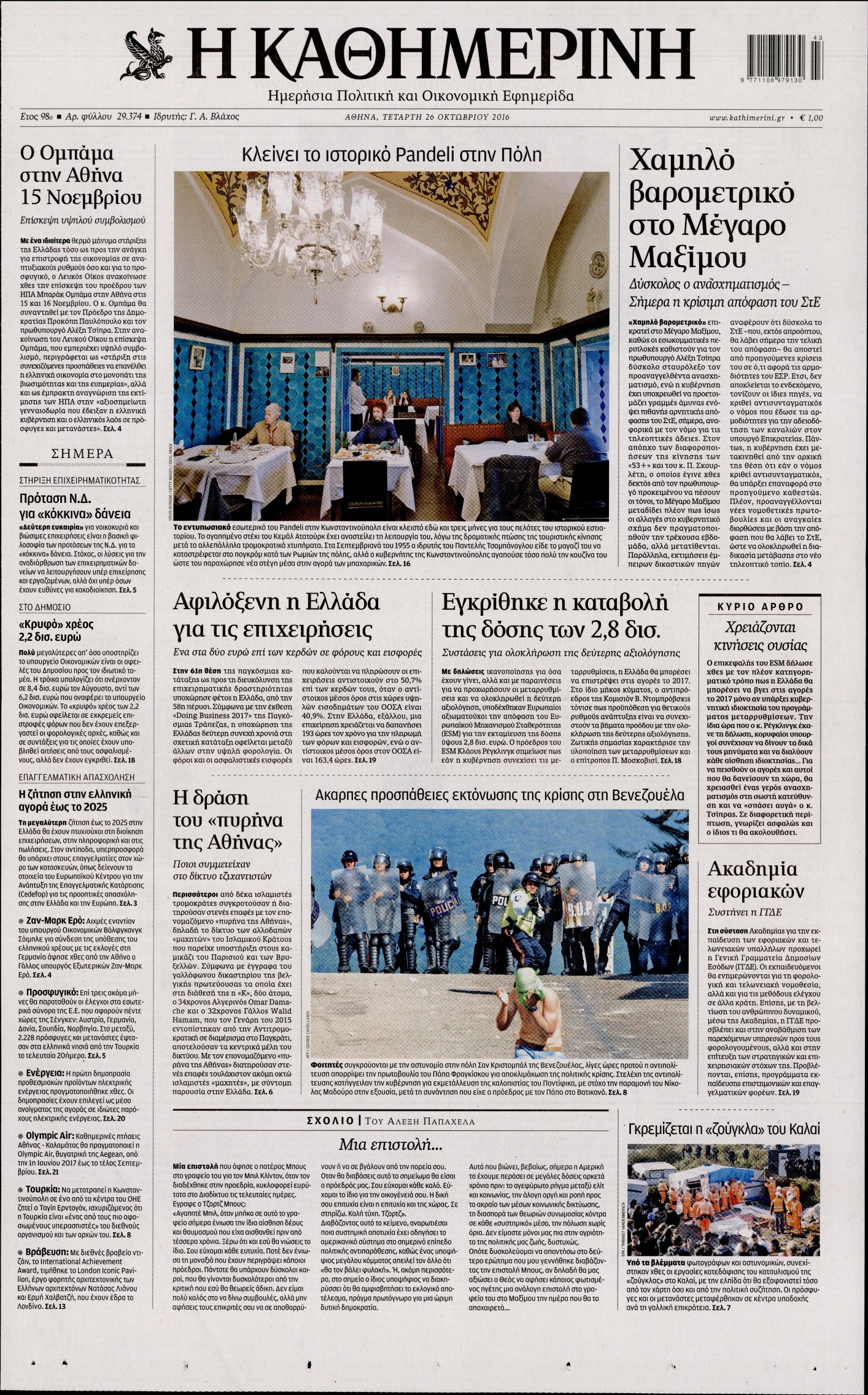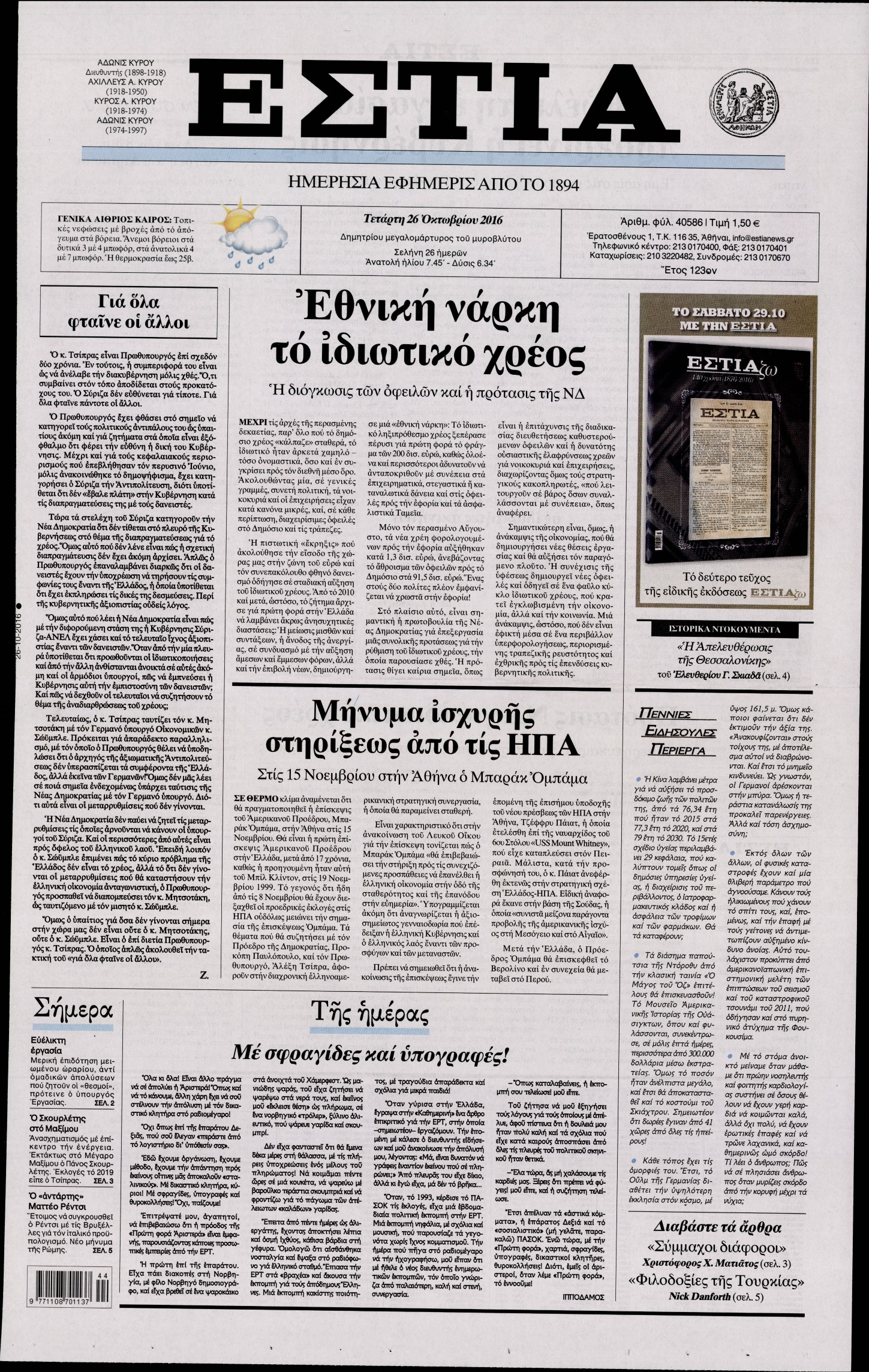 Oι πολιτικές εφημερίδες 26/10/2016 Κώστας Τεό 04:48, Τετάρτη 26 Οκτωβρίου 2016 Media Διαβάστε τα σημερινά πρωτοσέλιδα των πολιτικών εφημερίδων: ΠΟΛΙΤΙΚΕΣ ΕΦΗΜΕΡΙΔΕΣ ΠΡΩΤΟΣΕΛΙΔΑ Μοιράσου το: σχολίασε κι εσύ (0 σχόλια) Ακολουθήστε το enikos.gr στο Google News και μάθετε πρώτοι όλες τις ειδήσεις Δείτε όλες τις τελευταίες ειδήσεις από την Ελλάδα και τον Κόσμο στο enikos.gr Ειδήσεις Ροή Ειδήσεων 2 ώρες πριν Ακίλα Σάλεχ: «Άκυρο» το τουρκολιβυκό μνημόνιο λέει ο πρόεδρος της λιβυκής Βουλής – Ανοίγει ο διάλογος με Ελλάδα, Αίγυπτο και Τουρκία 6 ώρες πριν Αγρότες: Την Τρίτη η απόφαση για διάλογο ή κλιμάκωση των κινητοποιήσεών τους – Πώς χαρακτηρίζουν τις ανακοινώσεις Τσιάρα και οι επόμενες κινήσεις 6 ώρες πριν Τραμπ για Ουκρανία: «Είμαστε πιο κοντά σε συμφωνία από ποτέ» – «Πολυεθνική δύναμη» προτείνουν οι Ευρωπαίοι 6 ώρες πριν Κυψέλη: Η 16χρονη που μαχαίρωσε την 14χρονη είχε συλληφθεί 3 φορές στο παρελθόν – Έβριζε καθηγητές, έβαζε φωτιές σε κάδους και εκβίαζε συμμαθητές της 5 ώρες πριν Τρομοκρατική επίθεση στο Σίδνεϊ: Θλίψη για τα 15 θύματα – Οργή στην εβραϊκή κοινότητα που προειδοποιούσε επί δύο χρόνια 6 ώρες πριν Επιστήμονες ίσως έλυσαν το μυστήριο γύρω από τα Χόμπιτ – Νέα έρευνα αποκαλύπτει πώς εξαφανίστηκαν 7 ώρες πριν Ύπνος: Η αρχαία μορφή άσκησης που αποδεικνύεται αποτελεσματική στην αντιμετώπιση της αϋπνίας, σύμφωνα με μελέτη 8 ώρες πριν Αριθμολογία: Ο τυχερός σας αριθμός, ανάλογα με τον μήνα γέννησής σας 9 ώρες πριν Πώς να μην μαραίνονται γρήγορα τα κομμένα λουλούδια: Το λάθος στην τοποθέτηση του βάζου που πρέπει να αποφεύγετε 8 λεπτά πριν Νεοκλής Αβδάλας: Συνεχίζει να εντυπωσιάζει τους Αμερικάνους – Αναδείχθηκε Rookie of the week στην περιφέρειά του στο NCAA 19 λεπτά πριν Άντονι Αλμπανέζι: Κίνητρο της φονικής επίθεσης στην παραλία Μπόνταϊ μοιάζει να ήταν η ιδεολογία του Ισλαμικού Κράτους 27 λεπτά πριν Ντόναλντ Τραμπ: Κατέθεσε αγωγή 10 δισ. δολαρίων κατά του BBC, για συκοφαντική δυσφήμιση 37 λεπτά πριν ΗΠΑ: «Όπλο μαζικής καταστροφής» xαρακτήρισε ο Ντόναλντ Τραμπ τη φαιντανύλη 52 λεπτά πριν Στέλλα Κονιτοπούλου: «Η κόρη μου με έστειλε για ψυχοθεραπεία για να μπορέσω να το διαχειριστώ» ENIKOS NETWORK Πότε το χρόνιο ροχαλητό να αποτελέσει ένδειξη κινδύνου για την καρδιά; Τι λένε οι ειδικοί Μάριος Θεμιστοκλέους: Το ΕΣΥ ενισχύεται, εκσυγχρονίζεται, αλλάζει ΕΒΕΠ για αγροτικές κινητοποιήσεις: Κάθε επιπλέον εβδομάδα προσθέτει περίπου 200 εκατ. ευρώ ζημιά Τι προβλέπει το νομοσχέδιο του υπουργείου Εθνικής Άμυνας – Oι αλλαγές στους μισθούς Σύγχρονος Νοστράδαμος: Προειδοποιεί για «μεγάλο γεγονός» τους επόμενους μήνες που θα συγκλονίσει τη Βρετανία και τον κόσμο Τεστ παρατηρητικότητας: Μπορείτε να βρείτε τις 3 διαφορές στις εικόνες με έναν πιγκουίνο σε 14 δευτερόλεπτα περισσότερα 21:35 , Δευτέρα 15 Δεκεμβρίου 2025 Το Σπίτι Δίπλα Στο Ποτάμι: Η Ιουλία και ο Φωκάς μετακομίζουν στη Ρόδο – Δύο νέοι χαρακτήρες μπαίνουν στη σειρά Δύο νέοι, κομβικοί χαρακτήρες κάνουν την εμφάνισή τους αυτή την εβδομάδα στην αγαπημένη σειρά ... 19:46 , Δευτέρα 15 Δεκεμβρίου 2025 Άγιος έρωτας: Η Χριστίνα λέει την αλήθεια στον Αντρέα Ο Βασίλης δέχεται επίθεση από τους συμμαθητές του, η Αναστασία είναι συντετριμμένη με την απώλ... 18:45 , Δευτέρα 15 Δεκεμβρίου 2025 Συνέδριο «Ελληνικός Τουρισμός 2025, Μια εθνική υπόθεση!» – «Ο Θαλάσσιος Πυλώνας ως Ενιαία Στρατηγική: Συνέργειες σε Λιμάνια, Μαρίνες, Ακτοπλοΐα, Κρουαζιέρα και Yachting» Στο πλαίσιο της τ