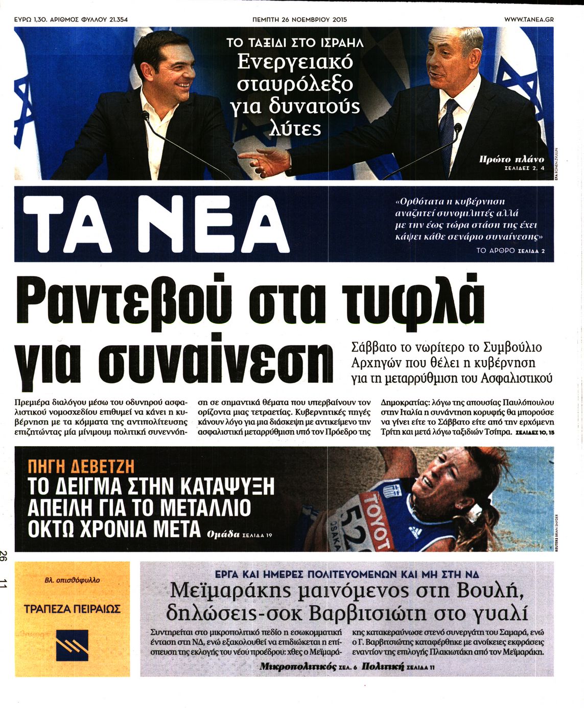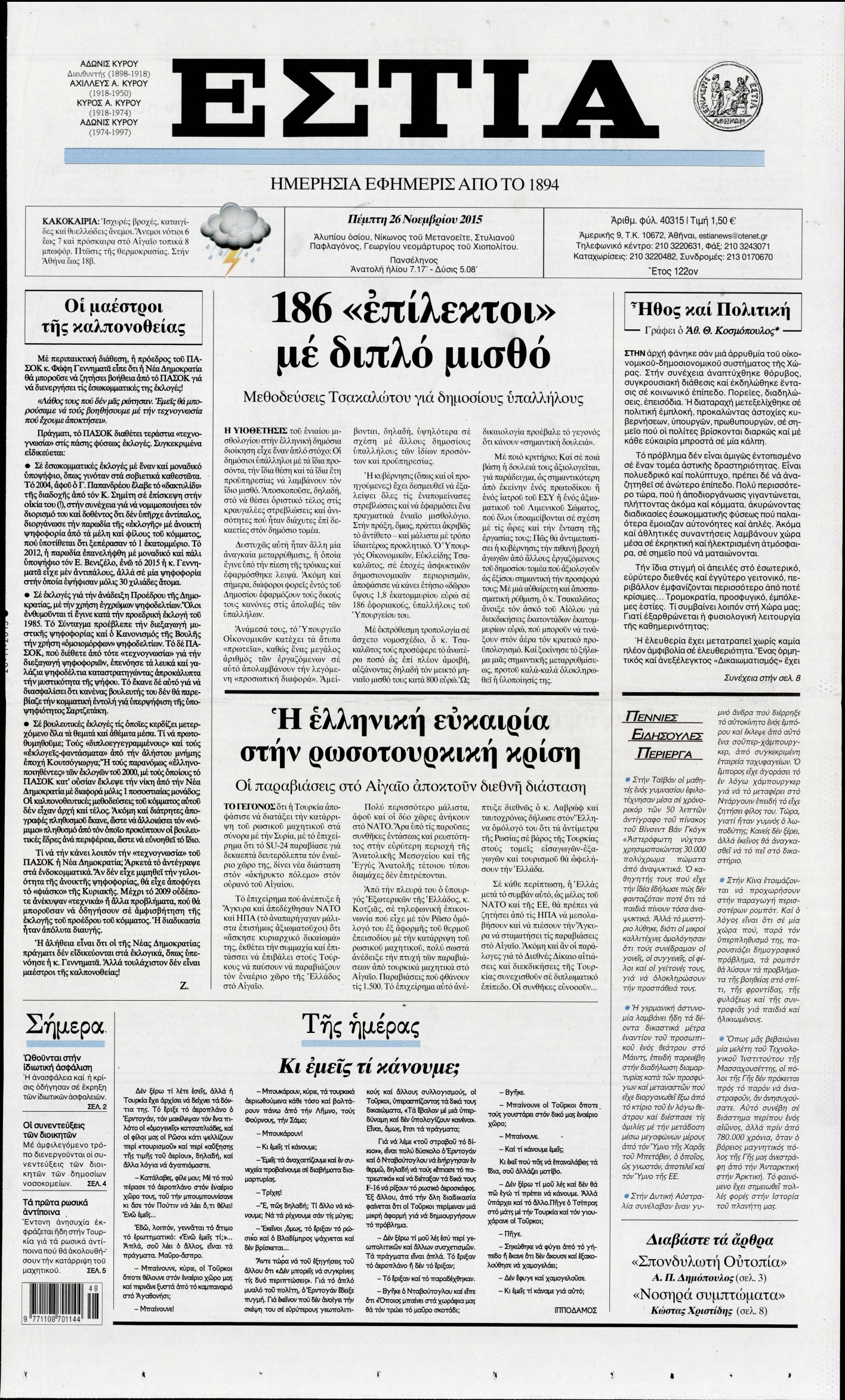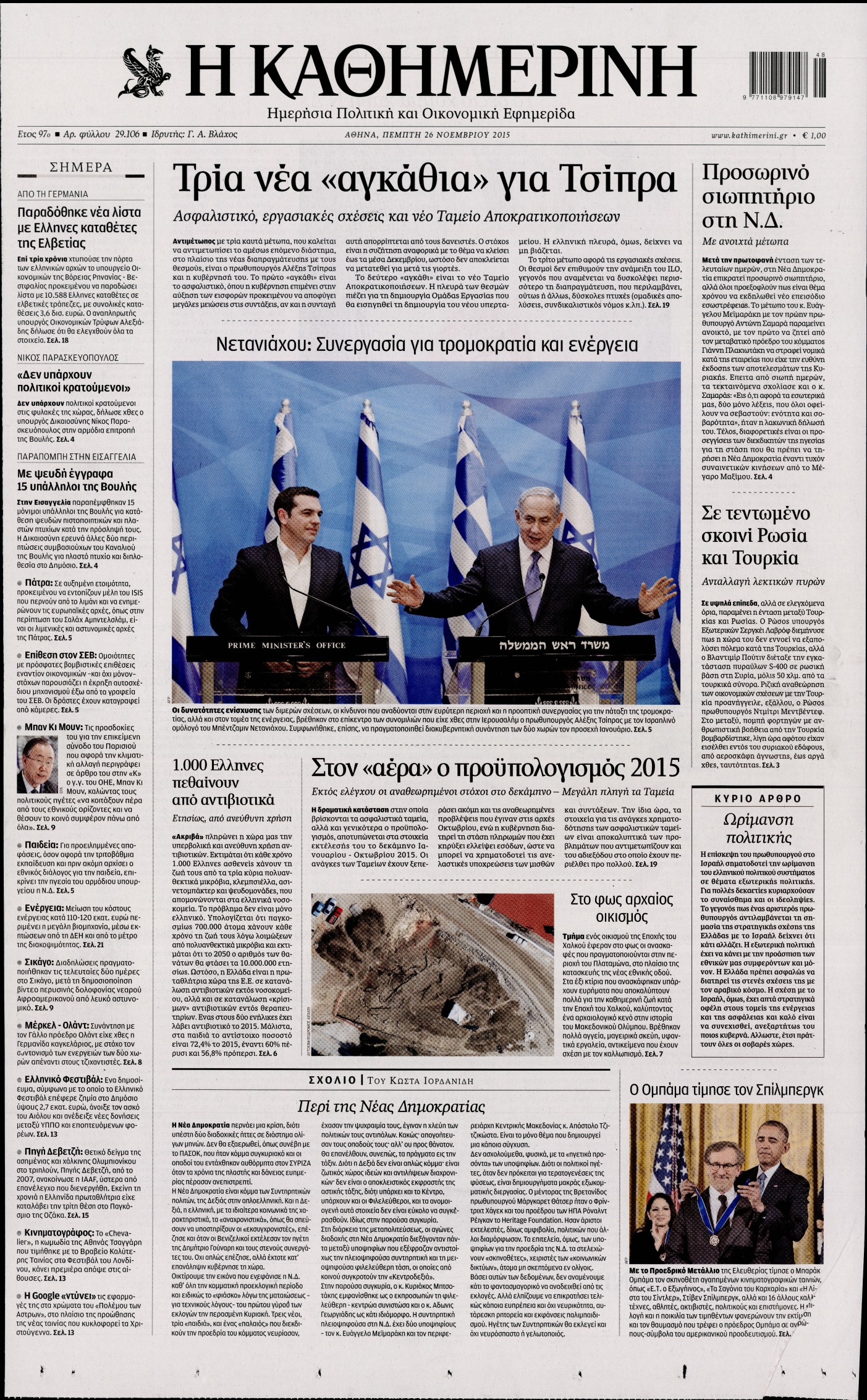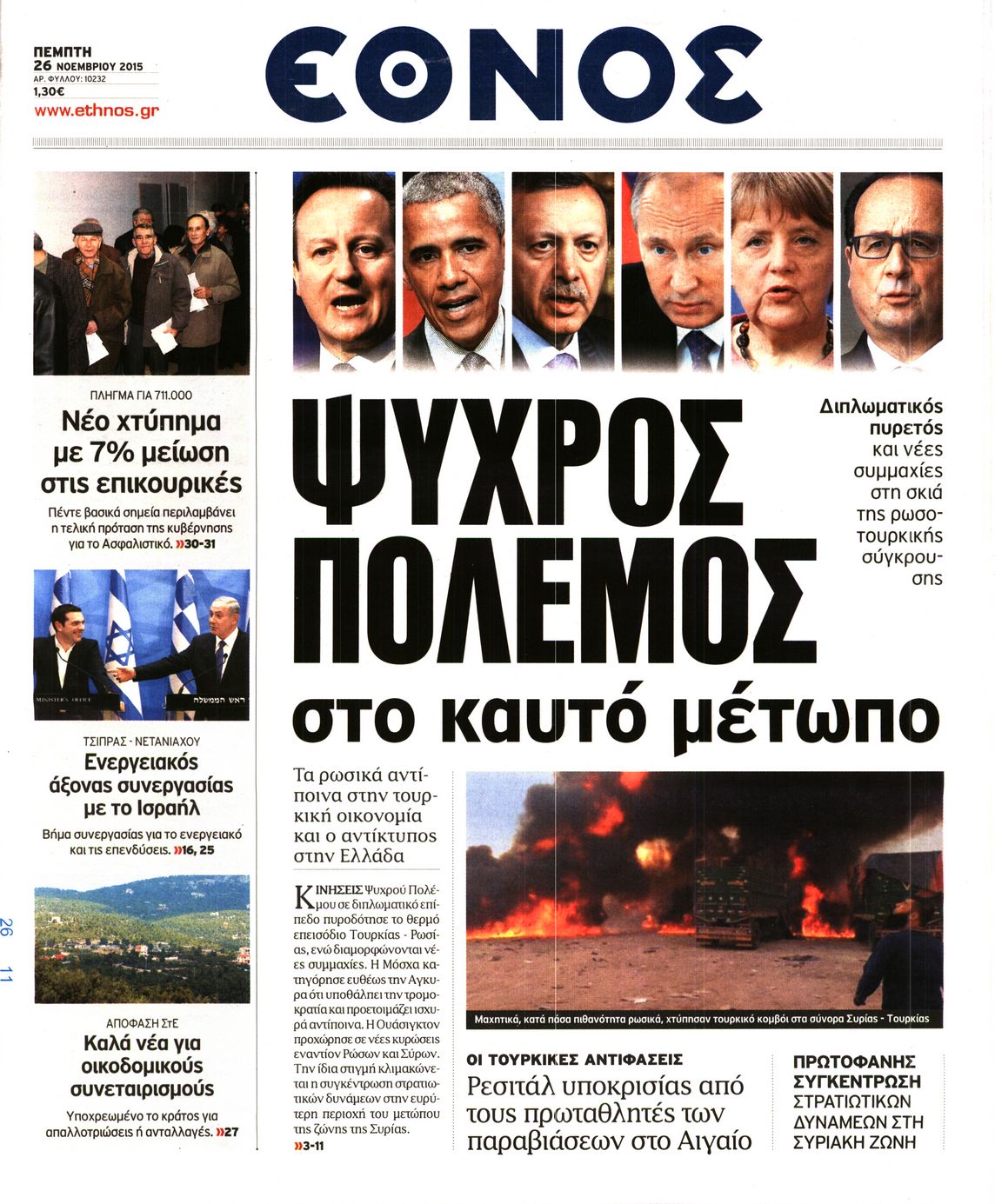 Οι πολιτικές εφημερίδες 26/11/2015 Enikos Newsroom 06:17, Πέμπτη 26 Νοεμβρίου 2015 Media Διαβάστε τα σημερινά πρωτοσέλιδα των πολιτικών εφημερίδων: ΠΟΛΙΤΙΚΕΣ ΕΦΗΜΕΡΙΔΕΣ ΠΡΩΤΟΣΕΛΙΔΑ Μοιράσου το: σχολίασε κι εσύ (0 σχόλια) Ακολουθήστε το enikos.gr στο Google News και μάθετε πρώτοι όλες τις ειδήσεις Δείτε όλες τις τελευταίες ειδήσεις από την Ελλάδα και τον Κόσμο στο enikos.gr Ειδήσεις Ροή Ειδήσεων 3 ώρες πριν Χριστούγεννα στα μπλόκα: Επιμένουν στις κινητοποιήσεις τους οι αγρότες – Ανοίγουν τα διόδια το Σαββατοκύριακο 3 ώρες πριν Ουκρανία: Η άνευ προηγουμένου επίθεση σε ρωσικό τάνκερ στη Μεσόγειο και το μήνυμα προς στον Πούτιν – Το «μακρύ χέρι» του Κιέβου 2 ώρες πριν Πούτιν: Τα μηνύματα σε Ευρώπη και ΝΑΤΟ από το μαραθώνιο «σόου» του – Η απαίτηση για «σεβασμό» και η ειρήνη «με τους όρους» της Μόσχας 3 ώρες πριν Τραμπ: Δεν αποκλείει την πιθανότητα ενός πολέμου στη Βενεζουέλα – «Ο Μαδούρο ξέρει καλύτερα από τον καθένα τι ακριβώς θέλω» 4 ώρες πριν Συνεχίζει να προκαλεί ο Μίτσκοσκι: «Για μένα το όνομα Μακεδονία είναι ιερό» 2 ώρες πριν Ανακαλύφθηκαν αρχαία χρυσά νομίσματα 2.200 ετών που απεικονίζουν τον θεό Απόλλωνα – Η άγνωστη σύνδεση με τον Φίλιππο Β΄ της Μακεδονίας 3 ώρες πριν Ύπνος: Μια κρυφή κατάσταση του εγκεφάλου πριν από τον ύπνο μπορεί να είναι το “κλειδί” για υψηλή ευφυΐα και δημιουργικότητα 4 ώρες πριν Αριθμολογία: Οι άνθρωποι που έχουν γεννηθεί αυτές τις 4 ημερομηνίες, συχνά παρεξηγούνται – «Η καλοσύνη τους κρύβει τεράστια δύναμη» 5 ώρες πριν Ξεχάστε το καθάρισμα το Σαββατοκύριακο: Ο «κανόνας των 20 λεπτών» που θα σας λύσει τα χέρια 5 λεπτά πριν Συρία: Μαζικά πλήγματα των ΗΠΑ σε θέσεις του Ισλαμικού Κράτους – Χέγκσεθ: «Δεν είναι αρχή πολέμου, είναι μια δήλωση εκδίκησης» για το θάνατο των στρατιωτών μας 18 λεπτά πριν Ουκρανία: Ολοκληρώθηκαν οι συνομιλίες με τους Αμερικανούς κι Ευρωπαίους διαπραγματευτές 33 λεπτά πριν Μπαρτσελόνα – Μπασκόνια 134-124: Οι «μπλαουγκράνα» πήραν το ματς της χρονιάς ύστερα από τρεις παρατάσεις 48 λεπτά πριν Φαίη Σκορδά: «Παλιότερα τα κομπλιμέντα τα προσπερνούσα, τώρα τα έχω ανάγκη» 1 ώρα πριν Βασίλης Σπανούλης: Δεν εμφανίστηκε ούτε ένας δημοσιογράφος στην συνέντευξη Τύπου – «Καλησπέρα στον… κανέναν», δείτε βίντεο ENIKOS NETWORK Το ΕΚΑΒ τιμήθηκε από την Ακαδημία Αθηνών για τα 40 χρόνια προσφοράς του Έχετε πραγματικά μεγάλη καρδιά; 10 χαρακτηριστικά όσων έχουν καλοσύνη Αναστολή μέτρων αναγκαστικής εκτέλεσης για κτηνοτρόφους που πλήττονται από την ευλογιά των αιγοπροβάτων Πλήρης επάρκεια προϊόντων στις λαϊκές της Αττικής, παρά τις αγροτικές κινητοποιήσεις – Τι απαντούν οι πωλητές Χαρτογραφώντας το «σημείο χωρίς επιστροφή»: Για πρώτη φορά αποκαλύπτεται με λεπτομέρεια το ακανθώδες όριο της ατμόσφαιρας τ... Η Google καταργεί τη λειτουργία «dark web report» – Πώς θα μπορούν οι χρήστες να διαγράφουν τα δεδομένα τους περισσότερα 22:42 , Παρασκευή 19 Δεκεμβρίου 2025 Γιώργος Γιαννόπουλος για “Το σόι σου”: “Είναι ευτυχία και ευλογία αυτή η σειρά” «Είναι ευτυχία και ευλογία η συγκυρία αυτής της σειράς», θα πει ο Γιώργος Γιαννόπουλος -ο αγαπ... 20:37 , Παρασκευή 19 Δεκεμβρίου 2025 Don’t Forget The Lyrics: Η Έλλη Κοκκίνου υποδέχεται 4 παίκτες που θα κάνουν τα πάντα για να μη χάσουν ούτε… μισή λέξη από τους στίχους Το «Don’t Forget The Lyrics» επιστρέφει απόψε, Παρασκευή 19 Δεκεμβρίου, στις 21:00 με νέο επει... 19:31 , Παρασκευή 19 Δεκεμβρίου 2025 GNTM: Απόψε ο μεγάλος τελικός για τους 4 φιναλίστ Έπειτα από μήνες γεμ