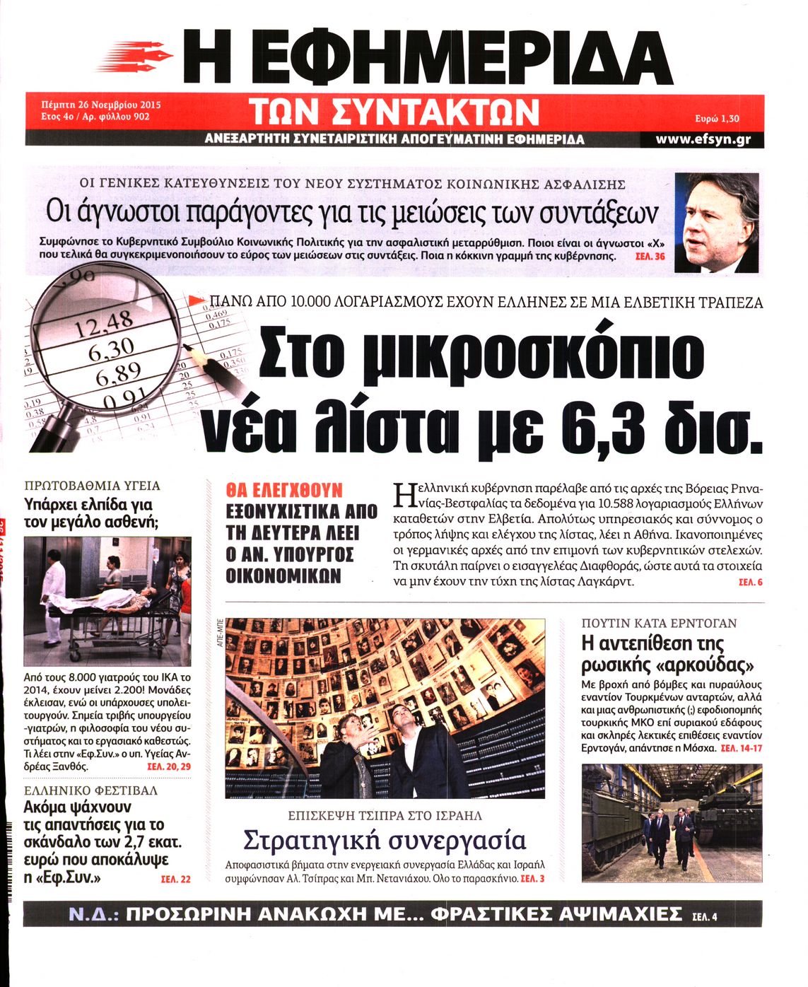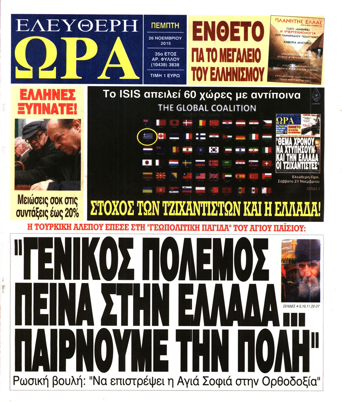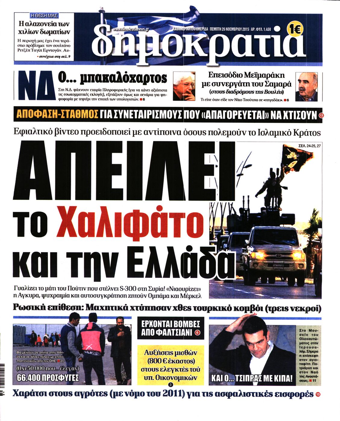 Οι πολιτικές εφημερίδες 26/11/2015 Enikos Newsroom 06:17, Πέμπτη 26 Νοεμβρίου 2015 Media Διαβάστε τα σημερινά πρωτοσέλιδα των πολιτικών εφημερίδων: ΠΟΛΙΤΙΚΕΣ ΕΦΗΜΕΡΙΔΕΣ ΠΡΩΤΟΣΕΛΙΔΑ Μοιράσου το: σχολίασε κι εσύ (0 σχόλια) Ακολουθήστε το enikos.gr στο Google News και μάθετε πρώτοι όλες τις ειδήσεις Δείτε όλες τις τελευταίες ειδήσεις από την Ελλάδα και τον Κόσμο στο enikos.gr Ειδήσεις Ροή Ειδήσεων 3 ώρες πριν Χριστούγεννα στα μπλόκα: Επιμένουν στις κινητοποιήσεις τους οι αγρότες – Ανοίγουν τα διόδια το Σαββατοκύριακο 3 ώρες πριν Ουκρανία: Η άνευ προηγουμένου επίθεση σε ρωσικό τάνκερ στη Μεσόγειο και το μήνυμα προς στον Πούτιν – Το «μακρύ χέρι» του Κιέβου 2 ώρες πριν Πούτιν: Τα μηνύματα σε Ευρώπη και ΝΑΤΟ από το μαραθώνιο «σόου» του – Η απαίτηση για «σεβασμό» και η ειρήνη «με τους όρους» της Μόσχας 3 ώρες πριν Τραμπ: Δεν αποκλείει την πιθανότητα ενός πολέμου στη Βενεζουέλα – «Ο Μαδούρο ξέρει καλύτερα από τον καθένα τι ακριβώς θέλω» 4 ώρες πριν Συνεχίζει να προκαλεί ο Μίτσκοσκι: «Για μένα το όνομα Μακεδονία είναι ιερό» 2 ώρες πριν Ανακαλύφθηκαν αρχαία χρυσά νομίσματα 2.200 ετών που απεικονίζουν τον θεό Απόλλωνα – Η άγνωστη σύνδεση με τον Φίλιππο Β΄ της Μακεδονίας 3 ώρες πριν Ύπνος: Μια κρυφή κατάσταση του εγκεφάλου πριν από τον ύπνο μπορεί να είναι το “κλειδί” για υψηλή ευφυΐα και δημιουργικότητα 4 ώρες πριν Αριθμολογία: Οι άνθρωποι που έχουν γεννηθεί αυτές τις 4 ημερομηνίες, συχνά παρεξηγούνται – «Η καλοσύνη τους κρύβει τεράστια δύναμη» 5 ώρες πριν Ξεχάστε το καθάρισμα το Σαββατοκύριακο: Ο «κανόνας των 20 λεπτών» που θα σας λύσει τα χέρια 5 λεπτά πριν Συρία: Μαζικά πλήγματα των ΗΠΑ σε θέσεις του Ισλαμικού Κράτους – Χέγκσεθ: «Δεν είναι αρχή πολέμου, είναι μια δήλωση εκδίκησης» για το θάνατο των στρατιωτών μας 18 λεπτά πριν Ουκρανία: Ολοκληρώθηκαν οι συνομιλίες με τους Αμερικανούς κι Ευρωπαίους διαπραγματευτές 33 λεπτά πριν Μπαρτσελόνα – Μπασκόνια 134-124: Οι «μπλαουγκράνα» πήραν το ματς της χρονιάς ύστερα από τρεις παρατάσεις 48 λεπτά πριν Φαίη Σκορδά: «Παλιότερα τα κομπλιμέντα τα προσπερνούσα, τώρα τα έχω ανάγκη» 1 ώρα πριν Βασίλης Σπανούλης: Δεν εμφανίστηκε ούτε ένας δημοσιογράφος στην συνέντευξη Τύπου – «Καλησπέρα στον… κανέναν», δείτε βίντεο ENIKOS NETWORK Το ΕΚΑΒ τιμήθηκε από την Ακαδημία Αθηνών για τα 40 χρόνια προσφοράς του Έχετε πραγματικά μεγάλη καρδιά; 10 χαρακτηριστικά όσων έχουν καλοσύνη Αναστολή μέτρων αναγκαστικής εκτέλεσης για κτηνοτρόφους που πλήττονται από την ευλογιά των αιγοπροβάτων Πλήρης επάρκεια προϊόντων στις λαϊκές της Αττικής, παρά τις αγροτικές κινητοποιήσεις – Τι απαντούν οι πωλητές Χαρτογραφώντας το «σημείο χωρίς επιστροφή»: Για πρώτη φορά αποκαλύπτεται με λεπτομέρεια το ακανθώδες όριο της ατμόσφαιρας τ... Η Google καταργεί τη λειτουργία «dark web report» – Πώς θα μπορούν οι χρήστες να διαγράφουν τα δεδομένα τους περισσότερα 22:42 , Παρασκευή 19 Δεκεμβρίου 2025 Γιώργος Γιαννόπουλος για “Το σόι σου”: “Είναι ευτυχία και ευλογία αυτή η σειρά” «Είναι ευτυχία και ευλογία η συγκυρία αυτής της σειράς», θα πει ο Γιώργος Γιαννόπουλος -ο αγαπ... 20:37 , Παρασκευή 19 Δεκεμβρίου 2025 Don’t Forget The Lyrics: Η Έλλη Κοκκίνου υποδέχεται 4 παίκτες που θα κάνουν τα πάντα για να μη χάσουν ούτε… μισή λέξη από τους στίχους Το «Don’t Forget The Lyrics» επιστρέφει απόψε, Παρασκευή 19 Δεκεμβρίου, στις 21:00 με νέο επει... 19:31 , Παρασκευή 19 Δεκεμβρίου 2025 GNTM: Απόψε ο μεγάλος τελικός για τους 4 φιναλίστ Έπειτα από μήνες γεμ