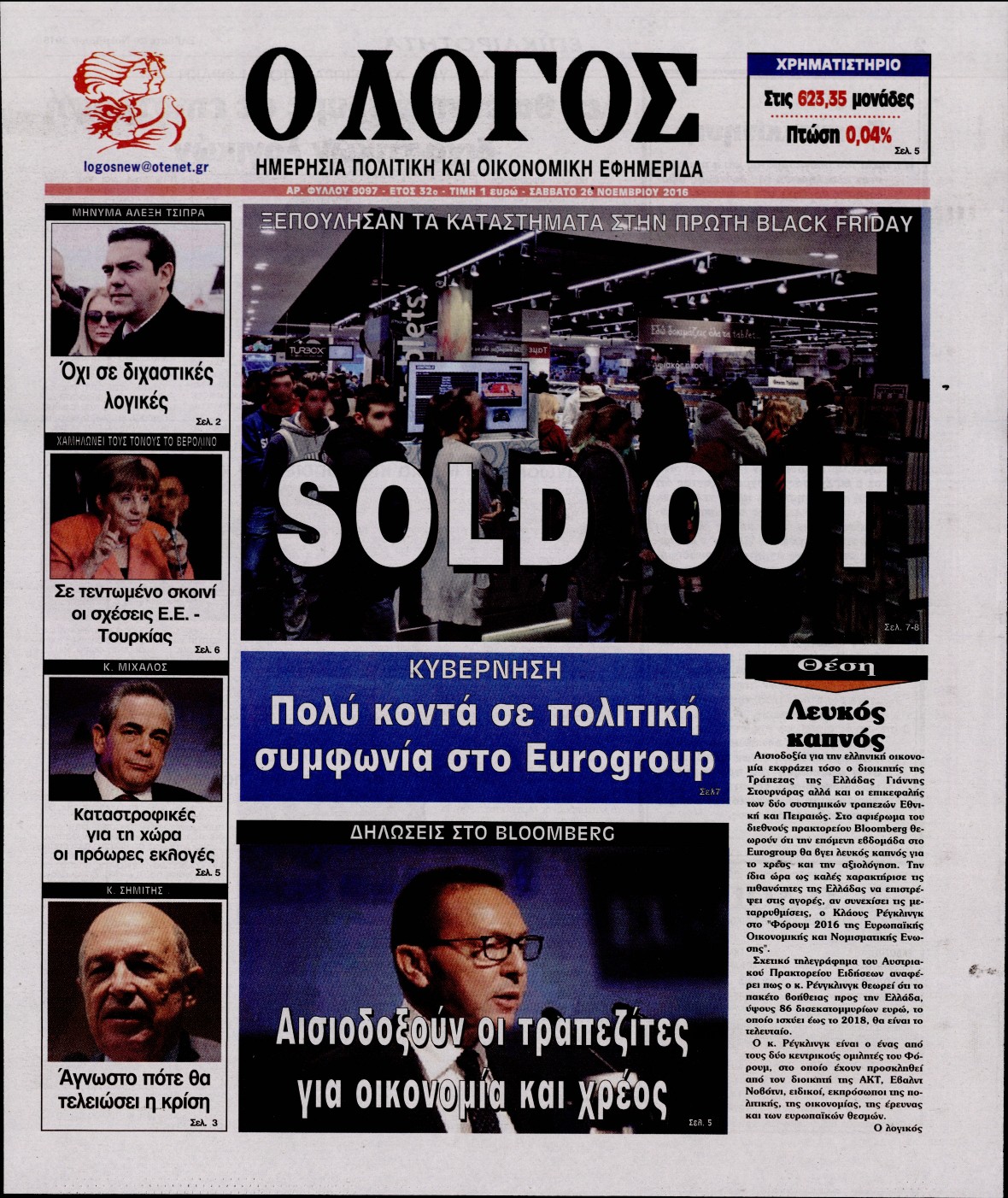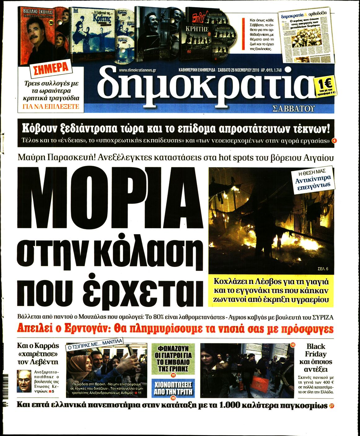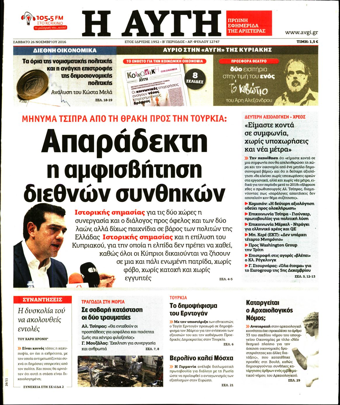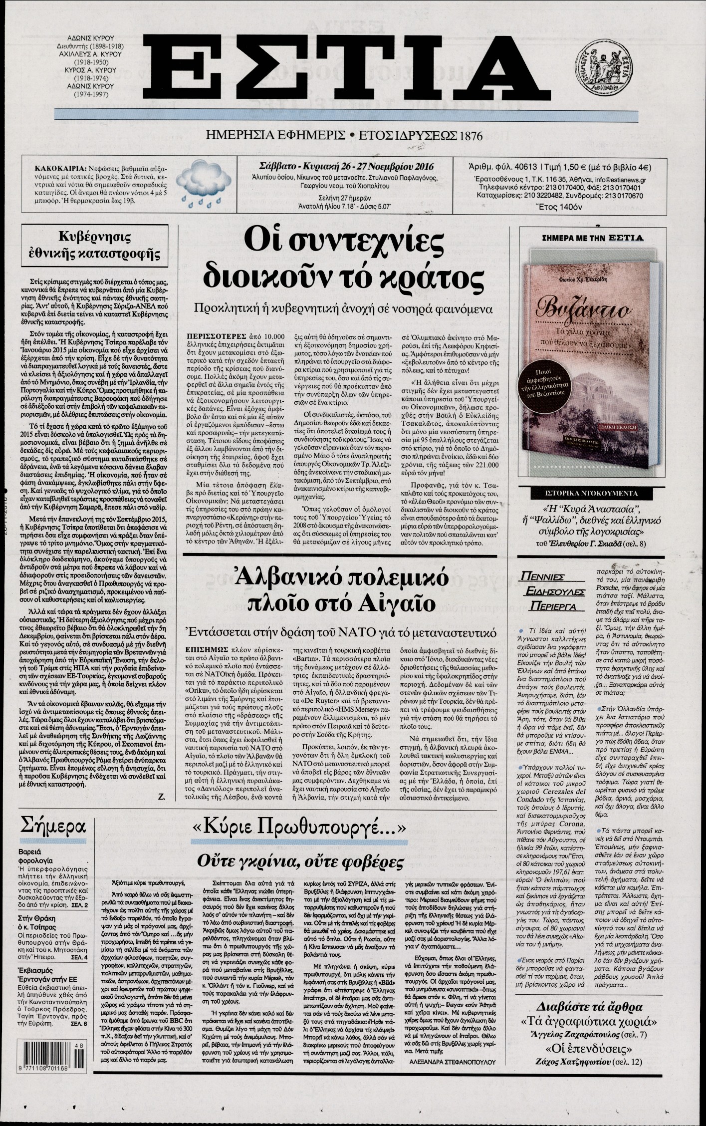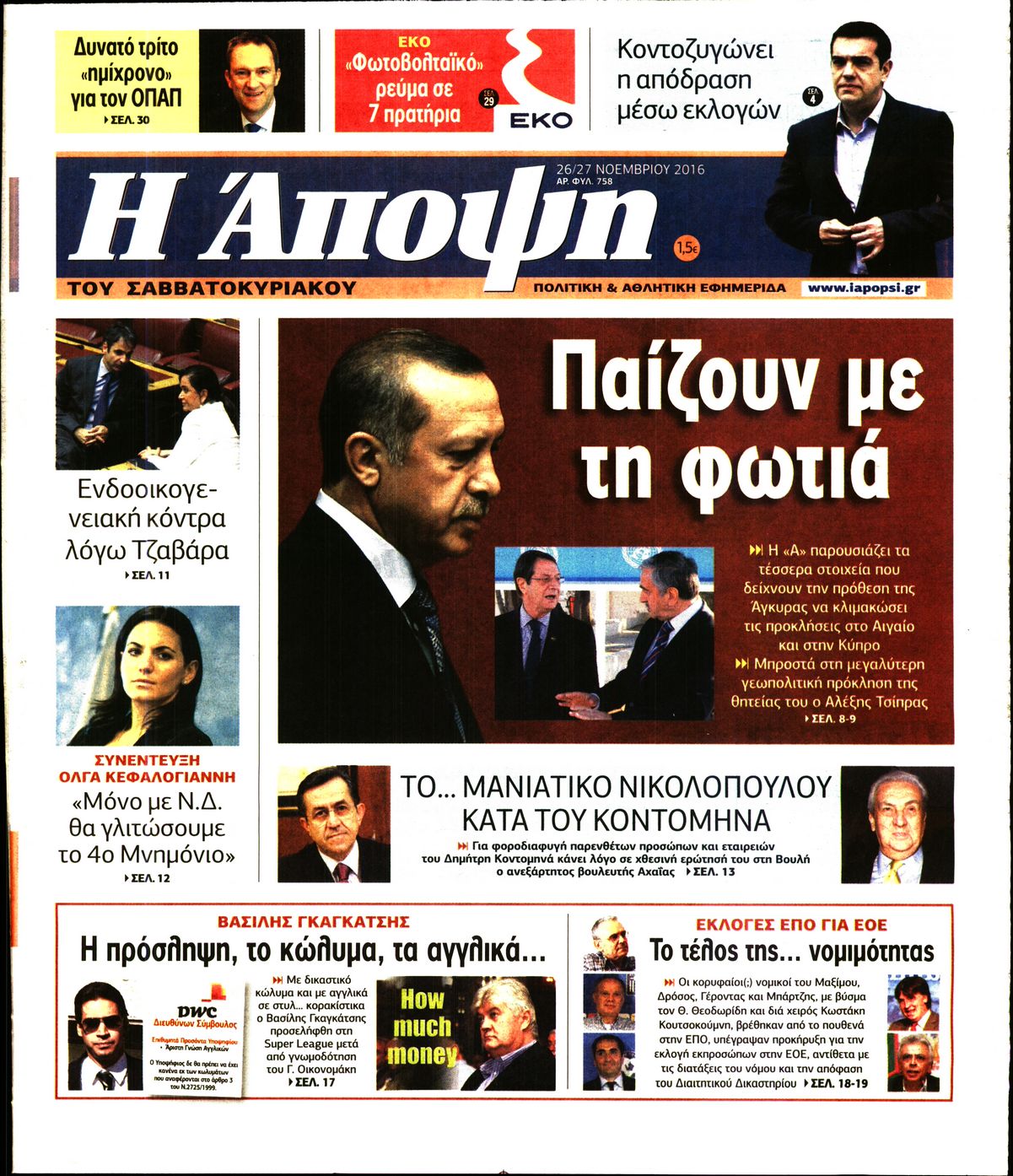 Οι πολιτικές εφημερίδες 26/11/2016 Enikos Newsroom 01:36, Σάββατο 26 Νοεμβρίου 2016 Media Διαβάστε τα σημερινά πρωτοσέλιδα των πολιτικών εφημερίδων: ΠΟΛΙΤΙΚΕΣ ΕΦΗΜΕΡΙΔΕΣ ΠΡΩΤΟΣΕΛΙΔΑ Μοιράσου το: σχολίασε κι εσύ (0 σχόλια) Ακολουθήστε το enikos.gr στο Google News και μάθετε πρώτοι όλες τις ειδήσεις Δείτε όλες τις τελευταίες ειδήσεις από την Ελλάδα και τον Κόσμο στο enikos.gr Ειδήσεις Ροή Ειδήσεων 4 ώρες πριν Χριστούγεννα στα μπλόκα: Επιμένουν στις κινητοποιήσεις τους οι αγρότες – Ανοίγουν τα διόδια το Σαββατοκύριακο 4 ώρες πριν Ουκρανία: Η άνευ προηγουμένου επίθεση σε ρωσικό τάνκερ στη Μεσόγειο και το μήνυμα προς στον Πούτιν – Το «μακρύ χέρι» του Κιέβου 3 ώρες πριν Πούτιν: Τα μηνύματα σε Ευρώπη και ΝΑΤΟ από το μαραθώνιο «σόου» του – Η απαίτηση για «σεβασμό» και η ειρήνη «με τους όρους» της Μόσχας 4 ώρες πριν Τραμπ: Δεν αποκλείει την πιθανότητα ενός πολέμου στη Βενεζουέλα – «Ο Μαδούρο ξέρει καλύτερα από τον καθένα τι ακριβώς θέλω» 5 ώρες πριν Συνεχίζει να προκαλεί ο Μίτσκοσκι: «Για μένα το όνομα Μακεδονία είναι ιερό» 3 ώρες πριν Ανακαλύφθηκαν αρχαία χρυσά νομίσματα 2.200 ετών που απεικονίζουν τον θεό Απόλλωνα – Η άγνωστη σύνδεση με τον Φίλιππο Β΄ της Μακεδονίας 4 ώρες πριν Ύπνος: Μια κρυφή κατάσταση του εγκεφάλου πριν από τον ύπνο μπορεί να είναι το “κλειδί” για υψηλή ευφυΐα και δημιουργικότητα 5 ώρες πριν Αριθμολογία: Οι άνθρωποι που έχουν γεννηθεί αυτές τις 4 ημερομηνίες, συχνά παρεξηγούνται – «Η καλοσύνη τους κρύβει τεράστια δύναμη» 6 ώρες πριν Ξεχάστε το καθάρισμα το Σαββατοκύριακο: Ο «κανόνας των 20 λεπτών» που θα σας λύσει τα χέρια 15 λεπτά πριν ΗΠΑ: Τραγωδία στην Αλαμπάμα – Σκότωσε την δημοσιογράφο σύζυγό του και αυτοκτόνησε μπροστά στον 3χρονο γιο τους 29 λεπτά πριν Πρόταση γάμου στο ΣΕΦ κατά την διάρκεια του αγώνα Ολυμπιακός-Βιλερμπάν – Δείτε βίντεο 44 λεπτά πριν Euroleague: Επέστρεψε στις νίκες ο Ολυμπιακός, πήρε την ματσάρα της χρονιάς η Μπάρτσα – Τα αποτελέσματα και η βαθμολογία 59 λεπτά πριν Συρία: Μαζικά πλήγματα των ΗΠΑ σε θέσεις του Ισλαμικού Κράτους – Χέγκσεθ: «Δεν είναι αρχή πολέμου, είναι μια δήλωση εκδίκησης» για το θάνατο των στρατιωτών μας 1 ώρα πριν Ουκρανία: Ολοκληρώθηκαν οι συνομιλίες με τους Αμερικανούς κι Ευρωπαίους διαπραγματευτές ENIKOS NETWORK Το ΕΚΑΒ τιμήθηκε από την Ακαδημία Αθηνών για τα 40 χρόνια προσφοράς του Έχετε πραγματικά μεγάλη καρδιά; 10 χαρακτηριστικά όσων έχουν καλοσύνη Αναστολή μέτρων αναγκαστικής εκτέλεσης για κτηνοτρόφους που πλήττονται από την ευλογιά των αιγοπροβάτων Πλήρης επάρκεια προϊόντων στις λαϊκές της Αττικής, παρά τις αγροτικές κινητοποιήσεις – Τι απαντούν οι πωλητές Χαρτογραφώντας το «σημείο χωρίς επιστροφή»: Για πρώτη φορά αποκαλύπτεται με λεπτομέρεια το ακανθώδες όριο της ατμόσφαιρας τ... Η Google καταργεί τη λειτουργία «dark web report» – Πώς θα μπορούν οι χρήστες να διαγράφουν τα δεδομένα τους περισσότερα 22:42 , Παρασκευή 19 Δεκεμβρίου 2025 Γιώργος Γιαννόπουλος για “Το σόι σου”: “Είναι ευτυχία και ευλογία αυτή η σειρά” «Είναι ευτυχία και ευλογία η συγκυρία αυτής της σειράς», θα πει ο Γιώργος Γιαννόπουλος -ο αγαπ... 20:37 , Παρασκευή 19 Δεκεμβρίου 2025 Don’t Forget The Lyrics: Η Έλλη Κοκκίνου υποδέχεται 4 παίκτες που θα κάνουν τα πάντα για να μη χάσουν ούτε… μισή λέξη από τους στίχους Το «Don’t Forget The Lyrics» επιστρέφει απόψε, Παρασκευή 19 Δεκεμβρίου, στις 21:00 με νέο επει... 19:31 , Παρασκευή 19 Δεκεμβρίου 2025 GNTM: Απόψε ο μεγάλος τελικός για τους 4 φιναλίστ Έπειτα απ