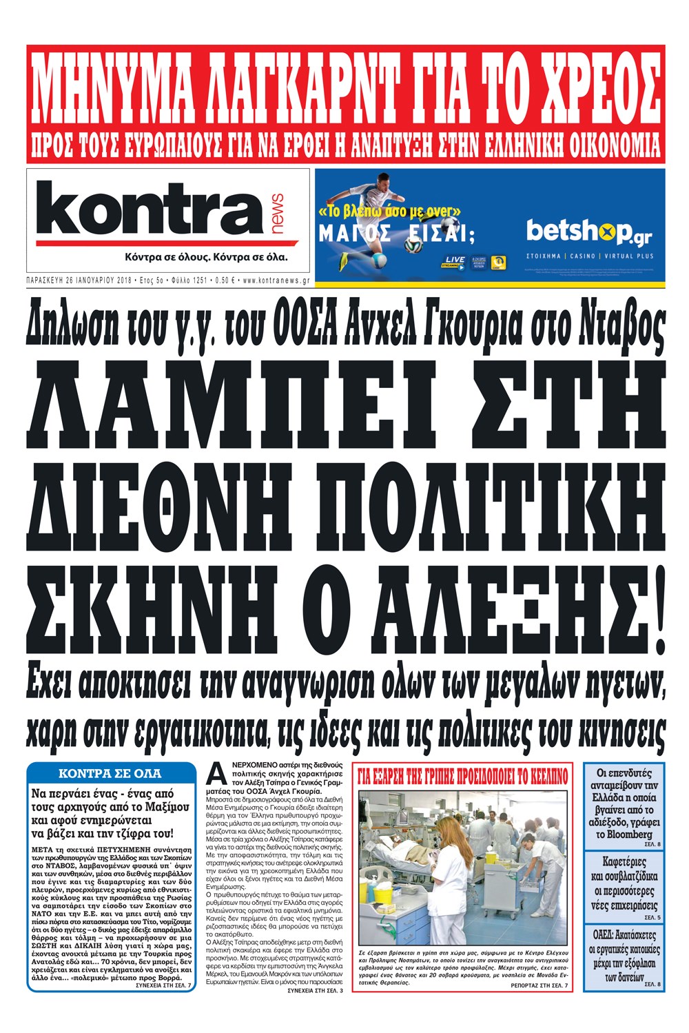 Οι πολιτικές εφημερίδες 26/1/2018 Enikos Newsroom 07:39, Παρασκευή 26 Ιανουαρίου 2018 Media Διαβάστε τα σημερινά πρωτοσέλιδα των πολιτικών εφημερίδων: ΠΟΛΙΤΙΚΕΣ ΕΦΗΜΕΡΙΔΕΣ ΠΡΩΤΟΣΕΛΙΔΑ Μοιράσου το: σχολίασε κι εσύ (0 σχόλια) Ακολουθήστε το enikos.gr στο Google News και μάθετε πρώτοι όλες τις ειδήσεις Δείτε όλες τις τελευταίες ειδήσεις από την Ελλάδα και τον Κόσμο στο enikos.gr Ειδήσεις Ροή Ειδήσεων 3 ώρες πριν Χριστούγεννα στα μπλόκα: Επιμένουν στις κινητοποιήσεις τους οι αγρότες – Ανοίγουν τα διόδια το Σαββατοκύριακο 3 ώρες πριν Ουκρανία: Η άνευ προηγουμένου επίθεση σε ρωσικό τάνκερ στη Μεσόγειο και το μήνυμα προς στον Πούτιν – Το «μακρύ χέρι» του Κιέβου 2 ώρες πριν Πούτιν: Τα μηνύματα σε Ευρώπη και ΝΑΤΟ από το μαραθώνιο «σόου» του – Η απαίτηση για «σεβασμό» και η ειρήνη «με τους όρους» της Μόσχας 3 ώρες πριν Τραμπ: Δεν αποκλείει την πιθανότητα ενός πολέμου στη Βενεζουέλα – «Ο Μαδούρο ξέρει καλύτερα από τον καθένα τι ακριβώς θέλω» 4 ώρες πριν Συνεχίζει να προκαλεί ο Μίτσκοσκι: «Για μένα το όνομα Μακεδονία είναι ιερό» 2 ώρες πριν Ανακαλύφθηκαν αρχαία χρυσά νομίσματα 2.200 ετών που απεικονίζουν τον θεό Απόλλωνα – Η άγνωστη σύνδεση με τον Φίλιππο Β΄ της Μακεδονίας 3 ώρες πριν Ύπνος: Μια κρυφή κατάσταση του εγκεφάλου πριν από τον ύπνο μπορεί να είναι το “κλειδί” για υψηλή ευφυΐα και δημιουργικότητα 4 ώρες πριν Αριθμολογία: Οι άνθρωποι που έχουν γεννηθεί αυτές τις 4 ημερομηνίες, συχνά παρεξηγούνται – «Η καλοσύνη τους κρύβει τεράστια δύναμη» 5 ώρες πριν Ξεχάστε το καθάρισμα το Σαββατοκύριακο: Ο «κανόνας των 20 λεπτών» που θα σας λύσει τα χέρια 4 λεπτά πριν Συρία: Μαζικά πλήγματα των ΗΠΑ σε θέσεις του Ισλαμικού Κράτους – Χέγκσεθ: «Δεν είναι αρχή πολέμου, είναι μια δήλωση εκδίκησης» για το θάνατο των στρατιωτών μας 17 λεπτά πριν Ουκρανία: Ολοκληρώθηκαν οι συνομιλίες με τους Αμερικανούς κι Ευρωπαίους διαπραγματευτές 32 λεπτά πριν Μπαρτσελόνα – Μπασκόνια 134-124: Οι «μπλαουγκράνα» πήραν το ματς της χρονιάς ύστερα από τρεις παρατάσεις 47 λεπτά πριν Φαίη Σκορδά: «Παλιότερα τα κομπλιμέντα τα προσπερνούσα, τώρα τα έχω ανάγκη» 1 ώρα πριν Βασίλης Σπανούλης: Δεν εμφανίστηκε ούτε ένας δημοσιογράφος στην συνέντευξη Τύπου – «Καλησπέρα στον… κανέναν», δείτε βίντεο ENIKOS NETWORK Το ΕΚΑΒ τιμήθηκε από την Ακαδημία Αθηνών για τα 40 χρόνια προσφοράς του Έχετε πραγματικά μεγάλη καρδιά; 10 χαρακτηριστικά όσων έχουν καλοσύνη Αναστολή μέτρων αναγκαστικής εκτέλεσης για κτηνοτρόφους που πλήττονται από την ευλογιά των αιγοπροβάτων Πλήρης επάρκεια προϊόντων στις λαϊκές της Αττικής, παρά τις αγροτικές κινητοποιήσεις – Τι απαντούν οι πωλητές Χαρτογραφώντας το «σημείο χωρίς επιστροφή»: Για πρώτη φορά αποκαλύπτεται με λεπτομέρεια το ακανθώδες όριο της ατμόσφαιρας τ... Η Google καταργεί τη λειτουργία «dark web report» – Πώς θα μπορούν οι χρήστες να διαγράφουν τα δεδομένα τους περισσότερα 22:42 , Παρασκευή 19 Δεκεμβρίου 2025 Γιώργος Γιαννόπουλος για “Το σόι σου”: “Είναι ευτυχία και ευλογία αυτή η σειρά” «Είναι ευτυχία και ευλογία η συγκυρία αυτής της σειράς», θα πει ο Γιώργος Γιαννόπουλος -ο αγαπ... 20:37 , Παρασκευή 19 Δεκεμβρίου 2025 Don’t Forget The Lyrics: Η Έλλη Κοκκίνου υποδέχεται 4 παίκτες που θα κάνουν τα πάντα για να μη χάσουν ούτε… μισή λέξη από τους στίχους Το «Don’t Forget The Lyrics» επιστρέφει απόψε, Παρασκευή 19 Δεκεμβρίου, στις 21:00 με νέο επει... 19:31 , Παρασκευή 19 Δεκεμβρίου 2025 GNTM: Απόψε ο μεγάλος τελικός για τους 4 φιναλίστ Έπειτα από μήνες 