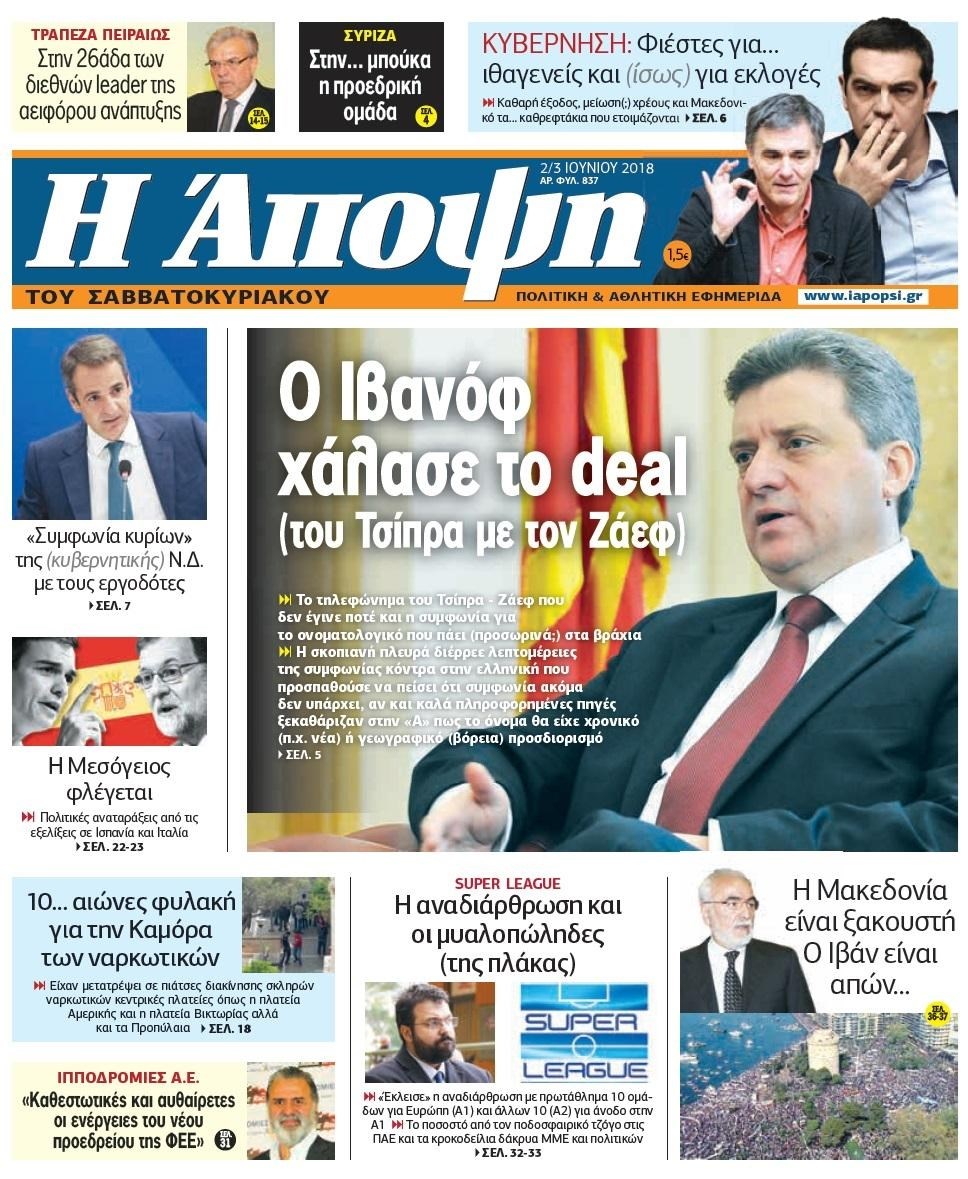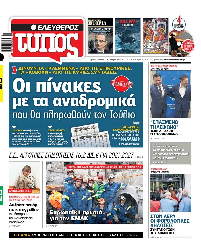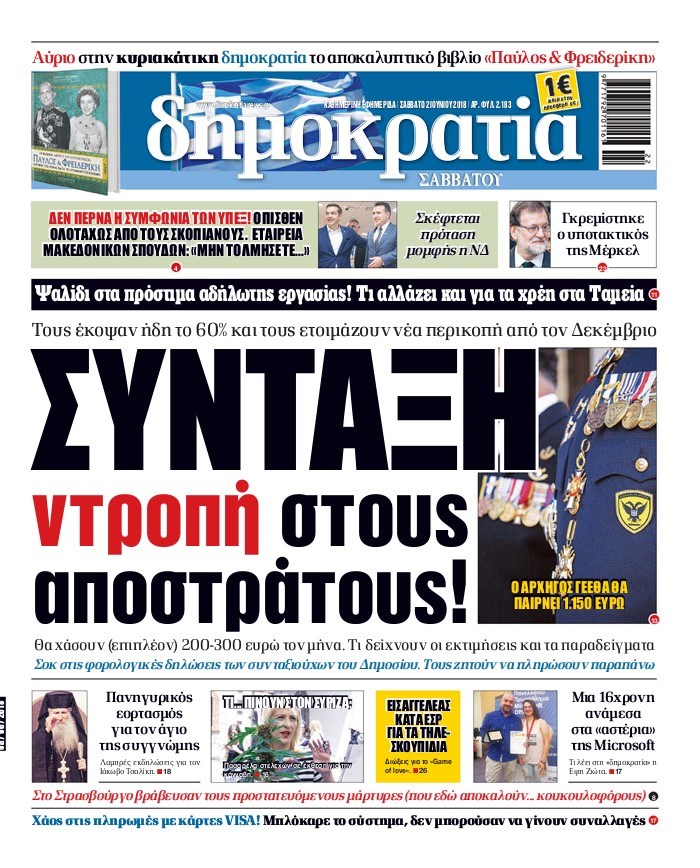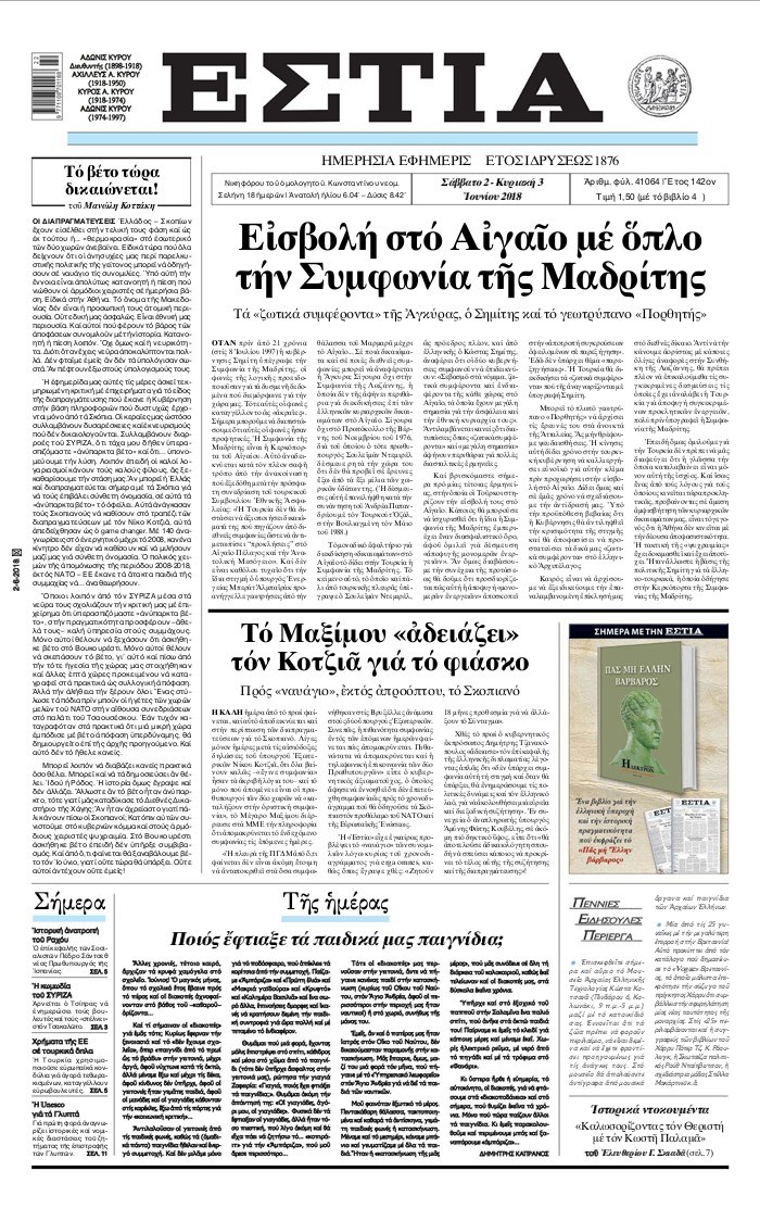 Οι πολιτικές εφημερίδες 2/6/2018 Κώστας Τεό 06:42, Σάββατο 02 Ιουνίου 2018 Media Διαβάστε τα σημερινά πρωτοσέλιδα των πολιτικών εφημερίδων: ΠΟΛΙΤΙΚΕΣ ΕΦΗΜΕΡΙΔΕΣ ΠΡΩΤΟΣΕΛΙΔΑ Μοιράσου το: σχολίασε κι εσύ (0 σχόλια) Ακολουθήστε το enikos.gr στο Google News και μάθετε πρώτοι όλες τις ειδήσεις Δείτε όλες τις τελευταίες ειδήσεις από την Ελλάδα και τον Κόσμο στο enikos.gr Ειδήσεις Ροή Ειδήσεων 32 λεπτά πριν Τσιάρας προς αγρότες: Τα μπλόκα και τα πείσματα δεν ωφελούν – Οι λύσεις περνούν μέσα από τον διάλογο 1 ώρα πριν Αρχεία Έπσταϊν: Οι συγκλονιστικές φωτογραφίες – Ο Μάικλ Τζάκσον, ο Μικ Τζάγκερ και ο Κέβιν Σπέισι ανάμεσα στους διάσημους που απεικονίζονται 3 ώρες πριν Νέες ταυτότητες: Μεγάλη αναμονή για ραντεβού στην Αττική – Τέλος τα ταξίδια εκτός Ελλάδος από τον Αύγουστο για όσους δεν έχουν αλλάξει 2 ώρες πριν Ινδία: Επτά ελέφαντες σκοτώθηκαν κατά τη σύγκρουση επιβατικού τρένου με κοπάδι 3 ώρες πριν Συνελήφθη οδηγός μηχανής που έτρεχε με 161 χλμ στη Συγγρού – Τον έπιασε το ραντάρ της Τροχαίας 4 ώρες πριν Μία νέα «χρυσή» περίοδος αρχίζει για 3 ζώδια από σήμερα – «Μία αναπάντεχη ευκαιρία οδηγεί στην επιτυχία» 5 ώρες πριν Αγχώνεται για το χριστουγεννιάτικο δώρο που πήρε στην πλούσια σύντροφό του – «Φοβάμαι πως θα το βρει φθηνιάρικο, φοράει βραχιόλια Cartier» 2 ώρες πριν Διαιτολόγος αποκαλύπτει 9 πρωινές συνήθειες που «λιώνουν» το κοιλιακό λίπος – «Υποστηρίζουν την υγιεινή απώλεια βάρους» 3 ώρες πριν Οι 7 φράσεις που δεν λένε ποτέ οι συναισθηματικά έξυπνοι άνθρωποι κατά τη διάρκεια ενός καβγά 7 λεπτά πριν Κικίλιας: «Ολοκληρώθηκαν πληρωμές 22,16 εκ. ευρώ για το μεταφορικό ισοδύναμο» 15 λεπτά πριν Πάτρα: Πέθανε 46χρονος έπειτα από λιποθυμικό επεισόδιο στο σπίτι του 23 λεπτά πριν «Μεγάλη Χίμαιρα»: Πότε κάνει πρεμιέρα η σειρά 31 λεπτά πριν Καλλιθέα: Έφοδος του «ελληνικού FBI» σε δύο καταστήματα stripshow – 5 συλλήψεις – Βίντεο 32 λεπτά πριν Τσιάρας προς αγρότες: Τα μπλόκα και τα πείσματα δεν ωφελούν – Οι λύσεις περνούν μέσα από τον διάλογο ENIKOS NETWORK Γήρανση του εγκεφάλου: Νευροεπιστήμονες ανακάλυψαν τη 10λεπτη δραστηριότητα που μπορεί να τη σταματήσει Είστε μόνιμα απρόσεκτοι; 3 σημάδια που δείχνουν ότι μπορεί να είναι σύμπτωμα πάθησης Χειμερινές εκπτώσεις 2026: Πρεμιέρα στις 12 Ιανουαρίου – Πόσο θα διαρκέσουν και τι πρέπει να γνωρίζουν οι καταναλωτές Χρήστος Δήμας: Στα 2,5 εκατ. ευρώ την ημέρα το κόστος από το άνοιγμα των διοδίων από τους αγρότες – Θα αξιώσουν αποζημίωση ... Χαρτογραφώντας το «σημείο χωρίς επιστροφή»: Για πρώτη φορά αποκαλύπτεται με λεπτομέρεια το ακανθώδες όριο της ατμόσφαιρας τ... Η Google καταργεί τη λειτουργία «dark web report» – Πώς θα μπορούν οι χρήστες να διαγράφουν τα δεδομένα τους περισσότερα 12:53 , Σάββατο 20 Δεκεμβρίου 2025 Να μ’ αγαπάς: Το παρελθόν έρχεται στο φως – Καταιγιστικές εξελίξεις στα τελευταία επεισόδια του 2025 Ο Άγγελος αποκαλύπτεται, η Φωτεινή ανησυχεί για τον Λευτέρη και η Ζωή έρχεται αντιμέτωπη με το... 11:41 , Σάββατο 20 Δεκεμβρίου 2025 «Η αγάπη δεν χάνεται ποτέ»: Η μικρού μήκους ταινία κινουμένων σχεδίων που θέτει ερωτήματα για τη ζωή και τον θάνατο Ο θάνατος είναι ένα από τα πιο σκληρά θέματα που καλείται να διαχειριστεί κάποιος στη διάρκεια... 09:30 , Σάββατο 20 Δεκεμβρίου 2025 «Porto Leone: Στη γειτονιά με τα κόκκινα φανάρια» – Ο Χρόνης αποκαλύπτει στην Αλεξάνδρα το μυστικό για το παιδί της Λένας Η μεγάλη δραματική σειρά του Apha «Porto Leone: Στη γειτονιά με τα κόκκινα φανάρια» μας μεταφέ