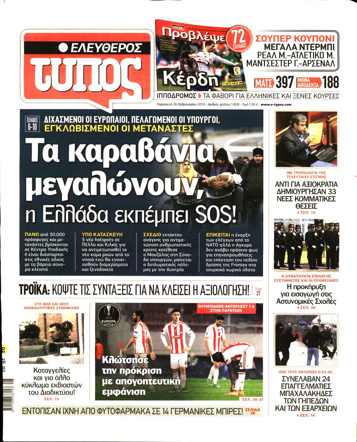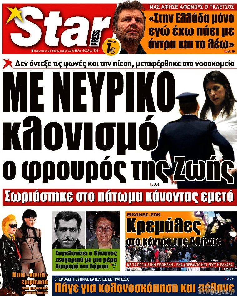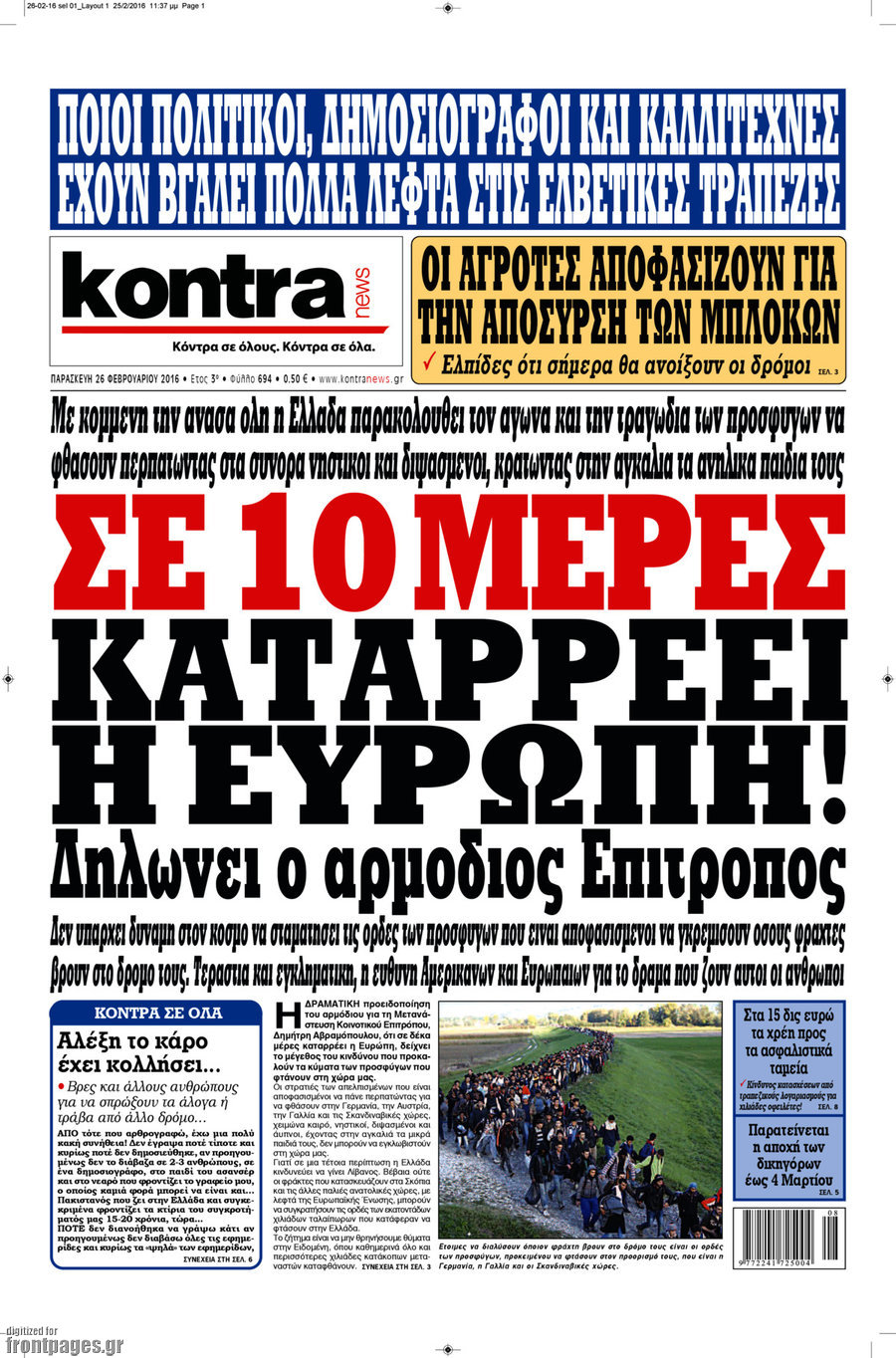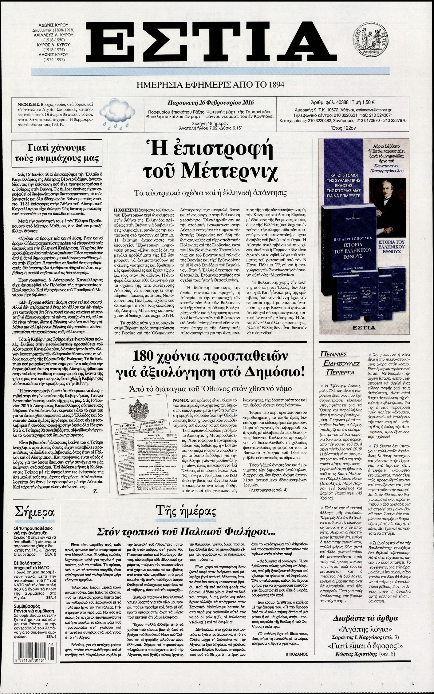 Οι πολιτικές εφημερίδες 26/2/2016 Enikos Newsroom 07:40, Παρασκευή 26 Φεβρουαρίου 2016 Media Διαβάστε τα σημερινά πρωτοσέλιδα των πολιτικών εφημερίδων: ΠΟΛΙΤΙΚΕΣ ΕΦΗΜΕΡΙΔΕΣ ΠΡΩΤΟΣΕΛΙΔΑ Μοιράσου το: σχολίασε κι εσύ (0 σχόλια) Ακολουθήστε το enikos.gr στο Google News και μάθετε πρώτοι όλες τις ειδήσεις Δείτε όλες τις τελευταίες ειδήσεις από την Ελλάδα και τον Κόσμο στο enikos.gr Ειδήσεις Ροή Ειδήσεων 20 λεπτά πριν Χριστούγεννα στα μπλόκα: Επιμένουν στις κινητοποιήσεις τους οι αγρότες – Ανοίγουν τα διόδια το Σαββατοκύριακο 49 λεπτά πριν Τραμπ: Δεν αποκλείει την πιθανότητα ενός πολέμου στη Βενεζουέλα – «Ο Μαδούρο ξέρει καλύτερα από τον καθένα τι ακριβώς θέλω» 43 λεπτά πριν Ουκρανία: Η άνευ προηγουμένου επίθεση σε ρωσικό τάνκερ στη Μεσόγειο και το μήνυμα προς στον Πούτιν – Το «μακρύ χέρι» του Κιέβου 3 ώρες πριν Πούτιν: «Ναι, είμαι ερωτευμένος» – Βίντεο από τη σπάνια προσωπική παραδοχή του 1 ώρα πριν Συνεχίζει να προκαλεί ο Μίτσκοσκι: «Για μένα το όνομα Μακεδονία είναι ιερό» 2 ώρες πριν Αριθμολογία: Οι άνθρωποι που έχουν γεννηθεί αυτές τις 4 ημερομηνίες, συχνά παρεξηγούνται – «Η καλοσύνη τους κρύβει τεράστια δύναμη» 4 ώρες πριν Μήπως έχετε χάσει τον εαυτό σας στη σχέση σας; 7 «αθόρυβες» υποχωρήσεις που μάλλον κάνατε, χωρίς να το συνειδητοποιήσετε 3 ώρες πριν Ξεχάστε το καθάρισμα το Σαββατοκύριακο: Ο «κανόνας των 20 λεπτών» που θα σας λύσει τα χέρια 58 λεπτά πριν Ύπνος: Μια κρυφή κατάσταση του εγκεφάλου πριν από τον ύπνο μπορεί να είναι το “κλειδί” για υψηλή ευφυΐα και δημιουργικότητα 4 λεπτά πριν Νίκος Ξυλούρης: Συγκινεί η χήρα του σπουδαίου καλλιτέχνη – «Ευχαριστώ όλο τον κόσμο που τον κρατάει ζωντανό 45 χρόνια» 10 λεπτά πριν Παναθηναϊκός: «Μέσα» οι Σφιντέρσκι και Τουμπά για το ματς με τον ΠΑΟΚ – Τι έδειξε η μαγνητική του Πάντοβιτς 16 λεπτά πριν Γιώργος Γιαννόπουλος για “Το σόι σου”: “Είναι ευτυχία και ευλογία αυτή η σειρά” 20 λεπτά πριν Χριστούγεννα στα μπλόκα: Επιμένουν στις κινητοποιήσεις τους οι αγρότες – Ανοίγουν τα διόδια το Σαββατοκύριακο 32 λεπτά πριν Χάρι και Μέγκαν: Η σπάνια οικογενειακή φωτογραφία με τον Άρτσι και τη Λίλιμπετ – Τι σχεδιάζουν για τα Χριστούγεννα ENIKOS NETWORK Το ΕΚΑΒ τιμήθηκε από την Ακαδημία Αθηνών για τα 40 χρόνια προσφοράς του Έχετε πραγματικά μεγάλη καρδιά; 10 χαρακτηριστικά όσων έχουν καλοσύνη Πλήρης επάρκεια προϊόντων στις λαϊκές της Αττικής, παρά τις αγροτικές κινητοποιήσεις – Τι απαντούν οι πωλητές ΑΑΔΕ: Νέες αναβαθμίσεις στο Ψηφιακό Πελατολόγιο και την εφαρμογή myDATAapp – Τι πρέπει να γνωρίζετε Χαρτογραφώντας το «σημείο χωρίς επιστροφή»: Για πρώτη φορά αποκαλύπτεται με λεπτομέρεια το ακανθώδες όριο της ατμόσφαιρας τ... Η Google καταργεί τη λειτουργία «dark web report» – Πώς θα μπορούν οι χρήστες να διαγράφουν τα δεδομένα τους περισσότερα 22:42 , Παρασκευή 19 Δεκεμβρίου 2025 Γιώργος Γιαννόπουλος για “Το σόι σου”: “Είναι ευτυχία και ευλογία αυτή η σειρά” «Είναι ευτυχία και ευλογία η συγκυρία αυτής της σειράς», θα πει ο Γιώργος Γιαννόπουλος -ο αγαπ... 20:37 , Παρασκευή 19 Δεκεμβρίου 2025 Don’t Forget The Lyrics: Η Έλλη Κοκκίνου υποδέχεται 4 παίκτες που θα κάνουν τα πάντα για να μη χάσουν ούτε… μισή λέξη από τους στίχους Το «Don’t Forget The Lyrics» επιστρέφει απόψε, Παρασκευή 19 Δεκεμβρίου, στις 21:00 με νέο επει... 19:31 , Παρασκευή 19 Δεκεμβρίου 2025 GNTM: Απόψε ο μεγάλος τελικός για τους 4 φιναλίστ Έπειτα από μήνες γεμάτους μόδα, δημιουργία και έντονες αναμετρήσεις, το GNTM 2025 κορυφώνεται,... 18:11 , Παρασκ