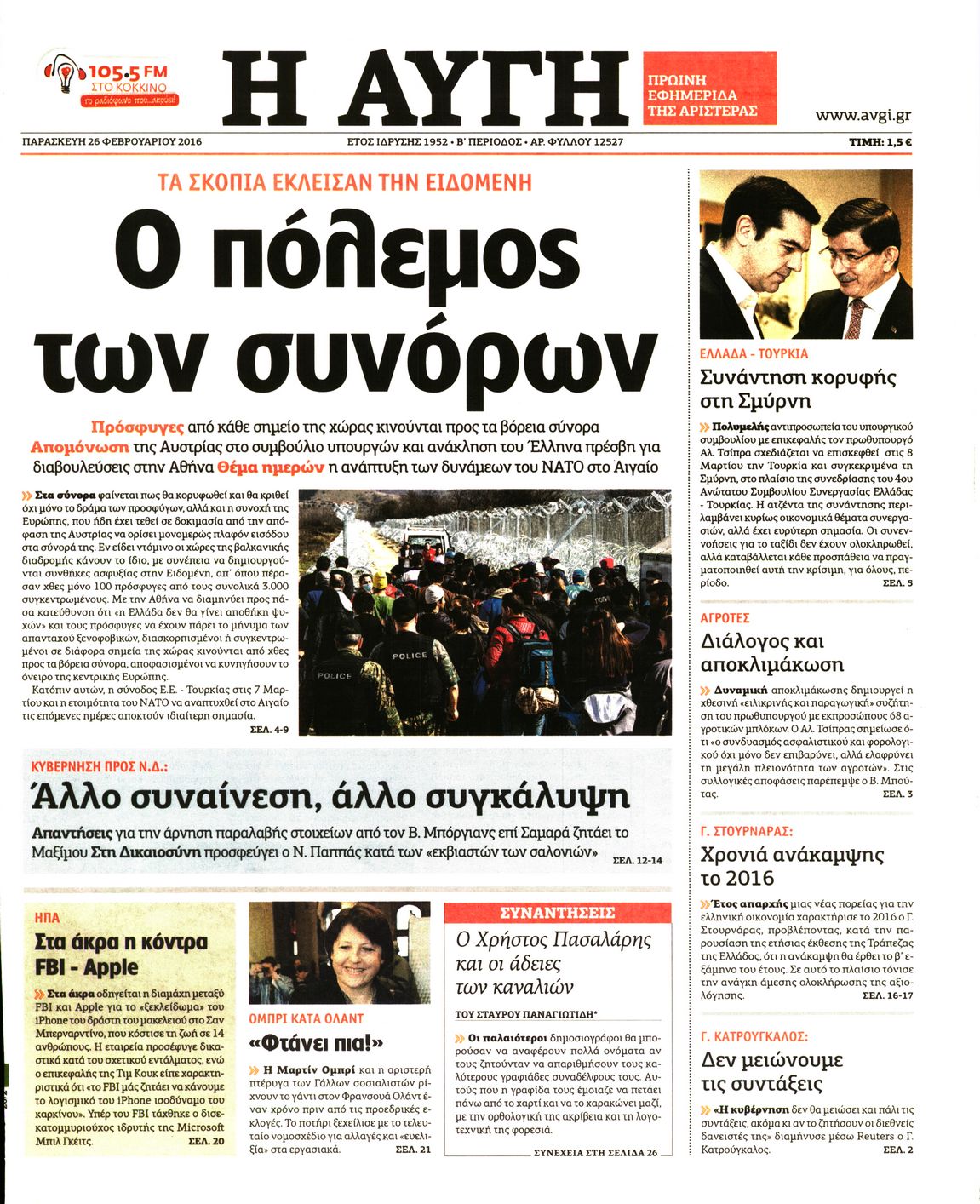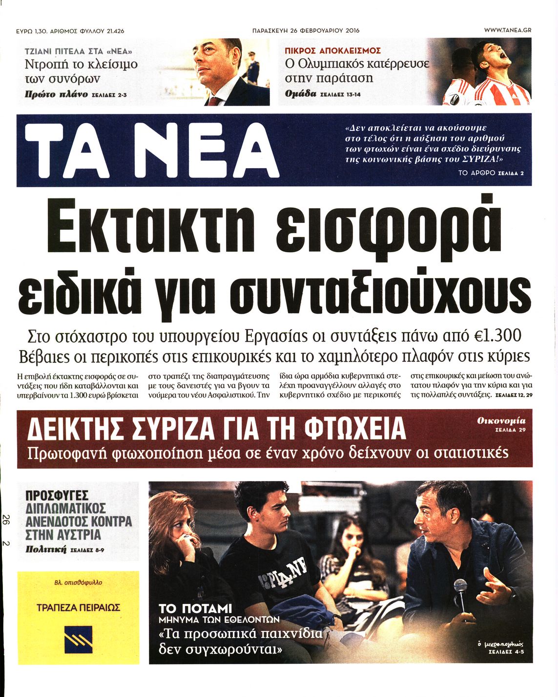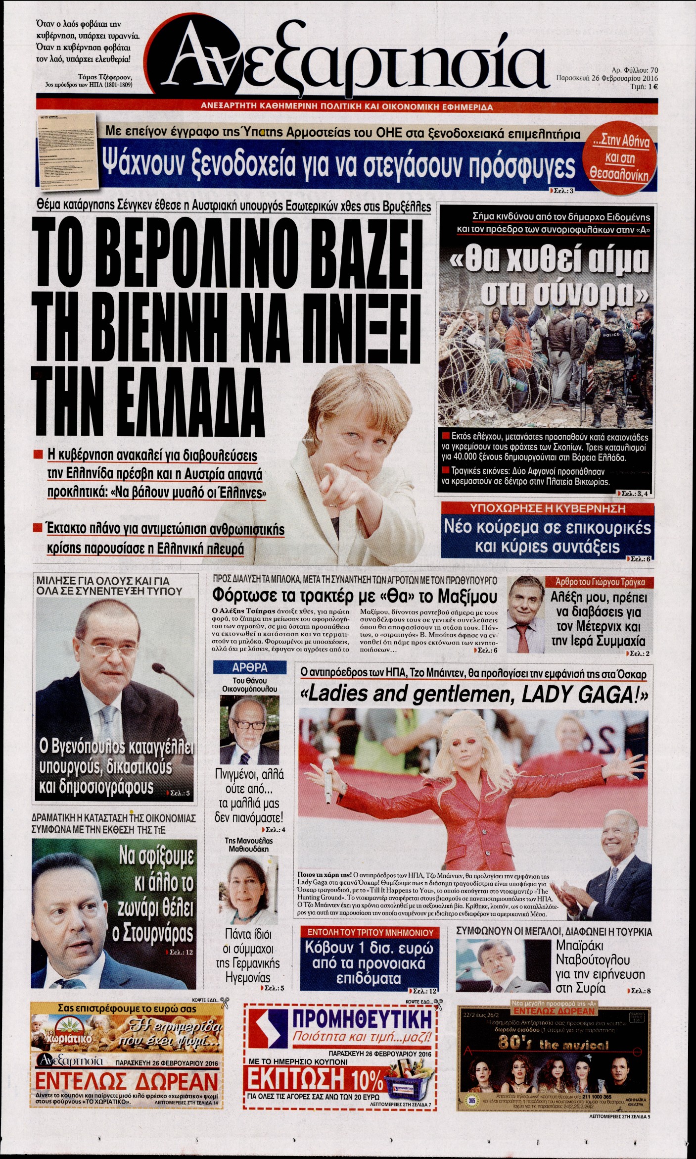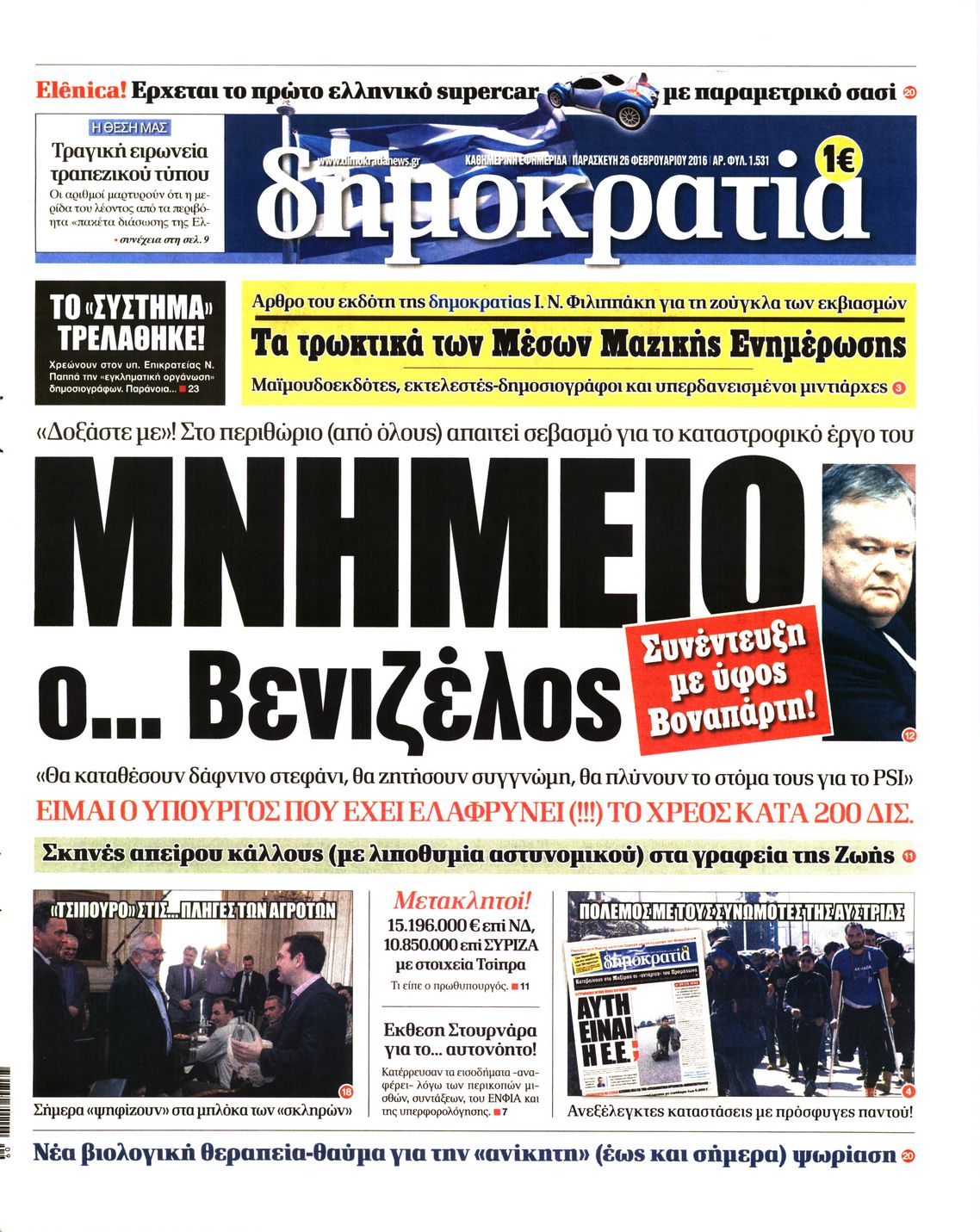 Οι πολιτικές εφημερίδες 26/2/2016 Enikos Newsroom 07:40, Παρασκευή 26 Φεβρουαρίου 2016 Media Διαβάστε τα σημερινά πρωτοσέλιδα των πολιτικών εφημερίδων: ΠΟΛΙΤΙΚΕΣ ΕΦΗΜΕΡΙΔΕΣ ΠΡΩΤΟΣΕΛΙΔΑ Μοιράσου το: σχολίασε κι εσύ (0 σχόλια) Ακολουθήστε το enikos.gr στο Google News και μάθετε πρώτοι όλες τις ειδήσεις Δείτε όλες τις τελευταίες ειδήσεις από την Ελλάδα και τον Κόσμο στο enikos.gr Ειδήσεις Ροή Ειδήσεων 20 λεπτά πριν Χριστούγεννα στα μπλόκα: Επιμένουν στις κινητοποιήσεις τους οι αγρότες – Ανοίγουν τα διόδια το Σαββατοκύριακο 49 λεπτά πριν Τραμπ: Δεν αποκλείει την πιθανότητα ενός πολέμου στη Βενεζουέλα – «Ο Μαδούρο ξέρει καλύτερα από τον καθένα τι ακριβώς θέλω» 43 λεπτά πριν Ουκρανία: Η άνευ προηγουμένου επίθεση σε ρωσικό τάνκερ στη Μεσόγειο και το μήνυμα προς στον Πούτιν – Το «μακρύ χέρι» του Κιέβου 3 ώρες πριν Πούτιν: «Ναι, είμαι ερωτευμένος» – Βίντεο από τη σπάνια προσωπική παραδοχή του 1 ώρα πριν Συνεχίζει να προκαλεί ο Μίτσκοσκι: «Για μένα το όνομα Μακεδονία είναι ιερό» 2 ώρες πριν Αριθμολογία: Οι άνθρωποι που έχουν γεννηθεί αυτές τις 4 ημερομηνίες, συχνά παρεξηγούνται – «Η καλοσύνη τους κρύβει τεράστια δύναμη» 4 ώρες πριν Μήπως έχετε χάσει τον εαυτό σας στη σχέση σας; 7 «αθόρυβες» υποχωρήσεις που μάλλον κάνατε, χωρίς να το συνειδητοποιήσετε 3 ώρες πριν Ξεχάστε το καθάρισμα το Σαββατοκύριακο: Ο «κανόνας των 20 λεπτών» που θα σας λύσει τα χέρια 58 λεπτά πριν Ύπνος: Μια κρυφή κατάσταση του εγκεφάλου πριν από τον ύπνο μπορεί να είναι το “κλειδί” για υψηλή ευφυΐα και δημιουργικότητα 4 λεπτά πριν Νίκος Ξυλούρης: Συγκινεί η χήρα του σπουδαίου καλλιτέχνη – «Ευχαριστώ όλο τον κόσμο που τον κρατάει ζωντανό 45 χρόνια» 10 λεπτά πριν Παναθηναϊκός: «Μέσα» οι Σφιντέρσκι και Τουμπά για το ματς με τον ΠΑΟΚ – Τι έδειξε η μαγνητική του Πάντοβιτς 16 λεπτά πριν Γιώργος Γιαννόπουλος για “Το σόι σου”: “Είναι ευτυχία και ευλογία αυτή η σειρά” 20 λεπτά πριν Χριστούγεννα στα μπλόκα: Επιμένουν στις κινητοποιήσεις τους οι αγρότες – Ανοίγουν τα διόδια το Σαββατοκύριακο 32 λεπτά πριν Χάρι και Μέγκαν: Η σπάνια οικογενειακή φωτογραφία με τον Άρτσι και τη Λίλιμπετ – Τι σχεδιάζουν για τα Χριστούγεννα ENIKOS NETWORK Το ΕΚΑΒ τιμήθηκε από την Ακαδημία Αθηνών για τα 40 χρόνια προσφοράς του Έχετε πραγματικά μεγάλη καρδιά; 10 χαρακτηριστικά όσων έχουν καλοσύνη Πλήρης επάρκεια προϊόντων στις λαϊκές της Αττικής, παρά τις αγροτικές κινητοποιήσεις – Τι απαντούν οι πωλητές ΑΑΔΕ: Νέες αναβαθμίσεις στο Ψηφιακό Πελατολόγιο και την εφαρμογή myDATAapp – Τι πρέπει να γνωρίζετε Χαρτογραφώντας το «σημείο χωρίς επιστροφή»: Για πρώτη φορά αποκαλύπτεται με λεπτομέρεια το ακανθώδες όριο της ατμόσφαιρας τ... Η Google καταργεί τη λειτουργία «dark web report» – Πώς θα μπορούν οι χρήστες να διαγράφουν τα δεδομένα τους περισσότερα 22:42 , Παρασκευή 19 Δεκεμβρίου 2025 Γιώργος Γιαννόπουλος για “Το σόι σου”: “Είναι ευτυχία και ευλογία αυτή η σειρά” «Είναι ευτυχία και ευλογία η συγκυρία αυτής της σειράς», θα πει ο Γιώργος Γιαννόπουλος -ο αγαπ... 20:37 , Παρασκευή 19 Δεκεμβρίου 2025 Don’t Forget The Lyrics: Η Έλλη Κοκκίνου υποδέχεται 4 παίκτες που θα κάνουν τα πάντα για να μη χάσουν ούτε… μισή λέξη από τους στίχους Το «Don’t Forget The Lyrics» επιστρέφει απόψε, Παρασκευή 19 Δεκεμβρίου, στις 21:00 με νέο επει... 19:31 , Παρασκευή 19 Δεκεμβρίου 2025 GNTM: Απόψε ο μεγάλος τελικός για τους 4 φιναλίστ Έπειτα από μήνες γεμάτους μόδα, δημιουργία και έντονες αναμετρήσεις, το GNTM 2025 κορυφώνεται,... 18:11 , Παρασκ