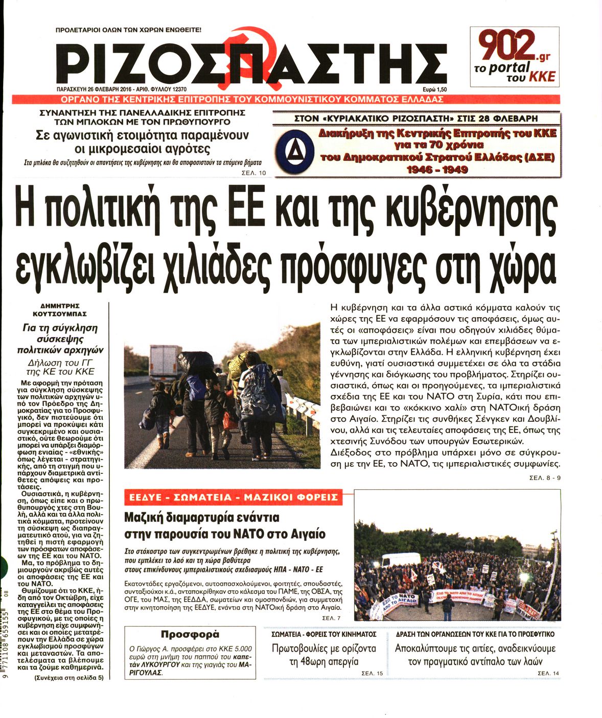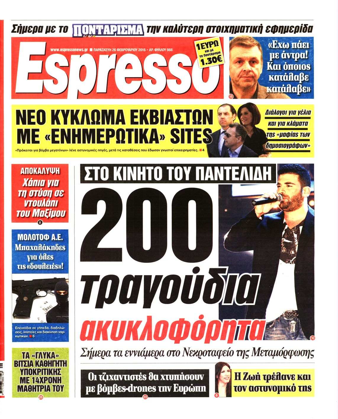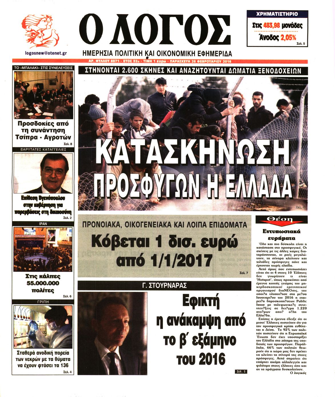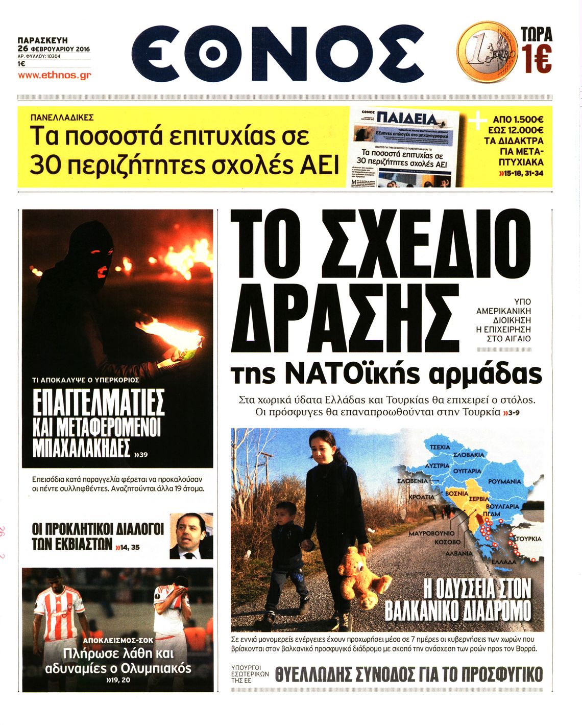 Οι πολιτικές εφημερίδες 26/2/2016 Enikos Newsroom 07:40, Παρασκευή 26 Φεβρουαρίου 2016 Media Διαβάστε τα σημερινά πρωτοσέλιδα των πολιτικών εφημερίδων: ΠΟΛΙΤΙΚΕΣ ΕΦΗΜΕΡΙΔΕΣ ΠΡΩΤΟΣΕΛΙΔΑ Μοιράσου το: σχολίασε κι εσύ (0 σχόλια) Ακολουθήστε το enikos.gr στο Google News και μάθετε πρώτοι όλες τις ειδήσεις Δείτε όλες τις τελευταίες ειδήσεις από την Ελλάδα και τον Κόσμο στο enikos.gr Ειδήσεις Ροή Ειδήσεων 20 λεπτά πριν Χριστούγεννα στα μπλόκα: Επιμένουν στις κινητοποιήσεις τους οι αγρότες – Ανοίγουν τα διόδια το Σαββατοκύριακο 49 λεπτά πριν Τραμπ: Δεν αποκλείει την πιθανότητα ενός πολέμου στη Βενεζουέλα – «Ο Μαδούρο ξέρει καλύτερα από τον καθένα τι ακριβώς θέλω» 43 λεπτά πριν Ουκρανία: Η άνευ προηγουμένου επίθεση σε ρωσικό τάνκερ στη Μεσόγειο και το μήνυμα προς στον Πούτιν – Το «μακρύ χέρι» του Κιέβου 3 ώρες πριν Πούτιν: «Ναι, είμαι ερωτευμένος» – Βίντεο από τη σπάνια προσωπική παραδοχή του 1 ώρα πριν Συνεχίζει να προκαλεί ο Μίτσκοσκι: «Για μένα το όνομα Μακεδονία είναι ιερό» 2 ώρες πριν Αριθμολογία: Οι άνθρωποι που έχουν γεννηθεί αυτές τις 4 ημερομηνίες, συχνά παρεξηγούνται – «Η καλοσύνη τους κρύβει τεράστια δύναμη» 4 ώρες πριν Μήπως έχετε χάσει τον εαυτό σας στη σχέση σας; 7 «αθόρυβες» υποχωρήσεις που μάλλον κάνατε, χωρίς να το συνειδητοποιήσετε 3 ώρες πριν Ξεχάστε το καθάρισμα το Σαββατοκύριακο: Ο «κανόνας των 20 λεπτών» που θα σας λύσει τα χέρια 58 λεπτά πριν Ύπνος: Μια κρυφή κατάσταση του εγκεφάλου πριν από τον ύπνο μπορεί να είναι το “κλειδί” για υψηλή ευφυΐα και δημιουργικότητα 4 λεπτά πριν Νίκος Ξυλούρης: Συγκινεί η χήρα του σπουδαίου καλλιτέχνη – «Ευχαριστώ όλο τον κόσμο που τον κρατάει ζωντανό 45 χρόνια» 10 λεπτά πριν Παναθηναϊκός: «Μέσα» οι Σφιντέρσκι και Τουμπά για το ματς με τον ΠΑΟΚ – Τι έδειξε η μαγνητική του Πάντοβιτς 16 λεπτά πριν Γιώργος Γιαννόπουλος για “Το σόι σου”: “Είναι ευτυχία και ευλογία αυτή η σειρά” 20 λεπτά πριν Χριστούγεννα στα μπλόκα: Επιμένουν στις κινητοποιήσεις τους οι αγρότες – Ανοίγουν τα διόδια το Σαββατοκύριακο 32 λεπτά πριν Χάρι και Μέγκαν: Η σπάνια οικογενειακή φωτογραφία με τον Άρτσι και τη Λίλιμπετ – Τι σχεδιάζουν για τα Χριστούγεννα ENIKOS NETWORK Το ΕΚΑΒ τιμήθηκε από την Ακαδημία Αθηνών για τα 40 χρόνια προσφοράς του Έχετε πραγματικά μεγάλη καρδιά; 10 χαρακτηριστικά όσων έχουν καλοσύνη Πλήρης επάρκεια προϊόντων στις λαϊκές της Αττικής, παρά τις αγροτικές κινητοποιήσεις – Τι απαντούν οι πωλητές ΑΑΔΕ: Νέες αναβαθμίσεις στο Ψηφιακό Πελατολόγιο και την εφαρμογή myDATAapp – Τι πρέπει να γνωρίζετε Χαρτογραφώντας το «σημείο χωρίς επιστροφή»: Για πρώτη φορά αποκαλύπτεται με λεπτομέρεια το ακανθώδες όριο της ατμόσφαιρας τ... Η Google καταργεί τη λειτουργία «dark web report» – Πώς θα μπορούν οι χρήστες να διαγράφουν τα δεδομένα τους περισσότερα 22:42 , Παρασκευή 19 Δεκεμβρίου 2025 Γιώργος Γιαννόπουλος για “Το σόι σου”: “Είναι ευτυχία και ευλογία αυτή η σειρά” «Είναι ευτυχία και ευλογία η συγκυρία αυτής της σειράς», θα πει ο Γιώργος Γιαννόπουλος -ο αγαπ... 20:37 , Παρασκευή 19 Δεκεμβρίου 2025 Don’t Forget The Lyrics: Η Έλλη Κοκκίνου υποδέχεται 4 παίκτες που θα κάνουν τα πάντα για να μη χάσουν ούτε… μισή λέξη από τους στίχους Το «Don’t Forget The Lyrics» επιστρέφει απόψε, Παρασκευή 19 Δεκεμβρίου, στις 21:00 με νέο επει... 19:31 , Παρασκευή 19 Δεκεμβρίου 2025 GNTM: Απόψε ο μεγάλος τελικός για τους 4 φιναλίστ Έπειτα από μήνες γεμάτους μόδα, δημιουργία και έντονες αναμετρήσεις, το GNTM 2025 κορυφώνεται,... 18:11 , Παρασκ