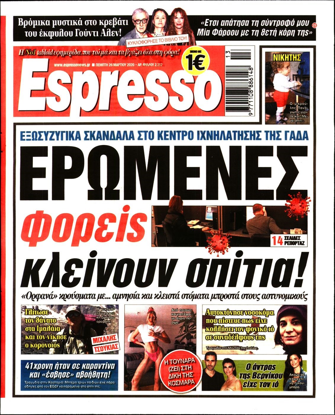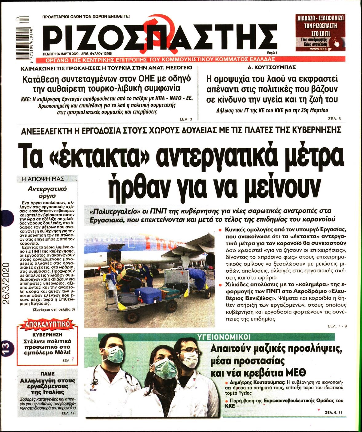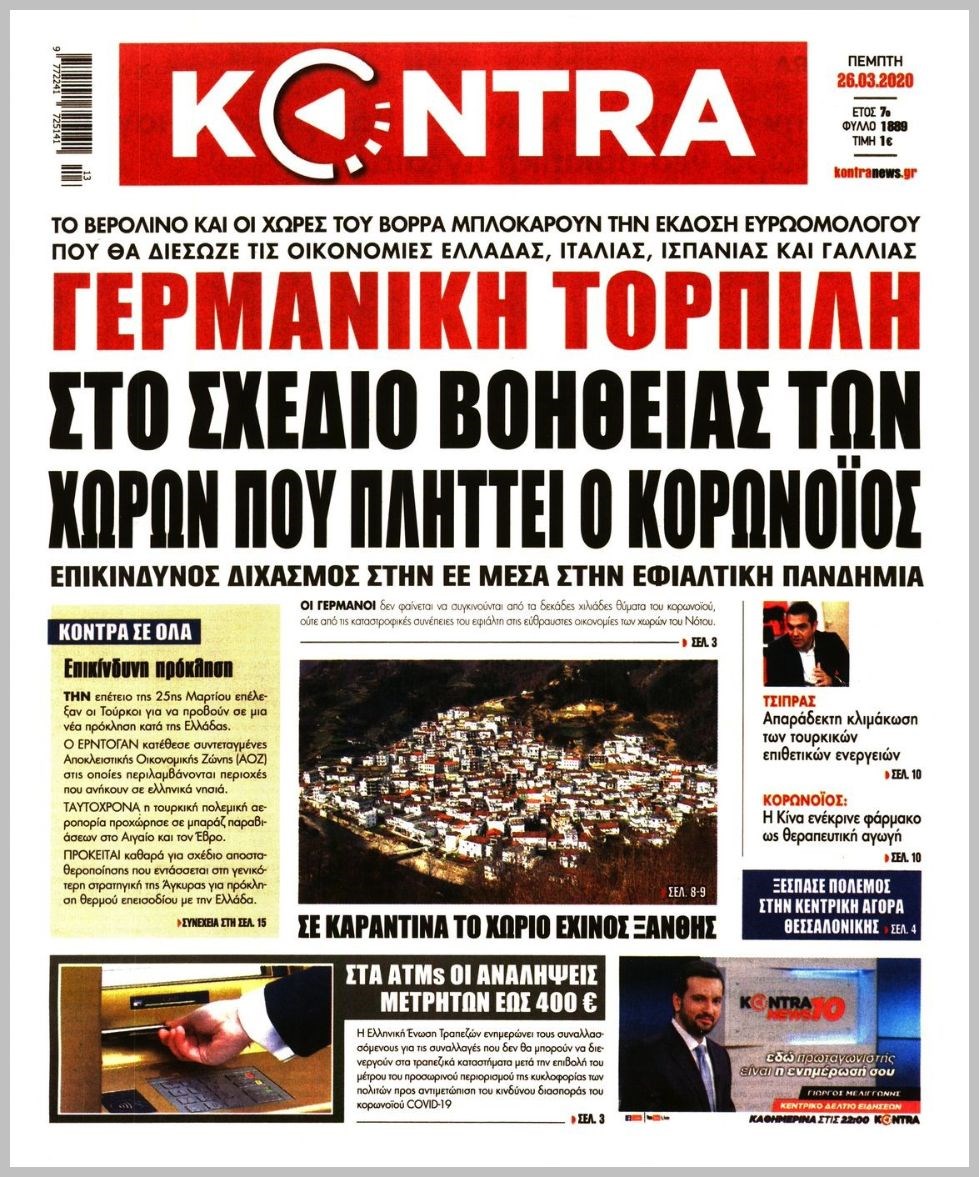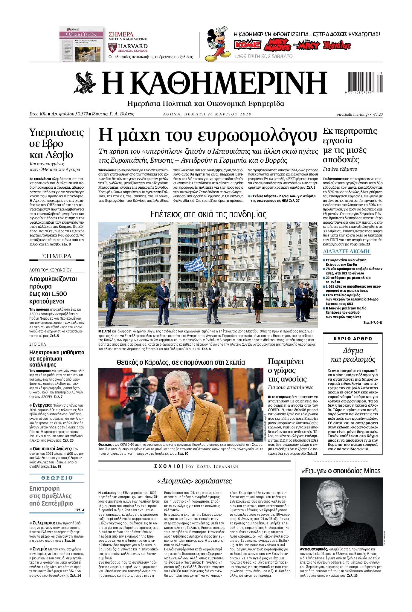 Οι πολιτικές εφημερίδες 26/3/2020 Διονύσης Νίκκας 06:17, Πέμπτη 26 Μαρτίου 2020 Media Διαβάστε τα πρωτοσέλιδα των πολιτικών εφημερίδων… ΠΟΛΙΤΙΚΕΣ ΕΦΗΜΕΡΙΔΕΣ ΠΡΩΤΟΣΕΛΙΔΑ Μοιράσου το: σχολίασε κι εσύ (0 σχόλια) Ακολουθήστε το enikos.gr στο Google News και μάθετε πρώτοι όλες τις ειδήσεις Δείτε όλες τις τελευταίες ειδήσεις από την Ελλάδα και τον Κόσμο στο enikos.gr Ειδήσεις Ροή Ειδήσεων 5 ώρες πριν Χριστούγεννα στα μπλόκα: Επιμένουν στις κινητοποιήσεις τους οι αγρότες – Ανοίγουν τα διόδια το Σαββατοκύριακο 5 ώρες πριν Ουκρανία: Η άνευ προηγουμένου επίθεση σε ρωσικό τάνκερ στη Μεσόγειο και το μήνυμα προς στον Πούτιν – Το «μακρύ χέρι» του Κιέβου 4 ώρες πριν Πούτιν: Τα μηνύματα σε Ευρώπη και ΝΑΤΟ από το μαραθώνιο «σόου» του – Η απαίτηση για «σεβασμό» και η ειρήνη «με τους όρους» της Μόσχας 5 ώρες πριν Τραμπ: Δεν αποκλείει την πιθανότητα ενός πολέμου στη Βενεζουέλα – «Ο Μαδούρο ξέρει καλύτερα από τον καθένα τι ακριβώς θέλω» 6 ώρες πριν Συνεχίζει να προκαλεί ο Μίτσκοσκι: «Για μένα το όνομα Μακεδονία είναι ιερό» 4 ώρες πριν Ανακαλύφθηκαν αρχαία χρυσά νομίσματα 2.200 ετών που απεικονίζουν τον θεό Απόλλωνα – Η άγνωστη σύνδεση με τον Φίλιππο Β΄ της Μακεδονίας 5 ώρες πριν Ύπνος: Μια κρυφή κατάσταση του εγκεφάλου πριν από τον ύπνο μπορεί να είναι το “κλειδί” για υψηλή ευφυΐα και δημιουργικότητα 6 ώρες πριν Αριθμολογία: Οι άνθρωποι που έχουν γεννηθεί αυτές τις 4 ημερομηνίες, συχνά παρεξηγούνται – «Η καλοσύνη τους κρύβει τεράστια δύναμη» 7 ώρες πριν Ξεχάστε το καθάρισμα το Σαββατοκύριακο: Ο «κανόνας των 20 λεπτών» που θα σας λύσει τα χέρια 15 λεπτά πριν Η Ελλάδα προσχωρεί στη Διεθνή Επιτροπή Αποζημιώσεων για την Ουκρανία 30 λεπτά πριν GNTM: Η Ξένια Τσίρκοβα αναδείχθηκε μεγάλη νικήτρια και πήρε τις 50.000 ευρώ – Ποιος βρέθηκε σε απόσταση αναπνοής; 45 λεπτά πριν Θεσσαλονίκη: Εξαφανίστηκε 13χρονος από χώρο φιλοξενίας ασυνόδευτων ανηλίκων στο Ωραιόκαστρο 55 λεπτά πριν Ντόναλντ Τραμπ: «Πολύ βαριά αντίποινα» στη Συρία – «Πλήττουμε πολύ δυνατά οχυρά του Ισλαμικού Κράτους» 1 ώρα πριν Εξάρχεια: Ένταση με μολότοφ, χημικά και κρότου λάμψης ENIKOS NETWORK Το ΕΚΑΒ τιμήθηκε από την Ακαδημία Αθηνών για τα 40 χρόνια προσφοράς του Έχετε πραγματικά μεγάλη καρδιά; 10 χαρακτηριστικά όσων έχουν καλοσύνη Αναστολή μέτρων αναγκαστικής εκτέλεσης για κτηνοτρόφους που πλήττονται από την ευλογιά των αιγοπροβάτων Πλήρης επάρκεια προϊόντων στις λαϊκές της Αττικής, παρά τις αγροτικές κινητοποιήσεις – Τι απαντούν οι πωλητές Χαρτογραφώντας το «σημείο χωρίς επιστροφή»: Για πρώτη φορά αποκαλύπτεται με λεπτομέρεια το ακανθώδες όριο της ατμόσφαιρας τ... Η Google καταργεί τη λειτουργία «dark web report» – Πώς θα μπορούν οι χρήστες να διαγράφουν τα δεδομένα τους περισσότερα 02:50 , Σάββατο 20 Δεκεμβρίου 2025 GNTM: Η Ξένια Τσίρκοβα αναδείχθηκε μεγάλη νικήτρια και πήρε τις 50.000 ευρώ – Ποιος βρέθηκε σε απόσταση αναπνοής; Με φαντασμαγορικό τρόπο ολοκληρώθηκε το βράδυ της Παρασκευής ο μεγάλος τελικός του GNTM, μέσα ... 22:42 , Παρασκευή 19 Δεκεμβρίου 2025 Γιώργος Γιαννόπουλος για “Το σόι σου”: “Είναι ευτυχία και ευλογία αυτή η σειρά” «Είναι ευτυχία και ευλογία η συγκυρία αυτής της σειράς», θα πει ο Γιώργος Γιαννόπουλος -ο αγαπ... 20:37 , Παρασκευή 19 Δεκεμβρίου 2025 Don’t Forget The Lyrics: Η Έλλη Κοκκίνου υποδέχεται 4 παίκτες που θα κάνουν τα πάντα για να μη χάσουν ούτε… μισή λέξη από τους στίχους Το «Don’t Forget The Lyrics» επιστρέφει απόψε, Παρασκευή 19 Δεκεμβρίου, στις 21:00 με νέο