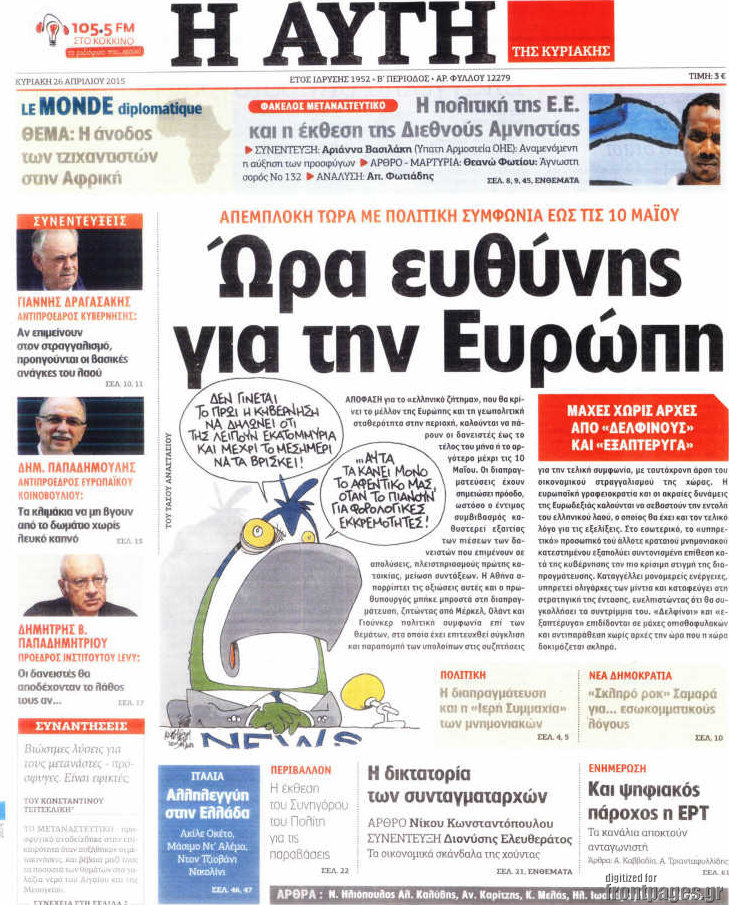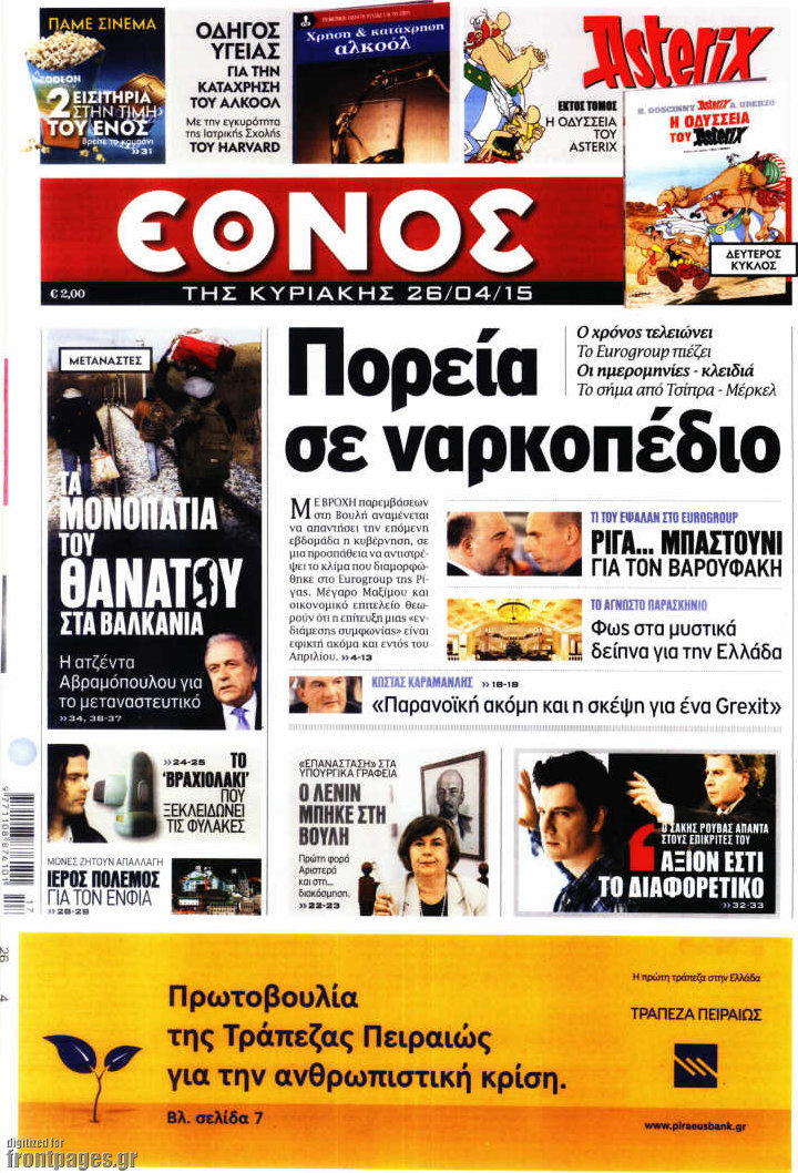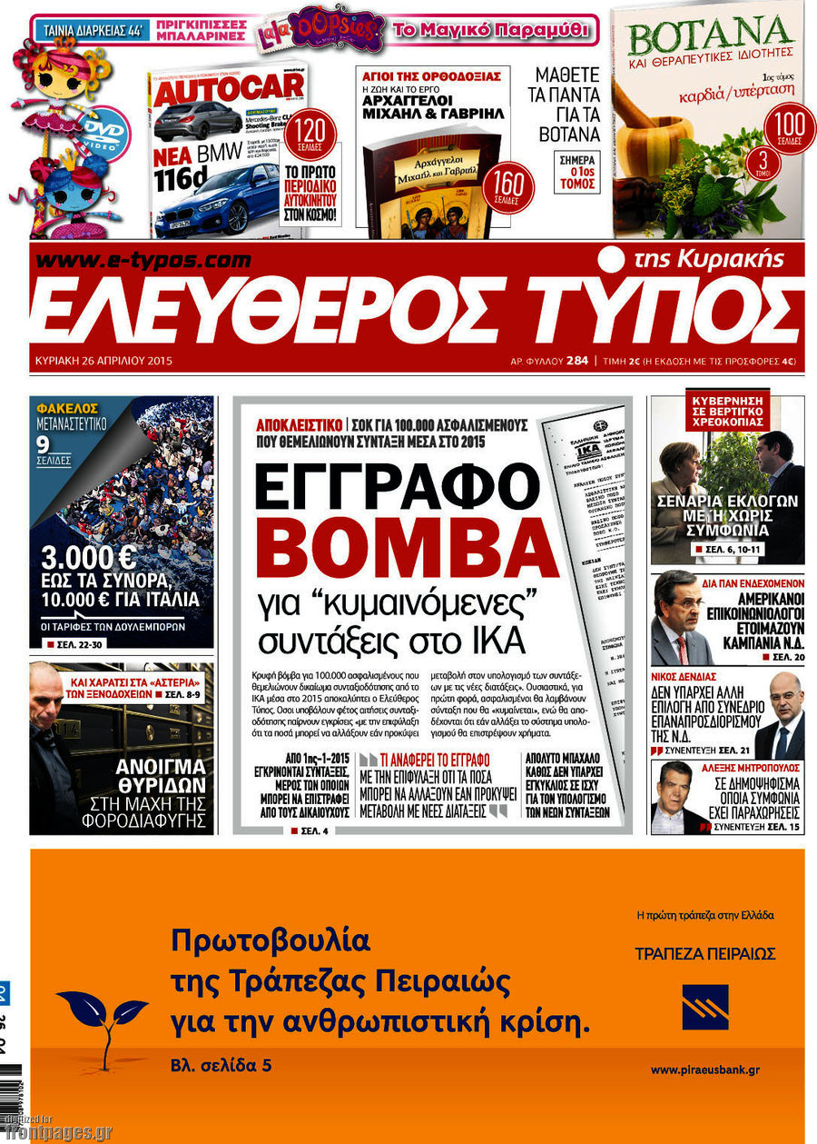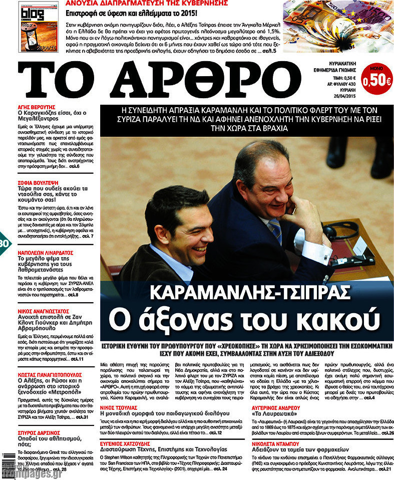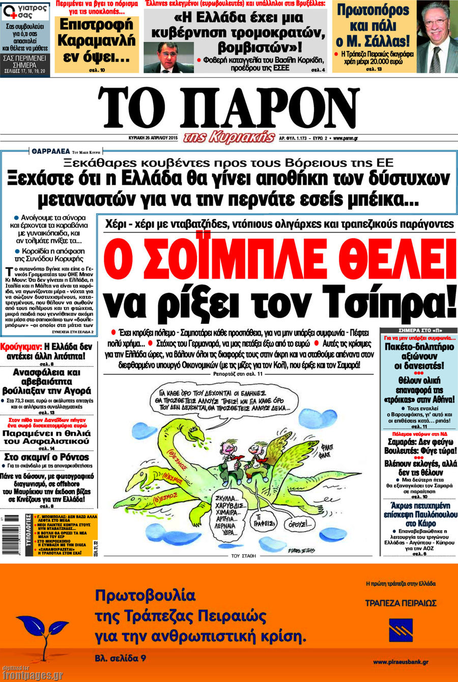 Οι πολιτικές εφημερίδες 26/4/2015 Enikos Newsroom 07:49, Κυριακή 26 Απριλίου 2015 Media Διαβάστε τα σημερινά πρωτοσέλιδα των πολιτικών εφημερίδων… ΟΙ ΠΟΛΙΤΙΚΕΣ ΕΦΗΜΕΡΙΔΕΣ ΠΟΛΙΤΙΚΕΣ ΕΦΗΜΕΡΙΔΕΣ Μοιράσου το: σχολίασε κι εσύ (0 σχόλια) Ακολουθήστε το enikos.gr στο Google News και μάθετε πρώτοι όλες τις ειδήσεις Δείτε όλες τις τελευταίες ειδήσεις από την Ελλάδα και τον Κόσμο στο enikos.gr Ειδήσεις Ροή Ειδήσεων 8 ώρες πριν Μητσοτάκης: Αναγκαία η μεταρρύθμιση του πρωτογενούς τομέα – Τα 6 νέα μέτρα για το στεγαστικό και οι αναφορές σε «Ιθάκη» και «πολιτικούς του καναπέ» 7 ώρες πριν Δάνεια σε ελβετικό φράγκο: Τα βασικά σημεία της ρύθμισης – ανάσας για 40.000 δανειολήπτες – Αναλυτικός οδηγός με ερωτήσεις και απαντήσεις 7 ώρες πριν Κυψέλη: Εξιτήριο πήρε η 14χρονη μαθήτρια που μαχαιρώθηκε από την 16χρονη σε σχολείο – «Θέλω να βοηθήσω το παιδί, έχει μπλέξει με κακές παρέες» 7 ώρες πριν Τραμπ: Γιατί κατέθεσε τώρα την αγωγή κατά του BBC – Πώς η κίνησή του εξυπηρετεί το νέο δόγμα του για «αντίσταση» στην Ευρώπη, υπέρ των συντηρητικών 8 ώρες πριν ΟΠΕΚΕΠΕ – Παράνομες επιδοτήσεις: Ελεύθεροι με περιοριστικούς όρους και οι 7 κατηγορούμενοι που απολογήθηκαν σήμερα 7 ώρες πριν Ανακαλύφθηκε βυθισμένη πέτρινη κατασκευή ανοιχτά της Κριμαίας – Αποτελεί μέρος αρχαίας ελληνικής αποικίας 8 ώρες πριν Ύπνος: Αυτό μπορεί να είναι το χειρότερο λάθος για το βιολογικό ρολόι σας, σύμφωνα με ειδικό 9 ώρες πριν Αριθμολογία: Οι άνθρωποι που έχουν γεννηθεί αυτές τις 3 ημερομηνίες, προσελκύουν μεγάλη τύχη πριν από το τέλος του 2025 11 ώρες πριν Οι 7 συμπεριφορές που μαρτυρούν ότι ένας άνδρας επενδύει μακροπρόθεσμα σε μια σχέση 3 λεπτά πριν Οι πολιτικές εφημερίδες 17/12/2025 11 λεπτά πριν Τα ζώδια σήμερα, Τετάρτη 17 Δεκεμβρίου: Κριοί, η αυτοπεποίθησή σας ενισχύεται 19 λεπτά πριν Εφημερεύοντα φαρμακεία σε Αθήνα και Θεσσαλονίκη (17/12) 24 λεπτά πριν Κόστα Ρίκα: Το Κογκρέσο απέρριψε το αίτημα για άρση της ασυλίας του προέδρου Τσάβες 32 λεπτά πριν Κολομβία: Νεκροί τέσσερις αστυνομικοί σε βομβιστικές επιθέσεις ανταρτών ENIKOS NETWORK Αίτημα ΙΣΑ για την εξαίρεση των προσωπικών γιατρών από τις κατ’ οίκον επισκέψεις Η σκανδιναβική μέθοδος στον ύπνο που μπορεί να σώσει έναν γάμο Πιερρακάκης: Ο προϋπολογισμός συμβάλλει ουσιαστικά στην ενίσχυση της αγοραστικής δύναμης της πλειονότητας των εργαζομένων e-ΕΦΚΑ: Παρατείνεται η προθεσμία για την υποβολή ΑΠΔ – Ποιους αφορά Σύγχρονος Νοστράδαμος: Προειδοποιεί για «μεγάλο γεγονός» τους επόμενους μήνες που θα συγκλονίσει τη Βρετανία και τον κόσμο Τεστ παρατηρητικότητας: Μπορείτε να βρείτε τις 3 διαφορές στις εικόνες με έναν πιγκουίνο σε 14 δευτερόλεπτα περισσότερα 05:38 , Τετάρτη 17 Δεκεμβρίου 2025 Οι πολιτικές εφημερίδες 17/12/2025 Διαβάστε τα πρωτοσέλιδα από τις πολιτικές εφημερίδες, σήμερα 17/12/2025. 20:06 , Τρίτη 16 Δεκεμβρίου 2025 Ο ΣΚΑΙ καταγγέλλει τον ΕΚΚΟΜΕΔ Επιστολή με την οποία καταγράφει την έντονη διαμαρτυρία του προς τον διευθύνοντα σύμβουλο του... 17:40 , Τρίτη 16 Δεκεμβρίου 2025 Eurovision: Στις 4 Ιανουαρίου αποκαλύπτονται τα 28 τραγούδια του ελληνικού τελικού Η αγωνία τελειώνει, η γιορτή της Eurovision αρχίζει στην ΕΡΤ από τις πρώτες ημέρες της νέας χρ... 17:09 , Τρίτη 16 Δεκεμβρίου 2025 Alter Ego Media: Βαθύτατη θλίψη και ειλικρινή συλλυπητήρια για την απώλεια της Ειρήνης Μαρινάκη Τη βαθύτατη θλίψη και τα ειλικρινή συλλυπητήριά της εκφράζει η Alter Ego Media για τον θάνατο ... ΤΕΛΕΥΤΑΙΕΣ ΕΙΔΗΣΕΙΣ 3 λεπτά πριν Οι πολιτικές εφημερίδες 17/12/2025 11