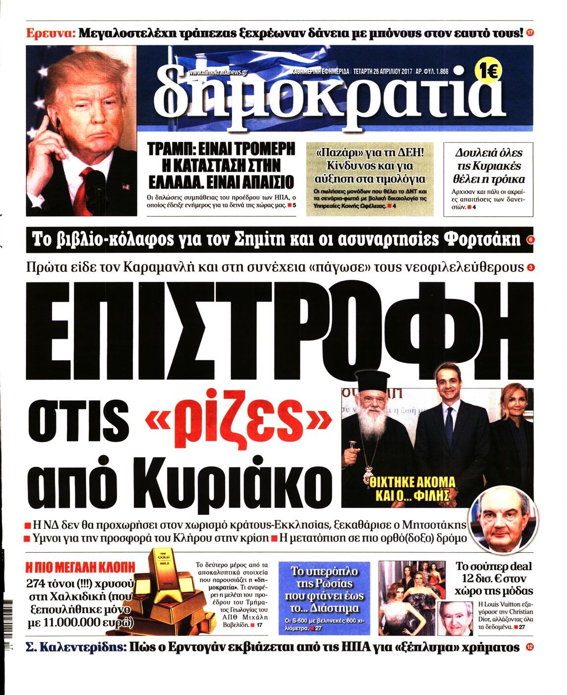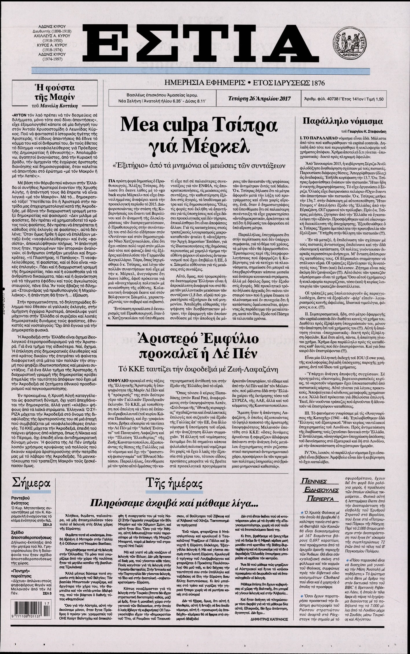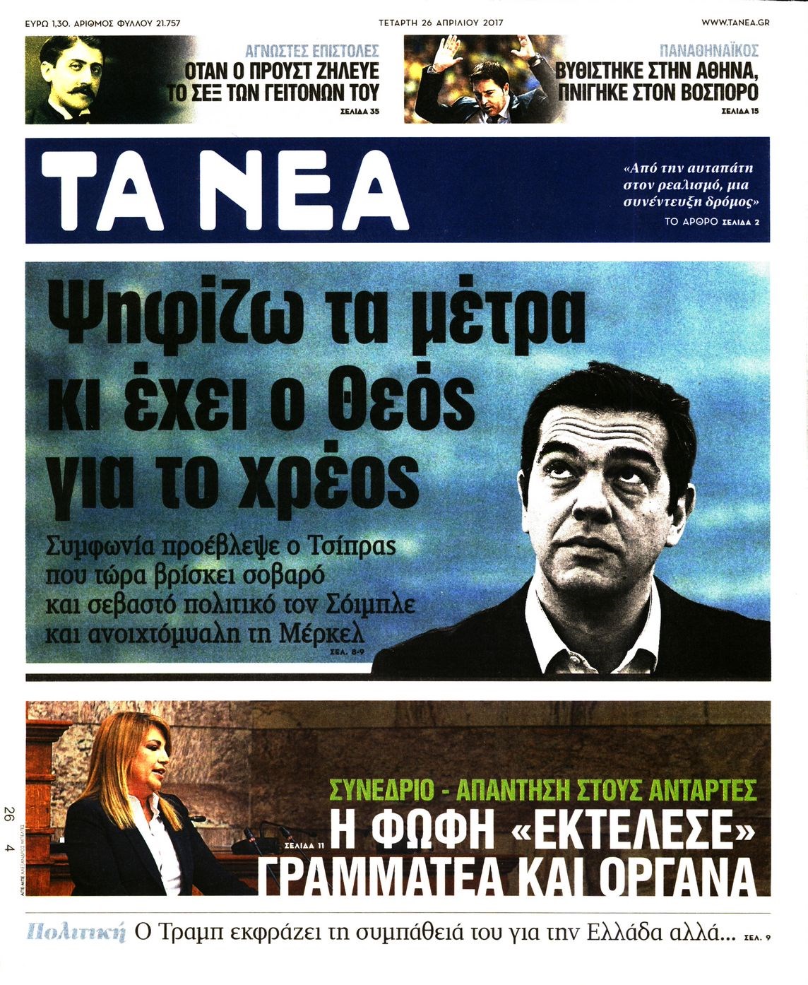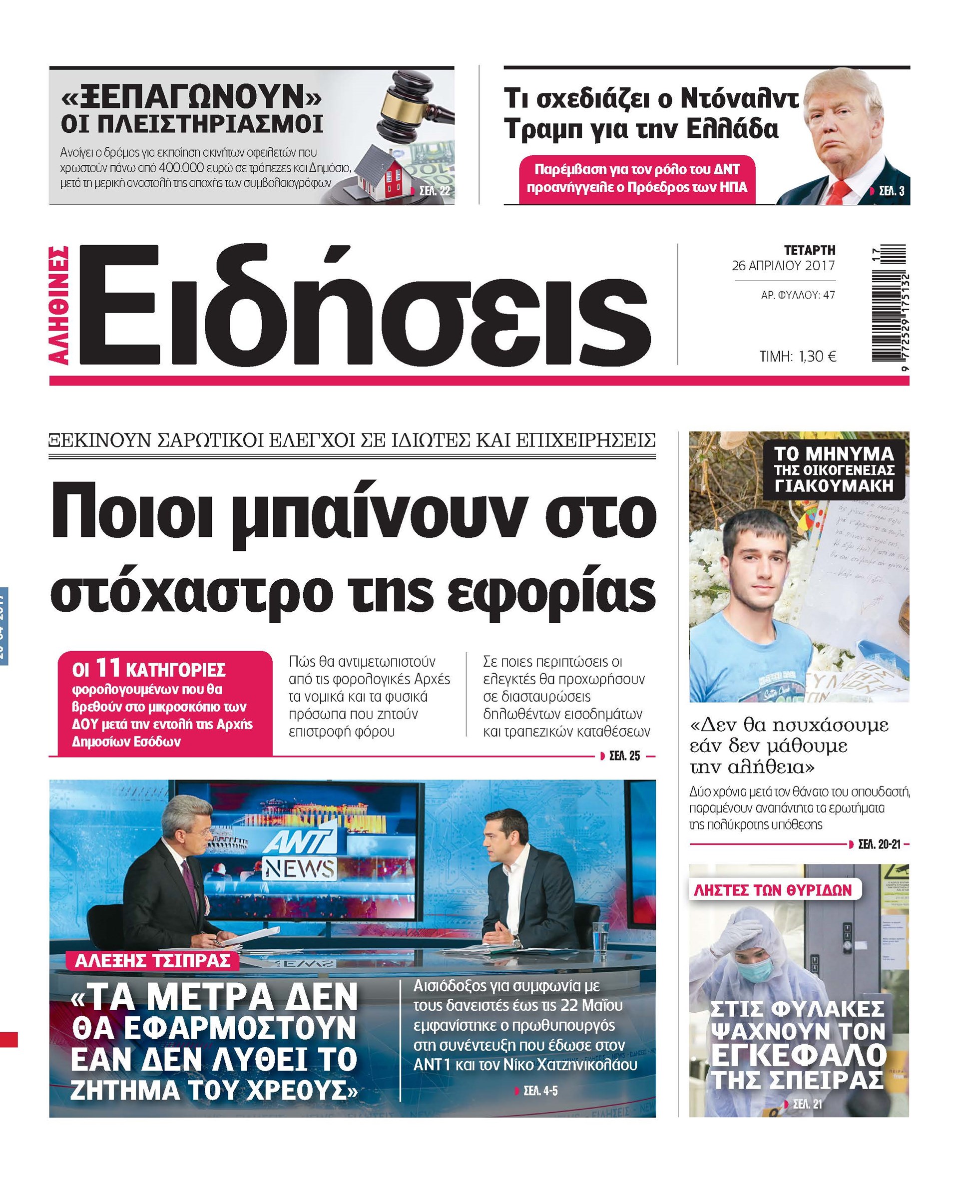 Οι πολιτικές εφημερίδες 26/4/2017 Enikos Newsroom 00:00, Δευτέρα 01 Ιανουαρίου 0001 Media Διαβάστε τα σημερινά πρωτοσέλιδα των πολιτικών εφημερίδων: ΠΟΛΙΤΙΚΕΣ ΕΦΗΜΕΡΙΔΕΣ ΠΡΩΤΟΣΕΛΙΔΑ Μοιράσου το: σχολίασε κι εσύ (0 σχόλια) Ακολουθήστε το enikos.gr στο Google News και μάθετε πρώτοι όλες τις ειδήσεις Δείτε όλες τις τελευταίες ειδήσεις από την Ελλάδα και τον Κόσμο στο enikos.gr Ειδήσεις Ροή Ειδήσεων 5 ώρες πριν Χριστούγεννα στα μπλόκα: Επιμένουν στις κινητοποιήσεις τους οι αγρότες – Ανοίγουν τα διόδια το Σαββατοκύριακο 6 ώρες πριν Ουκρανία: Η άνευ προηγουμένου επίθεση σε ρωσικό τάνκερ στη Μεσόγειο και το μήνυμα προς στον Πούτιν – Το «μακρύ χέρι» του Κιέβου 5 ώρες πριν Πούτιν: Τα μηνύματα σε Ευρώπη και ΝΑΤΟ από το μαραθώνιο «σόου» του – Η απαίτηση για «σεβασμό» και η ειρήνη «με τους όρους» της Μόσχας 6 ώρες πριν Τραμπ: Δεν αποκλείει την πιθανότητα ενός πολέμου στη Βενεζουέλα – «Ο Μαδούρο ξέρει καλύτερα από τον καθένα τι ακριβώς θέλω» 6 ώρες πριν Συνεχίζει να προκαλεί ο Μίτσκοσκι: «Για μένα το όνομα Μακεδονία είναι ιερό» 5 ώρες πριν Ανακαλύφθηκαν αρχαία χρυσά νομίσματα 2.200 ετών που απεικονίζουν τον θεό Απόλλωνα – Η άγνωστη σύνδεση με τον Φίλιππο Β΄ της Μακεδονίας 6 ώρες πριν Ύπνος: Μια κρυφή κατάσταση του εγκεφάλου πριν από τον ύπνο μπορεί να είναι το “κλειδί” για υψηλή ευφυΐα και δημιουργικότητα 7 ώρες πριν Αριθμολογία: Οι άνθρωποι που έχουν γεννηθεί αυτές τις 4 ημερομηνίες, συχνά παρεξηγούνται – «Η καλοσύνη τους κρύβει τεράστια δύναμη» 8 ώρες πριν Ξεχάστε το καθάρισμα το Σαββατοκύριακο: Ο «κανόνας των 20 λεπτών» που θα σας λύσει τα χέρια 5 λεπτά πριν Φως στο Τούνελ: Έφτασε η ώρα της αλήθειας για την δολοφονία της χήρας του πρώην υπουργού στο Κολωνάκι 20 λεπτά πριν Ντόναλντ Τραμπ: Προστέθηκε το όνομά του στην πρόσοψη του Κέντρου Κένεντι – Οργισμένη αντίδραση των συγγενών του JFK 35 λεπτά πριν Ταμίλα Κουλίεβα: «Δεν θέλω να είμαι κάποια που πορεύεται συνεχώς με τις ίδιες αναφορές» 50 λεπτά πριν Η Ελλάδα προσχωρεί στη Διεθνή Επιτροπή Αποζημιώσεων για την Ουκρανία 1 ώρα πριν GNTM: Η Ξένια Τσίρκοβα αναδείχθηκε μεγάλη νικήτρια και πήρε τις 50.000 ευρώ – Ποιος βρέθηκε σε απόσταση αναπνοής; ENIKOS NETWORK Το ΕΚΑΒ τιμήθηκε από την Ακαδημία Αθηνών για τα 40 χρόνια προσφοράς του Έχετε πραγματικά μεγάλη καρδιά; 10 χαρακτηριστικά όσων έχουν καλοσύνη Αναστολή μέτρων αναγκαστικής εκτέλεσης για κτηνοτρόφους που πλήττονται από την ευλογιά των αιγοπροβάτων Πλήρης επάρκεια προϊόντων στις λαϊκές της Αττικής, παρά τις αγροτικές κινητοποιήσεις – Τι απαντούν οι πωλητές Χαρτογραφώντας το «σημείο χωρίς επιστροφή»: Για πρώτη φορά αποκαλύπτεται με λεπτομέρεια το ακανθώδες όριο της ατμόσφαιρας τ... Η Google καταργεί τη λειτουργία «dark web report» – Πώς θα μπορούν οι χρήστες να διαγράφουν τα δεδομένα τους περισσότερα 02:50 , Σάββατο 20 Δεκεμβρίου 2025 GNTM: Η Ξένια Τσίρκοβα αναδείχθηκε μεγάλη νικήτρια και πήρε τις 50.000 ευρώ – Ποιος βρέθηκε σε απόσταση αναπνοής; Με φαντασμαγορικό τρόπο ολοκληρώθηκε το βράδυ της Παρασκευής ο μεγάλος τελικός του GNTM, μέσα ... 22:42 , Παρασκευή 19 Δεκεμβρίου 2025 Γιώργος Γιαννόπουλος για “Το σόι σου”: “Είναι ευτυχία και ευλογία αυτή η σειρά” «Είναι ευτυχία και ευλογία η συγκυρία αυτής της σειράς», θα πει ο Γιώργος Γιαννόπουλος -ο αγαπ... 20:37 , Παρασκευή 19 Δεκεμβρίου 2025 Don’t Forget The Lyrics: Η Έλλη Κοκκίνου υποδέχεται 4 παίκτες που θα κάνουν τα πάντα για να μη χάσουν ούτε… μισή λέξη από τους στίχους Το «Don’t Forget The Lyrics