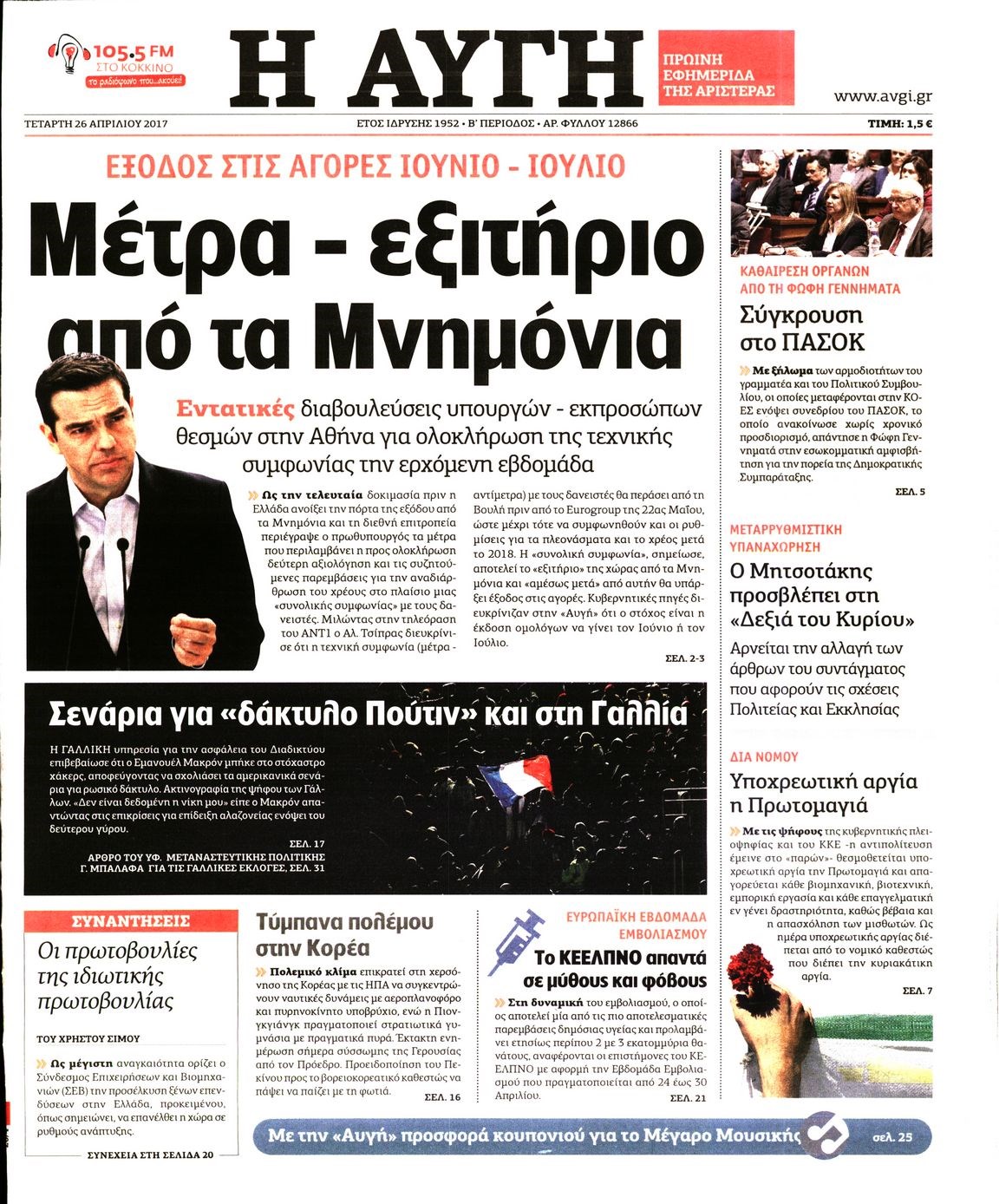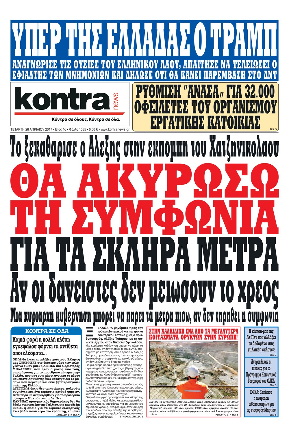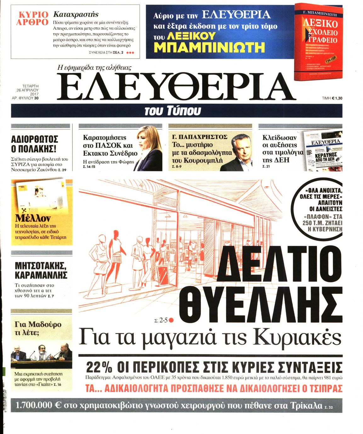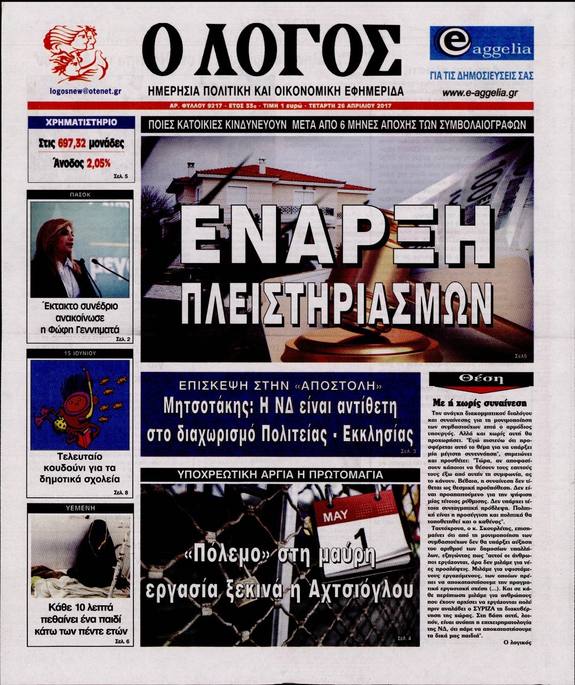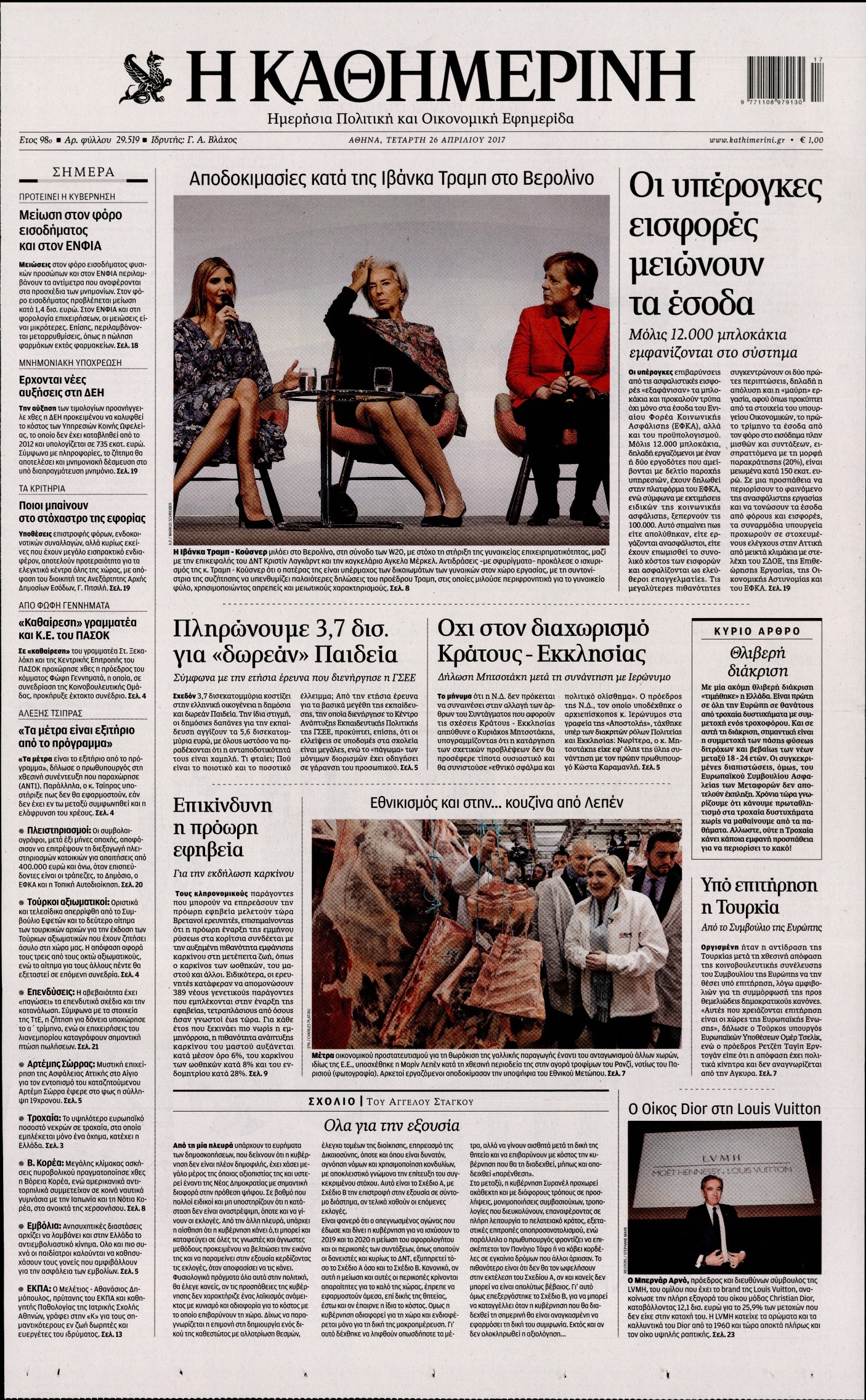 Οι πολιτικές εφημερίδες 26/4/2017 Enikos Newsroom 00:00, Δευτέρα 01 Ιανουαρίου 0001 Media Διαβάστε τα σημερινά πρωτοσέλιδα των πολιτικών εφημερίδων: ΠΟΛΙΤΙΚΕΣ ΕΦΗΜΕΡΙΔΕΣ ΠΡΩΤΟΣΕΛΙΔΑ Μοιράσου το: σχολίασε κι εσύ (0 σχόλια) Ακολουθήστε το enikos.gr στο Google News και μάθετε πρώτοι όλες τις ειδήσεις Δείτε όλες τις τελευταίες ειδήσεις από την Ελλάδα και τον Κόσμο στο enikos.gr Ειδήσεις Ροή Ειδήσεων 5 ώρες πριν Χριστούγεννα στα μπλόκα: Επιμένουν στις κινητοποιήσεις τους οι αγρότες – Ανοίγουν τα διόδια το Σαββατοκύριακο 6 ώρες πριν Ουκρανία: Η άνευ προηγουμένου επίθεση σε ρωσικό τάνκερ στη Μεσόγειο και το μήνυμα προς στον Πούτιν – Το «μακρύ χέρι» του Κιέβου 5 ώρες πριν Πούτιν: Τα μηνύματα σε Ευρώπη και ΝΑΤΟ από το μαραθώνιο «σόου» του – Η απαίτηση για «σεβασμό» και η ειρήνη «με τους όρους» της Μόσχας 6 ώρες πριν Τραμπ: Δεν αποκλείει την πιθανότητα ενός πολέμου στη Βενεζουέλα – «Ο Μαδούρο ξέρει καλύτερα από τον καθένα τι ακριβώς θέλω» 6 ώρες πριν Συνεχίζει να προκαλεί ο Μίτσκοσκι: «Για μένα το όνομα Μακεδονία είναι ιερό» 5 ώρες πριν Ανακαλύφθηκαν αρχαία χρυσά νομίσματα 2.200 ετών που απεικονίζουν τον θεό Απόλλωνα – Η άγνωστη σύνδεση με τον Φίλιππο Β΄ της Μακεδονίας 6 ώρες πριν Ύπνος: Μια κρυφή κατάσταση του εγκεφάλου πριν από τον ύπνο μπορεί να είναι το “κλειδί” για υψηλή ευφυΐα και δημιουργικότητα 7 ώρες πριν Αριθμολογία: Οι άνθρωποι που έχουν γεννηθεί αυτές τις 4 ημερομηνίες, συχνά παρεξηγούνται – «Η καλοσύνη τους κρύβει τεράστια δύναμη» 8 ώρες πριν Ξεχάστε το καθάρισμα το Σαββατοκύριακο: Ο «κανόνας των 20 λεπτών» που θα σας λύσει τα χέρια 5 λεπτά πριν Φως στο Τούνελ: Έφτασε η ώρα της αλήθειας για την δολοφονία της χήρας του πρώην υπουργού στο Κολωνάκι 20 λεπτά πριν Ντόναλντ Τραμπ: Προστέθηκε το όνομά του στην πρόσοψη του Κέντρου Κένεντι – Οργισμένη αντίδραση των συγγενών του JFK 35 λεπτά πριν Ταμίλα Κουλίεβα: «Δεν θέλω να είμαι κάποια που πορεύεται συνεχώς με τις ίδιες αναφορές» 50 λεπτά πριν Η Ελλάδα προσχωρεί στη Διεθνή Επιτροπή Αποζημιώσεων για την Ουκρανία 1 ώρα πριν GNTM: Η Ξένια Τσίρκοβα αναδείχθηκε μεγάλη νικήτρια και πήρε τις 50.000 ευρώ – Ποιος βρέθηκε σε απόσταση αναπνοής; ENIKOS NETWORK Το ΕΚΑΒ τιμήθηκε από την Ακαδημία Αθηνών για τα 40 χρόνια προσφοράς του Έχετε πραγματικά μεγάλη καρδιά; 10 χαρακτηριστικά όσων έχουν καλοσύνη Αναστολή μέτρων αναγκαστικής εκτέλεσης για κτηνοτρόφους που πλήττονται από την ευλογιά των αιγοπροβάτων Πλήρης επάρκεια προϊόντων στις λαϊκές της Αττικής, παρά τις αγροτικές κινητοποιήσεις – Τι απαντούν οι πωλητές Χαρτογραφώντας το «σημείο χωρίς επιστροφή»: Για πρώτη φορά αποκαλύπτεται με λεπτομέρεια το ακανθώδες όριο της ατμόσφαιρας τ... Η Google καταργεί τη λειτουργία «dark web report» – Πώς θα μπορούν οι χρήστες να διαγράφουν τα δεδομένα τους περισσότερα 02:50 , Σάββατο 20 Δεκεμβρίου 2025 GNTM: Η Ξένια Τσίρκοβα αναδείχθηκε μεγάλη νικήτρια και πήρε τις 50.000 ευρώ – Ποιος βρέθηκε σε απόσταση αναπνοής; Με φαντασμαγορικό τρόπο ολοκληρώθηκε το βράδυ της Παρασκευής ο μεγάλος τελικός του GNTM, μέσα ... 22:42 , Παρασκευή 19 Δεκεμβρίου 2025 Γιώργος Γιαννόπουλος για “Το σόι σου”: “Είναι ευτυχία και ευλογία αυτή η σειρά” «Είναι ευτυχία και ευλογία η συγκυρία αυτής της σειράς», θα πει ο Γιώργος Γιαννόπουλος -ο αγαπ... 20:37 , Παρασκευή 19 Δεκεμβρίου 2025 Don’t Forget The Lyrics: Η Έλλη Κοκκίνου υποδέχεται 4 παίκτες που θα κάνουν τα πάντα για να μη χάσουν ούτε… μισή λέξη από τους στίχους Το «Don’t Forget The Lyrics