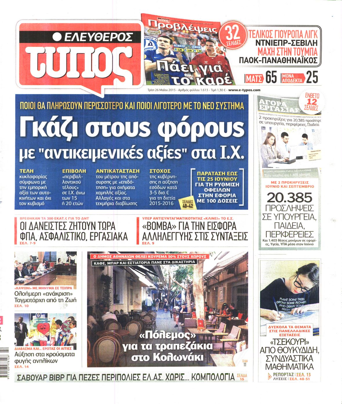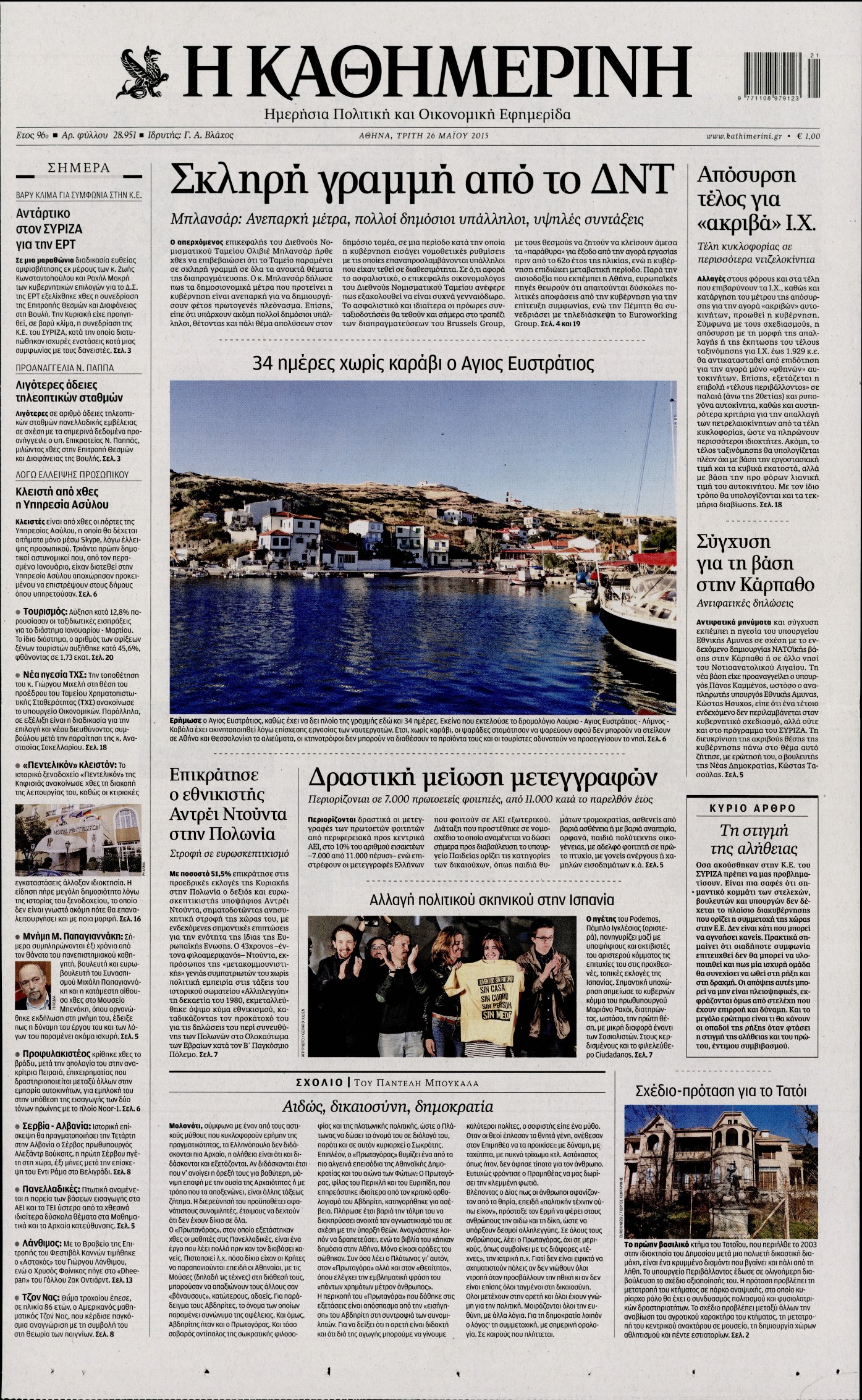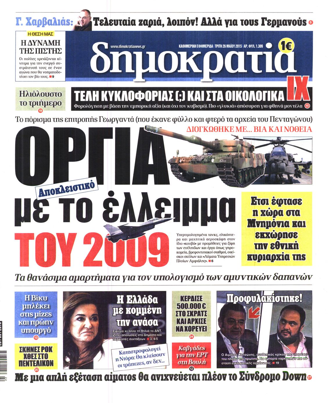 Οι πολιτικές εφημερίδες 26/5/2015 Enikos Newsroom 06:54, Τρίτη 26 Μαΐου 2015 Media Διαβάστε τα σημερινά πρωτοσέλιδα των πολιτικών εφημερίδων: ΠΟΛΙΤΙΚΕΣ ΕΦΗΜΕΡΙΔΕΣ ΠΡΩΤΟΣΕΛΙΔΑ Μοιράσου το: σχολίασε κι εσύ (0 σχόλια) Ακολουθήστε το enikos.gr στο Google News και μάθετε πρώτοι όλες τις ειδήσεις Δείτε όλες τις τελευταίες ειδήσεις από την Ελλάδα και τον Κόσμο στο enikos.gr Ειδήσεις Ροή Ειδήσεων 2 ώρες πριν Μπλόκα: Οι αγρότες σηκώνουν τις μπάρες σε διόδια για τους εκδρομείς των Χριστουγέννων και μοιράζουν προϊόντα – Βίντεο 2 ώρες πριν Τσιάρας προς αγρότες: Τα μπλόκα και τα πείσματα δεν ωφελούν – Οι λύσεις περνούν μέσα από τον διάλογο 3 ώρες πριν Αρχεία Έπσταϊν: Οι συγκλονιστικές φωτογραφίες – Ο Μάικλ Τζάκσον, ο Μικ Τζάγκερ και ο Κέβιν Σπέισι ανάμεσα στους διάσημους που απεικονίζονται 54 λεπτά πριν Μαθητές διακινούσαν κοκαΐνη και χασίς σε σχολείο της Αττικής – 12 συλλήψεις 59 λεπτά πριν Βέλγιο: Άγνωστοι έριξαν κόκκινη μπογιά στο προξενείο της Πολωνίας στις Βρυξέλλες 5 ώρες πριν Μία νέα «χρυσή» περίοδος αρχίζει για 3 ζώδια από σήμερα – «Μία αναπάντεχη ευκαιρία οδηγεί στην επιτυχία» 3 ώρες πριν Διαιτολόγος αποκαλύπτει 9 πρωινές συνήθειες που «λιώνουν» το κοιλιακό λίπος – «Υποστηρίζουν την υγιεινή απώλεια βάρους» 4 ώρες πριν Οι 7 φράσεις που δεν λένε ποτέ οι συναισθηματικά έξυπνοι άνθρωποι κατά τη διάρκεια ενός καβγά 6 ώρες πριν Enerwave: Το νέο «ρεύμα» στη λιανική ενέργειας που αλλάζει την εμπειρία του καταναλωτή 2 λεπτά πριν Μαρινάκης στον Realfm 97,8: Η κυβέρνηση σέβεται κάθε λογική διεκδίκηση των αγροτών, αλλά και το αίτημα των πολιτών να μην ταλαιπωρούνται 9 λεπτά πριν O Πάντερ MVP της 17ης αγωνιστικής στην Euroleague 17 λεπτά πριν Πέθανε η τραγουδίστρια Κλαούντια Ντελμέρ 25 λεπτά πριν Μία ανεκμετάλλευτη πηγή θα μπορούσε να προσφέρει ανεξάντλητη ενέργεια – Οι επιστήμονες ίσως γνωρίζουν πώς να την ξεκλειδώσουν 33 λεπτά πριν Θεσσαλονίκη: Ανήλικος που είχε εξαφανιστεί βρέθηκε στο σπίτι Τούρκων μετά από αστυνομική επιχείρηση ENIKOS NETWORK Η αποχή από την αναπαραγωγή παρατείνει τη ζωή στα ζώα, σύμφωνα με μελέτη – Τι ισχύει για τους ανθρώπους; Σημαντικές επαφές στις ΗΠΑ είχε ο υπουργός Υγείας Άδωνις Γεωργιάδης Ευλογιά αιγοπροβάτων: Παρατεταμένη επιζωοτία, αυστηρά μέτρα – Τι ισχύει για τον εμβολιασμό και την ανασύσταση του ζωικού κε... Τσιάρας προς αγρότες: Έχει ικανοποιηθεί το 74% των αιτημάτων – Τα μπλόκα και τα πείσματα δεν ωφελούν Χαρτογραφώντας το «σημείο χωρίς επιστροφή»: Για πρώτη φορά αποκαλύπτεται με λεπτομέρεια το ακανθώδες όριο της ατμόσφαιρας τ... Η Google καταργεί τη λειτουργία «dark web report» – Πώς θα μπορούν οι χρήστες να διαγράφουν τα δεδομένα τους περισσότερα 14:04 , Σάββατο 20 Δεκεμβρίου 2025 Η Realnews αυτής της Κυριακής (21/12/2025) Με τίτλο: «Ασπίδα προστασίας για την Ελλάδα» κυκλοφορεί, αυτήν την Κυριακή, η Realnews. Σημαντ... 12:53 , Σάββατο 20 Δεκεμβρίου 2025 Να μ’ αγαπάς: Το παρελθόν έρχεται στο φως – Καταιγιστικές εξελίξεις στα τελευταία επεισόδια του 2025 Ο Άγγελος αποκαλύπτεται, η Φωτεινή ανησυχεί για τον Λευτέρη και η Ζωή έρχεται αντιμέτωπη με το... 11:41 , Σάββατο 20 Δεκεμβρίου 2025 «Η αγάπη δεν χάνεται ποτέ»: Η μικρού μήκους ταινία κινουμένων σχεδίων που θέτει ερωτήματα για τη ζωή και τον θάνατο Ο θάνατος είναι ένα από τα πιο σκληρά θέματα που καλείται να διαχειριστεί κάποιος στη διάρκεια... 09:30 , Σάββατο 20 Δεκεμβρίου 2025 «Porto Leone: Στη γειτονιά με τα κόκκινα φανάρια» – Ο Χρόνης αποκαλύπτει στην Αλεξάνδρα το μυστικό γι