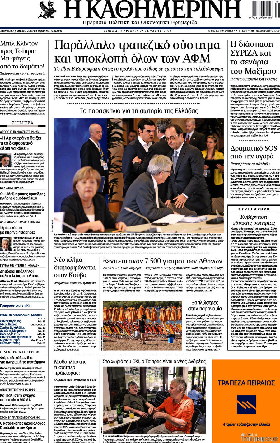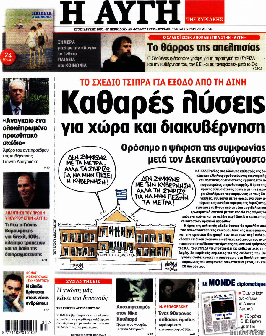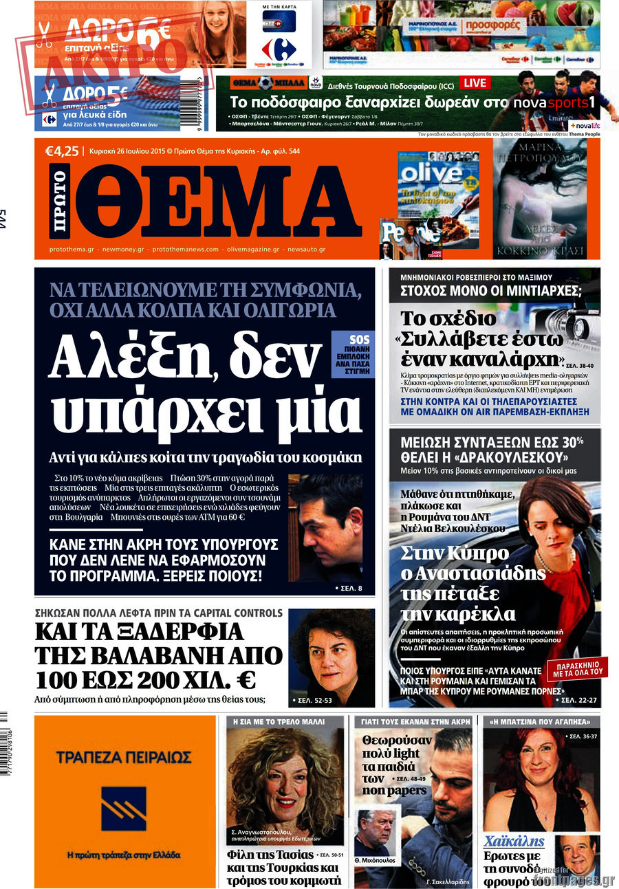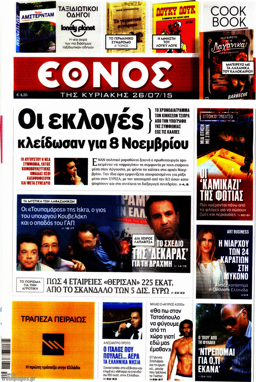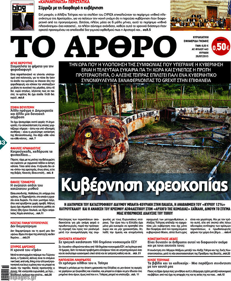 Οι πολιτικές εφημερίδες 26/7/2015 Enikos Newsroom 08:26, Κυριακή 26 Ιουλίου 2015 Media Διαβάστε τα σημερινά πρωτοσέλιδα των πολιτικών εφημερίδων. ΕΦΗΜΕΡΙΔΕΣ ΠΟΛΙΤΙΚΕΣ ΕΦΗΜΕΡΙΔΕΣ ΠΡΩΤΟΣΕΛΙΔΑ Μοιράσου το: σχολίασε κι εσύ (0 σχόλια) Ακολουθήστε το enikos.gr στο Google News και μάθετε πρώτοι όλες τις ειδήσεις Δείτε όλες τις τελευταίες ειδήσεις από την Ελλάδα και τον Κόσμο στο enikos.gr Ειδήσεις Ροή Ειδήσεων 4 ώρες πριν Χριστούγεννα στα μπλόκα: Επιμένουν στις κινητοποιήσεις τους οι αγρότες – Ανοίγουν τα διόδια το Σαββατοκύριακο 5 ώρες πριν Ουκρανία: Η άνευ προηγουμένου επίθεση σε ρωσικό τάνκερ στη Μεσόγειο και το μήνυμα προς στον Πούτιν – Το «μακρύ χέρι» του Κιέβου 4 ώρες πριν Πούτιν: Τα μηνύματα σε Ευρώπη και ΝΑΤΟ από το μαραθώνιο «σόου» του – Η απαίτηση για «σεβασμό» και η ειρήνη «με τους όρους» της Μόσχας 5 ώρες πριν Τραμπ: Δεν αποκλείει την πιθανότητα ενός πολέμου στη Βενεζουέλα – «Ο Μαδούρο ξέρει καλύτερα από τον καθένα τι ακριβώς θέλω» 5 ώρες πριν Συνεχίζει να προκαλεί ο Μίτσκοσκι: «Για μένα το όνομα Μακεδονία είναι ιερό» 4 ώρες πριν Ανακαλύφθηκαν αρχαία χρυσά νομίσματα 2.200 ετών που απεικονίζουν τον θεό Απόλλωνα – Η άγνωστη σύνδεση με τον Φίλιππο Β΄ της Μακεδονίας 5 ώρες πριν Ύπνος: Μια κρυφή κατάσταση του εγκεφάλου πριν από τον ύπνο μπορεί να είναι το “κλειδί” για υψηλή ευφυΐα και δημιουργικότητα 6 ώρες πριν Αριθμολογία: Οι άνθρωποι που έχουν γεννηθεί αυτές τις 4 ημερομηνίες, συχνά παρεξηγούνται – «Η καλοσύνη τους κρύβει τεράστια δύναμη» 7 ώρες πριν Ξεχάστε το καθάρισμα το Σαββατοκύριακο: Ο «κανόνας των 20 λεπτών» που θα σας λύσει τα χέρια 17 λεπτά πριν Θεσσαλονίκη: Εξαφανίστηκε 13χρονος από χώρο φιλοξενίας ασυνόδευτων ανηλίκων στο Ωραιόκαστρο 28 λεπτά πριν Ντόναλντ Τραμπ: «Πολύ βαριά αντίποινα» στη Συρία – «Πλήττουμε πολύ δυνατά οχυρά του Ισλαμικού Κράτους» 43 λεπτά πριν Εξάρχεια: Ένταση με μολότοφ, χημικά και κρότου λάμψης 58 λεπτά πριν ΗΠΑ: Τραγωδία στην Αλαμπάμα – Σκότωσε την δημοσιογράφο σύζυγό του και αυτοκτόνησε μπροστά στον 3χρονο γιο τους 1 ώρα πριν Πρόταση γάμου στο ΣΕΦ κατά την διάρκεια του αγώνα Ολυμπιακός-Βιλερμπάν – Δείτε βίντεο ENIKOS NETWORK Το ΕΚΑΒ τιμήθηκε από την Ακαδημία Αθηνών για τα 40 χρόνια προσφοράς του Έχετε πραγματικά μεγάλη καρδιά; 10 χαρακτηριστικά όσων έχουν καλοσύνη Αναστολή μέτρων αναγκαστικής εκτέλεσης για κτηνοτρόφους που πλήττονται από την ευλογιά των αιγοπροβάτων Πλήρης επάρκεια προϊόντων στις λαϊκές της Αττικής, παρά τις αγροτικές κινητοποιήσεις – Τι απαντούν οι πωλητές Χαρτογραφώντας το «σημείο χωρίς επιστροφή»: Για πρώτη φορά αποκαλύπτεται με λεπτομέρεια το ακανθώδες όριο της ατμόσφαιρας τ... Η Google καταργεί τη λειτουργία «dark web report» – Πώς θα μπορούν οι χρήστες να διαγράφουν τα δεδομένα τους περισσότερα 22:42 , Παρασκευή 19 Δεκεμβρίου 2025 Γιώργος Γιαννόπουλος για “Το σόι σου”: “Είναι ευτυχία και ευλογία αυτή η σειρά” «Είναι ευτυχία και ευλογία η συγκυρία αυτής της σειράς», θα πει ο Γιώργος Γιαννόπουλος -ο αγαπ... 20:37 , Παρασκευή 19 Δεκεμβρίου 2025 Don’t Forget The Lyrics: Η Έλλη Κοκκίνου υποδέχεται 4 παίκτες που θα κάνουν τα πάντα για να μη χάσουν ούτε… μισή λέξη από τους στίχους Το «Don’t Forget The Lyrics» επιστρέφει απόψε, Παρασκευή 19 Δεκεμβρίου, στις 21:00 με νέο επει... 19:31 , Παρασκευή 19 Δεκεμβρίου 2025 GNTM: Απόψε ο μεγάλος τελικός για τους 4 φιναλίστ Έπειτα από μήνες γεμάτους μόδα, δημιουργία και έντονες αναμετρήσεις, το GNTM 2025 κορυφώνεται,... 18:11 , Παρασκευή 19 Δεκεμ