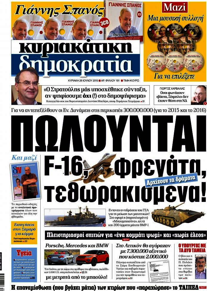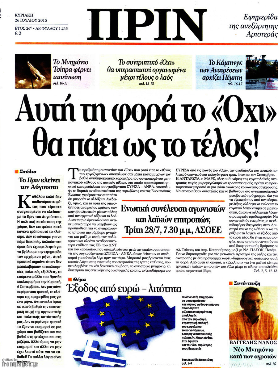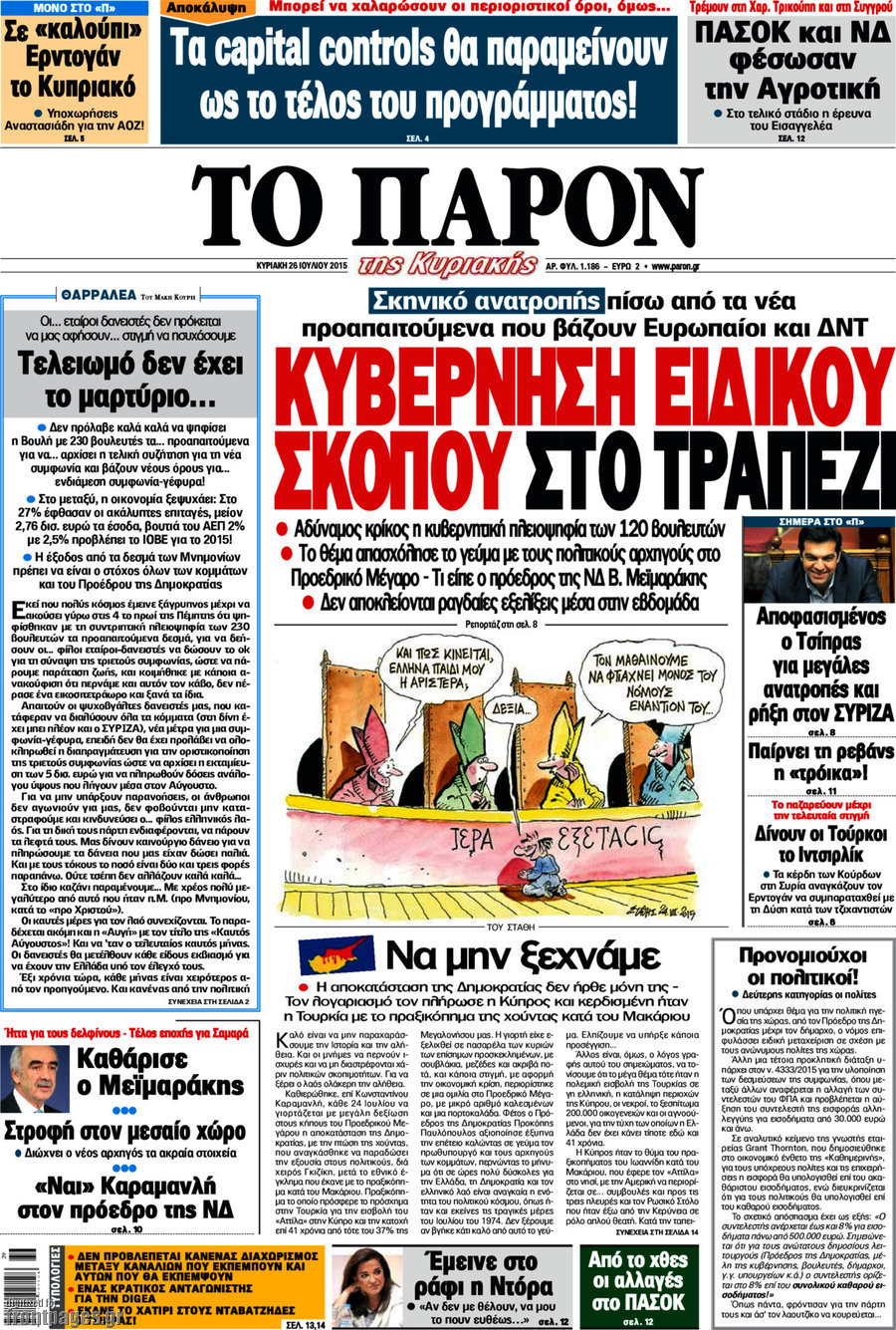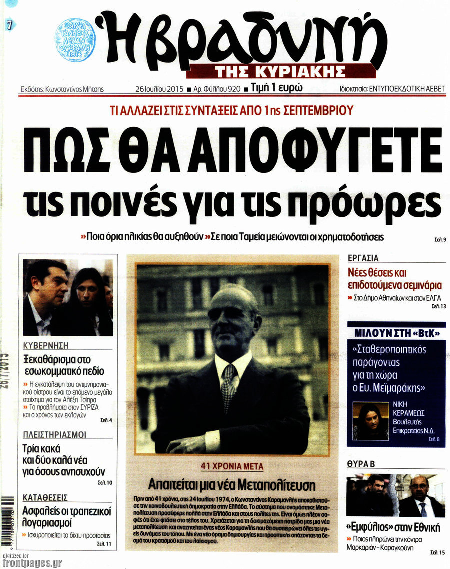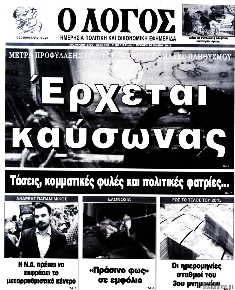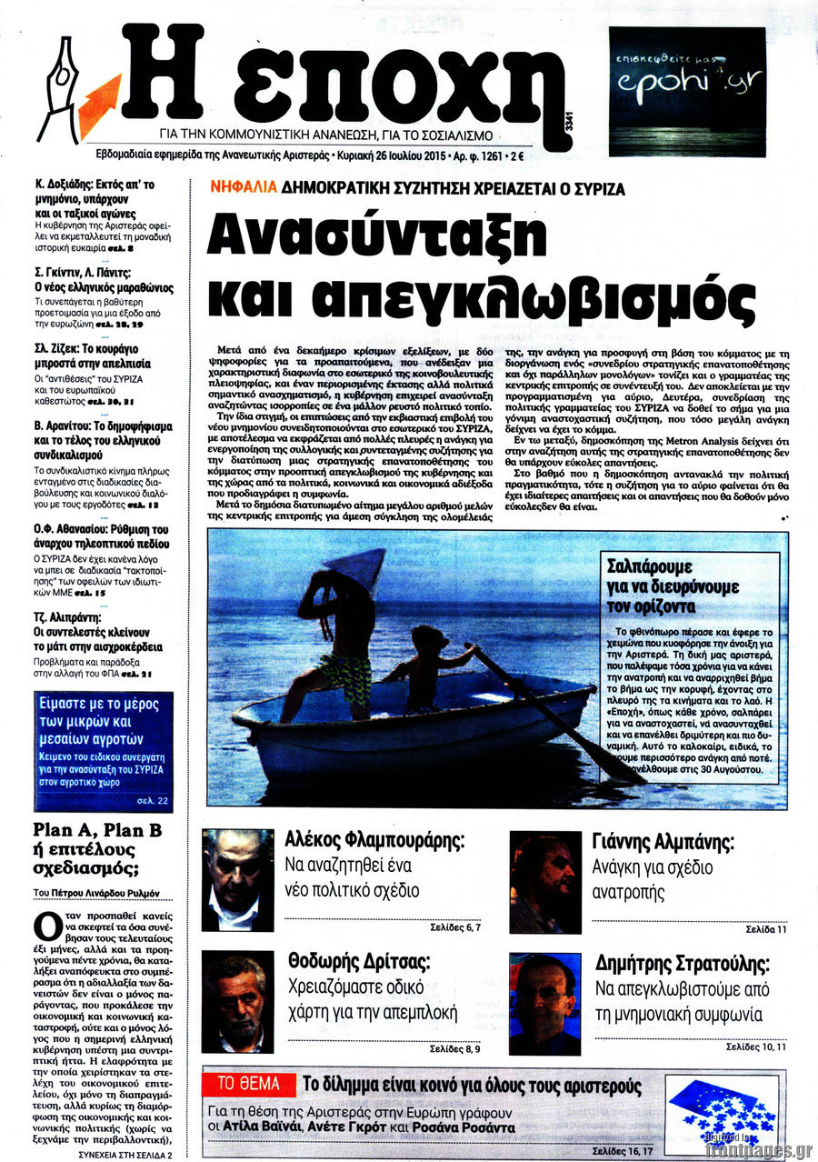 Οι πολιτικές εφημερίδες 26/7/2015 Enikos Newsroom 08:26, Κυριακή 26 Ιουλίου 2015 Media Διαβάστε τα σημερινά πρωτοσέλιδα των πολιτικών εφημερίδων. ΕΦΗΜΕΡΙΔΕΣ ΠΟΛΙΤΙΚΕΣ ΕΦΗΜΕΡΙΔΕΣ ΠΡΩΤΟΣΕΛΙΔΑ Μοιράσου το: σχολίασε κι εσύ (0 σχόλια) Ακολουθήστε το enikos.gr στο Google News και μάθετε πρώτοι όλες τις ειδήσεις Δείτε όλες τις τελευταίες ειδήσεις από την Ελλάδα και τον Κόσμο στο enikos.gr Ειδήσεις Ροή Ειδήσεων 4 ώρες πριν Χριστούγεννα στα μπλόκα: Επιμένουν στις κινητοποιήσεις τους οι αγρότες – Ανοίγουν τα διόδια το Σαββατοκύριακο 5 ώρες πριν Ουκρανία: Η άνευ προηγουμένου επίθεση σε ρωσικό τάνκερ στη Μεσόγειο και το μήνυμα προς στον Πούτιν – Το «μακρύ χέρι» του Κιέβου 4 ώρες πριν Πούτιν: Τα μηνύματα σε Ευρώπη και ΝΑΤΟ από το μαραθώνιο «σόου» του – Η απαίτηση για «σεβασμό» και η ειρήνη «με τους όρους» της Μόσχας 5 ώρες πριν Τραμπ: Δεν αποκλείει την πιθανότητα ενός πολέμου στη Βενεζουέλα – «Ο Μαδούρο ξέρει καλύτερα από τον καθένα τι ακριβώς θέλω» 5 ώρες πριν Συνεχίζει να προκαλεί ο Μίτσκοσκι: «Για μένα το όνομα Μακεδονία είναι ιερό» 4 ώρες πριν Ανακαλύφθηκαν αρχαία χρυσά νομίσματα 2.200 ετών που απεικονίζουν τον θεό Απόλλωνα – Η άγνωστη σύνδεση με τον Φίλιππο Β΄ της Μακεδονίας 5 ώρες πριν Ύπνος: Μια κρυφή κατάσταση του εγκεφάλου πριν από τον ύπνο μπορεί να είναι το “κλειδί” για υψηλή ευφυΐα και δημιουργικότητα 6 ώρες πριν Αριθμολογία: Οι άνθρωποι που έχουν γεννηθεί αυτές τις 4 ημερομηνίες, συχνά παρεξηγούνται – «Η καλοσύνη τους κρύβει τεράστια δύναμη» 7 ώρες πριν Ξεχάστε το καθάρισμα το Σαββατοκύριακο: Ο «κανόνας των 20 λεπτών» που θα σας λύσει τα χέρια 17 λεπτά πριν Θεσσαλονίκη: Εξαφανίστηκε 13χρονος από χώρο φιλοξενίας ασυνόδευτων ανηλίκων στο Ωραιόκαστρο 28 λεπτά πριν Ντόναλντ Τραμπ: «Πολύ βαριά αντίποινα» στη Συρία – «Πλήττουμε πολύ δυνατά οχυρά του Ισλαμικού Κράτους» 43 λεπτά πριν Εξάρχεια: Ένταση με μολότοφ, χημικά και κρότου λάμψης 58 λεπτά πριν ΗΠΑ: Τραγωδία στην Αλαμπάμα – Σκότωσε την δημοσιογράφο σύζυγό του και αυτοκτόνησε μπροστά στον 3χρονο γιο τους 1 ώρα πριν Πρόταση γάμου στο ΣΕΦ κατά την διάρκεια του αγώνα Ολυμπιακός-Βιλερμπάν – Δείτε βίντεο ENIKOS NETWORK Το ΕΚΑΒ τιμήθηκε από την Ακαδημία Αθηνών για τα 40 χρόνια προσφοράς του Έχετε πραγματικά μεγάλη καρδιά; 10 χαρακτηριστικά όσων έχουν καλοσύνη Αναστολή μέτρων αναγκαστικής εκτέλεσης για κτηνοτρόφους που πλήττονται από την ευλογιά των αιγοπροβάτων Πλήρης επάρκεια προϊόντων στις λαϊκές της Αττικής, παρά τις αγροτικές κινητοποιήσεις – Τι απαντούν οι πωλητές Χαρτογραφώντας το «σημείο χωρίς επιστροφή»: Για πρώτη φορά αποκαλύπτεται με λεπτομέρεια το ακανθώδες όριο της ατμόσφαιρας τ... Η Google καταργεί τη λειτουργία «dark web report» – Πώς θα μπορούν οι χρήστες να διαγράφουν τα δεδομένα τους περισσότερα 22:42 , Παρασκευή 19 Δεκεμβρίου 2025 Γιώργος Γιαννόπουλος για “Το σόι σου”: “Είναι ευτυχία και ευλογία αυτή η σειρά” «Είναι ευτυχία και ευλογία η συγκυρία αυτής της σειράς», θα πει ο Γιώργος Γιαννόπουλος -ο αγαπ... 20:37 , Παρασκευή 19 Δεκεμβρίου 2025 Don’t Forget The Lyrics: Η Έλλη Κοκκίνου υποδέχεται 4 παίκτες που θα κάνουν τα πάντα για να μη χάσουν ούτε… μισή λέξη από τους στίχους Το «Don’t Forget The Lyrics» επιστρέφει απόψε, Παρασκευή 19 Δεκεμβρίου, στις 21:00 με νέο επει... 19:31 , Παρασκευή 19 Δεκεμβρίου 2025 GNTM: Απόψε ο μεγάλος τελικός για τους 4 φιναλίστ Έπειτα από μήνες γεμάτους μόδα, δημιουργία και έντονες αναμετρήσεις, το GNTM 2025 κορυφώνεται,... 18:11 , Παρασκευή 19 Δεκεμ