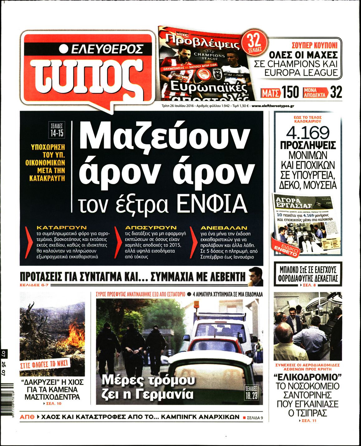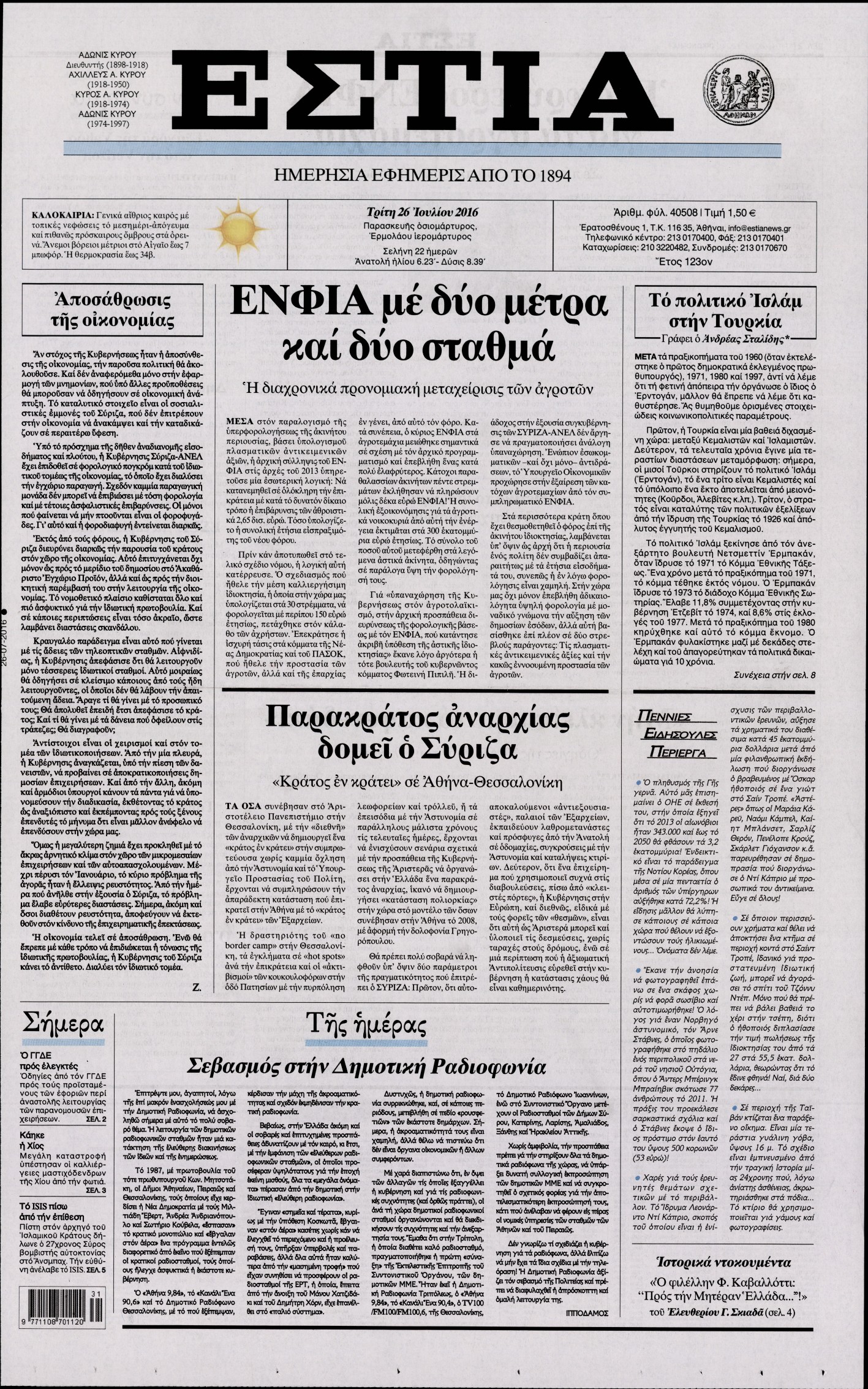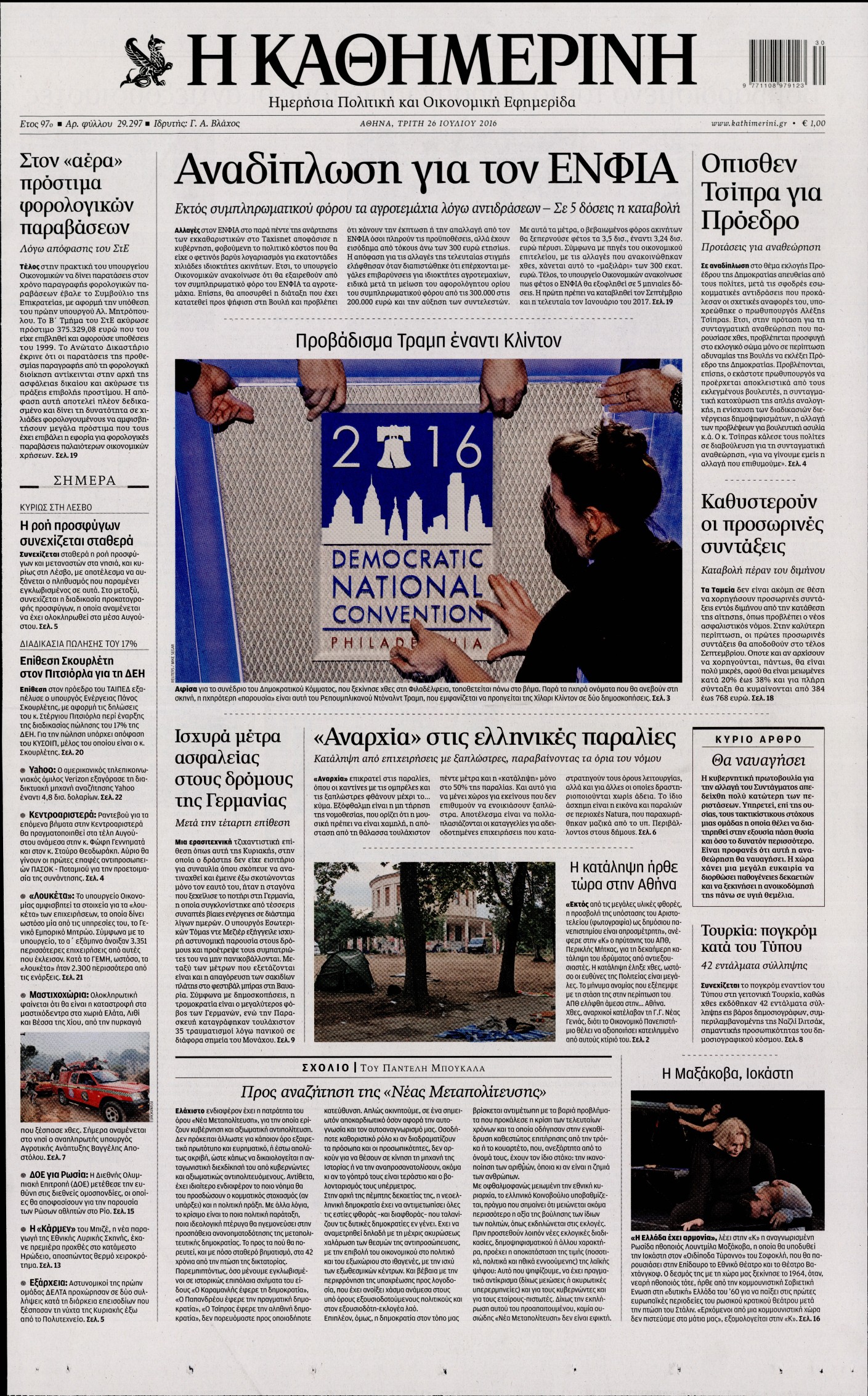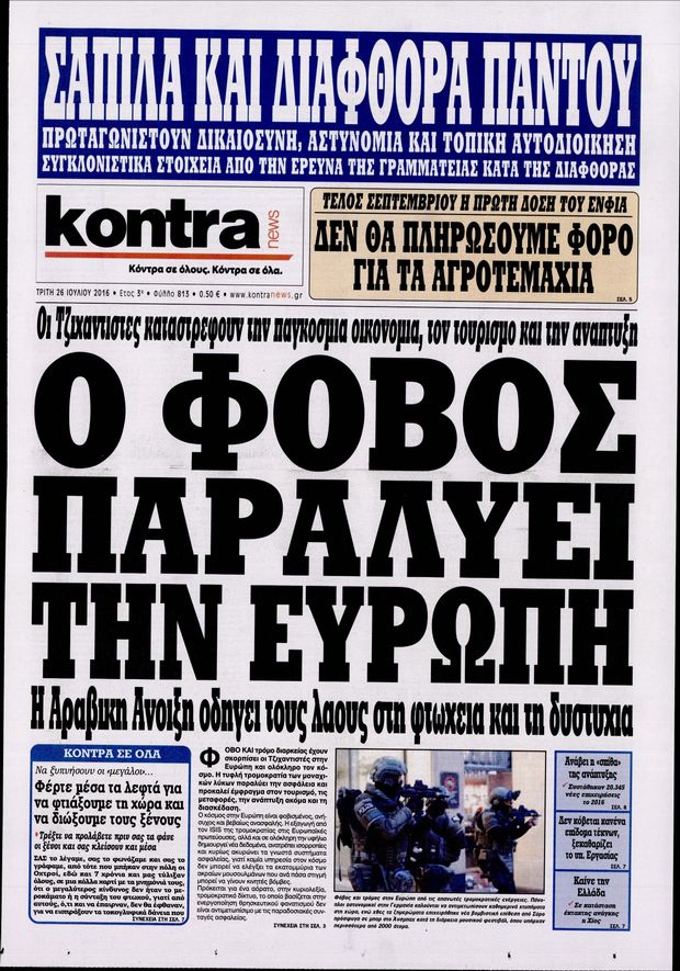 Οι πολιτικές εφημερίδες 26/7/2016 Enikos Newsroom 05:19, Τρίτη 26 Ιουλίου 2016 Media Διαβάστε τα σημερινά πρωτοσέλιδα των πολιτικών εφημερίδων: ΠΟΛΙΤΙΚΕΣ ΕΦΗΜΕΡΙΔΕΣ ΠΡΩΤΟΣΕΛΙΔΑ Μοιράσου το: σχολίασε κι εσύ (0 σχόλια) Ακολουθήστε το enikos.gr στο Google News και μάθετε πρώτοι όλες τις ειδήσεις Δείτε όλες τις τελευταίες ειδήσεις από την Ελλάδα και τον Κόσμο στο enikos.gr Ειδήσεις Ροή Ειδήσεων 6 ώρες πριν Εκτός ευρωομάδας ΣΥΡΙΖΑ ο Νίκος Παππάς μετά την επίθεση στον δημοσιογράφο Νίκο Γιαννόπουλο – Η μήνυση και οι νέες δηλώσεις 6 ώρες πριν «Αγριεύουν» οι αγρότες: «Δεν συντρέχει λόγος συνάντησης με τον πρωθυπουργό» – Ώρα αποφάσεων στη σύσκεψη της Πέμπτης 6 ώρες πριν Κυψέλη: Χωρίς την οικογένειά της δίπλα της απολογήθηκε η 16χρονη – «Της είχε επιτεθεί κάποιος για να την βιάσει, φοβήθηκε και κυκλοφορούσε με μαχαίρι» 6 ώρες πριν Politico: Το πρόβλημα της Ευρώπης δεν είναι το Βέλγιο αλλά ο Ντόναλντ Τραμπ 8 ώρες πριν Αλεξανδρούπολη: Πολυοργανική ανεπάρκεια λόγω υποσιτισμού η αιτία θανάτου του 3χρονου αγοριού 6 ώρες πριν Μυστήριο με τεράστιες κυκλικές πέτρες 200 κιλών – Ανακαλύφθηκαν τυχαία κατά τη διάρκεια οδικών έργων και κανείς δεν ξέρει από πού προέρχονται 7 ώρες πριν Ύπνος: Ειδικός εξηγεί τον πραγματικό λόγο που ξυπνάτε στις 4 τα ξημερώματα – Ο ρόλος των ορμονών και του κιρκάδιου ρυθμού 8 ώρες πριν Αριθμολογία: Οι άνθρωποι που έχουν γεννηθεί αυτές τις 4 ημερομηνίες, είναι τρυφεροί και αγαπούν ανιδιοτελώς 20 ώρες πριν 20 χρόνια τα Χριστούγεννα ξεκινούν στα Public με μεγάλη ποικιλία σε δώρα! 6 λεπτά πριν Αυστραλία: Κυβερνητική δέσμευση για αυστηρότερα μέτρα κατά της υποκίνησης μίσους 21 λεπτά πριν Ντόναλντ Τραμπ: Παρουσίασε τα επιτεύγματα της διακυβέρνησής του – Σκληρή κριτική στον Τζο Μπάιντεν 36 λεπτά πριν Κτηνοτρόφοι: Με δάκρυα στα μάτια ζουν τον εφιάλτη των άδειων στάβλων – «Καταστράφηκαν οι ζωές μας» 51 λεπτά πριν Νέο αμερικανικό πλήγμα σε σκάφος που φέρεται να μετέφερε ναρκωτικά στον Ειρηνικό – Τέσσερις νεκροί 1 ώρα πριν Αλ Τσαντίρι Νιουζ: «Λύγισε» ο Δημήτρης Λάλος για τον Δημήτρη Ήμελλο – «Τον μνημονεύω, να ‘ναι καλά εκεί που είναι» ENIKOS NETWORK Αϋπνία: Το κόλπο που θα σας βοηθήσει να κοιμηθείτε απόψε – Είναι απλό και έχει αποτέλεσμα 2,6 εκατομμύρια πολίτες έχουν ήδη εμβολιαστεί κατά της γρίπης ΕΛΣΤΑΤ: Τι δείχνουν τα νέα στοιχεία για τις ηλεκτρονικές παραγγελίες των επιχειρήσεων ΚΕΠΕ: Οι 3 διακριτές συμβολές των ΜμΕ και της μεταποίησης στην ελληνική οικονομία Χαρτογραφώντας το «σημείο χωρίς επιστροφή»: Για πρώτη φορά αποκαλύπτεται με λεπτομέρεια το ακανθώδες όριο της ατμόσφαιρας τ... Η Google καταργεί τη λειτουργία «dark web report» – Πώς θα μπορούν οι χρήστες να διαγράφουν τα δεδομένα τους περισσότερα 02:30 , Πέμπτη 18 Δεκεμβρίου 2025 Αλ Τσαντίρι Νιουζ: Η κόρη της Πάολα στο κοινό – Η ατάκα Λαζόπουλου που την έκανε να «κοκκινήσει» Γιορτινή διάθεση και ευχάριστες στιγμές γέμισε η αποψινή, τελευταία για το 2025, εκπομπή του «... 22:24 , Τετάρτη 17 Δεκεμβρίου 2025 Το Σπίτι Δίπλα Στο Ποτάμι: Σε κίνδυνο η υγεία του Απόστολου – Τι θα δούμε απόψε “Το Σπίτι Δίπλα στο Ποτάμι” ξετυλίγει το νήμα της ζωής των πέντε αδελφών με καταισ... 21:14 , Τετάρτη 17 Δεκεμβρίου 2025 Παιχνίδια Εκδίκησης: Θα καταφέρει ο Χρήστος να κλονίσει την εμπιστοσύνη της Μάγιας απέναντι στον Άγη; Τα «Παιχνίδια Εκδίκησης» έρχονται απόψε στις 22:30, στον Αντ1, με το τελευταίο επεισόδιο της χ... 20:57 , Τετάρτη 17 Δεκεμβρίου 2025 Άγιος Έρωτας: Η Χλόη καταθέτει εναντ