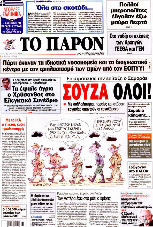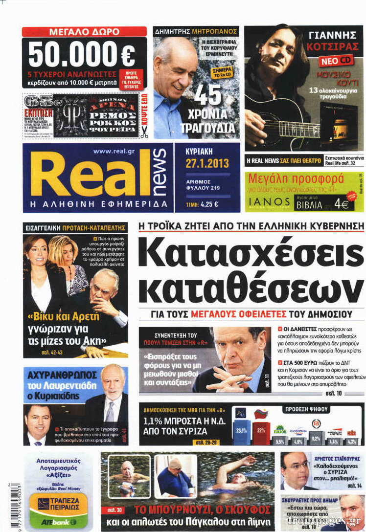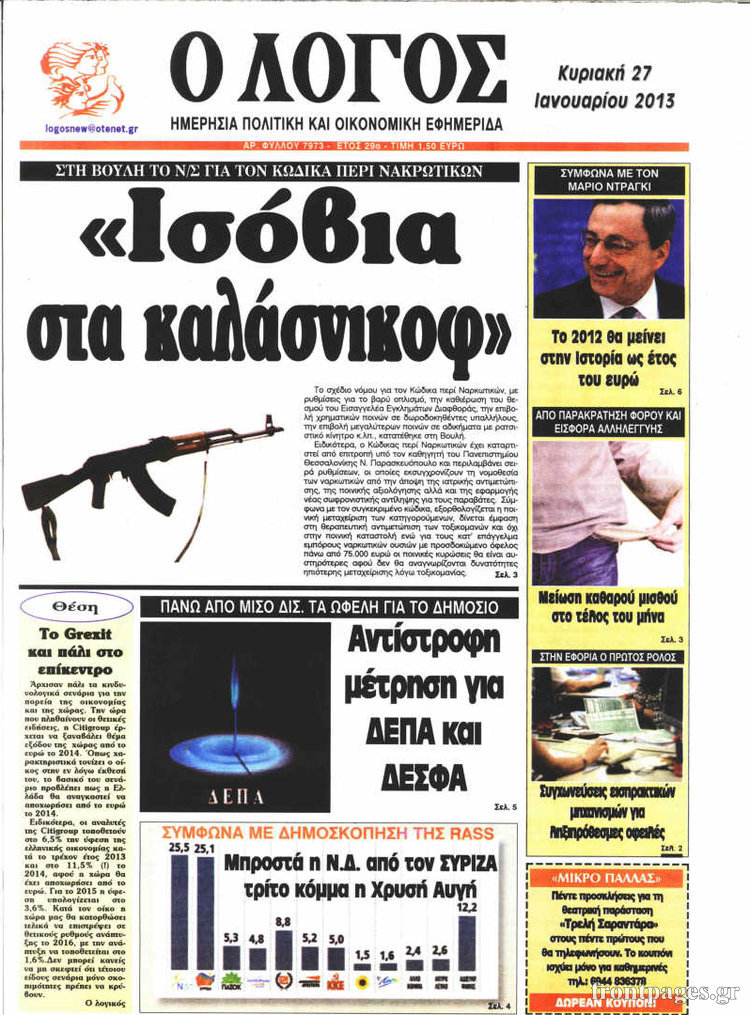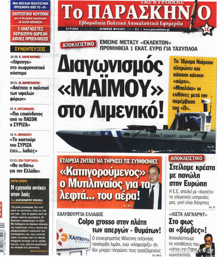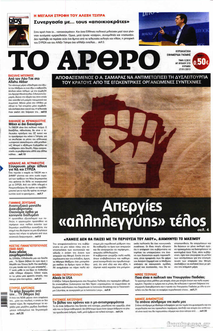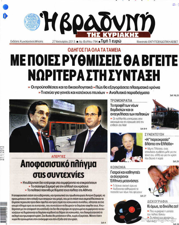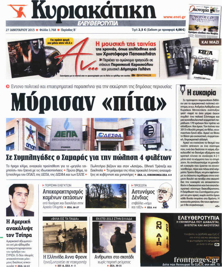 Οι πολιτικές εφημερίδες Enikos Newsroom 08:40, Κυριακή 27 Ιανουαρίου 2013 Media Οι πολιτικές εφημερίδες Δείτε τα πρωτοσέλιδα των πολιτικών εφημερίδων ΠΟΛΙΤΙΚΕΣ ΕΦΗΜΕΡΙΔΕΣ ΠΡΩΤΟΣΕΛΙΔΑ Μοιράσου το: σχολίασε κι εσύ (0 σχόλια) Ακολουθήστε το enikos.gr στο Google News και μάθετε πρώτοι όλες τις ειδήσεις Δείτε όλες τις τελευταίες ειδήσεις από την Ελλάδα και τον Κόσμο στο enikos.gr Ειδήσεις Ροή Ειδήσεων 2 ώρες πριν Μπλόκα: Οι αγρότες σηκώνουν τις μπάρες σε διόδια για τους εκδρομείς των Χριστουγέννων και μοιράζουν προϊόντα – Βίντεο 2 ώρες πριν Τσιάρας προς αγρότες: Τα μπλόκα και τα πείσματα δεν ωφελούν – Οι λύσεις περνούν μέσα από τον διάλογο 3 ώρες πριν Αρχεία Έπσταϊν: Οι συγκλονιστικές φωτογραφίες – Ο Μάικλ Τζάκσον, ο Μικ Τζάγκερ και ο Κέβιν Σπέισι ανάμεσα στους διάσημους που απεικονίζονται 1 ώρα πριν Μαθητές διακινούσαν κοκαΐνη και χασίς σε σχολείο της Αττικής – 12 συλλήψεις 1 ώρα πριν Βέλγιο: Άγνωστοι έριξαν κόκκινη μπογιά στο προξενείο της Πολωνίας στις Βρυξέλλες 5 ώρες πριν Μία νέα «χρυσή» περίοδος αρχίζει για 3 ζώδια από σήμερα – «Μία αναπάντεχη ευκαιρία οδηγεί στην επιτυχία» 4 ώρες πριν Διαιτολόγος αποκαλύπτει 9 πρωινές συνήθειες που «λιώνουν» το κοιλιακό λίπος – «Υποστηρίζουν την υγιεινή απώλεια βάρους» 5 ώρες πριν Οι 7 φράσεις που δεν λένε ποτέ οι συναισθηματικά έξυπνοι άνθρωποι κατά τη διάρκεια ενός καβγά 7 ώρες πριν Enerwave: Το νέο «ρεύμα» στη λιανική ενέργειας που αλλάζει την εμπειρία του καταναλωτή 8 λεπτά πριν Πακιστάν: Σε κάθειρξη 17 ετών καταδικάστηκαν ο πρώην πρωθυπουργός Ίμραν Χαν και η σύζυγός του 16 λεπτά πριν Μαρινάκης στον Realfm 97,8: Η κυβέρνηση σέβεται κάθε λογική διεκδίκηση των αγροτών, αλλά και το αίτημα των πολιτών να μην ταλαιπωρούνται 22 λεπτά πριν O Πάντερ MVP της 17ης αγωνιστικής στην Euroleague 31 λεπτά πριν Πέθανε η τραγουδίστρια Κλαούντια Ντελμέρ 39 λεπτά πριν Μία ανεκμετάλλευτη πηγή θα μπορούσε να προσφέρει ανεξάντλητη ενέργεια – Οι επιστήμονες ίσως γνωρίζουν πώς να την ξεκλειδώσουν ENIKOS NETWORK Η αποχή από την αναπαραγωγή παρατείνει τη ζωή στα ζώα, σύμφωνα με μελέτη – Τι ισχύει για τους ανθρώπους; Σημαντικές επαφές στις ΗΠΑ είχε ο υπουργός Υγείας Άδωνις Γεωργιάδης Ευλογιά αιγοπροβάτων: Παρατεταμένη επιζωοτία, αυστηρά μέτρα – Τι ισχύει για τον εμβολιασμό και την ανασύσταση του ζωικού κε... Τσιάρας προς αγρότες: Έχει ικανοποιηθεί το 74% των αιτημάτων – Τα μπλόκα και τα πείσματα δεν ωφελούν Χαρτογραφώντας το «σημείο χωρίς επιστροφή»: Για πρώτη φορά αποκαλύπτεται με λεπτομέρεια το ακανθώδες όριο της ατμόσφαιρας τ... Η Google καταργεί τη λειτουργία «dark web report» – Πώς θα μπορούν οι χρήστες να διαγράφουν τα δεδομένα τους περισσότερα 14:04 , Σάββατο 20 Δεκεμβρίου 2025 Η Realnews αυτής της Κυριακής (21/12/2025) Με τίτλο: «Ασπίδα προστασίας για την Ελλάδα» κυκλοφορεί, αυτήν την Κυριακή, η Realnews. Σημαντ... 12:53 , Σάββατο 20 Δεκεμβρίου 2025 Να μ’ αγαπάς: Το παρελθόν έρχεται στο φως – Καταιγιστικές εξελίξεις στα τελευταία επεισόδια του 2025 Ο Άγγελος αποκαλύπτεται, η Φωτεινή ανησυχεί για τον Λευτέρη και η Ζωή έρχεται αντιμέτωπη με το... 11:41 , Σάββατο 20 Δεκεμβρίου 2025 «Η αγάπη δεν χάνεται ποτέ»: Η μικρού μήκους ταινία κινουμένων σχεδίων που θέτει ερωτήματα για τη ζωή και τον θάνατο Ο θάνατος είναι ένα από τα πιο σκληρά θέματα που καλείται να διαχειριστεί κάποιος στη διάρκεια... 09:30 , Σάββατο 20 Δεκεμβρίου 2025 «Porto Leone: Στη γειτονιά με τα κόκκινα φανάρια» – Ο Χρόνης αποκαλύπτει στην Αλεξάνδρα το μυστικό γι