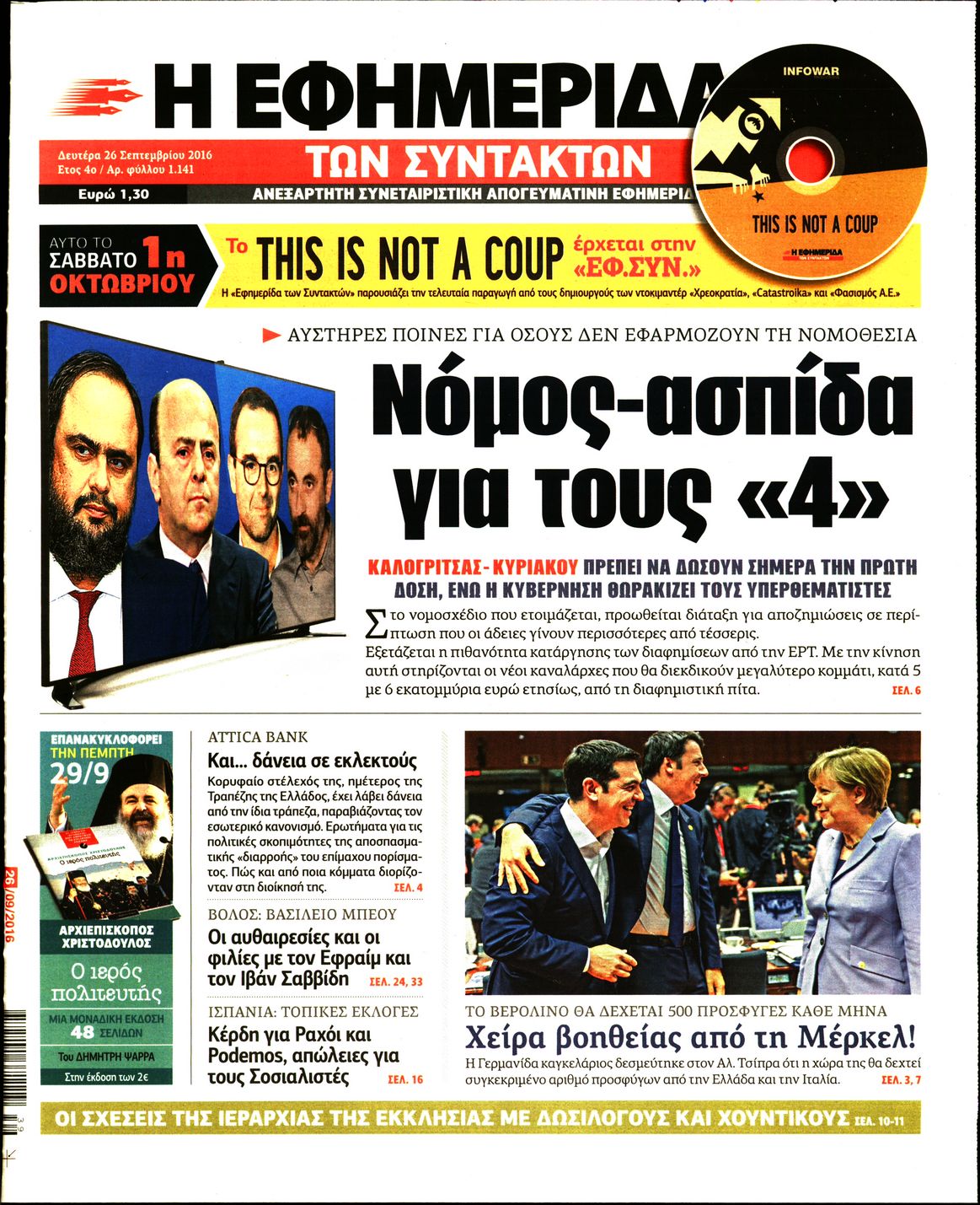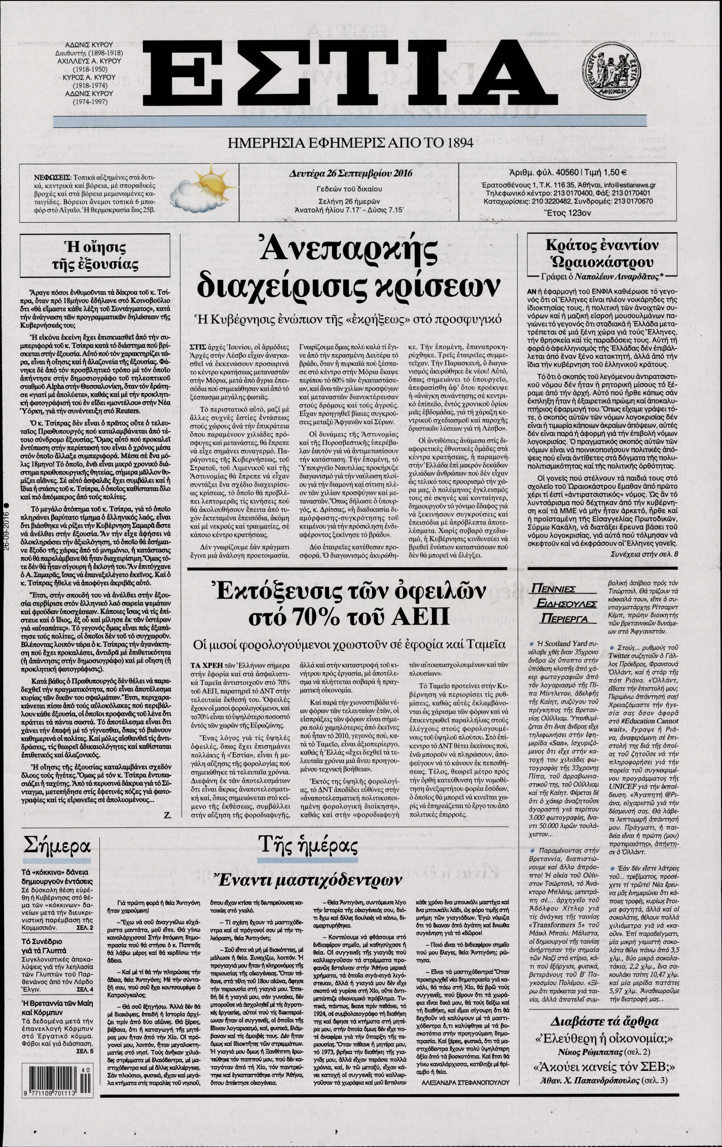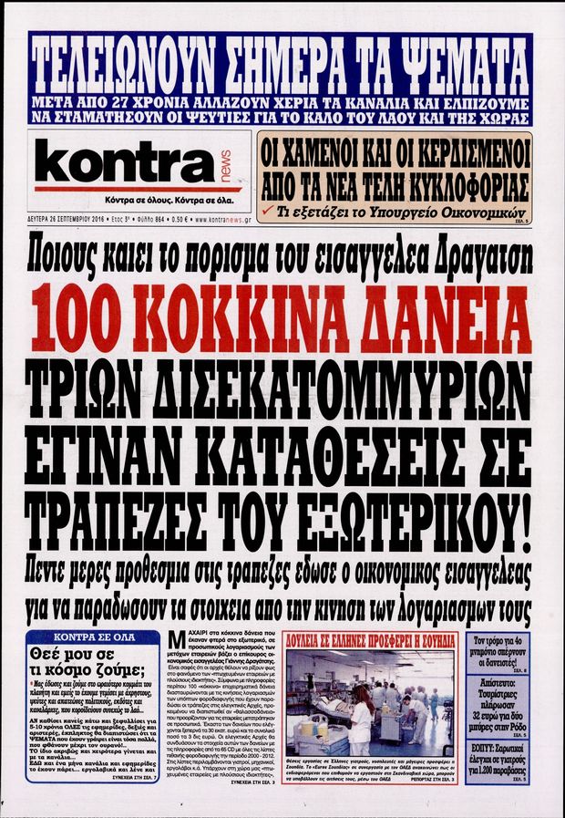 Oι πολιτικές εφημερίδες 26/9/2016 Enikos Newsroom 05:00, Δευτέρα 26 Σεπτεμβρίου 2016 Media Διαβάστε τα σημερινά πρωτοσέλιδα των πολιτικών εφημερίδων: ΠΟΛΙΤΙΚΕΣ ΕΦΗΜΕΡΙΔΕΣ ΠΡΩΤΟΣΕΛΙΔΑ Μοιράσου το: σχολίασε κι εσύ (0 σχόλια) Ακολουθήστε το enikos.gr στο Google News και μάθετε πρώτοι όλες τις ειδήσεις Δείτε όλες τις τελευταίες ειδήσεις από την Ελλάδα και τον Κόσμο στο enikos.gr Ειδήσεις Ροή Ειδήσεων 6 ώρες πριν Εκτός ευρωομάδας ΣΥΡΙΖΑ ο Νίκος Παππάς μετά την επίθεση στον δημοσιογράφο Νίκο Γιαννόπουλο – Η μήνυση και οι νέες δηλώσεις 6 ώρες πριν «Αγριεύουν» οι αγρότες: «Δεν συντρέχει λόγος συνάντησης με τον πρωθυπουργό» – Ώρα αποφάσεων στη σύσκεψη της Πέμπτης 6 ώρες πριν Κυψέλη: Χωρίς την οικογένειά της δίπλα της απολογήθηκε η 16χρονη – «Της είχε επιτεθεί κάποιος για να την βιάσει, φοβήθηκε και κυκλοφορούσε με μαχαίρι» 6 ώρες πριν Politico: Το πρόβλημα της Ευρώπης δεν είναι το Βέλγιο αλλά ο Ντόναλντ Τραμπ 8 ώρες πριν Αλεξανδρούπολη: Πολυοργανική ανεπάρκεια λόγω υποσιτισμού η αιτία θανάτου του 3χρονου αγοριού 6 ώρες πριν Μυστήριο με τεράστιες κυκλικές πέτρες 200 κιλών – Ανακαλύφθηκαν τυχαία κατά τη διάρκεια οδικών έργων και κανείς δεν ξέρει από πού προέρχονται 7 ώρες πριν Ύπνος: Ειδικός εξηγεί τον πραγματικό λόγο που ξυπνάτε στις 4 τα ξημερώματα – Ο ρόλος των ορμονών και του κιρκάδιου ρυθμού 8 ώρες πριν Αριθμολογία: Οι άνθρωποι που έχουν γεννηθεί αυτές τις 4 ημερομηνίες, είναι τρυφεροί και αγαπούν ανιδιοτελώς 20 ώρες πριν 20 χρόνια τα Χριστούγεννα ξεκινούν στα Public με μεγάλη ποικιλία σε δώρα! 6 λεπτά πριν Αυστραλία: Κυβερνητική δέσμευση για αυστηρότερα μέτρα κατά της υποκίνησης μίσους 21 λεπτά πριν Ντόναλντ Τραμπ: Παρουσίασε τα επιτεύγματα της διακυβέρνησής του – Σκληρή κριτική στον Τζο Μπάιντεν 36 λεπτά πριν Κτηνοτρόφοι: Με δάκρυα στα μάτια ζουν τον εφιάλτη των άδειων στάβλων – «Καταστράφηκαν οι ζωές μας» 51 λεπτά πριν Νέο αμερικανικό πλήγμα σε σκάφος που φέρεται να μετέφερε ναρκωτικά στον Ειρηνικό – Τέσσερις νεκροί 1 ώρα πριν Αλ Τσαντίρι Νιουζ: «Λύγισε» ο Δημήτρης Λάλος για τον Δημήτρη Ήμελλο – «Τον μνημονεύω, να ‘ναι καλά εκεί που είναι» ENIKOS NETWORK Αϋπνία: Το κόλπο που θα σας βοηθήσει να κοιμηθείτε απόψε – Είναι απλό και έχει αποτέλεσμα 2,6 εκατομμύρια πολίτες έχουν ήδη εμβολιαστεί κατά της γρίπης ΕΛΣΤΑΤ: Τι δείχνουν τα νέα στοιχεία για τις ηλεκτρονικές παραγγελίες των επιχειρήσεων ΚΕΠΕ: Οι 3 διακριτές συμβολές των ΜμΕ και της μεταποίησης στην ελληνική οικονομία Χαρτογραφώντας το «σημείο χωρίς επιστροφή»: Για πρώτη φορά αποκαλύπτεται με λεπτομέρεια το ακανθώδες όριο της ατμόσφαιρας τ... Η Google καταργεί τη λειτουργία «dark web report» – Πώς θα μπορούν οι χρήστες να διαγράφουν τα δεδομένα τους περισσότερα 02:30 , Πέμπτη 18 Δεκεμβρίου 2025 Αλ Τσαντίρι Νιουζ: Η κόρη της Πάολα στο κοινό – Η ατάκα Λαζόπουλου που την έκανε να «κοκκινήσει» Γιορτινή διάθεση και ευχάριστες στιγμές γέμισε η αποψινή, τελευταία για το 2025, εκπομπή του «... 22:24 , Τετάρτη 17 Δεκεμβρίου 2025 Το Σπίτι Δίπλα Στο Ποτάμι: Σε κίνδυνο η υγεία του Απόστολου – Τι θα δούμε απόψε “Το Σπίτι Δίπλα στο Ποτάμι” ξετυλίγει το νήμα της ζωής των πέντε αδελφών με καταισ... 21:14 , Τετάρτη 17 Δεκεμβρίου 2025 Παιχνίδια Εκδίκησης: Θα καταφέρει ο Χρήστος να κλονίσει την εμπιστοσύνη της Μάγιας απέναντι στον Άγη; Τα «Παιχνίδια Εκδίκησης» έρχονται απόψε στις 22:30, στον Αντ1, με το τελευταίο επεισόδιο της χ... 20:57 , Τετάρτη 17 Δεκεμβρίου 2025 Άγιος Έρωτας: Η Χλόη καταθέτει 