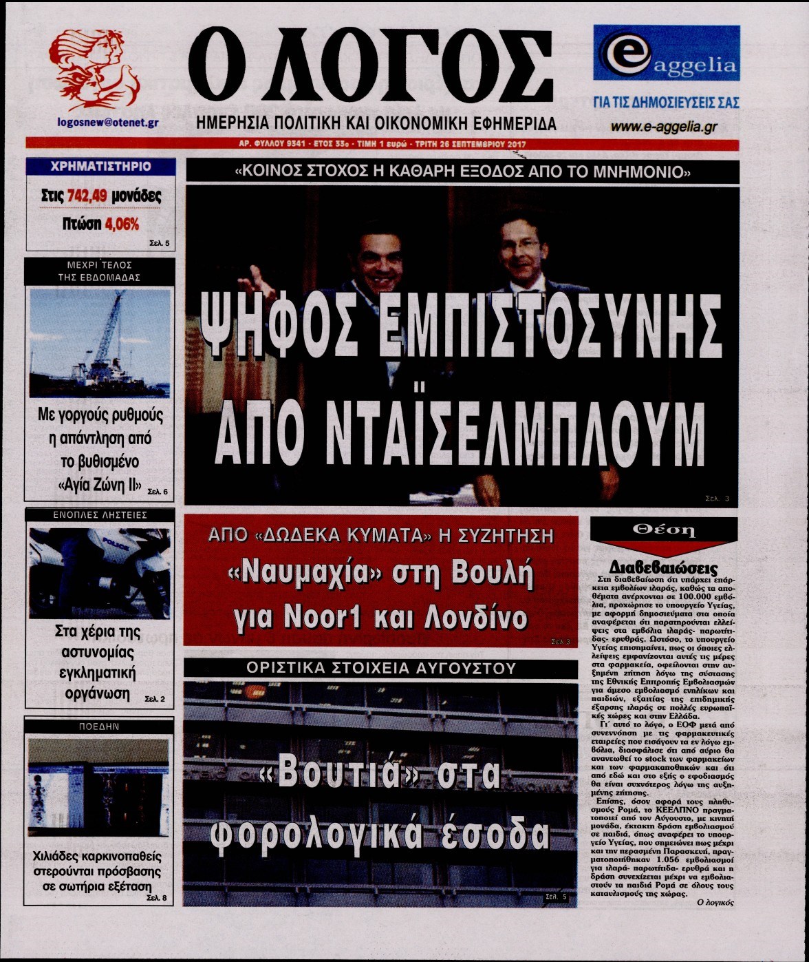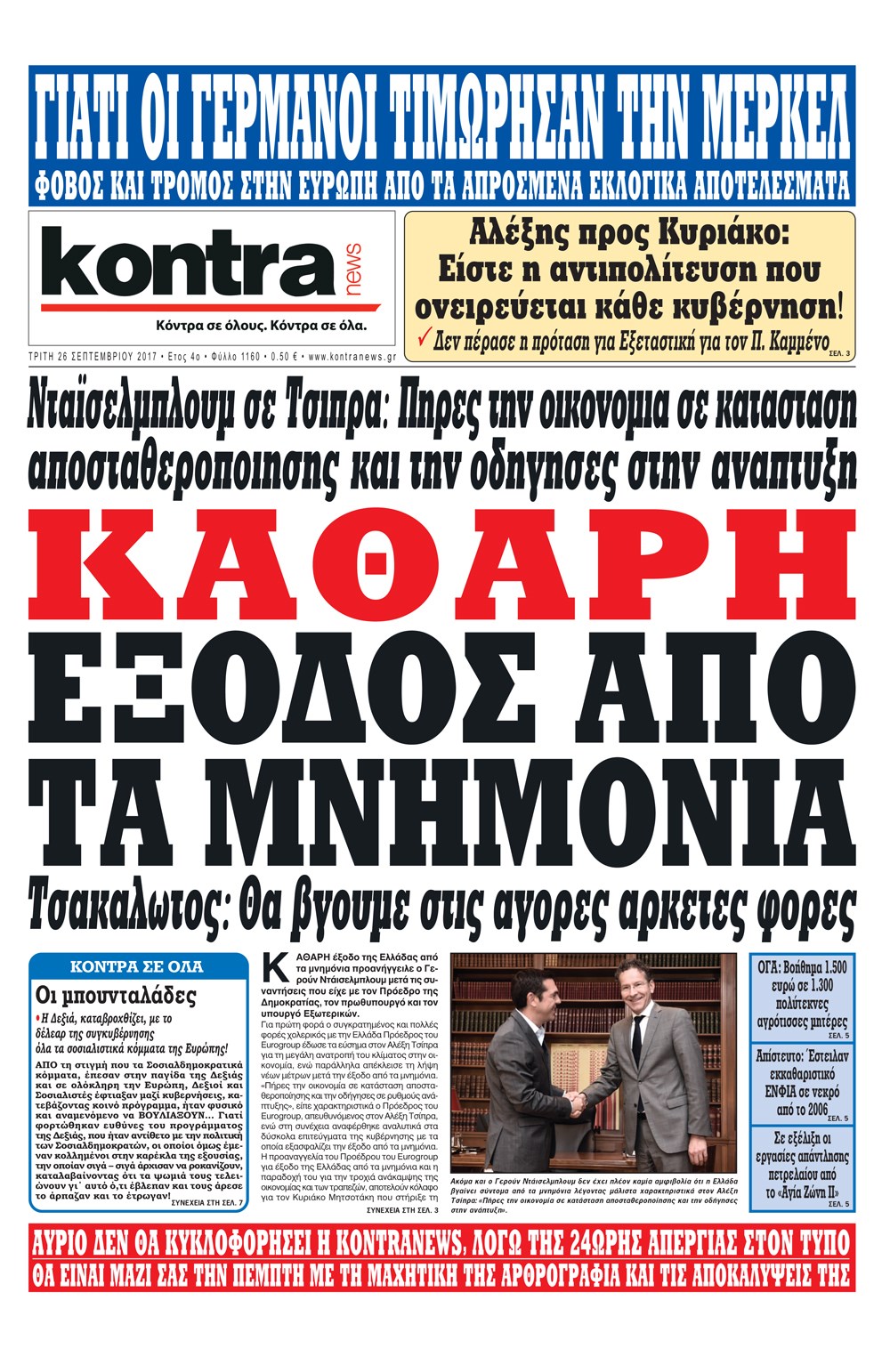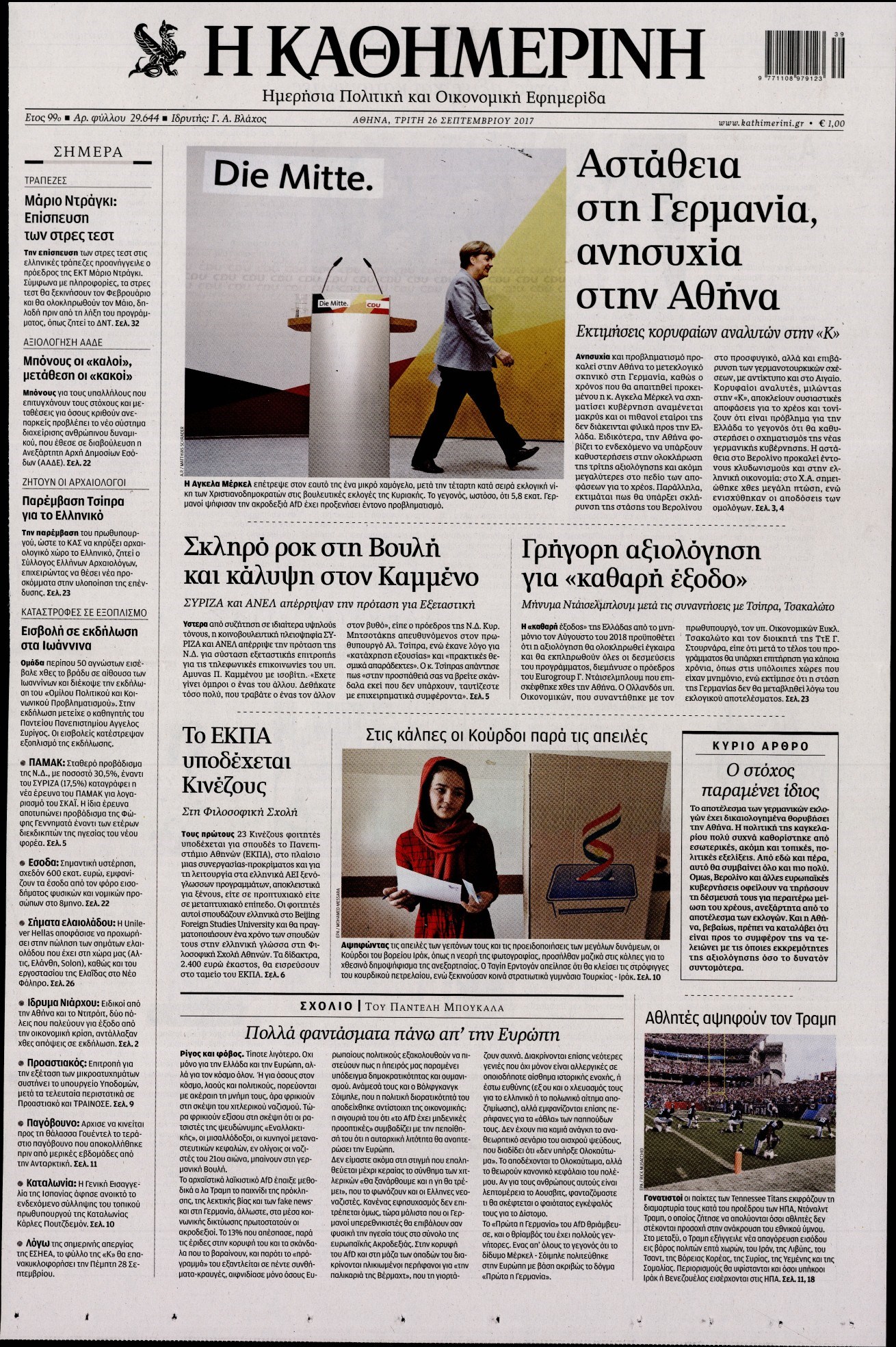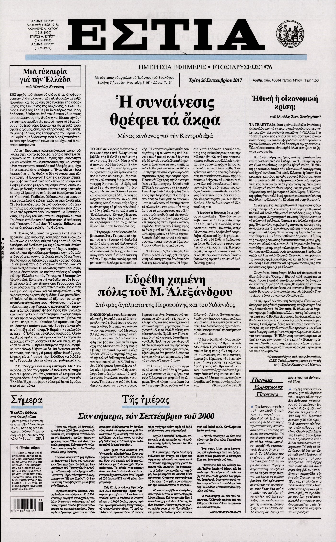 Οι πολιτικές εφημερίδες 26/9/2017 Κώστας Τεό 05:24, Τρίτη 26 Σεπτεμβρίου 2017 Media Διαβάστε τα σημερινά πρωτοσέλιδα των πολιτικών εφημερίδων: ΠΟΛΙΤΙΚΕΣ ΕΦΗΜΕΡΙΔΕΣ ΠΡΩΤΟΣΕΛΙΔΑ Μοιράσου το: σχολίασε κι εσύ (0 σχόλια) Ακολουθήστε το enikos.gr στο Google News και μάθετε πρώτοι όλες τις ειδήσεις Δείτε όλες τις τελευταίες ειδήσεις από την Ελλάδα και τον Κόσμο στο enikos.gr Ειδήσεις Ροή Ειδήσεων 2 ώρες πριν Χριστούγεννα στα μπλόκα: Επιμένουν στις κινητοποιήσεις τους οι αγρότες – Ανοίγουν τα διόδια το Σαββατοκύριακο 2 ώρες πριν Ουκρανία: Η άνευ προηγουμένου επίθεση σε ρωσικό τάνκερ στη Μεσόγειο και το μήνυμα προς στον Πούτιν – Το «μακρύ χέρι» του Κιέβου 1 ώρα πριν Πούτιν: Τα μηνύματα σε Ευρώπη και ΝΑΤΟ από το μαραθώνιο «σόου» του – Η απαίτηση για «σεβασμό» και η ειρήνη «με τους όρους» της Μόσχας 2 ώρες πριν Τραμπ: Δεν αποκλείει την πιθανότητα ενός πολέμου στη Βενεζουέλα – «Ο Μαδούρο ξέρει καλύτερα από τον καθένα τι ακριβώς θέλω» 3 ώρες πριν Συνεχίζει να προκαλεί ο Μίτσκοσκι: «Για μένα το όνομα Μακεδονία είναι ιερό» 1 ώρα πριν Ανακαλύφθηκαν αρχαία χρυσά νομίσματα 2.200 ετών που απεικονίζουν τον θεό Απόλλωνα – Η άγνωστη σύνδεση με τον Φίλιππο Β΄ της Μακεδονίας 2 ώρες πριν Ύπνος: Μια κρυφή κατάσταση του εγκεφάλου πριν από τον ύπνο μπορεί να είναι το “κλειδί” για υψηλή ευφυΐα και δημιουργικότητα 3 ώρες πριν Αριθμολογία: Οι άνθρωποι που έχουν γεννηθεί αυτές τις 4 ημερομηνίες, συχνά παρεξηγούνται – «Η καλοσύνη τους κρύβει τεράστια δύναμη» 4 ώρες πριν Ξεχάστε το καθάρισμα το Σαββατοκύριακο: Ο «κανόνας των 20 λεπτών» που θα σας λύσει τα χέρια 6 λεπτά πριν Βασίλης Σπανούλης: Δεν εμφανίστηκε ούτε ένας δημοσιογράφος στην συνέντευξη Τύπου – «Καλησπέρα στον… κανέναν», δείτε βίντεο 17 λεπτά πριν Πόλεμος στην Ουκρανία: Εφτά νεκροί από ρωσική πυραυλική επίθεση στο λιμάνι της Οδησσού 20 λεπτά πριν ΗΠΑ: Η κυβέρνηση του Ντόναλντ Τραμπ άρχισε να δημοσιοποιεί τα αρχεία Έπσταϊν 32 λεπτά πριν Σάμος: Άνοιξε το μπλόκο των αγροτών στον κόμβο Κοκκαρίου – Σε νέα συνεδρίαση θα καθορίσουν την στάση τους 40 λεπτά πριν Άνω Λιόσια: Πυροβολισμοί σε επιχείρηση με χαλιά – Εντοπίστηκαν 10 κάλυκες ENIKOS NETWORK Το ΕΚΑΒ τιμήθηκε από την Ακαδημία Αθηνών για τα 40 χρόνια προσφοράς του Έχετε πραγματικά μεγάλη καρδιά; 10 χαρακτηριστικά όσων έχουν καλοσύνη Αναστολή μέτρων αναγκαστικής εκτέλεσης για κτηνοτρόφους που πλήττονται από την ευλογιά των αιγοπροβάτων Πλήρης επάρκεια προϊόντων στις λαϊκές της Αττικής, παρά τις αγροτικές κινητοποιήσεις – Τι απαντούν οι πωλητές Χαρτογραφώντας το «σημείο χωρίς επιστροφή»: Για πρώτη φορά αποκαλύπτεται με λεπτομέρεια το ακανθώδες όριο της ατμόσφαιρας τ... Η Google καταργεί τη λειτουργία «dark web report» – Πώς θα μπορούν οι χρήστες να διαγράφουν τα δεδομένα τους περισσότερα 22:42 , Παρασκευή 19 Δεκεμβρίου 2025 Γιώργος Γιαννόπουλος για “Το σόι σου”: “Είναι ευτυχία και ευλογία αυτή η σειρά” «Είναι ευτυχία και ευλογία η συγκυρία αυτής της σειράς», θα πει ο Γιώργος Γιαννόπουλος -ο αγαπ... 20:37 , Παρασκευή 19 Δεκεμβρίου 2025 Don’t Forget The Lyrics: Η Έλλη Κοκκίνου υποδέχεται 4 παίκτες που θα κάνουν τα πάντα για να μη χάσουν ούτε… μισή λέξη από τους στίχους Το «Don’t Forget The Lyrics» επιστρέφει απόψε, Παρασκευή 19 Δεκεμβρίου, στις 21:00 με νέο επει... 19:31 , Παρασκευή 19 Δεκεμβρίου 2025 GNTM: Απόψε ο μεγάλος τελικός για τους 4 φιναλίστ Έπειτα από μήνες γεμάτους μόδα, δημιουργία και έντονες αναμετρήσεις, το GNTM 2025 κορυφώνεται,... 18:11 , Παρα