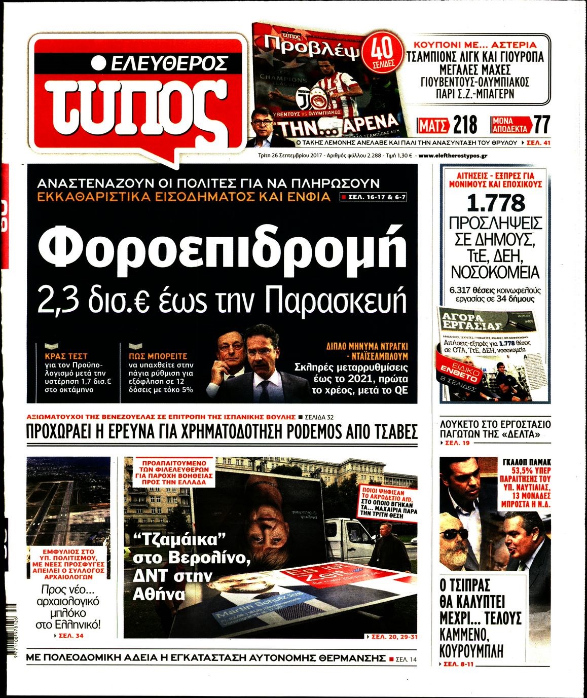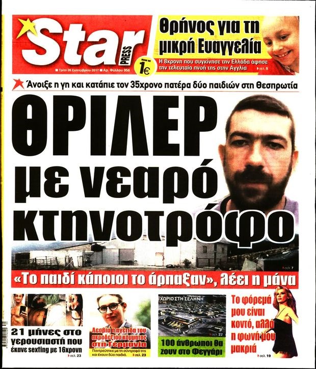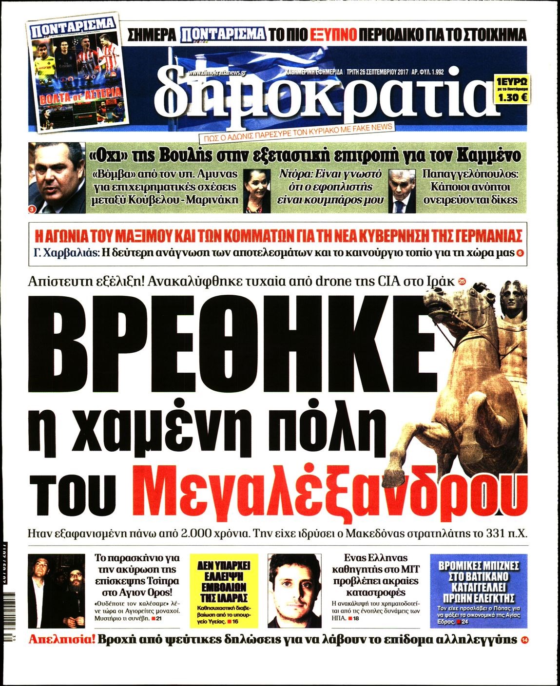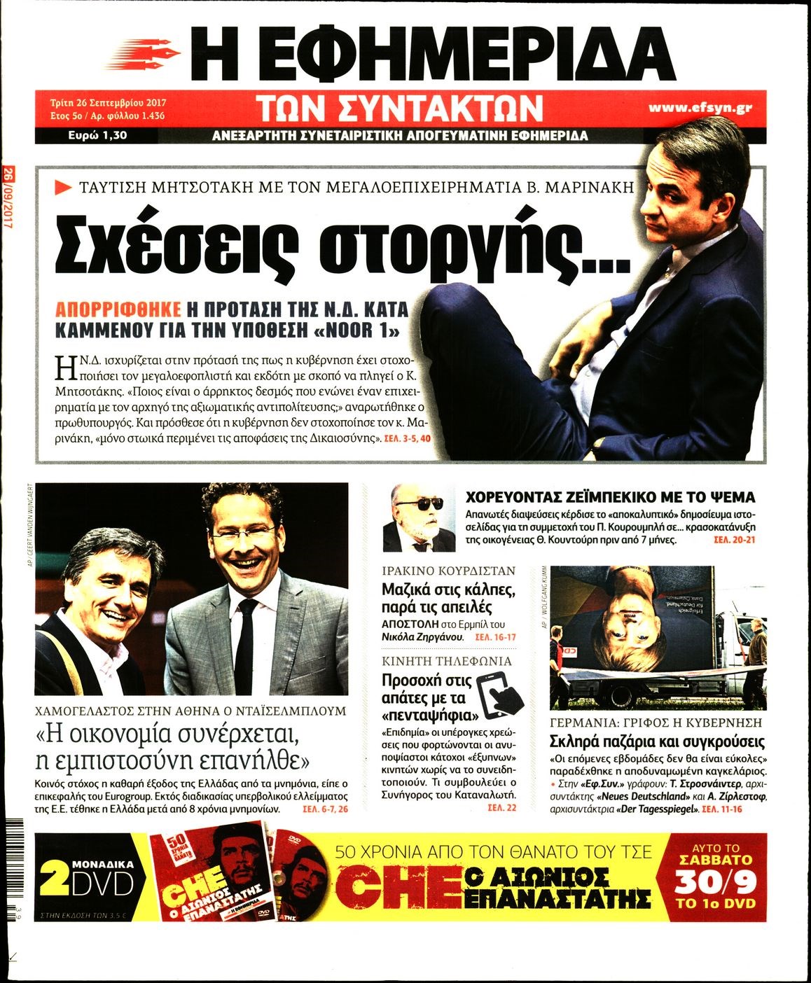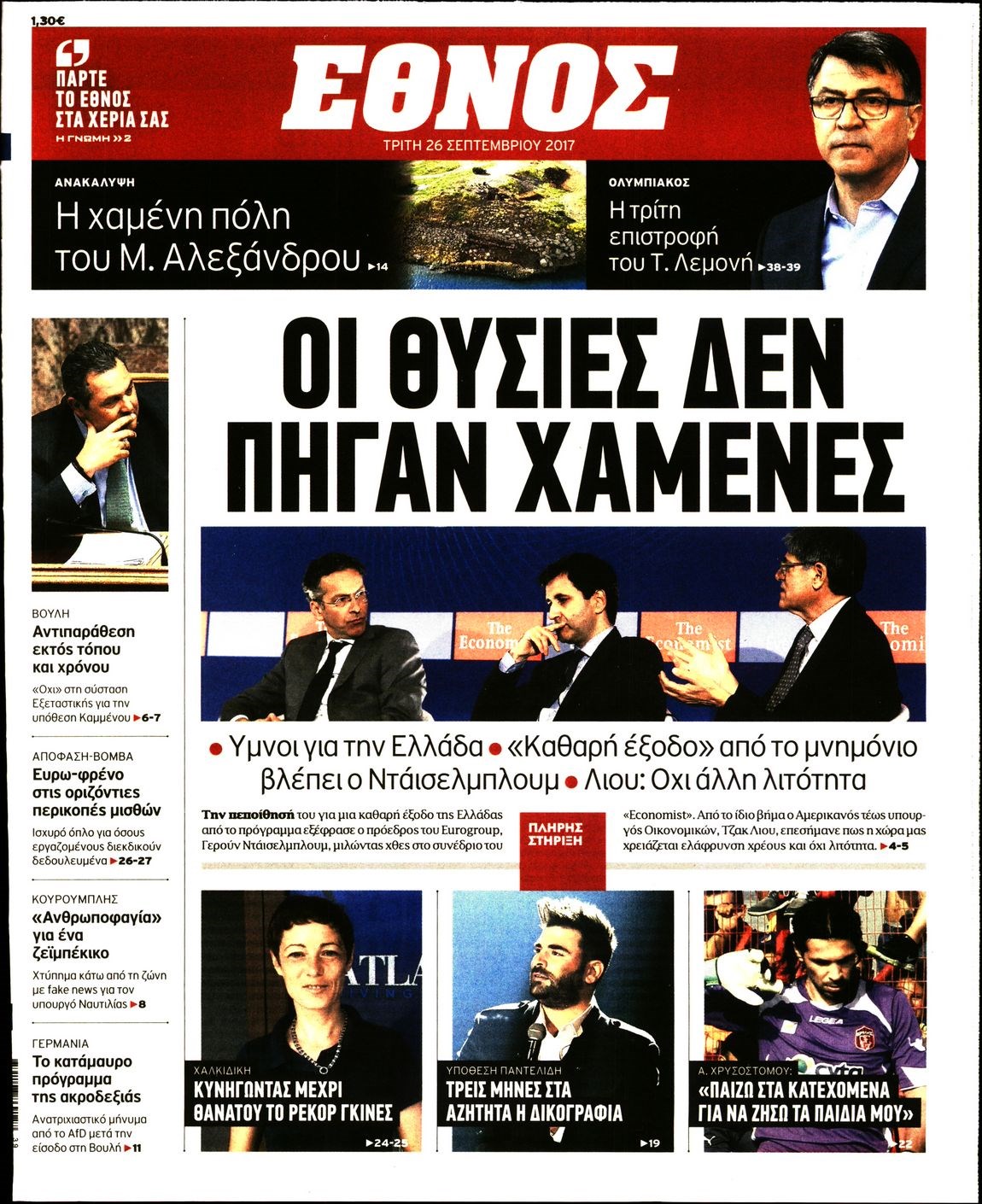 Οι πολιτικές εφημερίδες 26/9/2017 Κώστας Τεό 05:24, Τρίτη 26 Σεπτεμβρίου 2017 Media Διαβάστε τα σημερινά πρωτοσέλιδα των πολιτικών εφημερίδων: ΠΟΛΙΤΙΚΕΣ ΕΦΗΜΕΡΙΔΕΣ ΠΡΩΤΟΣΕΛΙΔΑ Μοιράσου το: σχολίασε κι εσύ (0 σχόλια) Ακολουθήστε το enikos.gr στο Google News και μάθετε πρώτοι όλες τις ειδήσεις Δείτε όλες τις τελευταίες ειδήσεις από την Ελλάδα και τον Κόσμο στο enikos.gr Ειδήσεις Ροή Ειδήσεων 2 ώρες πριν Χριστούγεννα στα μπλόκα: Επιμένουν στις κινητοποιήσεις τους οι αγρότες – Ανοίγουν τα διόδια το Σαββατοκύριακο 2 ώρες πριν Ουκρανία: Η άνευ προηγουμένου επίθεση σε ρωσικό τάνκερ στη Μεσόγειο και το μήνυμα προς στον Πούτιν – Το «μακρύ χέρι» του Κιέβου 1 ώρα πριν Πούτιν: Τα μηνύματα σε Ευρώπη και ΝΑΤΟ από το μαραθώνιο «σόου» του – Η απαίτηση για «σεβασμό» και η ειρήνη «με τους όρους» της Μόσχας 2 ώρες πριν Τραμπ: Δεν αποκλείει την πιθανότητα ενός πολέμου στη Βενεζουέλα – «Ο Μαδούρο ξέρει καλύτερα από τον καθένα τι ακριβώς θέλω» 3 ώρες πριν Συνεχίζει να προκαλεί ο Μίτσκοσκι: «Για μένα το όνομα Μακεδονία είναι ιερό» 1 ώρα πριν Ανακαλύφθηκαν αρχαία χρυσά νομίσματα 2.200 ετών που απεικονίζουν τον θεό Απόλλωνα – Η άγνωστη σύνδεση με τον Φίλιππο Β΄ της Μακεδονίας 2 ώρες πριν Ύπνος: Μια κρυφή κατάσταση του εγκεφάλου πριν από τον ύπνο μπορεί να είναι το “κλειδί” για υψηλή ευφυΐα και δημιουργικότητα 3 ώρες πριν Αριθμολογία: Οι άνθρωποι που έχουν γεννηθεί αυτές τις 4 ημερομηνίες, συχνά παρεξηγούνται – «Η καλοσύνη τους κρύβει τεράστια δύναμη» 4 ώρες πριν Ξεχάστε το καθάρισμα το Σαββατοκύριακο: Ο «κανόνας των 20 λεπτών» που θα σας λύσει τα χέρια 6 λεπτά πριν Βασίλης Σπανούλης: Δεν εμφανίστηκε ούτε ένας δημοσιογράφος στην συνέντευξη Τύπου – «Καλησπέρα στον… κανέναν», δείτε βίντεο 17 λεπτά πριν Πόλεμος στην Ουκρανία: Εφτά νεκροί από ρωσική πυραυλική επίθεση στο λιμάνι της Οδησσού 20 λεπτά πριν ΗΠΑ: Η κυβέρνηση του Ντόναλντ Τραμπ άρχισε να δημοσιοποιεί τα αρχεία Έπσταϊν 32 λεπτά πριν Σάμος: Άνοιξε το μπλόκο των αγροτών στον κόμβο Κοκκαρίου – Σε νέα συνεδρίαση θα καθορίσουν την στάση τους 40 λεπτά πριν Άνω Λιόσια: Πυροβολισμοί σε επιχείρηση με χαλιά – Εντοπίστηκαν 10 κάλυκες ENIKOS NETWORK Το ΕΚΑΒ τιμήθηκε από την Ακαδημία Αθηνών για τα 40 χρόνια προσφοράς του Έχετε πραγματικά μεγάλη καρδιά; 10 χαρακτηριστικά όσων έχουν καλοσύνη Αναστολή μέτρων αναγκαστικής εκτέλεσης για κτηνοτρόφους που πλήττονται από την ευλογιά των αιγοπροβάτων Πλήρης επάρκεια προϊόντων στις λαϊκές της Αττικής, παρά τις αγροτικές κινητοποιήσεις – Τι απαντούν οι πωλητές Χαρτογραφώντας το «σημείο χωρίς επιστροφή»: Για πρώτη φορά αποκαλύπτεται με λεπτομέρεια το ακανθώδες όριο της ατμόσφαιρας τ... Η Google καταργεί τη λειτουργία «dark web report» – Πώς θα μπορούν οι χρήστες να διαγράφουν τα δεδομένα τους περισσότερα 22:42 , Παρασκευή 19 Δεκεμβρίου 2025 Γιώργος Γιαννόπουλος για “Το σόι σου”: “Είναι ευτυχία και ευλογία αυτή η σειρά” «Είναι ευτυχία και ευλογία η συγκυρία αυτής της σειράς», θα πει ο Γιώργος Γιαννόπουλος -ο αγαπ... 20:37 , Παρασκευή 19 Δεκεμβρίου 2025 Don’t Forget The Lyrics: Η Έλλη Κοκκίνου υποδέχεται 4 παίκτες που θα κάνουν τα πάντα για να μη χάσουν ούτε… μισή λέξη από τους στίχους Το «Don’t Forget The Lyrics» επιστρέφει απόψε, Παρασκευή 19 Δεκεμβρίου, στις 21:00 με νέο επει... 19:31 , Παρασκευή 19 Δεκεμβρίου 2025 GNTM: Απόψε ο μεγάλος τελικός για τους 4 φιναλίστ Έπειτα από μήνες γεμάτους μόδα, δημιουργία και έντονες αναμετρήσεις, το GNTM 2025 κορυφώνεται,... 18:11 , Παρα