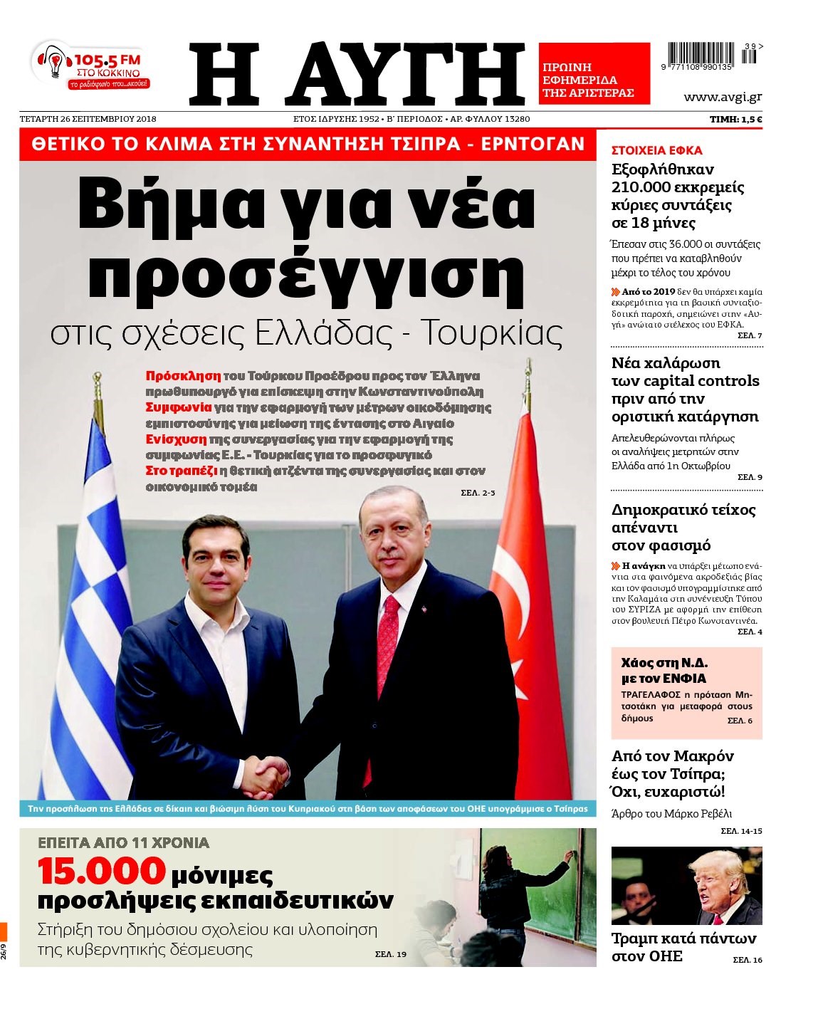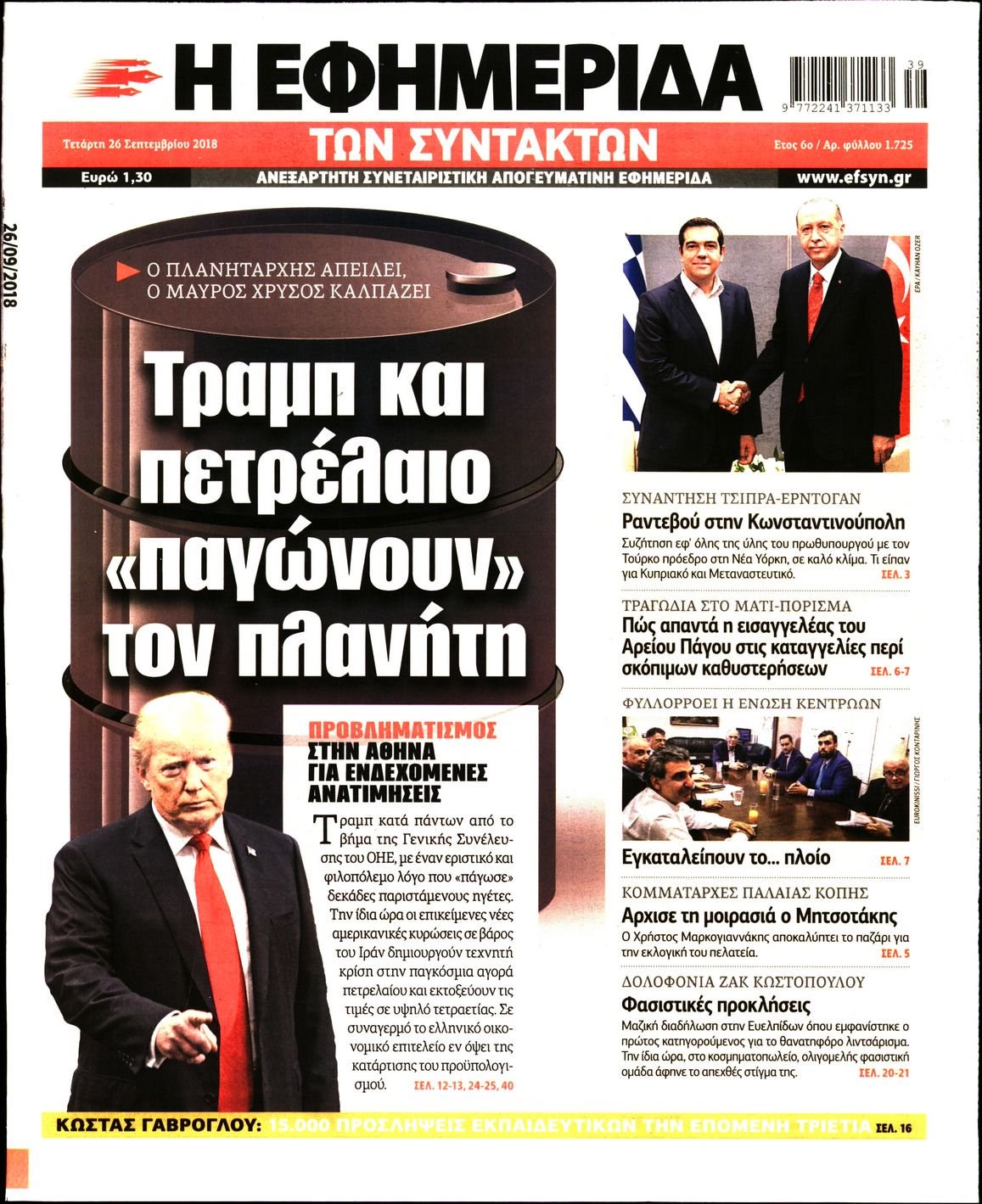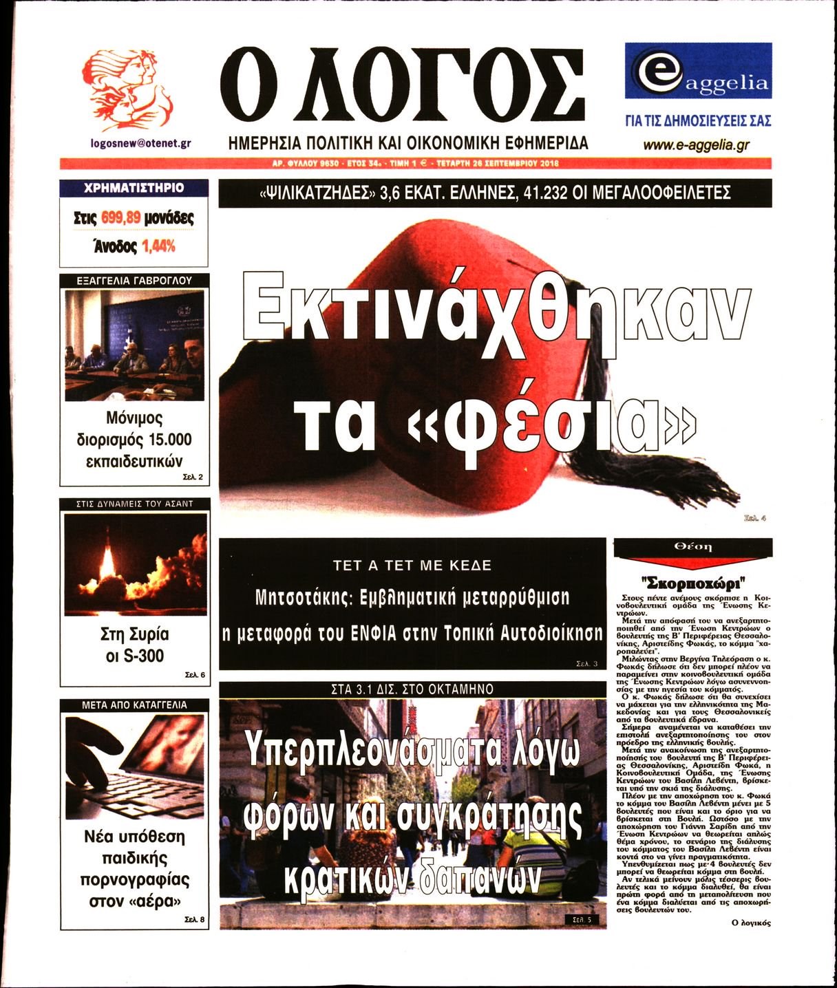 Οι πολιτικές εφημερίδες 26/9/2018 Enikos Newsroom 06:34, Τετάρτη 26 Σεπτεμβρίου 2018 Media Διαβάστε τα πρωτοσέλιδα: ΠΟΛΙΤΙΚΕΣ ΕΦΗΜΕΡΙΔΕΣ ΠΡΩΤΟΣΕΛΙΔΑ Μοιράσου το: σχολίασε κι εσύ (0 σχόλια) Ακολουθήστε το enikos.gr στο Google News και μάθετε πρώτοι όλες τις ειδήσεις Δείτε όλες τις τελευταίες ειδήσεις από την Ελλάδα και τον Κόσμο στο enikos.gr Ειδήσεις Ροή Ειδήσεων 22 λεπτά πριν Ζελένσκι: Μόνο οι ΗΠΑ και ο Τραμπ μπορούν να πιέσουν τη Ρωσία να βάλει τέλος στον πόλεμο 41 λεπτά πριν Φοινικούντα: Προφυλακιστέος ο 30χρονος για συνέργεια στη διπλή δολοφονία – Και άλλα πρόσωπα στο «μικροσκόπιο» 2 ώρες πριν Κυριάκος Μητσοτάκης: Στην Ιερουσαλήμ την Τρίτη ο Πρωθυπουργός για την τριμερή Ελλάδας, Κύπρου, Ισραήλ – Θα συναντηθεί και με τον Αμπάς 5 ώρες πριν Πώς δρούσε το κύκλωμα που διακινούσε ναρκωτικά σε σχολεία – Υπέβαλαν σε βασανιστήρια όσους δεν τηρούσαν τους «κανόνες πειθαρχίας» 1 ώρα πριν Πάπας Λέων: Όταν έχει αϋπνίες επενδύει παραγωγικά τον χρόνο του – Ποιο παιχνίδι παίζει στο κινητό 32 λεπτά πριν Αριθμολογία: Ο αριθμός του φύλακα αγγέλου σας, με βάση τον μήνα γέννησής σας – «Έτσι σας στέλνει σημάδια το σύμπαν» 2 ώρες πριν Πώς να απαλλαγείτε από τη μυρωδιά του τηγανητού φαγητού: Το μυστικό βρίσκεται στην κουζίνα σας 3 ώρες πριν Μήπως οι γιορτές σας δεν είναι τόσο τέλειες; 7 χριστουγεννιάτικες συνήθειες που μαρτυρούν ότι μια οικογένεια είναι δυσλειτουργική 13 ώρες πριν Enerwave: Το νέο «ρεύμα» στη λιανική ενέργειας που αλλάζει την εμπειρία του καταναλωτή 15 λεπτά πριν Εριέττα Μανούρη: «Έχω νιώσει ανταγωνισμό από άντρες, μύθος αυτό που λένε για τις γυναίκες» 22 λεπτά πριν Ζελένσκι: Μόνο οι ΗΠΑ και ο Τραμπ μπορούν να πιέσουν τη Ρωσία να βάλει τέλος στον πόλεμο 32 λεπτά πριν Αριθμολογία: Ο αριθμός του φύλακα αγγέλου σας, με βάση τον μήνα γέννησής σας – «Έτσι σας στέλνει σημάδια το σύμπαν» 41 λεπτά πριν Φοινικούντα: Προφυλακιστέος ο 30χρονος για συνέργεια στη διπλή δολοφονία – Και άλλα πρόσωπα στο «μικροσκόπιο» 52 λεπτά πριν Super League: Ο Σιαμπάνης «κατέβασε ρολά» και ο Βόλος νίκησε 1-0 τον Παναιτωλικό ENIKOS NETWORK Οι γυναίκες αποκαλύπτουν το πιο ελκυστικό πράγμα που μπορεί να κάνει ένας άνδρας Ομορφιά και αντιγήρανση: Ειδικοί μιλούν για συσκευές περιποίησης του δέρματος Εφορία: 7 αλλαγές σε δηλώσεις και ελέγχους ακινήτων – Όλα όσα πρέπει να γνωρίζετε Πορτοκαλί τιμολόγια ρεύματος: Τα σημεία που πρέπει να προσέξουν οι καταναλωτές – Πότε θα εφαρμοστούν Χαρτογραφώντας το «σημείο χωρίς επιστροφή»: Για πρώτη φορά αποκαλύπτεται με λεπτομέρεια το ακανθώδες όριο της ατμόσφαιρας τ... Η Google καταργεί τη λειτουργία «dark web report» – Πώς θα μπορούν οι χρήστες να διαγράφουν τα δεδομένα τους περισσότερα 20:30 , Σάββατο 20 Δεκεμβρίου 2025 Αυτή την Κυριακή με τη Realnews: Instyle, μαζί Drive και Realnews Geopolitics Αυτή την Κυριακή με τη Realnews: Instyle, μαζί Drive και Realnews Geopolitics Instyle Η Άννα Ρ... 20:28 , Σάββατο 20 Δεκεμβρίου 2025 Ο ΑΝΤ1 γεμίζει τις γιορτές με μουσική – Ποιους καλλιτέχνες θα απολαύσουμε Φέτος στον ΑΝΤ1 γιορτάζουμε τις νύχτες μας παρέα με αγαπημένους καλλιτέχνες και μεγάλες μουσι... 18:19 , Σάββατο 20 Δεκεμβρίου 2025 HOTΕΛ ΕΛVIRA: Η Ελβίρα μαθαίνει πως ο Χάρι μένει κρυφά στο ξενοδοχείο του Παντελή Συνεχίζονται οι εκλογές για πρόεδρο, στο νέο επεισόδιο της κωμικής σειράς του MEGA, HOTΕΛ ΕΛVI... 14:04 , Σάββατο 20 Δεκεμβρίου 2025 Η Realnews αυτής της Κυριακής (21/12/2025) Με τίτλο: «Ασπίδα προστασίας για την Ελλάδα» κυκλοφορεί, αυτήν την Κυριακή, η Realnews. Σημαντ... ΤΕΛΕΥΤΑΙΕΣ ΕΙΔΗΣΕΙΣ 