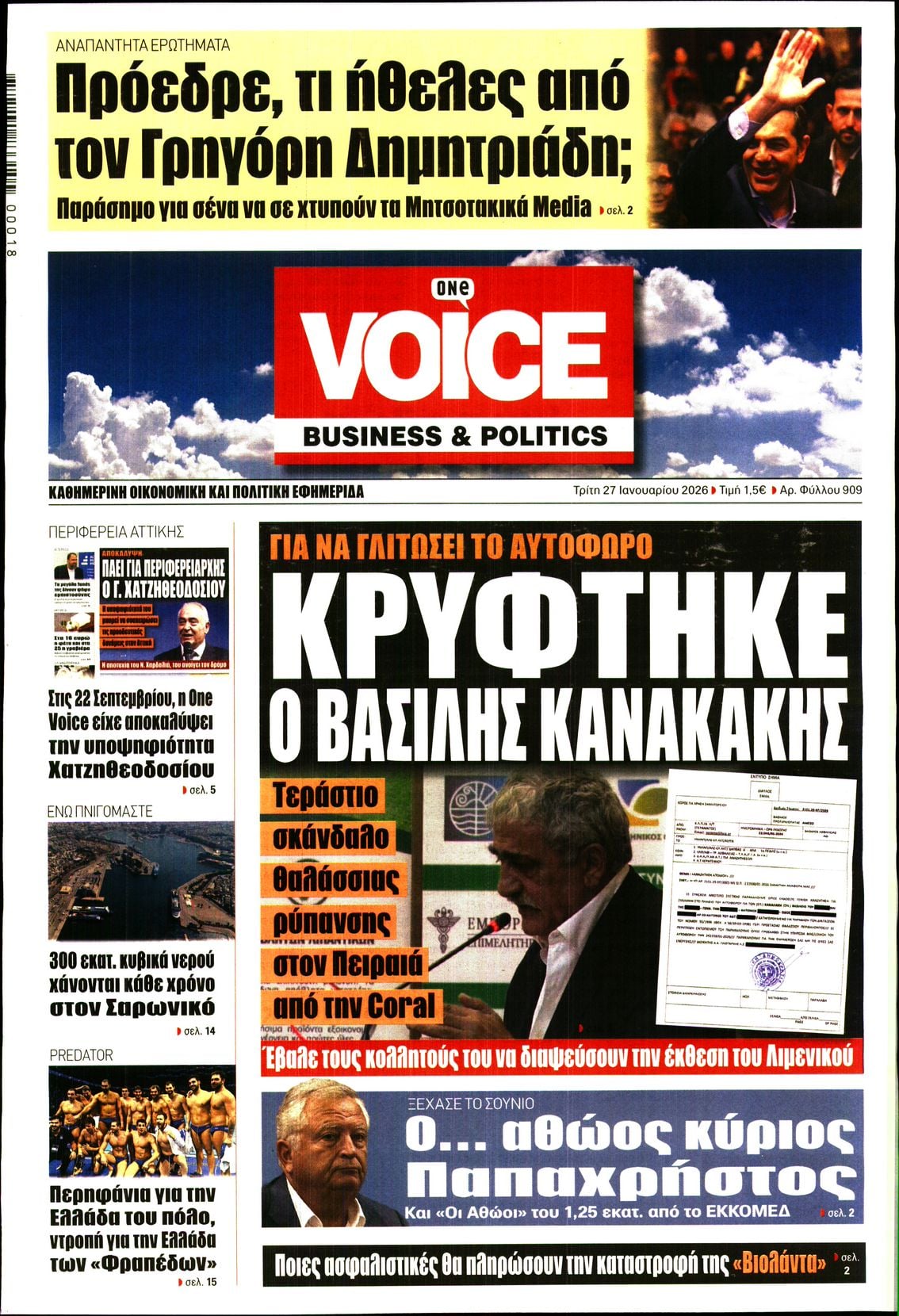 Οι πολιτικές εφημερίδες 27/1/2026 Enikos Newsroom 05:38, Τρίτη 27 Ιανουαρίου 2026 Media Διαβάστε τα πρωτοσέλιδα από τις πολιτικές εφημερίδες, σήμερα 27/1/2026. ΕΦΗΜΕΡΙΔΕΣ ΠΟΛΙΤΙΚΕΣ ΕΦΗΜΕΡΙΔΕΣ ΠΡΩΤΟΣΕΛΙΔΑ Μοιράσου το: σχολίασε κι εσύ (0 σχόλια) Ακολουθήστε το enikos.gr στο Google News και μάθετε πρώτοι όλες τις ειδήσεις Δείτε όλες τις τελευταίες ειδήσεις από την Ελλάδα και τον Κόσμο στο enikos.gr Ειδήσεις Ροή Ειδήσεων 8 ώρες πριν Τρίκαλα – Έκρηξη στο εργοστάσιο «Βιολάντα»: Θρήνος για τις 5 εργαζόμενες που δούλευαν νύχτα για να είναι κοντά στα παιδιά τους – Πού στρέφονται οι έρευνες 12 ώρες πριν Ανατολική Αττική: Οι δραματικές στιγμές διάσωσης των 2 επιβατών του αυτοκινήτου που παρασύρθηκε από χείμαρρο – «Αν δεν είχε “σφηνώσει” στα καλάμια, θα θρηνούσαμε θύματα» 8 ώρες πριν Τραμπ: Ισοπεδώνει το Σύνταγμα και αποδυναμώνει την ICE μετατρέποντάς την σε φόβητρο των πολιτών – Τα σχέδια νοθείας των ενδιάμεσων εκλογών 11 ώρες πριν Δήμαρχος Σιντικής στο enikos.gr: Περνάμε δύσκολες στιγμές, είναι κρίσιμη η κατάσταση – Εάν συνεχίσει η βροχή θα κινδυνεύσει το Σιδηρόκαστρο – ΒΙΝΤΕΟ 10 ώρες πριν ΗΠΑ: Τουλάχιστον 21 νεκροί από το πολικό ψύχος – Στο σκοτάδι πάνω από 800.000 νοικοκυριά, έχουν ακυρωθεί 19.000 πτήσεις – ΦΩΤΟ 46 λεπτά πριν Οπτική ψευδαίσθηση: Μόνο αν είσαι ο Σέρλοκ Χολμς θα βρεις τα 6 πουλάκια σε 15 δευτερόλεπτα 1 ώρα πριν Μακροζωία: Η τροφή που μπορεί να σας βοηθήσει να ζήσετε μέχρι τα 100, σύμφωνα με ειδικό 4 ώρες πριν Τα ζώδια σήμερα, Τρίτη 27 Ιανουαρίου 2026: Αιγόκεροι, μην περιμένετε από τους άλλους να σας πουν αν αξίζετε 10 ώρες πριν Αριθμολογία: Οι γρουσούζικοι αριθμοί για κάθε ζώδιο – «Καλύτερα να τους αποφεύγετε» 30 λεπτά πριν ΔΕΔΔΗΕ: Διακοπές ρεύματος σήμερα (27/1) στην Αθήνα και σε άλλες 8 περιοχές της Αττικής 46 λεπτά πριν Οπτική ψευδαίσθηση: Μόνο αν είσαι ο Σέρλοκ Χολμς θα βρεις τα 6 πουλάκια σε 15 δευτερόλεπτα 52 λεπτά πριν Είδος πολυτελείας για τους Έλληνες καταναλωτές ο καθημερινός καφές – Ανατιμήθηκε 20,9% σε ένα χρόνο, ενώ παγκοσμίως η τιμή του πέφτει – Δείτε βίντεο 1 ώρα πριν Μακροζωία: Η τροφή που μπορεί να σας βοηθήσει να ζήσετε μέχρι τα 100, σύμφωνα με ειδικό 1 ώρα πριν Σαν σήμερα 27 Ιανουαρίου: Τα σημαντικότερα γεγονότα της ημέρας ENIKOS NETWORK Βρείτε τις 3 διαφορές στη φωτό με το αγόρι που φωνάζει στην κορυφή του βουνού μέσα σε 29″ και λύστε το τεστ παρατηρητικότητ... Το βότανο της μεσαιωνικής Ευρώπης που μπορεί να μειώσει τη φλεγμονή και να έχει αντικαρκινική δράση Συντάξεις: Πόσο βελτιωμένες αναμένονται το 2026, λόγω των αυξήσεων – Οι μεγαλύτερες και οι μικρότερες Επίδομα παιδιού: Πότε αναμένονται οι αλλαγές για το 2026 – Τι μένει ίδιο AI: Ολοκληρώστε τις δουλειές σας φωνάζοντας στο τηλέφωνό σας – Πώς λειτουργεί το Todoist Ramble Κουίζ: Πόσο καλοί είστε στην ελληνική μυθολογία; Δοκιμάστε τις γνώσεις σας και κάντε το 3 στα 3 περισσότερα 04:50 , Τρίτη 27 Ιανουαρίου 2026 MasterChef: Ποιοί είναι οι δύο πρώτοι διαγωνιζόμενοι που αποχώρησαν με το «καλημέρα» – Δείτε βίντεο Απαιτητική από τα πρώτα ήδη λεπτά αποδείχθηκε η πρώτη μαγειρική δοκιμασία του MasterChef τη Δε... 21:30 , Δευτέρα 26 Ιανουαρίου 2026 Άγιος έρωτας: Ο Μαρκόπουλος συναντά για πρώτη φορά την εγγονή του Η Χριστίνα θέλει να υιοθετήσουν το μωρό της Ρίτας ο Χάρης και η Αναστασία στο νέο επεισόδιο τη... 20:22 , Δευτέρα 26 Ιανουαρίου 2026 MasterChef: Δεκαεπτά παίκτες περνάνε στη φάση της τελικής επιλογής, απόψε στις 21:00 στο Star Απόψε, Δευτέρα 26 Ιανουαρίου, μπαίνουν στην ανανεωμένη κουζίνα του 