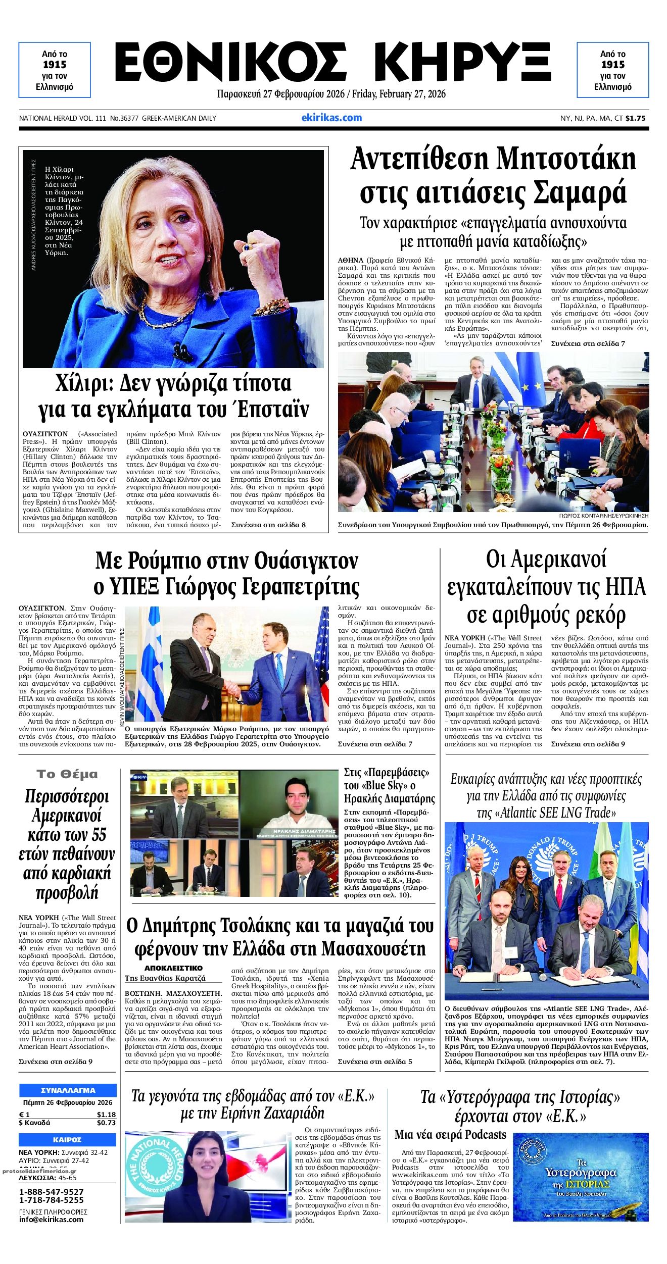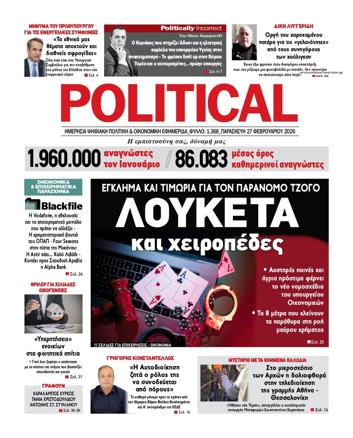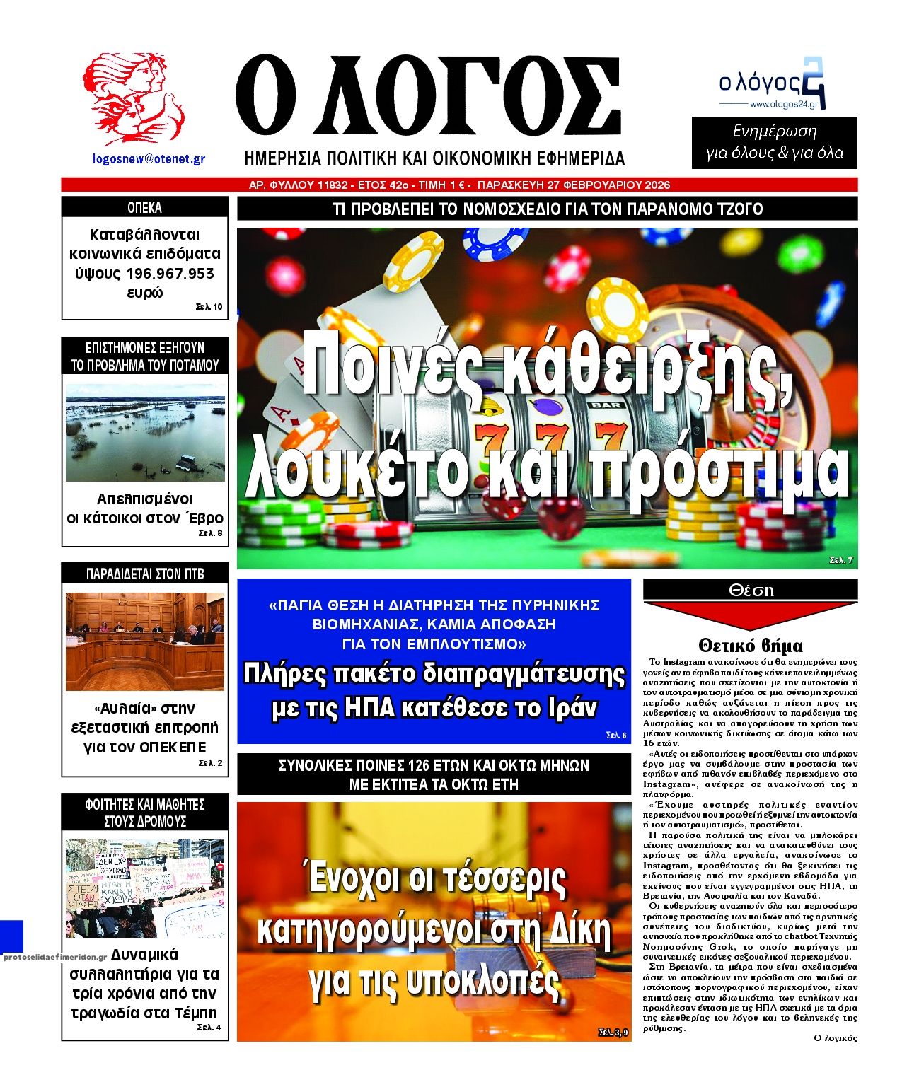 Οι πολιτικές εφημερίδες 27/2/2026 Enikos Newsroom 05:38, Παρασκευή 27 Φεβρουαρίου 2026 Media Διαβάστε τα πρωτοσέλιδα από τις πολιτικές εφημερίδες, σήμερα 27/2/2026. ΕΦΗΜΕΡΙΔΕΣ ΠΟΛΙΤΙΚΕΣ ΕΦΗΜΕΡΙΔΕΣ ΠΡΩΤΟΣΕΛΙΔΑ Μοιράσου το: WSJ: Τελεσίγραφο ΗΠΑ στο Ιράν να καταστρέψει τις πυρηνικές εγκαταστάσεις και να παραδώσει όλο το εμπλουτισμένο ουράνιο Χίλαρι Κλίντον στην εξεταστική επιτροπή: «Δεν γνωρίζαμε τίποτα για τα εγκλήματα του Επστάιν» – «Να καλέσετε τον Τραμπ» Ιράν: «Μυστήρια» πυρκαγιά σε βιομηχανικό συγκρότημα στο Αμπαντάν – «Εκτός ελέγχου» αναφέρουν οι αρχές σχολίασε κι εσύ (0 σχόλια) Ακολουθήστε το enikos.gr στο Google News και μάθετε πρώτοι όλες τις ειδήσεις Δείτε όλες τις τελευταίες ειδήσεις από την Ελλάδα και τον Κόσμο στο enikos.gr Ειδήσεις Ροή Ειδήσεων 7 λεπτά πριν Καύσιμα: Πού πωλείται η φθηνότερη και πού η ακριβότερη βενζίνη- Πόσο αυξήθηκε το πετρέλαιο κίνησης και θέρμανσης 8 ώρες πριν Θρίλερ με το ακέφαλο πτώμα στη Χαλκιδική: «Εκεί που βρέθηκε δεν πάει εύκολα άνθρωπος» λέει στο enikos.gr ο πρόεδρος Πευκοχωρίου 8 ώρες πριν Προκλητική επιστολή Τουρκίας στον ΟΗΕ: Επιμένει στις θέσεις για «Γαλάζια Πατρίδα» και τουρκολιβυκό μνημόνιο 9 ώρες πριν Σε τυχαίο έλεγχο σε δρόμο του Βερολίνου εντοπίστηκε η 16χρονη Λόρα – Τα επόμενα βήματα και η αντίδραση του πατέρα της 3 ώρες πριν WSJ: Τελεσίγραφο ΗΠΑ στο Ιράν να καταστρέψει τις πυρηνικές εγκαταστάσεις και να παραδώσει όλο το εμπλουτισμένο ουράνιο 1 ώρα πριν Οπτική ψευδαίσθηση: Μόνο αν έχετε παρατηρητικότητα ντετέκτιβ, θα εντοπίσετε τη γάτα στην εικόνα σε 15 δευτερόλεπτα 1 ώρα πριν Υγεία του εντέρου: Το λαχανικό που ενισχύει το πεπτικό σύστημα και βελτιώνει την διάθεση, σύμφωνα με μελέτη 4 ώρες πριν Ζώδια 27/2: Ημερήσιες προβλέψεις – Παρθένοι, μην ενθουσιαστείτε υπερβολικά με κάποιον που δεν ξέρετε ακόμα καλά 9 ώρες πριν Ύπνος: Δυσκολεύεστε να κοιμηθείτε; Ίσως σας λείπει ένα βασικό μέταλλο, σύμφωνα με μελέτη 41 λεπτά πριν Στο real taste & style που κυκλοφορεί με τη Realnews 6 λεπτά πριν ρεπορτάζ 6 λεπτά πριν podcasts 6 λεπτά πριν 6 λεπτά πριν travel ENIKOS NETWORK Ποια διάσημη προσωπικότητα που όλοι αγαπάμε κρύβεται σε αυτό το τεστ οπτικής αντίληψης – Μπορείτε να το λύσετε σε 15 δευτερ... Το παραδοσιακό φρούτο της Καρνάτακα που μπορεί να ενισχύσει τον μεταβολισμό και να ανακουφίσει από προβλήματα του πεπτικού ΥΠΕΘΟΟ – ΑΑΔΕ: Παρατείνεται έως τις 30 Απριλίου η προθεσμία για τις δηλώσεις και την καταβολή φόρου πλοίων Α’ κατηγορίας Μειώθηκαν καταθέσεις και δάνεια τον Ιανουάριο – Τα στοιχεία της Τράπεζας της Ελλάδας Ευπάθεια στο moltbook ai αποκαλύπτει email, tokens σύνδεσης και api keys Αυτός είναι ο ρόλος της μικρής τρύπας στους νυχοκόπτες – «Είμαι ο μόνος που δεν το ήξερε;»» περισσότερα 04:10 , Παρασκευή 27 Φεβρουαρίου 2026 MasterChef: Ο Μάριος έχασε από τον Χάρη και τη Φιλιώ και αποχώρησε – Δείτε το συγκινητικό «αντίο» Σε μία από τις πιο συναισθηματικά φορτισμένες δοκιμασίες της σεζόν, οι τρεις διαγωνιζόμενοι τω... 20:18 , Πέμπτη 26 Φεβρουαρίου 2026 Το σπίτι δίπλα στο ποτάμι: Η Ασπασία δέχεται μια απρόσμενη έκπληξη από τον Σταύρο Νέες περιπέτειες για τις τέσσερις αδερφές της σειράς “Το σπίτι δίπλα από το ποτάμι“... 18:20 , Πέμπτη 26 Φεβρουαρίου 2026 Έχω Παιδιά: Η Σάρα και ο Μιχάλης αποφασίζουν να γίνουν πρότυπο ειλικρίνειας για τα παιδιά τους Ασκήσεις ειλικρίνειας από γονείς σε παιδιά, απόψε, στο νέο επεισόδιο της κωμικής σειράς «Έχω Π... 17:10 , Πέμπτη 26 Φεβρουαρίου 2026 Το σόι σου: Ο Αποστόλης Τότσικας μπαί