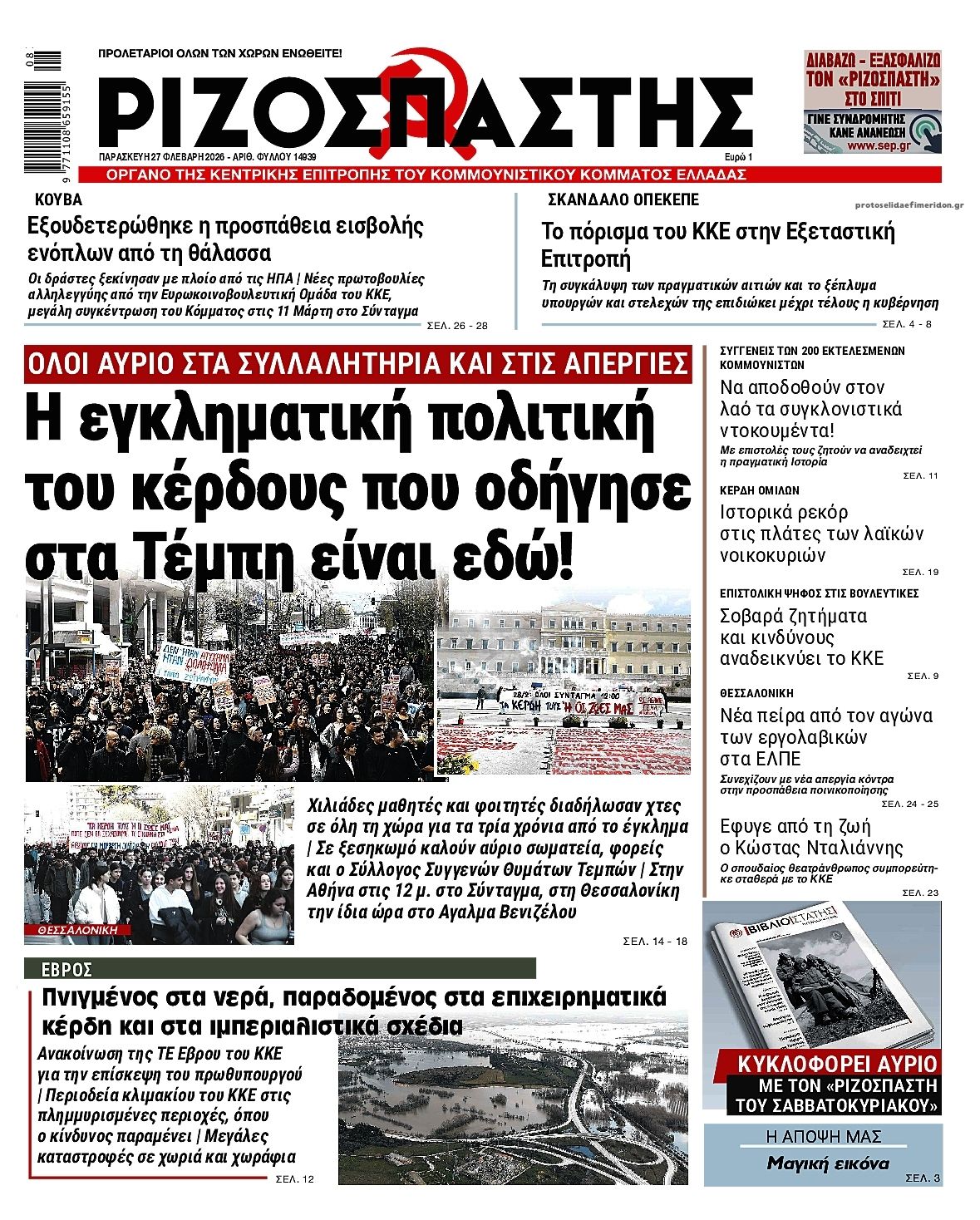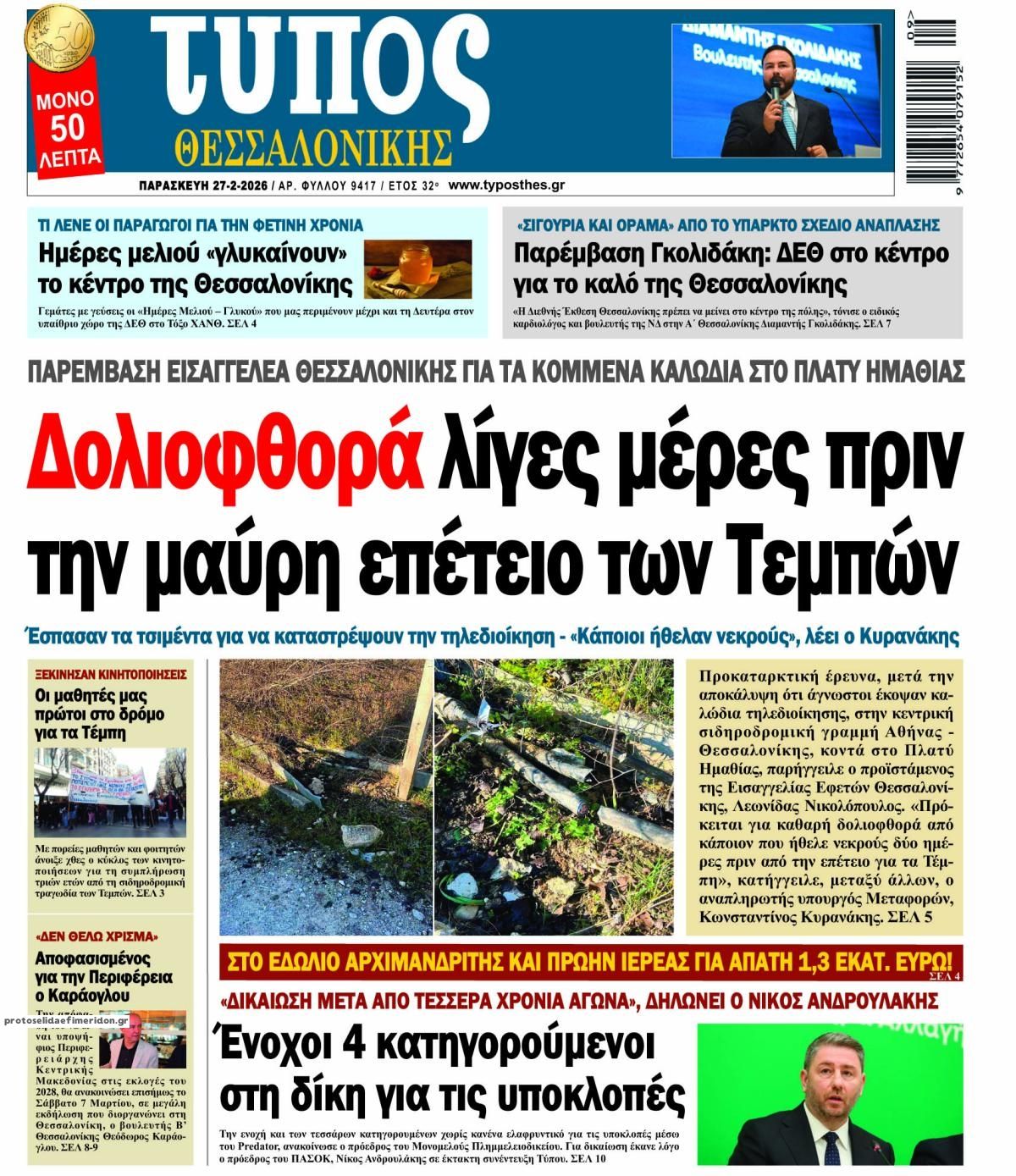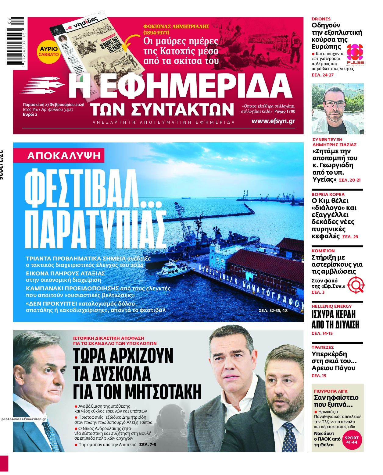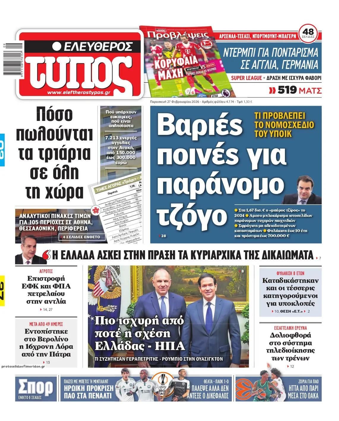 Οι πολιτικές εφημερίδες 27/2/2026 Enikos Newsroom 05:38, Παρασκευή 27 Φεβρουαρίου 2026 Media Διαβάστε τα πρωτοσέλιδα από τις πολιτικές εφημερίδες, σήμερα 27/2/2026. ΕΦΗΜΕΡΙΔΕΣ ΠΟΛΙΤΙΚΕΣ ΕΦΗΜΕΡΙΔΕΣ ΠΡΩΤΟΣΕΛΙΔΑ Μοιράσου το: WSJ: Τελεσίγραφο ΗΠΑ στο Ιράν να καταστρέψει τις πυρηνικές εγκαταστάσεις και να παραδώσει όλο το εμπλουτισμένο ουράνιο Χίλαρι Κλίντον στην εξεταστική επιτροπή: «Δεν γνωρίζαμε τίποτα για τα εγκλήματα του Επστάιν» – «Να καλέσετε τον Τραμπ» Ιράν: «Μυστήρια» πυρκαγιά σε βιομηχανικό συγκρότημα στο Αμπαντάν – «Εκτός ελέγχου» αναφέρουν οι αρχές σχολίασε κι εσύ (0 σχόλια) Ακολουθήστε το enikos.gr στο Google News και μάθετε πρώτοι όλες τις ειδήσεις Δείτε όλες τις τελευταίες ειδήσεις από την Ελλάδα και τον Κόσμο στο enikos.gr Ειδήσεις Ροή Ειδήσεων 7 λεπτά πριν Καύσιμα: Πού πωλείται η φθηνότερη και πού η ακριβότερη βενζίνη- Πόσο αυξήθηκε το πετρέλαιο κίνησης και θέρμανσης 8 ώρες πριν Θρίλερ με το ακέφαλο πτώμα στη Χαλκιδική: «Εκεί που βρέθηκε δεν πάει εύκολα άνθρωπος» λέει στο enikos.gr ο πρόεδρος Πευκοχωρίου 8 ώρες πριν Προκλητική επιστολή Τουρκίας στον ΟΗΕ: Επιμένει στις θέσεις για «Γαλάζια Πατρίδα» και τουρκολιβυκό μνημόνιο 9 ώρες πριν Σε τυχαίο έλεγχο σε δρόμο του Βερολίνου εντοπίστηκε η 16χρονη Λόρα – Τα επόμενα βήματα και η αντίδραση του πατέρα της 3 ώρες πριν WSJ: Τελεσίγραφο ΗΠΑ στο Ιράν να καταστρέψει τις πυρηνικές εγκαταστάσεις και να παραδώσει όλο το εμπλουτισμένο ουράνιο 1 ώρα πριν Οπτική ψευδαίσθηση: Μόνο αν έχετε παρατηρητικότητα ντετέκτιβ, θα εντοπίσετε τη γάτα στην εικόνα σε 15 δευτερόλεπτα 1 ώρα πριν Υγεία του εντέρου: Το λαχανικό που ενισχύει το πεπτικό σύστημα και βελτιώνει την διάθεση, σύμφωνα με μελέτη 4 ώρες πριν Ζώδια 27/2: Ημερήσιες προβλέψεις – Παρθένοι, μην ενθουσιαστείτε υπερβολικά με κάποιον που δεν ξέρετε ακόμα καλά 9 ώρες πριν Ύπνος: Δυσκολεύεστε να κοιμηθείτε; Ίσως σας λείπει ένα βασικό μέταλλο, σύμφωνα με μελέτη 41 λεπτά πριν Στο real taste & style που κυκλοφορεί με τη Realnews 6 λεπτά πριν ρεπορτάζ 6 λεπτά πριν podcasts 6 λεπτά πριν 6 λεπτά πριν travel ENIKOS NETWORK Ποια διάσημη προσωπικότητα που όλοι αγαπάμε κρύβεται σε αυτό το τεστ οπτικής αντίληψης – Μπορείτε να το λύσετε σε 15 δευτερ... Το παραδοσιακό φρούτο της Καρνάτακα που μπορεί να ενισχύσει τον μεταβολισμό και να ανακουφίσει από προβλήματα του πεπτικού ΥΠΕΘΟΟ – ΑΑΔΕ: Παρατείνεται έως τις 30 Απριλίου η προθεσμία για τις δηλώσεις και την καταβολή φόρου πλοίων Α’ κατηγορίας Μειώθηκαν καταθέσεις και δάνεια τον Ιανουάριο – Τα στοιχεία της Τράπεζας της Ελλάδας Ευπάθεια στο moltbook ai αποκαλύπτει email, tokens σύνδεσης και api keys Αυτός είναι ο ρόλος της μικρής τρύπας στους νυχοκόπτες – «Είμαι ο μόνος που δεν το ήξερε;»» περισσότερα 04:10 , Παρασκευή 27 Φεβρουαρίου 2026 MasterChef: Ο Μάριος έχασε από τον Χάρη και τη Φιλιώ και αποχώρησε – Δείτε το συγκινητικό «αντίο» Σε μία από τις πιο συναισθηματικά φορτισμένες δοκιμασίες της σεζόν, οι τρεις διαγωνιζόμενοι τω... 20:18 , Πέμπτη 26 Φεβρουαρίου 2026 Το σπίτι δίπλα στο ποτάμι: Η Ασπασία δέχεται μια απρόσμενη έκπληξη από τον Σταύρο Νέες περιπέτειες για τις τέσσερις αδερφές της σειράς “Το σπίτι δίπλα από το ποτάμι“... 18:20 , Πέμπτη 26 Φεβρουαρίου 2026 Έχω Παιδιά: Η Σάρα και ο Μιχάλης αποφασίζουν να γίνουν πρότυπο ειλικρίνειας για τα παιδιά τους Ασκήσεις ειλικρίνειας από γονείς σε παιδιά, απόψε, στο νέο επεισόδιο της κωμικής σειράς «Έχω Π... 17:10 , Πέμπτη 26 Φεβρουαρίου 2026 Το σόι σου: Ο Αποστόλης Τότσικας μπαί