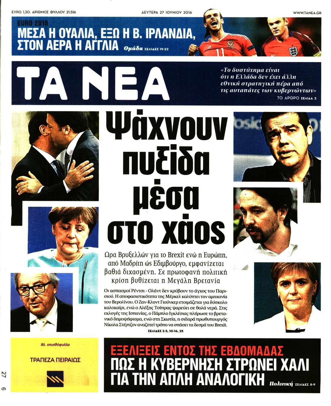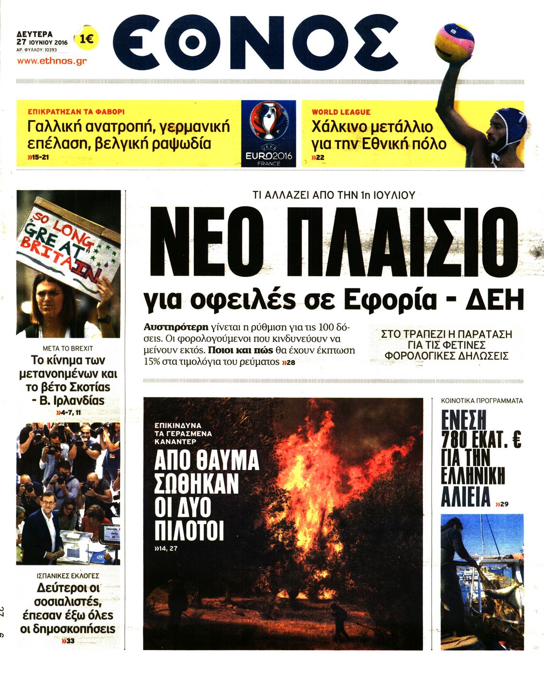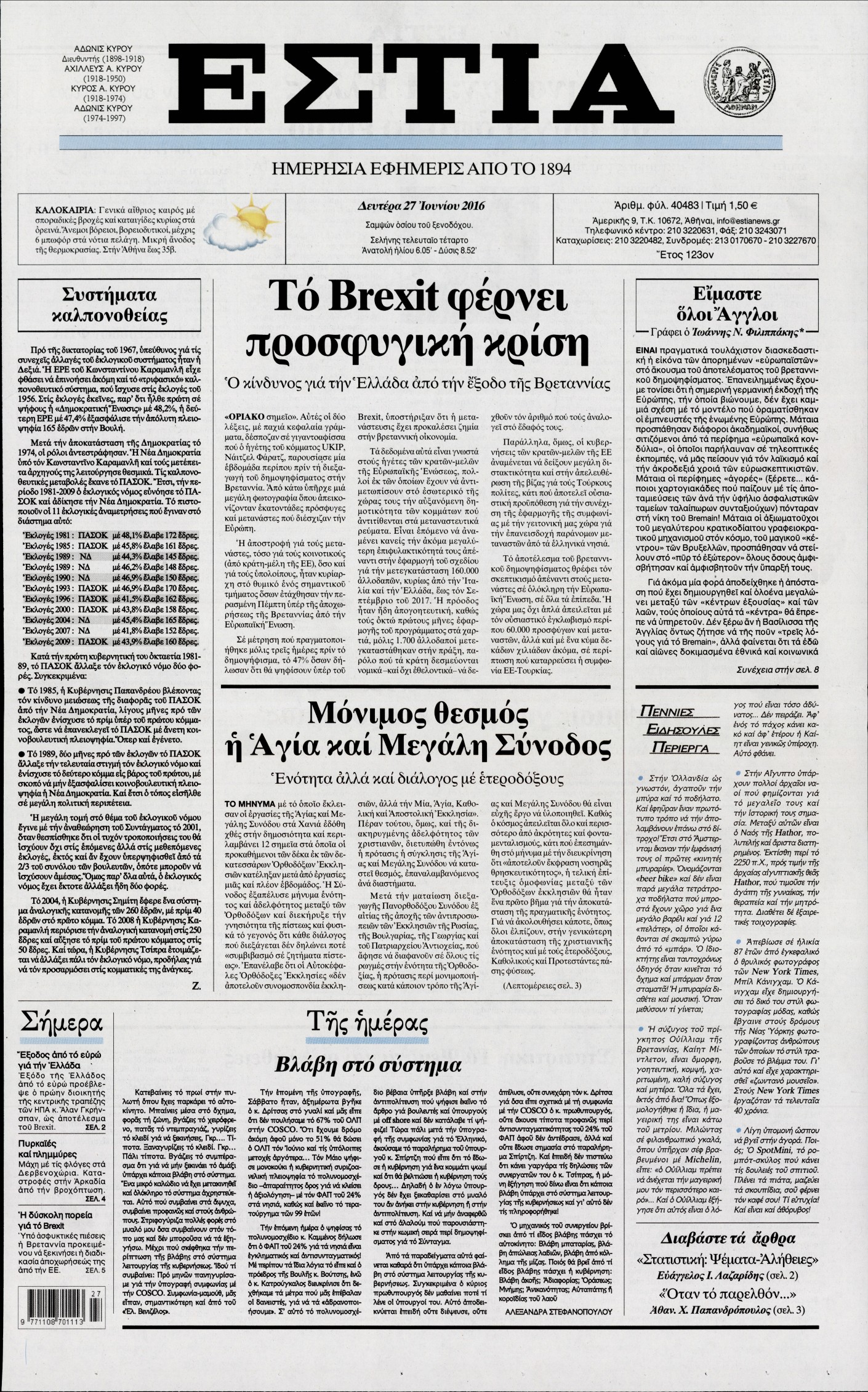 Oι πολιτικές εφημερίδες 27-6-2016 Enikos Newsroom 05:58, Δευτέρα 27 Ιουνίου 2016 Media Διαβάστε τα σημερινά πρωτοσέλιδα των πολιτικών εφημερίδων: ΠΟΛΙΤΙΚΕΣ ΕΦΗΜΕΡΙΔΕΣ ΠΡΩΤΟΣΕΛΙΔΑ Μοιράσου το: σχολίασε κι εσύ (0 σχόλια) Ακολουθήστε το enikos.gr στο Google News και μάθετε πρώτοι όλες τις ειδήσεις Δείτε όλες τις τελευταίες ειδήσεις από την Ελλάδα και τον Κόσμο στο enikos.gr Ειδήσεις Ροή Ειδήσεων 3 ώρες πριν Υπόθεση Έπσταϊν: Το Υπουργείο Δικαιοσύνης δημοσιοποίησε μια σειρά από εξαιρετικά επεξεργασμένα αρχεία – «Λείπουν τα πιο σημαντικά έγγραφα», λένε οι Δημοκρατικοί 20 λεπτά πριν Γιορτές με μπλόκα για τους αγρότες: Ανοίγουν διόδια και μοιράζουν προϊόντα στους ταξιδιώτες 53 λεπτά πριν Εξαφάνιση 33χρονου γιατρού στην Κρήτη: «Άναψα τα φώτα, τρόμαξε και άρχισε να τρέχει στα χωράφια» – Η τελευταία διαδρομή και η μαρτυρία «κλειδί» 2 ώρες πριν Ο «χάρτης» με τις αυξήσεις και τις φοροελαφρύνσεις του 2026 – Ποιοι και πόσα κερδίζουν 36 λεπτά πριν Τα αρχεία του Έπσταϊν αποκαλύπτουν φωτογραφία του έκπτωτου πρίγκιπα Άντριου – Είναι ξαπλωμένος στην αγκαλιά 5 γυναικών 43 λεπτά πριν Μία νέα «χρυσή» περίοδος αρχίζει για 3 ζώδια από σήμερα – «Μία αναπάντεχη ευκαιρία οδηγεί στην επιτυχία» 5 ώρες πριν Αυγά: Πόσα μπορείτε να τρώτε την ημέρα με ασφάλεια για μέγιστη πρόσληψη πρωτεΐνης 3 ώρες πριν Αρχαιολόγοι ανακάλυψαν σε χωράφι απεικόνιση 600 ετών ενός Αγίου – Τα στοιχεία που δείχνουν ότι μαρτύρησε 2 ώρες πριν Αγχώνεται για το χριστουγεννιάτικο δώρο που πήρε στην πλούσια σύντροφό του – «Φοβάμαι πως θα το βρει φθηνιάρικο, φοράει βραχιόλια Cartier» 5 λεπτά πριν Πώς η κλιματική αλλαγή επηρεάζει εγκύους και βρέφη – Οι επιπτώσεις των υψηλών θερμοκρασιών 12 λεπτά πριν e-ΕΦΚΑ και ΔΥΠΑ: Οι πληρωμές από 22 έως 24 Δεκεμβρίου – Ποιοι θα δουν χρήματα στους λογαριασμούς τους 20 λεπτά πριν Συνελήφθη οδηγός μηχανής που έτρεχε με 161 χλμ στη Συγγρού – Τον έπιασε το ραντάρ της Τροχαίας 20 λεπτά πριν Γιορτές με μπλόκα για τους αγρότες: Ανοίγουν διόδια και μοιράζουν προϊόντα στους ταξιδιώτες 29 λεπτά πριν Τηλεθέαση (19/12): Κυριάρχησε η σειρά «Το σόι σου» – Τι νούμερα έκανε ο τελικός του GNTM ENIKOS NETWORK Είστε μόνιμα απρόσεκτοι; 3 σημάδια που δείχνουν ότι μπορεί να είναι σύμπτωμα πάθησης Πόσα κιλά παίρνουμε πραγματικά τα Χριστούγεννα, σύμφωνα με την επιστήμη – Πώς να το αποτρέψουμε; Επίδομα παιδιού: Τι αλλάζει από το 2026 – Το όφελος από τις φορολογικές ελαφρύνσεις Mega χριστουγεννιάτικη φορολοταρία: «Κλείδωσε» η ημερομηνία για την κλήρωση – Ερωτήσεις και απαντήσεις Χαρτογραφώντας το «σημείο χωρίς επιστροφή»: Για πρώτη φορά αποκαλύπτεται με λεπτομέρεια το ακανθώδες όριο της ατμόσφαιρας τ... Η Google καταργεί τη λειτουργία «dark web report» – Πώς θα μπορούν οι χρήστες να διαγράφουν τα δεδομένα τους περισσότερα 09:30 , Σάββατο 20 Δεκεμβρίου 2025 «Porto Leone: Στη γειτονιά με τα κόκκινα φανάρια» – Ο Χρόνης αποκαλύπτει στην Αλεξάνδρα το μυστικό για το παιδί της Λένας Η μεγάλη δραματική σειρά του Apha «Porto Leone: Στη γειτονιά με τα κόκκινα φανάρια» μας μεταφέ... 08:14 , Σάββατο 20 Δεκεμβρίου 2025 Τρομεροί γονείς: Η Μαρία Καβογιάννη εισβάλλει στο σπίτι της οικογένειας Στεφανίδη Όσα θα δούμε στο νέο διπλό επεισόδιο της σειράς «Τρομεροί γονείς», σήμερα Σάββατο 20 Δεκεμβρίο... 05:48 , Σάββατο 20 Δεκεμβρίου 2025 Οι οικονομικές εφημερίδες 20/12/2025 Διαβάστε τα πρωτοσέλιδα από τις οικονομικές εφημερίδες, σήμερα 20/12/2025. 05:43 , Σάββατο 20 Δεκεμβρίου 2025 Οι αθλητικές εφημερίδες 20/12/2025 Διαβάστε τ