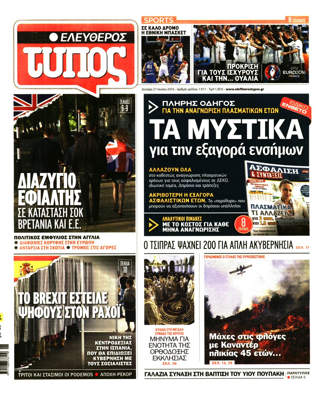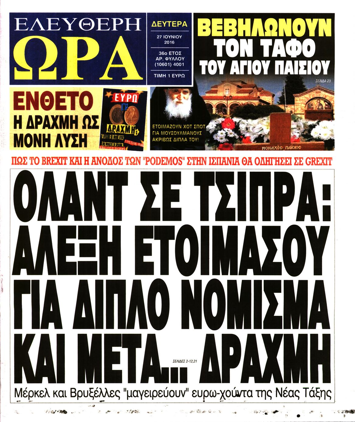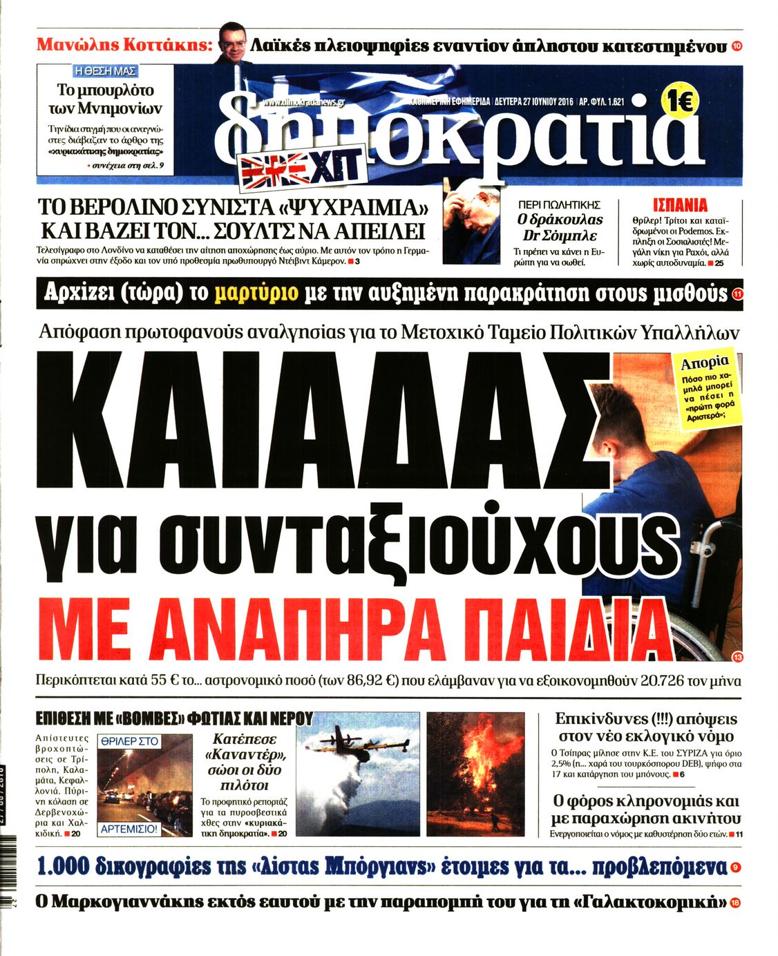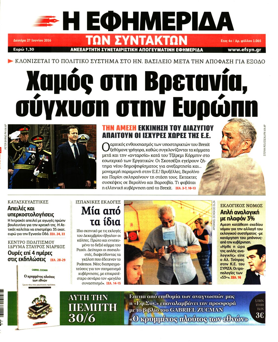 Oι πολιτικές εφημερίδες 27-6-2016 Enikos Newsroom 05:58, Δευτέρα 27 Ιουνίου 2016 Media Διαβάστε τα σημερινά πρωτοσέλιδα των πολιτικών εφημερίδων: ΠΟΛΙΤΙΚΕΣ ΕΦΗΜΕΡΙΔΕΣ ΠΡΩΤΟΣΕΛΙΔΑ Μοιράσου το: σχολίασε κι εσύ (0 σχόλια) Ακολουθήστε το enikos.gr στο Google News και μάθετε πρώτοι όλες τις ειδήσεις Δείτε όλες τις τελευταίες ειδήσεις από την Ελλάδα και τον Κόσμο στο enikos.gr Ειδήσεις Ροή Ειδήσεων 3 ώρες πριν Υπόθεση Έπσταϊν: Το Υπουργείο Δικαιοσύνης δημοσιοποίησε μια σειρά από εξαιρετικά επεξεργασμένα αρχεία – «Λείπουν τα πιο σημαντικά έγγραφα», λένε οι Δημοκρατικοί 20 λεπτά πριν Γιορτές με μπλόκα για τους αγρότες: Ανοίγουν διόδια και μοιράζουν προϊόντα στους ταξιδιώτες 53 λεπτά πριν Εξαφάνιση 33χρονου γιατρού στην Κρήτη: «Άναψα τα φώτα, τρόμαξε και άρχισε να τρέχει στα χωράφια» – Η τελευταία διαδρομή και η μαρτυρία «κλειδί» 2 ώρες πριν Ο «χάρτης» με τις αυξήσεις και τις φοροελαφρύνσεις του 2026 – Ποιοι και πόσα κερδίζουν 36 λεπτά πριν Τα αρχεία του Έπσταϊν αποκαλύπτουν φωτογραφία του έκπτωτου πρίγκιπα Άντριου – Είναι ξαπλωμένος στην αγκαλιά 5 γυναικών 43 λεπτά πριν Μία νέα «χρυσή» περίοδος αρχίζει για 3 ζώδια από σήμερα – «Μία αναπάντεχη ευκαιρία οδηγεί στην επιτυχία» 5 ώρες πριν Αυγά: Πόσα μπορείτε να τρώτε την ημέρα με ασφάλεια για μέγιστη πρόσληψη πρωτεΐνης 3 ώρες πριν Αρχαιολόγοι ανακάλυψαν σε χωράφι απεικόνιση 600 ετών ενός Αγίου – Τα στοιχεία που δείχνουν ότι μαρτύρησε 2 ώρες πριν Αγχώνεται για το χριστουγεννιάτικο δώρο που πήρε στην πλούσια σύντροφό του – «Φοβάμαι πως θα το βρει φθηνιάρικο, φοράει βραχιόλια Cartier» 5 λεπτά πριν Πώς η κλιματική αλλαγή επηρεάζει εγκύους και βρέφη – Οι επιπτώσεις των υψηλών θερμοκρασιών 12 λεπτά πριν e-ΕΦΚΑ και ΔΥΠΑ: Οι πληρωμές από 22 έως 24 Δεκεμβρίου – Ποιοι θα δουν χρήματα στους λογαριασμούς τους 20 λεπτά πριν Συνελήφθη οδηγός μηχανής που έτρεχε με 161 χλμ στη Συγγρού – Τον έπιασε το ραντάρ της Τροχαίας 20 λεπτά πριν Γιορτές με μπλόκα για τους αγρότες: Ανοίγουν διόδια και μοιράζουν προϊόντα στους ταξιδιώτες 29 λεπτά πριν Τηλεθέαση (19/12): Κυριάρχησε η σειρά «Το σόι σου» – Τι νούμερα έκανε ο τελικός του GNTM ENIKOS NETWORK Είστε μόνιμα απρόσεκτοι; 3 σημάδια που δείχνουν ότι μπορεί να είναι σύμπτωμα πάθησης Πόσα κιλά παίρνουμε πραγματικά τα Χριστούγεννα, σύμφωνα με την επιστήμη – Πώς να το αποτρέψουμε; Επίδομα παιδιού: Τι αλλάζει από το 2026 – Το όφελος από τις φορολογικές ελαφρύνσεις Mega χριστουγεννιάτικη φορολοταρία: «Κλείδωσε» η ημερομηνία για την κλήρωση – Ερωτήσεις και απαντήσεις Χαρτογραφώντας το «σημείο χωρίς επιστροφή»: Για πρώτη φορά αποκαλύπτεται με λεπτομέρεια το ακανθώδες όριο της ατμόσφαιρας τ... Η Google καταργεί τη λειτουργία «dark web report» – Πώς θα μπορούν οι χρήστες να διαγράφουν τα δεδομένα τους περισσότερα 09:30 , Σάββατο 20 Δεκεμβρίου 2025 «Porto Leone: Στη γειτονιά με τα κόκκινα φανάρια» – Ο Χρόνης αποκαλύπτει στην Αλεξάνδρα το μυστικό για το παιδί της Λένας Η μεγάλη δραματική σειρά του Apha «Porto Leone: Στη γειτονιά με τα κόκκινα φανάρια» μας μεταφέ... 08:14 , Σάββατο 20 Δεκεμβρίου 2025 Τρομεροί γονείς: Η Μαρία Καβογιάννη εισβάλλει στο σπίτι της οικογένειας Στεφανίδη Όσα θα δούμε στο νέο διπλό επεισόδιο της σειράς «Τρομεροί γονείς», σήμερα Σάββατο 20 Δεκεμβρίο... 05:48 , Σάββατο 20 Δεκεμβρίου 2025 Οι οικονομικές εφημερίδες 20/12/2025 Διαβάστε τα πρωτοσέλιδα από τις οικονομικές εφημερίδες, σήμερα 20/12/2025. 05:43 , Σάββατο 20 Δεκεμβρίου 2025 Οι αθλητικές εφημερίδες 20/12/2025 Διαβάστε τ