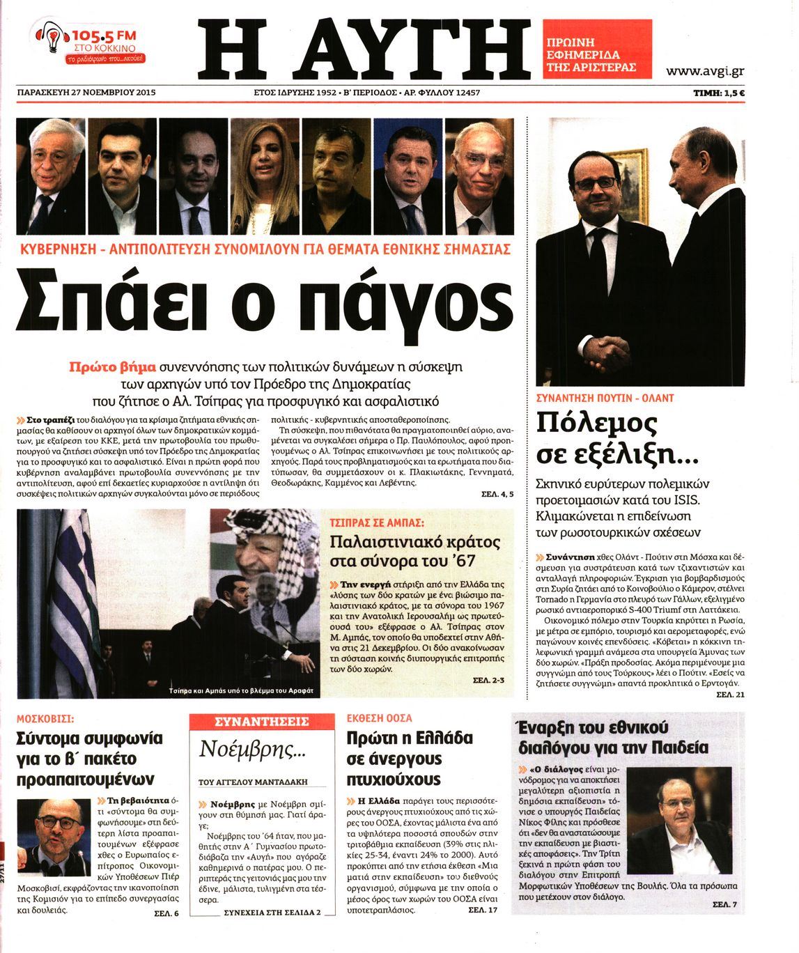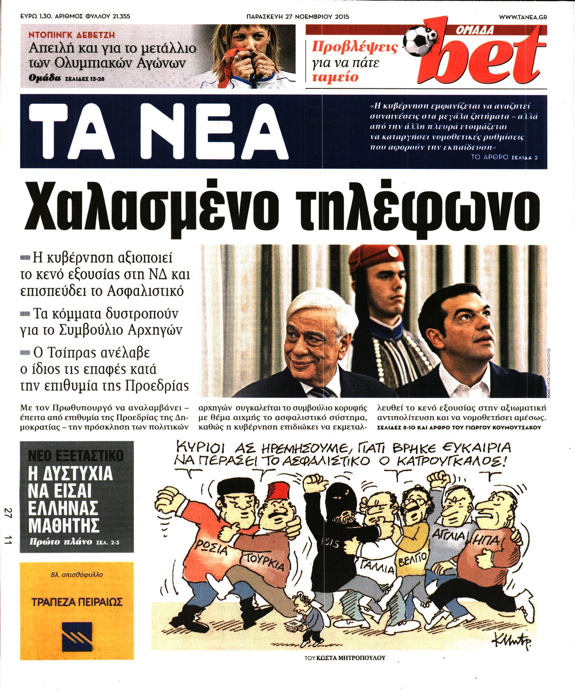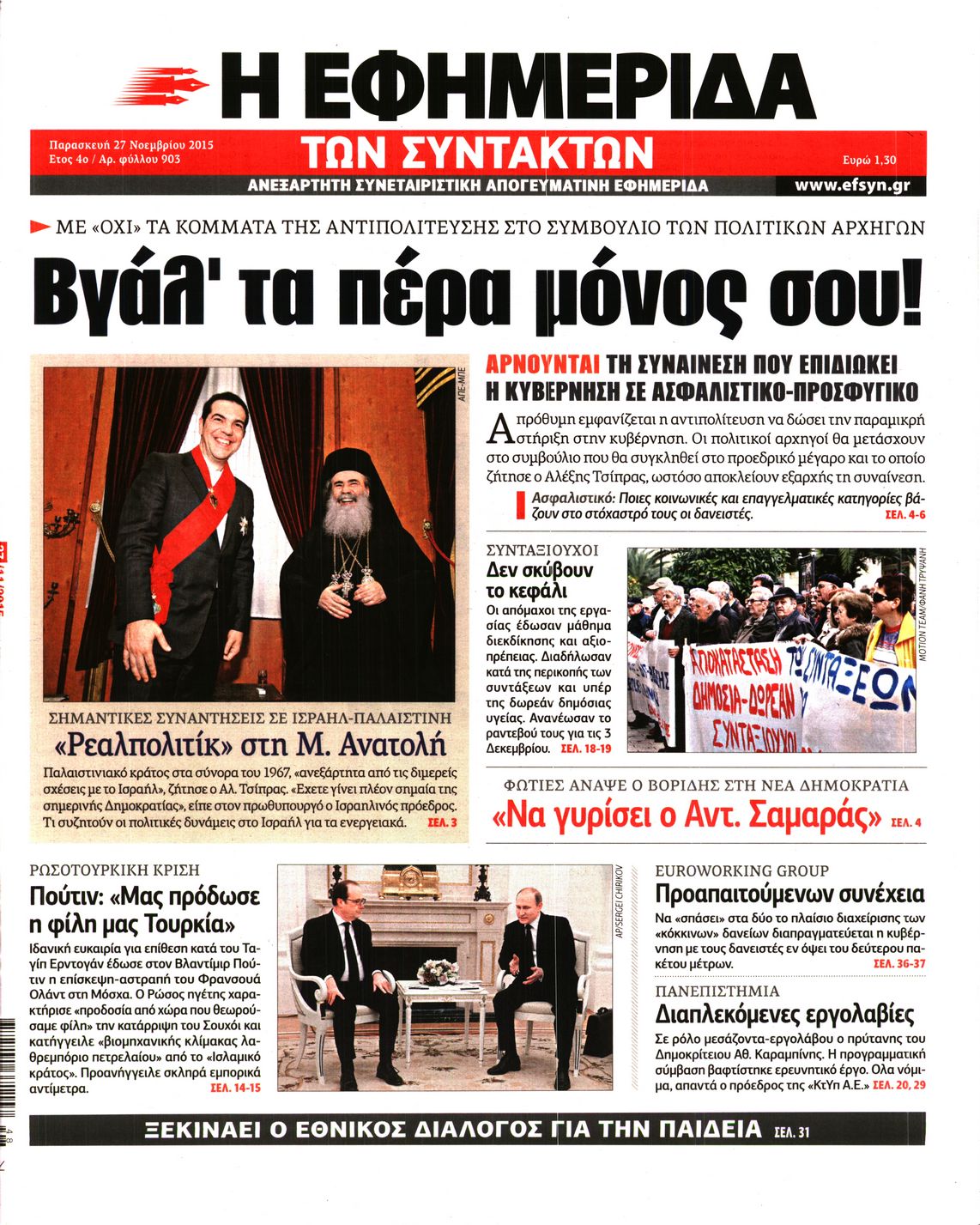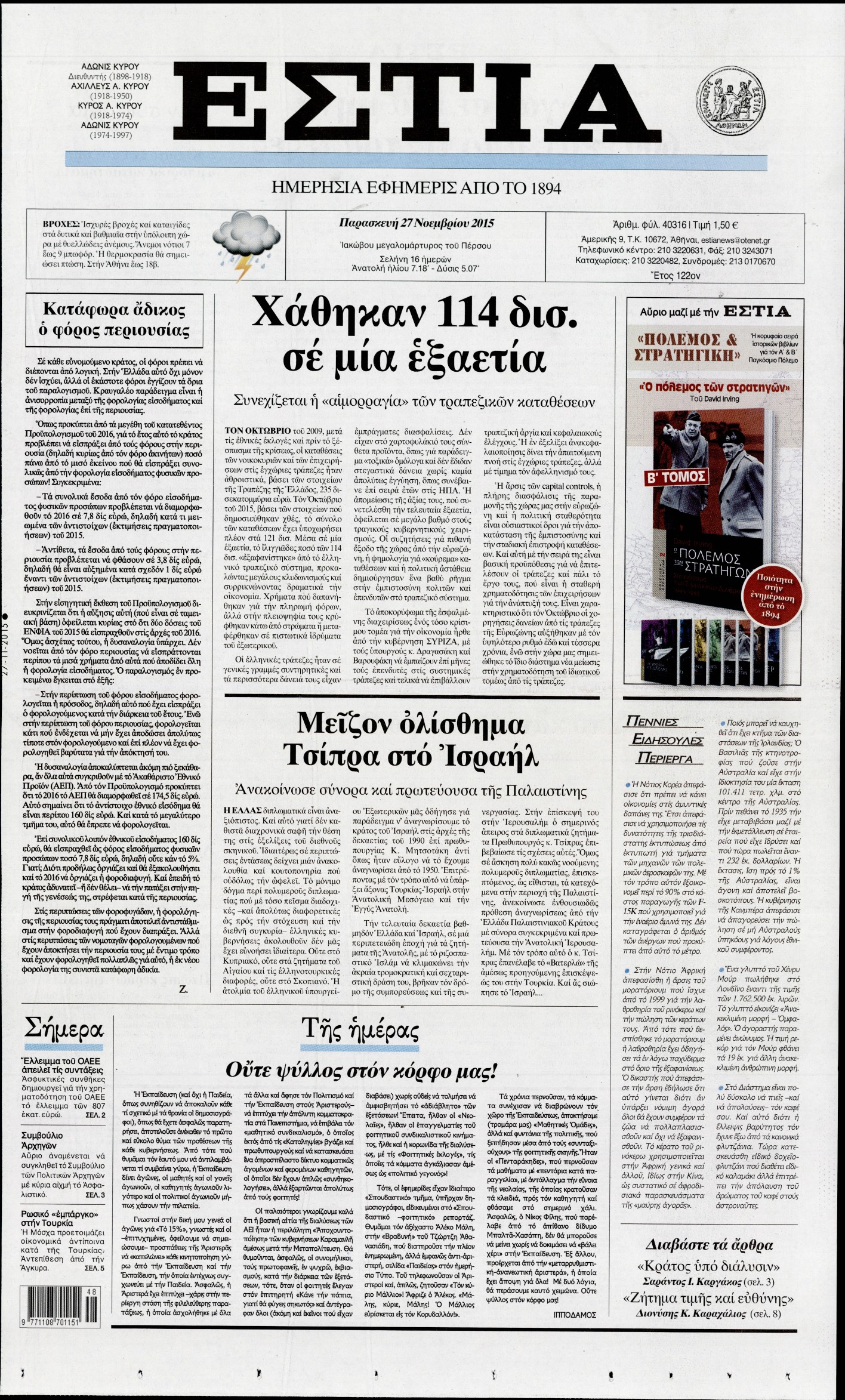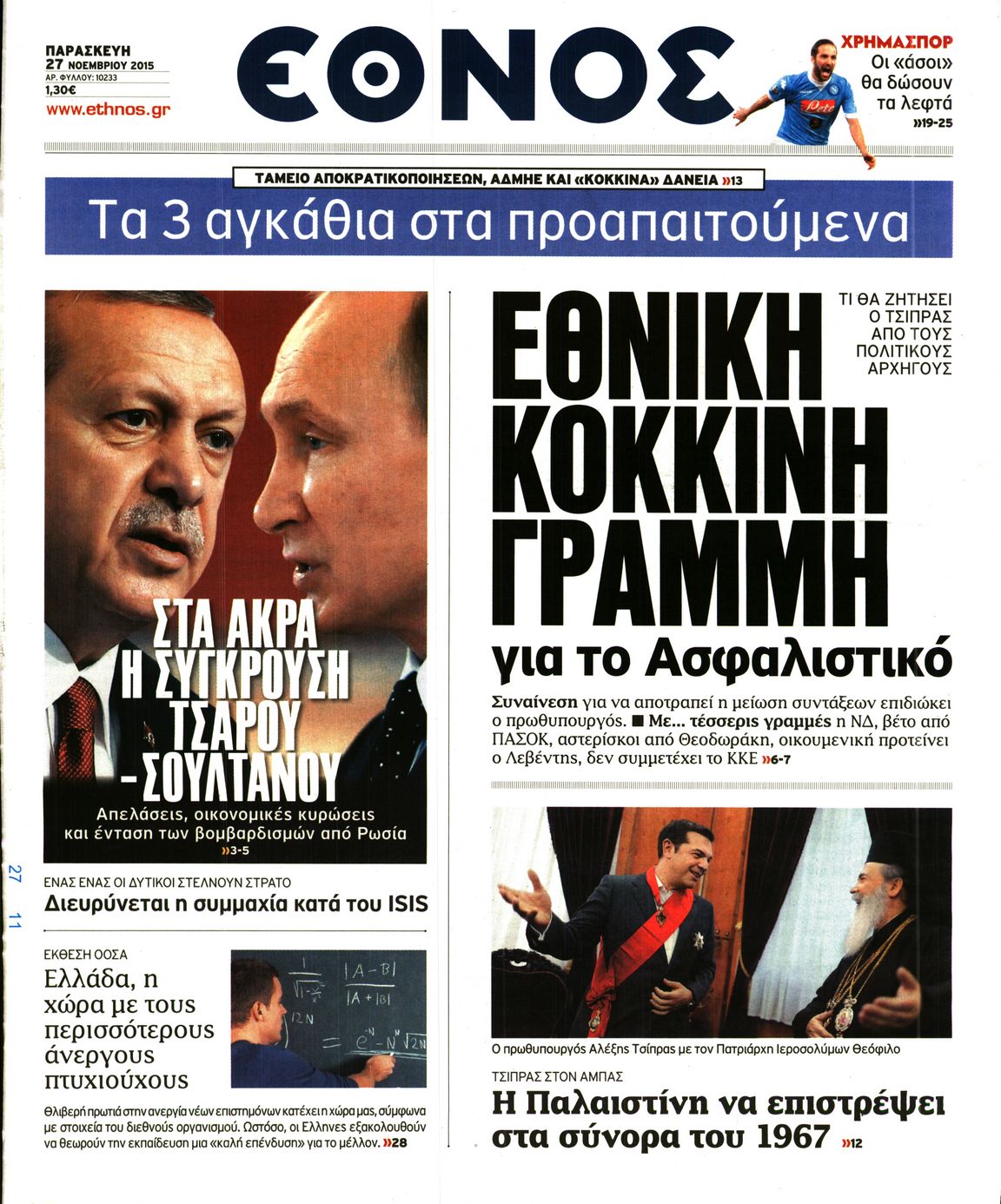 Οι πολιτικές εφημερίδες 27/11/2015 Enikos Newsroom 06:12, Παρασκευή 27 Νοεμβρίου 2015 Media Διαβάστε τα σημερινά πρωτοσέλιδα των πολιτικών εφημερίδων: ΠΟΛΙΤΙΚΕΣ ΕΦΗΜΕΡΙΔΕΣ ΠΡΩΤΟΣΕΛΙΔΑ Μοιράσου το: σχολίασε κι εσύ (0 σχόλια) Ακολουθήστε το enikos.gr στο Google News και μάθετε πρώτοι όλες τις ειδήσεις Δείτε όλες τις τελευταίες ειδήσεις από την Ελλάδα και τον Κόσμο στο enikos.gr Ειδήσεις Ροή Ειδήσεων 42 λεπτά πριν Υπόθεση Έπσταϊν: Το Υπουργείο Δικαιοσύνης δημοσιοποίησε μια σειρά από εξαιρετικά επεξεργασμένα αρχεία – «Λείπουν τα πιο σημαντικά έγγραφα», λένε οι Δημοκρατικοί 2 ώρες πριν Σαρωτικοί οι έλεγχοι στους δρόμους ενόψει εορτών – Μπλόκα της τροχαίας σε κεντρικές αρτηρίες της Αττικής 52 λεπτά πριν ΟΝΕΧ – MEGATUGS: Ξεκίνησε η ναυπήγηση ρυμουλκών στην Ελλάδα – Προθάλαμος πολεμικών πλοίων – Δείτε φωτογραφίες και βίντεο 44 λεπτά πριν Καιρός: Αλλαγή σκηνικού σήμερα με βροχές και πτώση της θερμοκρασίας – Οι προβλέψεις των μετεωρολόγων για τα Χριστούγεννα 10 ώρες πριν Χριστούγεννα στα μπλόκα: Επιμένουν στις κινητοποιήσεις τους οι αγρότες – Ανοίγουν τα διόδια το Σαββατοκύριακο 2 ώρες πριν Αυγά: Πόσα μπορείτε να τρώτε την ημέρα με ασφάλεια για μέγιστη πρόσληψη πρωτεΐνης 3 ώρες πριν Τα ζώδια σήμερα, Σάββατο 20 Δεκεμβρίου: Παρθένοι, το σύμπαν σας δίνει το κλειδί 2 ώρες πριν Οπτική ψευδαίσθηση: Μόνο αν είσαι ο Σέρλοκ Χολμς θα βρεις τον αριθμό «87» σε 7 δευτερόλεπτα 22 λεπτά πριν Αρχαιολόγοι ανακάλυψαν σε χωράφι απεικόνιση 600 ετών ενός Αγίου – Τα στοιχεία που δείχνουν ότι μαρτύρησε 6 λεπτά πριν MyHealth App: Τα στοιχεία για τον Προσωπικό Βοηθό Υγείας Πολίτη – Τι ερωτήματα έγιναν μέσα σε 7 ημέρες 14 λεπτά πριν Τρομεροί γονείς: Η Μαρία Καβογιάννη εισβάλλει στο σπίτι της οικογένειας Στεφανίδη 22 λεπτά πριν Αρχαιολόγοι ανακάλυψαν σε χωράφι απεικόνιση 600 ετών ενός Αγίου – Τα στοιχεία που δείχνουν ότι μαρτύρησε 29 λεπτά πριν Mega χριστουγεννιάτικη φορολοταρία: «Κλείδωσε» η ημερομηνία για την κλήρωση – Ερωτήσεις και απαντήσεις 36 λεπτά πριν ΗΠΑ: Τέσσερις μετανάστες πέθαναν σε κέντρα κράτησης – Αύξηση θανάτων σε επίπεδο ρεκόρ το 2025 ENIKOS NETWORK Το τεστ των 10 δευτερολέπτων που μπορεί να προβλέψει το προσδόκιμο ζωής σας – Τι λέει ειδικός του Cleveland Επιλέξτε καρέκλα για να μάθετε ποια είναι τα κρυφά χαρακτηριστικά σας – Τι αποκάλυψε για εσάς αυτό το τεστ προσωπικότητας; Mega χριστουγεννιάτικη φορολοταρία: «Κλείδωσε» η ημερομηνία για την κλήρωση – Ερωτήσεις και απαντήσεις Αναστολή μέτρων αναγκαστικής εκτέλεσης για κτηνοτρόφους που πλήττονται από την ευλογιά των αιγοπροβάτων Χαρτογραφώντας το «σημείο χωρίς επιστροφή»: Για πρώτη φορά αποκαλύπτεται με λεπτομέρεια το ακανθώδες όριο της ατμόσφαιρας τ... Η Google καταργεί τη λειτουργία «dark web report» – Πώς θα μπορούν οι χρήστες να διαγράφουν τα δεδομένα τους περισσότερα 08:14 , Σάββατο 20 Δεκεμβρίου 2025 Τρομεροί γονείς: Η Μαρία Καβογιάννη εισβάλλει στο σπίτι της οικογένειας Στεφανίδη Όσα θα δούμε στο νέο διπλό επεισόδιο της σειράς «Τρομεροί γονείς», σήμερα Σάββατο 20 Δεκεμβρίο... 05:48 , Σάββατο 20 Δεκεμβρίου 2025 Οι οικονομικές εφημερίδες 20/12/2025 Διαβάστε τα πρωτοσέλιδα από τις οικονομικές εφημερίδες, σήμερα 20/12/2025. 05:43 , Σάββατο 20 Δεκεμβρίου 2025 Οι αθλητικές εφημερίδες 20/12/2025 Διαβάστε τα πρωτοσέλιδα από τις αθλητικές εφημερίδες, σήμερα 20/12/2025. 05:38 , Σάββατο 20 Δεκεμβρίου 2025 Οι πολιτικές εφημερίδες 20/12/2025 Διαβάστε τα πρωτοσέλιδα από τις πολιτικές εφημερίδες, σήμερα 20/12/2025. ΤΕΛΕΥΤΑΙΕ