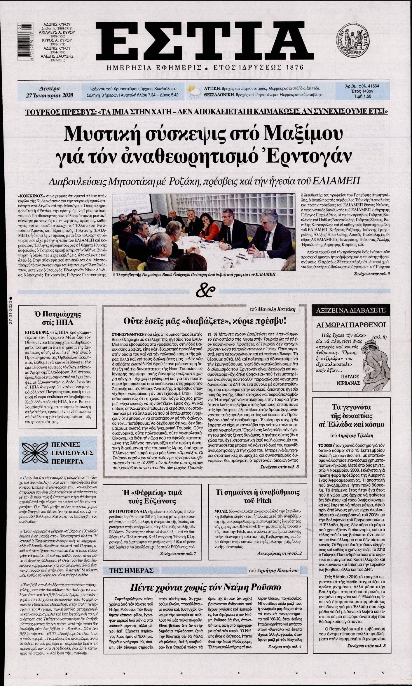 Οι πολιτικές εφημερίδες 27/1/20 Διονύσης Νίκκας 06:42, Δευτέρα 27 Ιανουαρίου 2020 Media Διαβάστε τα πρωτοσέλιδα των πολιτικών εφημερίδων… ΠΟΛΙΤΙΚΕΣ ΕΦΗΜΕΡΙΔΕΣ ΠΡΩΤΟΣΕΛΙΔΑ Μοιράσου το: σχολίασε κι εσύ (0 σχόλια) Ακολουθήστε το enikos.gr στο Google News και μάθετε πρώτοι όλες τις ειδήσεις Δείτε όλες τις τελευταίες ειδήσεις από την Ελλάδα και τον Κόσμο στο enikos.gr Ειδήσεις Ροή Ειδήσεων 8 ώρες πριν Χριστούγεννα στα μπλόκα: Επιμένουν στις κινητοποιήσεις τους οι αγρότες – Ανοίγουν τα διόδια το Σαββατοκύριακο 9 ώρες πριν Ουκρανία: Η άνευ προηγουμένου επίθεση σε ρωσικό τάνκερ στη Μεσόγειο και το μήνυμα προς στον Πούτιν – Το «μακρύ χέρι» του Κιέβου 8 ώρες πριν Πούτιν: Τα μηνύματα σε Ευρώπη και ΝΑΤΟ από το μαραθώνιο «σόου» του – Η απαίτηση για «σεβασμό» και η ειρήνη «με τους όρους» της Μόσχας 7 ώρες πριν ΗΠΑ: Η κυβέρνηση του Ντόναλντ Τραμπ άρχισε να δημοσιοποιεί τα αρχεία Έπσταϊν 7 ώρες πριν Άνω Λιόσια: Πυροβολισμοί σε επιχείρηση με χαλιά – Εντοπίστηκαν 10 κάλυκες 57 λεπτά πριν Αυγά: Πόσα μπορείτε να τρώτε την ημέρα με ασφάλεια για μέγιστη πρόσληψη πρωτεΐνης 1 ώρα πριν Τα ζώδια σήμερα, Σάββατο 20 Δεκεμβρίου: Παρθένοι, το σύμπαν σας δίνει το κλειδί 8 ώρες πριν Ανακαλύφθηκαν αρχαία χρυσά νομίσματα 2.200 ετών που απεικονίζουν τον θεό Απόλλωνα – Η άγνωστη σύνδεση με τον Φίλιππο Β΄ της Μακεδονίας 9 ώρες πριν Ύπνος: Μια κρυφή κατάσταση του εγκεφάλου πριν από τον ύπνο μπορεί να είναι το “κλειδί” για υψηλή ευφυΐα και δημιουργικότητα 3 λεπτά πριν Αναβολή συμφωνίας ΕΕ-Mercosur: Ο χρόνος «δεν είναι απεριόριστος» προειδοποιεί η Παραγουάη 18 λεπτά πριν Κίριλ Ντμίτριεφ: Στις ΗΠΑ ο απεσταλμένος της Ρωσίας για συνομιλίες με τους ομολόγους του, Γουίτκοφ και Κούσνερ 25 λεπτά πριν ΔΕΔΔΗΕ: Διακοπές ρεύματος σήμερα (20/12) στην Αθήνα και σε άλλες 7 περιοχές της Αττικής 34 λεπτά πριν Κολομβία: Είκοσι χρόνια κάθειρξη σε πρώην ανώτερο αξιωματικό για 72 εκτελέσεις αμάχων 41 λεπτά πριν Οπτική ψευδαίσθηση: Μόνο αν είσαι ο Σέρλοκ Χολμς θα βρεις τον αριθμό «87» σε 7 δευτερόλεπτα ENIKOS NETWORK Πρέπει να αποδέχεστε ή να απορρίπτετε όλα τα cookies; Ένας ειδικός εξηγεί Η αγαπημένη λιχουδιά των πόνι που μπορεί να ενισχύσει όραση, εγκέφαλο και ανοσοποιητικό Αναστολή μέτρων αναγκαστικής εκτέλεσης για κτηνοτρόφους που πλήττονται από την ευλογιά των αιγοπροβάτων Πλήρης επάρκεια προϊόντων στις λαϊκές της Αττικής, παρά τις αγροτικές κινητοποιήσεις – Τι απαντούν οι πωλητές Χαρτογραφώντας το «σημείο χωρίς επιστροφή»: Για πρώτη φορά αποκαλύπτεται με λεπτομέρεια το ακανθώδες όριο της ατμόσφαιρας τ... Η Google καταργεί τη λειτουργία «dark web report» – Πώς θα μπορούν οι χρήστες να διαγράφουν τα δεδομένα τους περισσότερα 05:48 , Σάββατο 20 Δεκεμβρίου 2025 Οι οικονομικές εφημερίδες 20/12/2025 Διαβάστε τα πρωτοσέλιδα από τις οικονομικές εφημερίδες, σήμερα 20/12/2025. 05:43 , Σάββατο 20 Δεκεμβρίου 2025 Οι αθλητικές εφημερίδες 20/12/2025 Διαβάστε τα πρωτοσέλιδα από τις αθλητικές εφημερίδες, σήμερα 20/12/2025. 05:38 , Σάββατο 20 Δεκεμβρίου 2025 Οι πολιτικές εφημερίδες 20/12/2025 Διαβάστε τα πρωτοσέλιδα από τις πολιτικές εφημερίδες, σήμερα 20/12/2025. 04:20 , Σάββατο 20 Δεκεμβρίου 2025 Αγγελική Νικολούλη: Τα συλλυπητήρια για την απώλεια της Ειρήνης Μαρινάκη Τα συλληπητήρια στον πρόεδρο του Mega, τον Βαγγέλη Μαρινάκη, για την απώλεια της μητέρας του Ε... ΤΕΛΕΥΤΑΙΕΣ ΕΙΔΗΣΕΙΣ 18 λεπτά πριν Κίριλ Ντμίτριεφ: Στις ΗΠΑ ο απεσταλμένος της Ρωσίας... 25 λεπτά πριν ΔΕΔΔΗΕ: Διακοπές ρεύματος σήμερα (20/12) στην Αθήνα κ