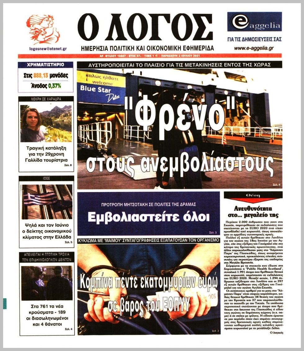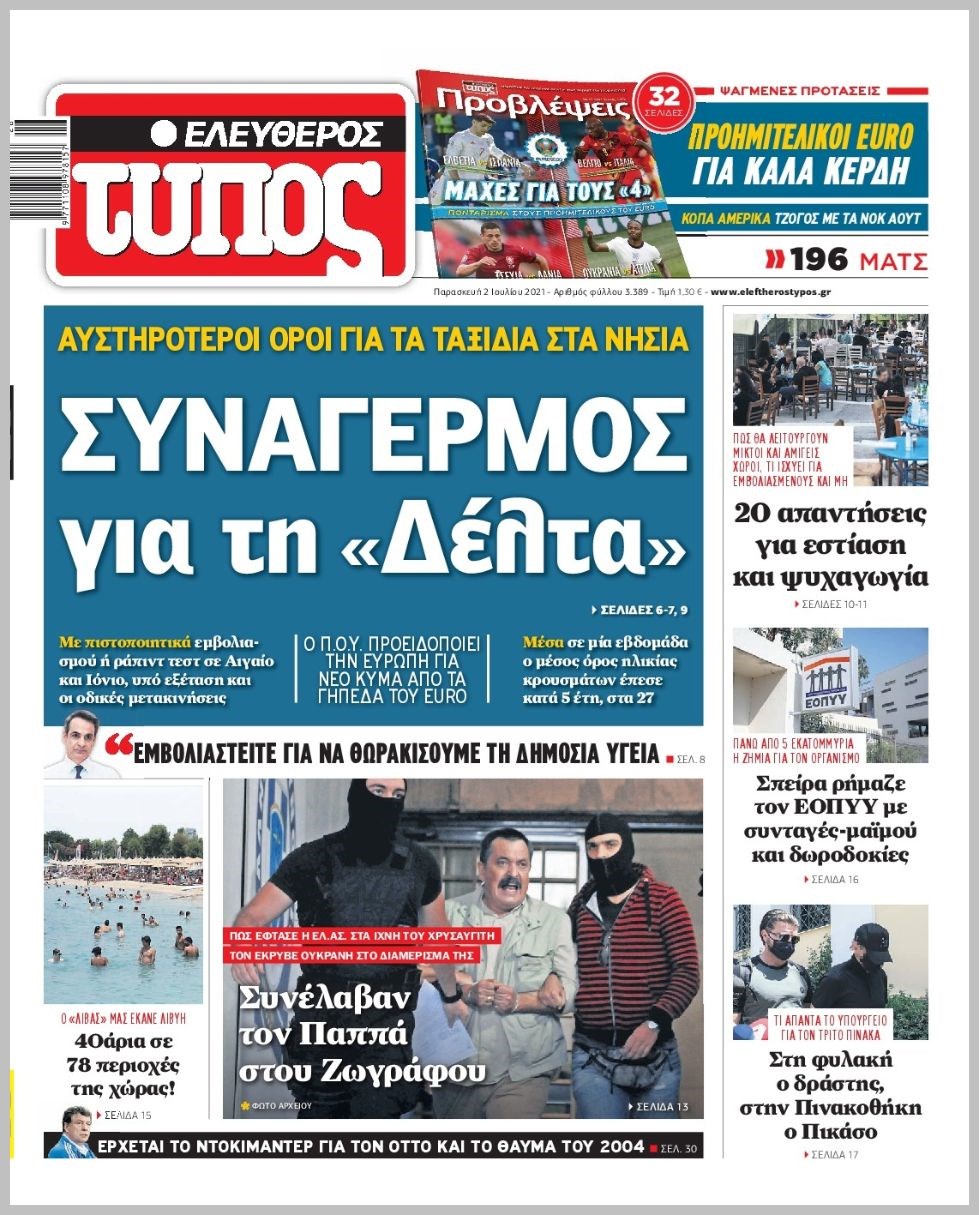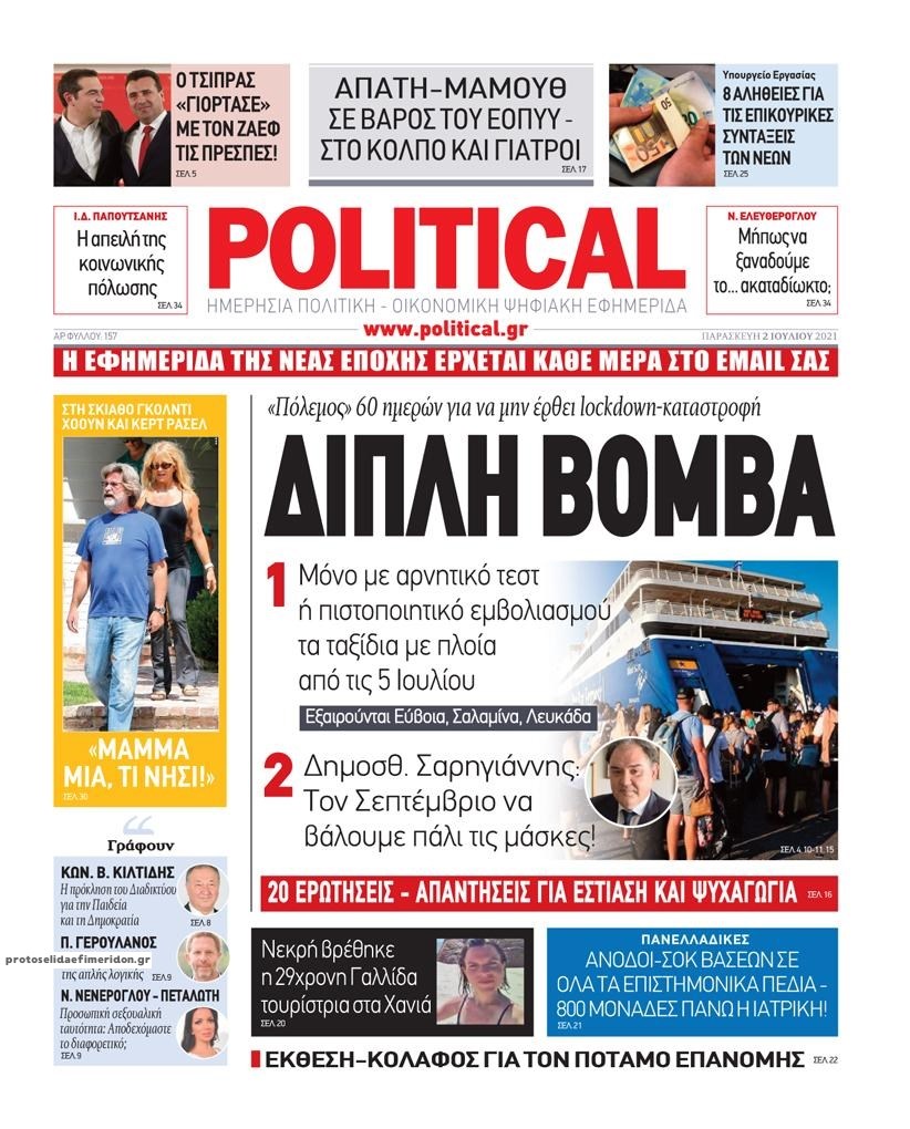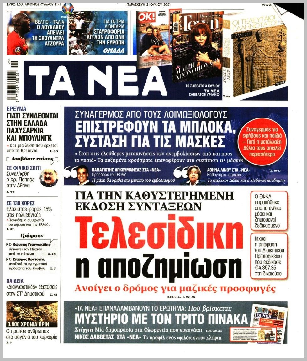 Οι πολιτικές εφημερίδες 2/7/2021 Διονύσης Νίκκας 06:10, Παρασκευή 02 Ιουλίου 2021 Media Διαβάστε τα πρωτοσέλιδα των πολιτικών εφημερίδων… ΕΦΗΜΕΡΙΔΕΣ ΠΡΩΤΟΣΕΛΙΔΑ Μοιράσου το: σχολίασε κι εσύ (0 σχόλια) Ακολουθήστε το enikos.gr στο Google News και μάθετε πρώτοι όλες τις ειδήσεις Δείτε όλες τις τελευταίες ειδήσεις από την Ελλάδα και τον Κόσμο στο enikos.gr Ειδήσεις Ροή Ειδήσεων 4 ώρες πριν Υπόθεση Έπσταϊν: Το Υπουργείο Δικαιοσύνης δημοσιοποίησε μια σειρά από εξαιρετικά επεξεργασμένα αρχεία – «Λείπουν τα πιο σημαντικά έγγραφα», λένε οι Δημοκρατικοί 42 λεπτά πριν Γιορτές με μπλόκα για τους αγρότες: Ανοίγουν διόδια και μοιράζουν προϊόντα στους ταξιδιώτες 1 ώρα πριν Εξαφάνιση 33χρονου γιατρού στην Κρήτη: «Άναψα τα φώτα, τρόμαξε και άρχισε να τρέχει στα χωράφια» – Η τελευταία διαδρομή και η μαρτυρία «κλειδί» 3 ώρες πριν Ο «χάρτης» με τις αυξήσεις και τις φοροελαφρύνσεις του 2026 – Ποιοι και πόσα κερδίζουν 58 λεπτά πριν Τα αρχεία του Έπσταϊν αποκαλύπτουν φωτογραφία του έκπτωτου πρίγκιπα Άντριου – Είναι ξαπλωμένος στην αγκαλιά 5 γυναικών 1 ώρα πριν Μία νέα «χρυσή» περίοδος αρχίζει για 3 ζώδια από σήμερα – «Μία αναπάντεχη ευκαιρία οδηγεί στην επιτυχία» 5 ώρες πριν Αυγά: Πόσα μπορείτε να τρώτε την ημέρα με ασφάλεια για μέγιστη πρόσληψη πρωτεΐνης 3 ώρες πριν Αρχαιολόγοι ανακάλυψαν σε χωράφι απεικόνιση 600 ετών ενός Αγίου – Τα στοιχεία που δείχνουν ότι μαρτύρησε 2 ώρες πριν Αγχώνεται για το χριστουγεννιάτικο δώρο που πήρε στην πλούσια σύντροφό του – «Φοβάμαι πως θα το βρει φθηνιάρικο, φοράει βραχιόλια Cartier» 7 λεπτά πριν Νέες ταυτότητες: Μεγάλη αναμονή για ραντεβού στην Αττική – Τέλος τα ταξίδια εκτός Ελλάδος από τον Αύγουστο για όσους δεν έχουν αλλάξει 15 λεπτά πριν Οι 7 φράσεις που δεν λένε ποτέ οι συναισθηματικά έξυπνοι άνθρωποι κατά τη διάρκεια ενός καβγά 18 λεπτά πριν Τηλεθέαση (19/12): Ανατροπές και πρωτιές στην πρωινή ζώνη 26 λεπτά πριν Πώς η κλιματική αλλαγή επηρεάζει εγκύους και βρέφη – Οι επιπτώσεις των υψηλών θερμοκρασιών 34 λεπτά πριν e-ΕΦΚΑ και ΔΥΠΑ: Οι πληρωμές από 22 έως 24 Δεκεμβρίου – Ποιοι θα δουν χρήματα στους λογαριασμούς τους ENIKOS NETWORK Είστε μόνιμα απρόσεκτοι; 3 σημάδια που δείχνουν ότι μπορεί να είναι σύμπτωμα πάθησης Πόσα κιλά παίρνουμε πραγματικά τα Χριστούγεννα, σύμφωνα με την επιστήμη – Πώς να το αποτρέψουμε; Επίδομα παιδιού: Τι αλλάζει από το 2026 – Το όφελος από τις φορολογικές ελαφρύνσεις Mega χριστουγεννιάτικη φορολοταρία: «Κλείδωσε» η ημερομηνία για την κλήρωση – Ερωτήσεις και απαντήσεις Χαρτογραφώντας το «σημείο χωρίς επιστροφή»: Για πρώτη φορά αποκαλύπτεται με λεπτομέρεια το ακανθώδες όριο της ατμόσφαιρας τ... Η Google καταργεί τη λειτουργία «dark web report» – Πώς θα μπορούν οι χρήστες να διαγράφουν τα δεδομένα τους περισσότερα 09:30 , Σάββατο 20 Δεκεμβρίου 2025 «Porto Leone: Στη γειτονιά με τα κόκκινα φανάρια» – Ο Χρόνης αποκαλύπτει στην Αλεξάνδρα το μυστικό για το παιδί της Λένας Η μεγάλη δραματική σειρά του Apha «Porto Leone: Στη γειτονιά με τα κόκκινα φανάρια» μας μεταφέ... 08:14 , Σάββατο 20 Δεκεμβρίου 2025 Τρομεροί γονείς: Η Μαρία Καβογιάννη εισβάλλει στο σπίτι της οικογένειας Στεφανίδη Όσα θα δούμε στο νέο διπλό επεισόδιο της σειράς «Τρομεροί γονείς», σήμερα Σάββατο 20 Δεκεμβρίο... 05:48 , Σάββατο 20 Δεκεμβρίου 2025 Οι οικονομικές εφημερίδες 20/12/2025 Διαβάστε τα πρωτοσέλιδα από τις οικονομικές εφημερίδες, σήμερα 20/12/2025. 05:43 , Σάββατο 20 Δεκεμβρίου 2025 Οι αθλητικές εφημερίδες 20/12/2025 Διαβάστε 